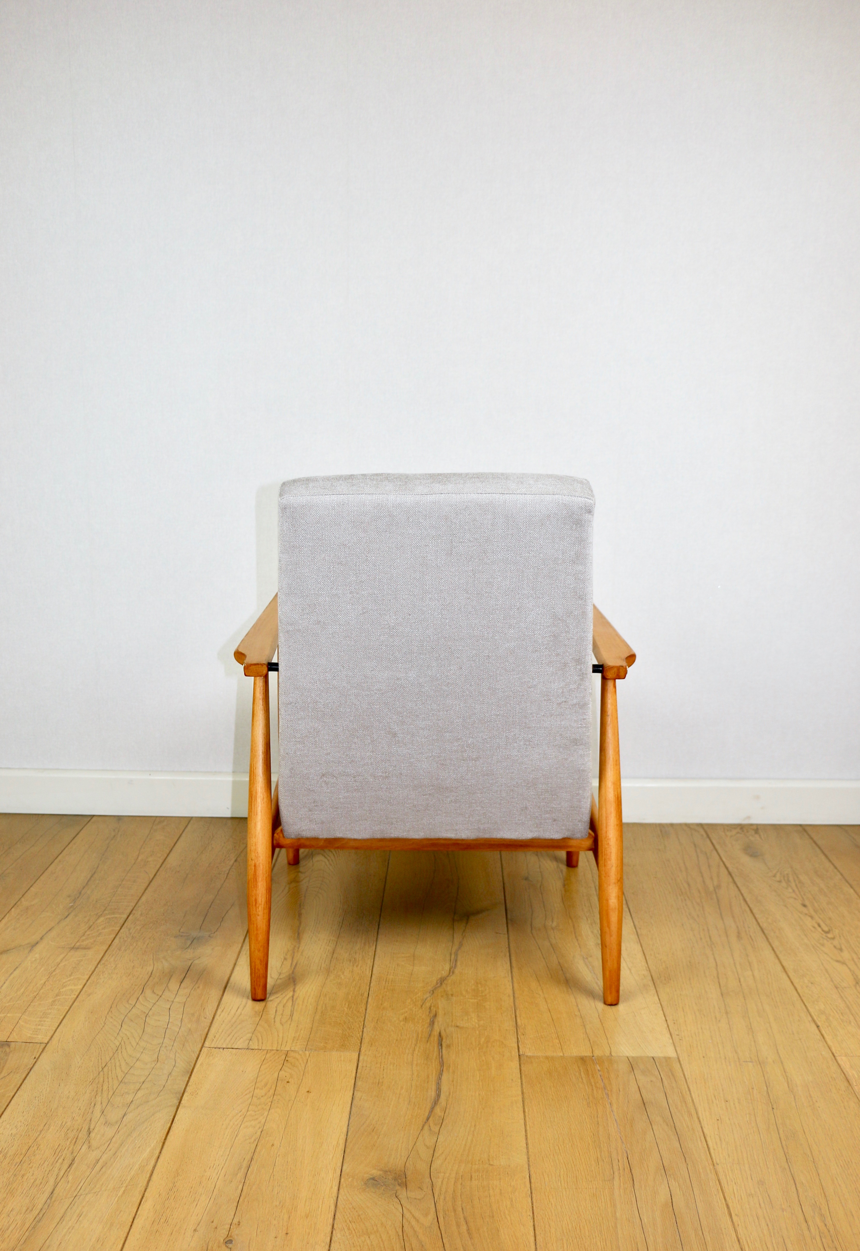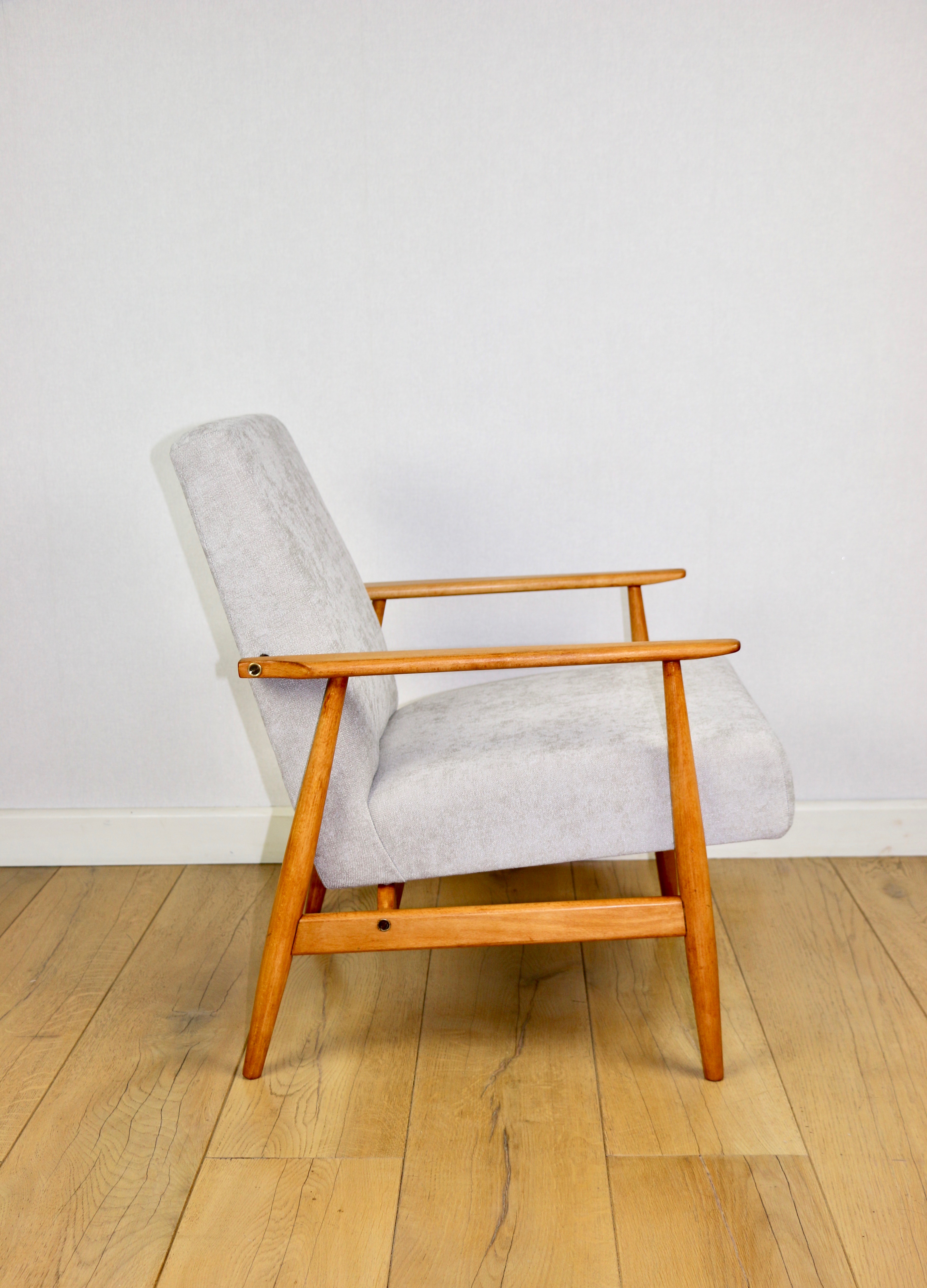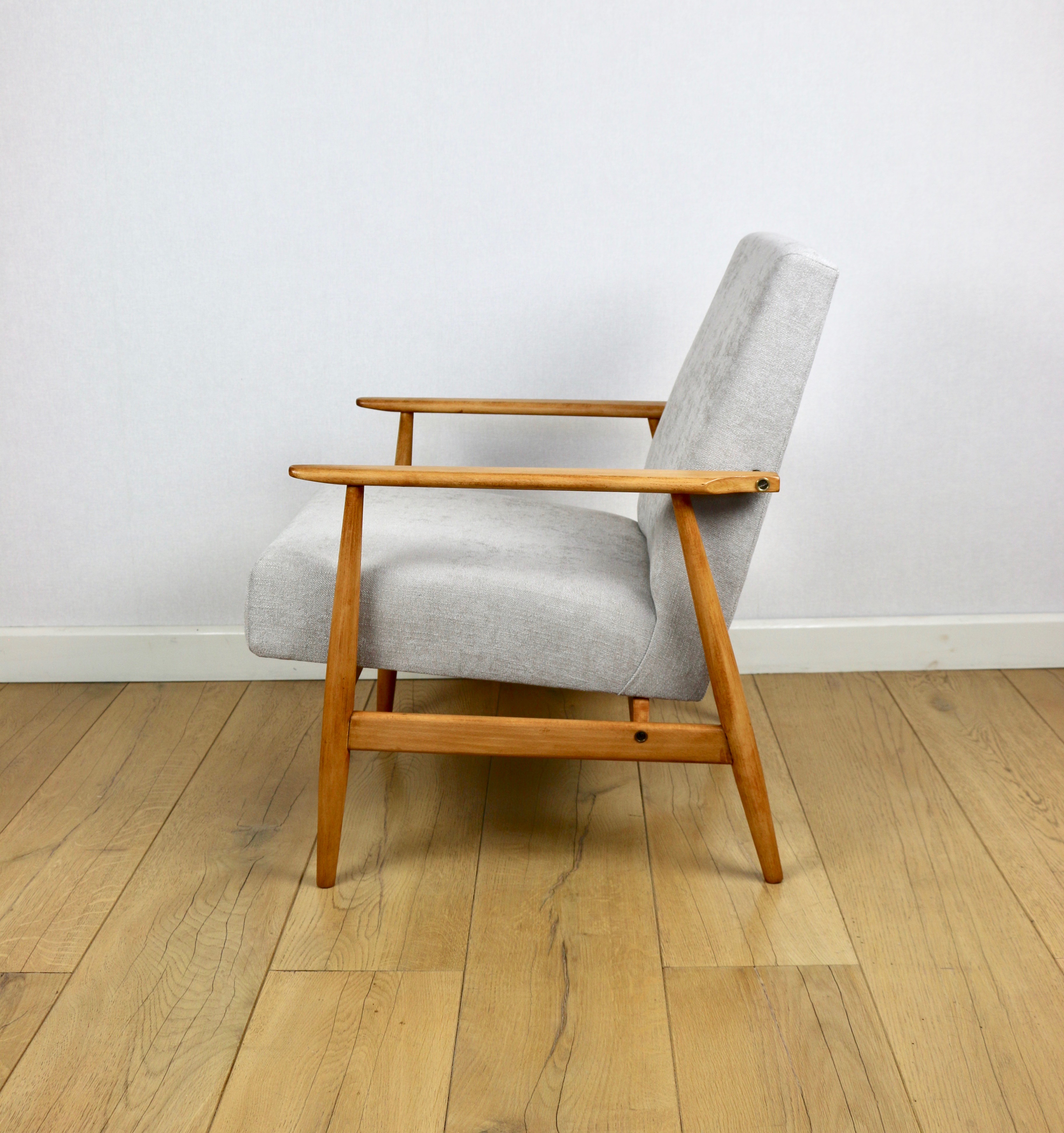 Odrestaurowany fotel Henryka Lis-a z roku 1970, nowe strukturalne obicie w naturalnej tkaninie w kolorze beżowym z serii Danubio. Stelaż drewniany połączony z podłokietnikami w jasnej kolorystyce drewna bukowego.