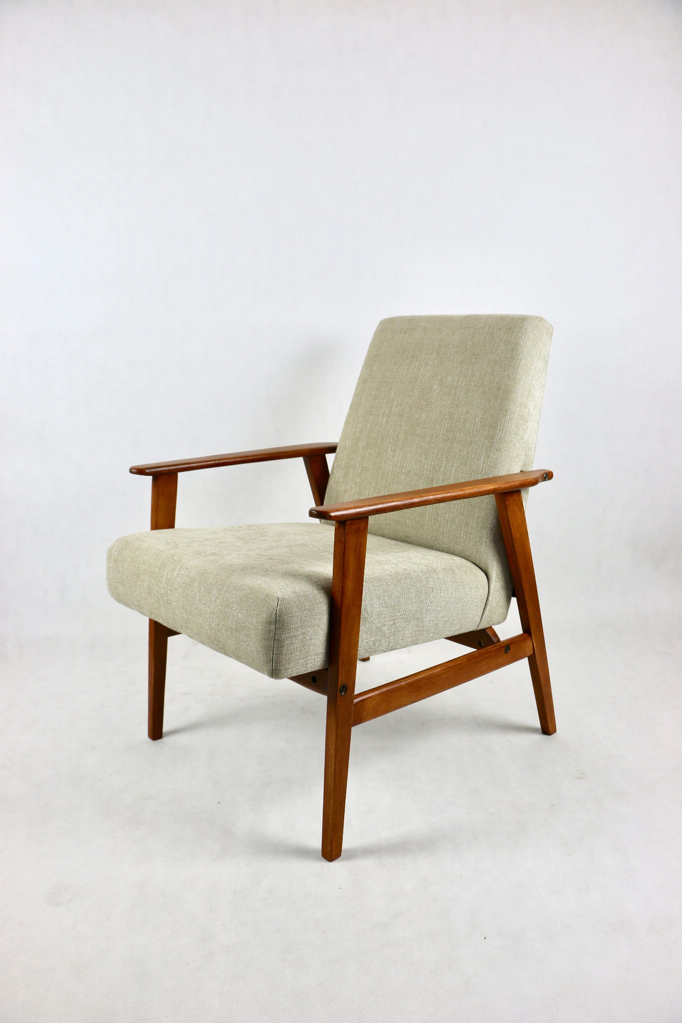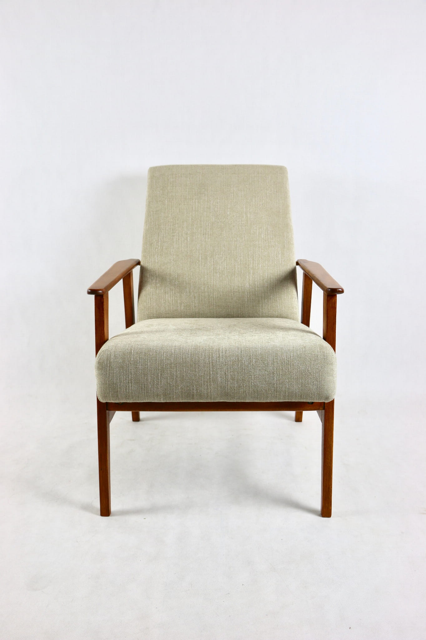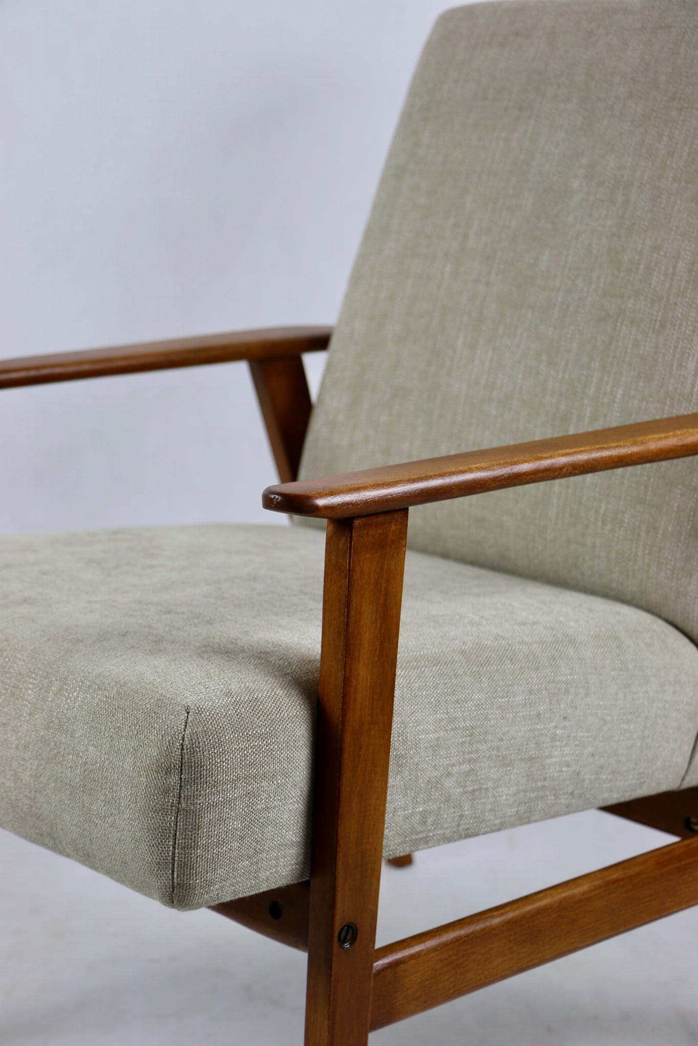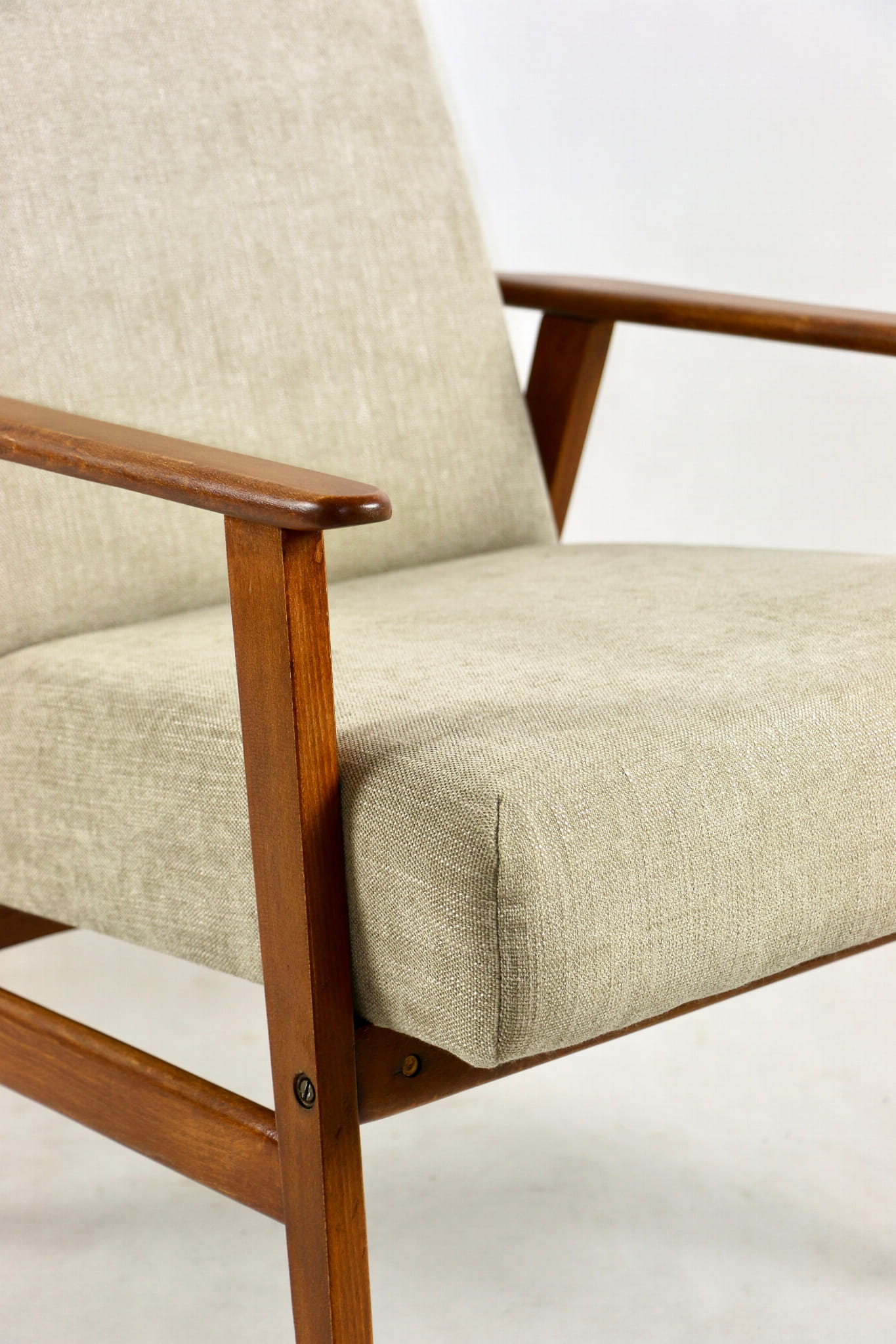 Odrestaurowany fotel Henryka Lis-a z roku 1970, nowe strukturalne obicie w naturalnej tkaninie w kolorze beżowym z serii Danubio. Stelaż drewniany połączony z podłokietnikami w naturalnej kolorystyce drewna.