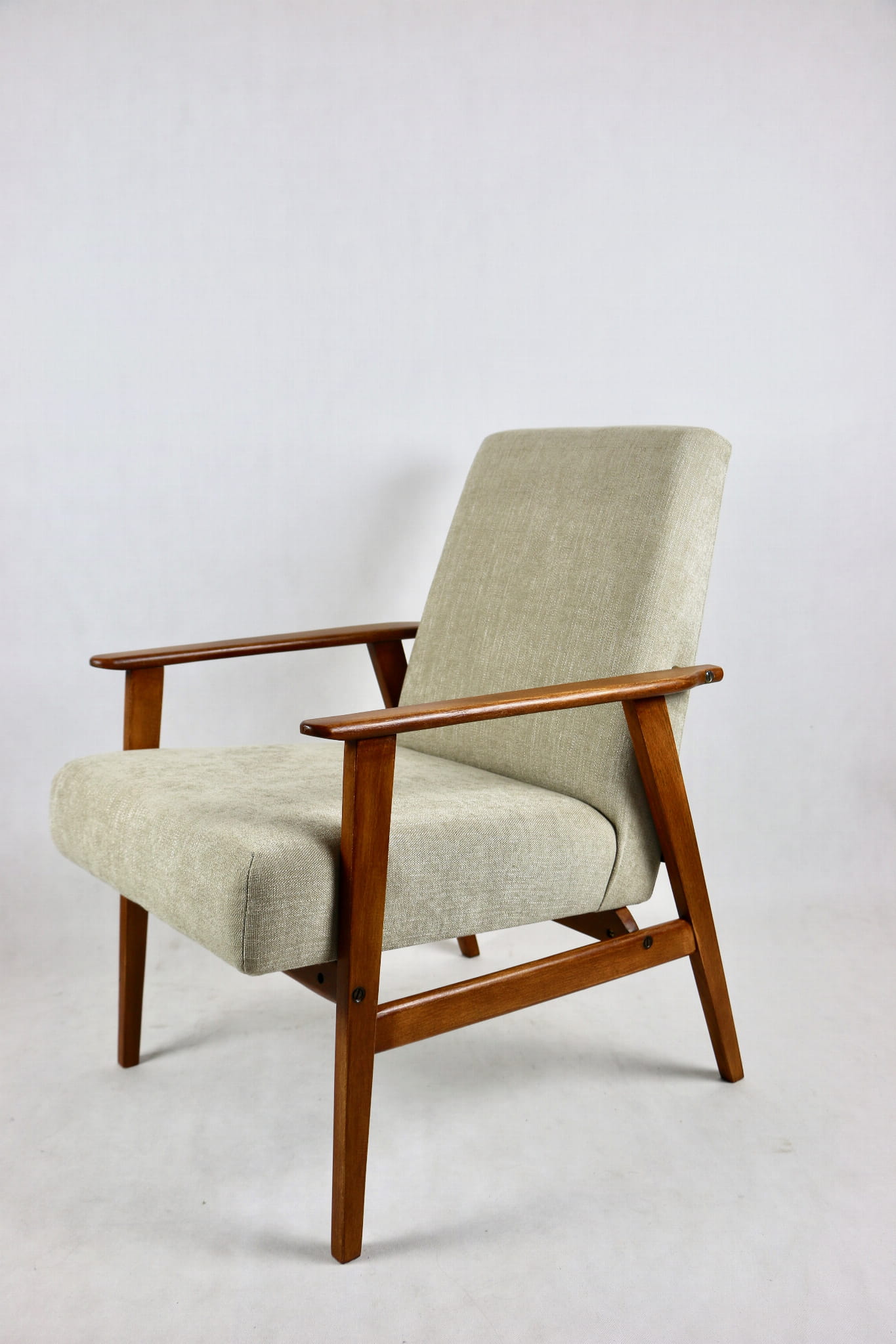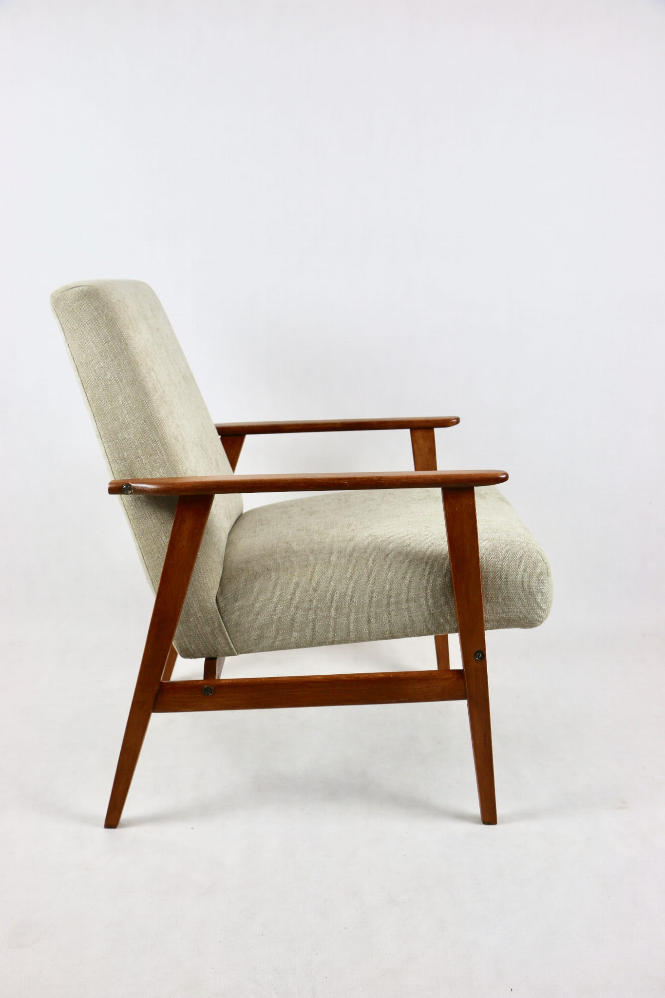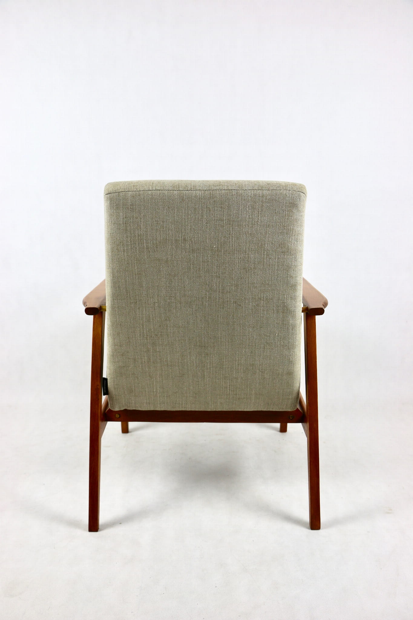 Odrestaurowany fotel Henryka Lis-a z roku 1970, nowe strukturalne obicie w naturalnej tkaninie w kolorze beżowym z serii Danubio. Stelaż drewniany połączony z podłokietnikami w naturalnej kolorystyce drewna.
