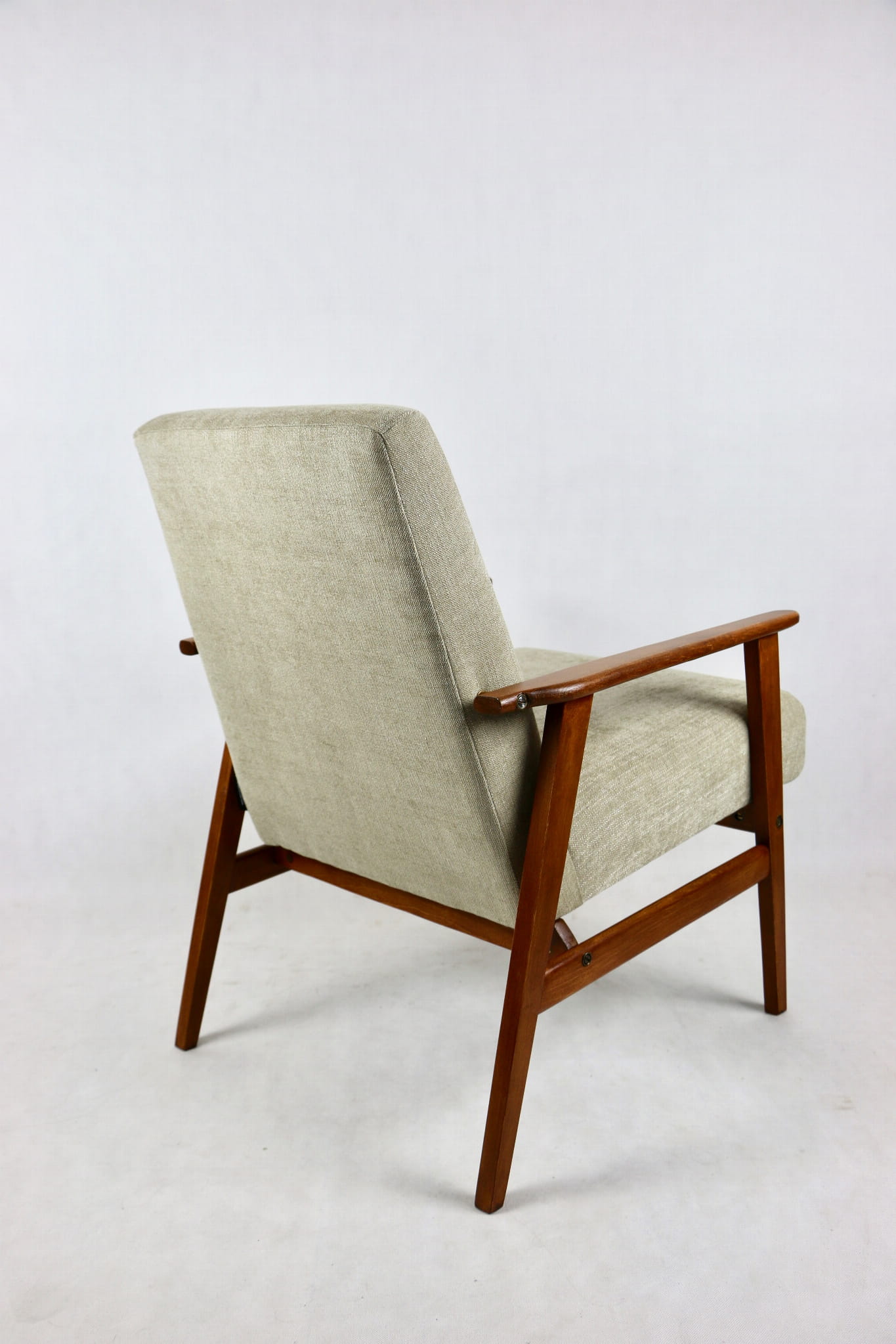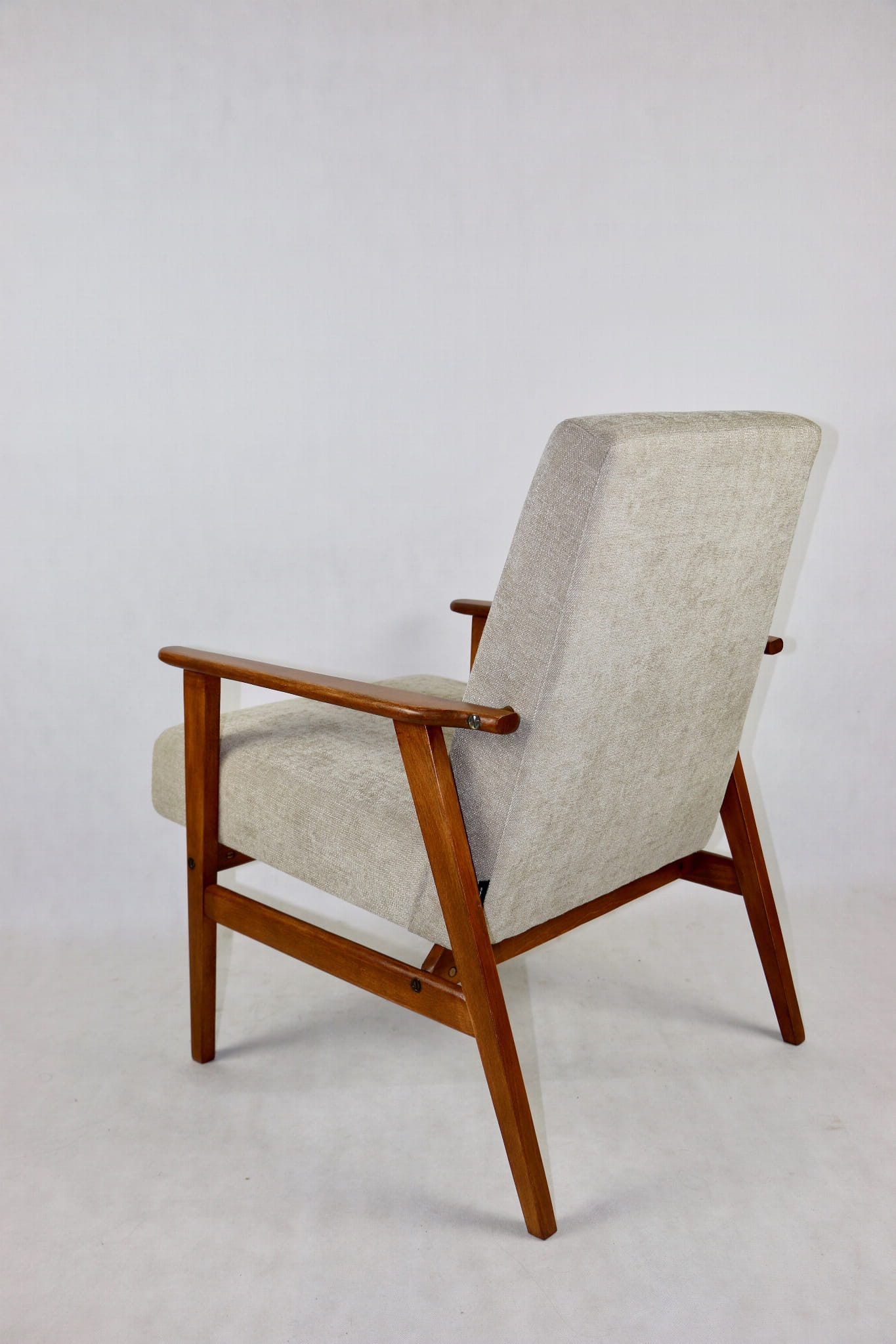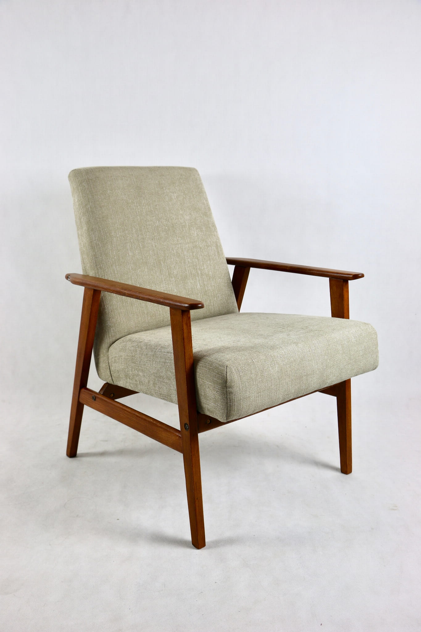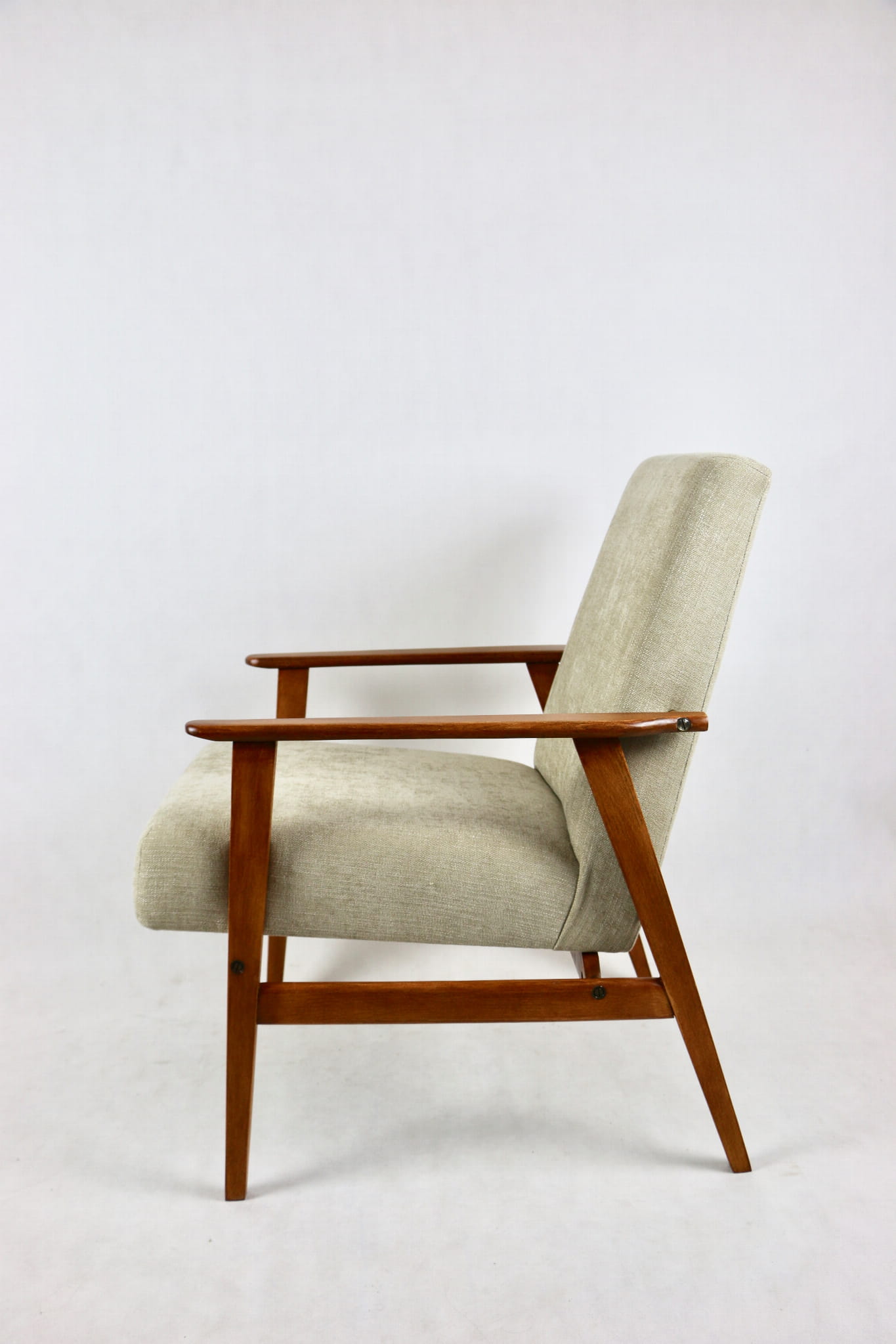 Odrestaurowany fotel Henryka Lis-a z roku 1970, nowe strukturalne obicie w naturalnej tkaninie w kolorze beżowym z serii Danubio. Stelaż drewniany połączony z podłokietnikami w naturalnej kolorystyce drewna.