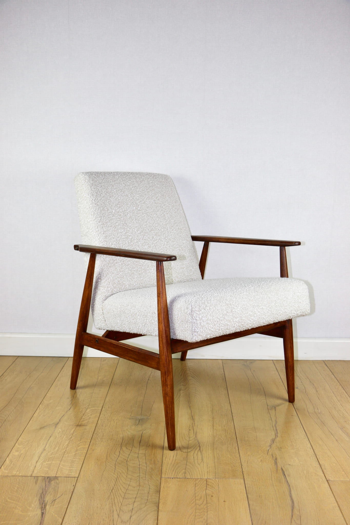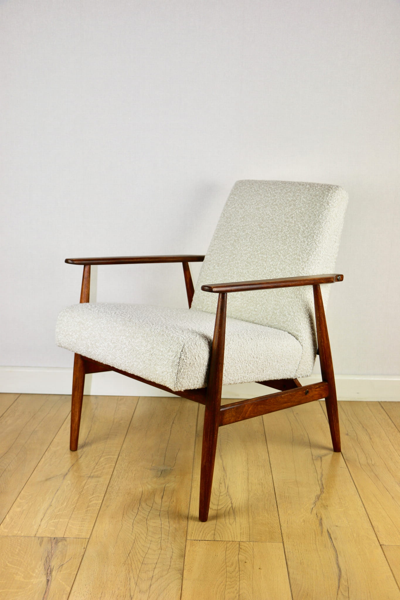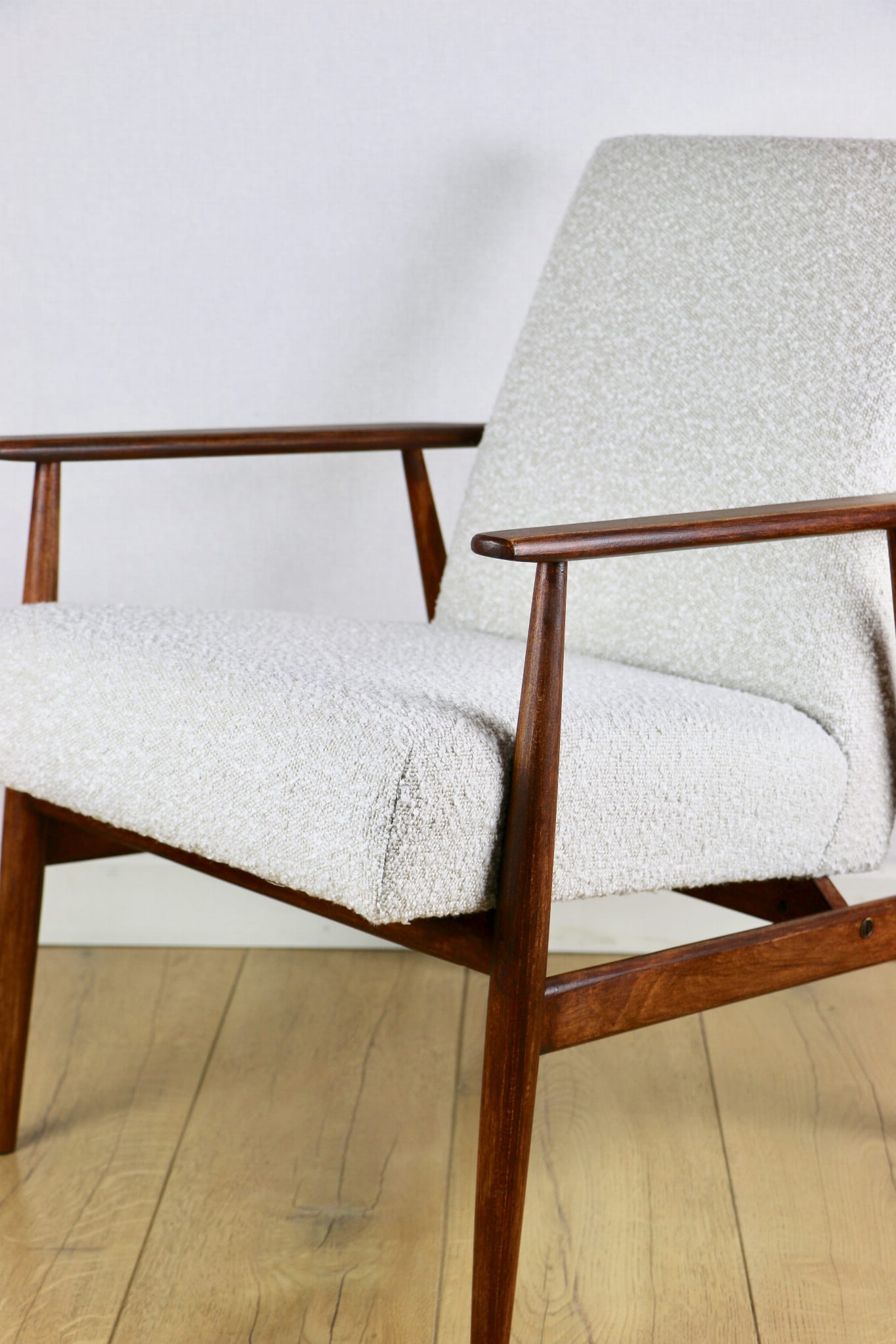 Odrestaurowany kultowy fotel Henryka Lis-a z roku 1970, nowe strukturalne obicie w naturalnej tkaninie boucle w kolorze biało - kremowym. Stelaż drewniany połączony z podłokietnikami w ciemnej kolorystyce drewna pokryty lakierem bezbarwnym.