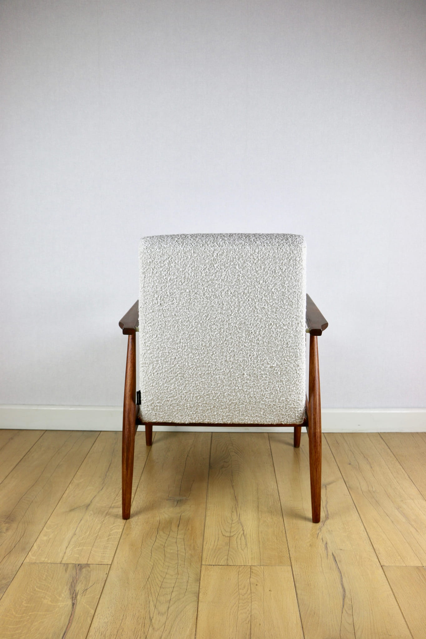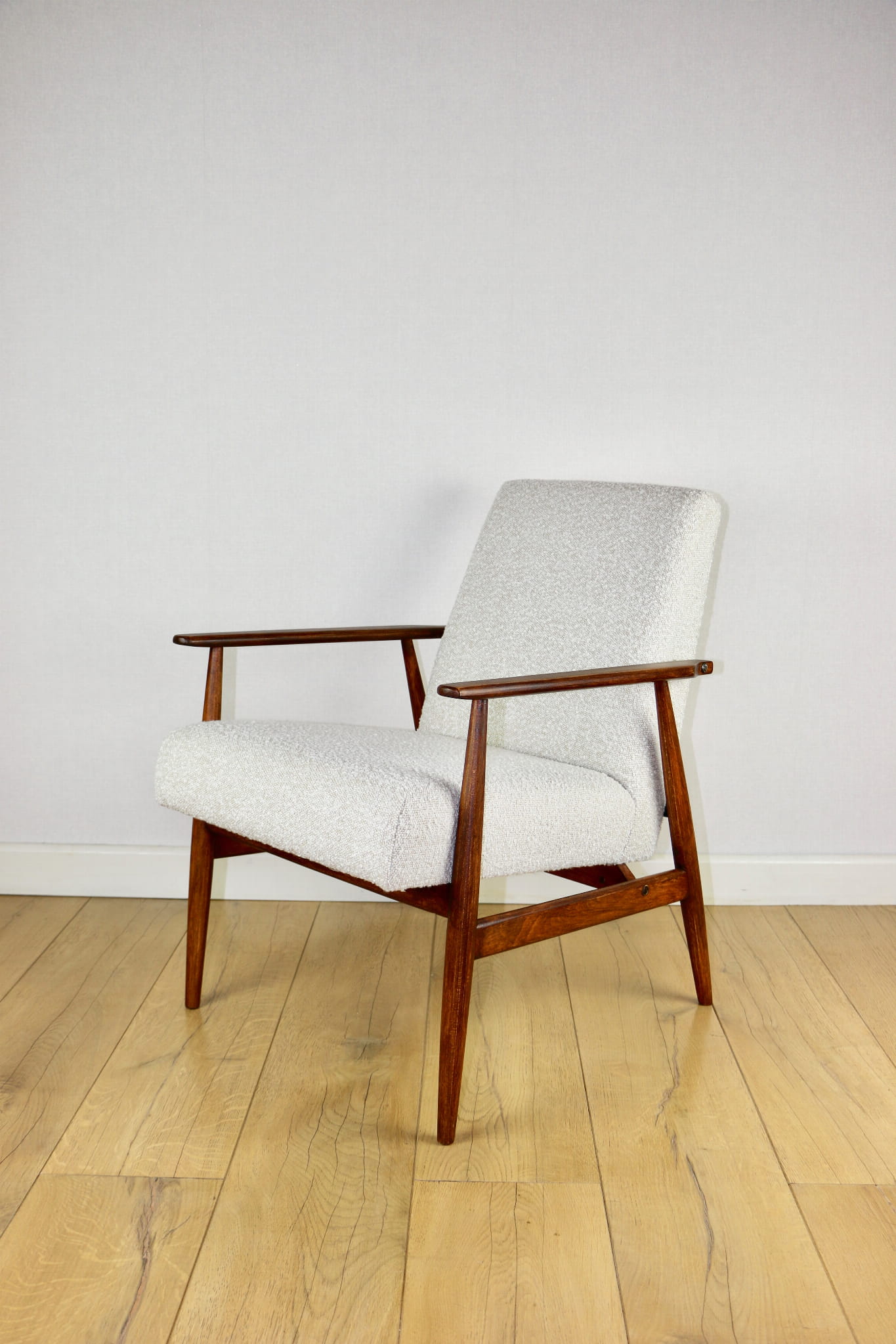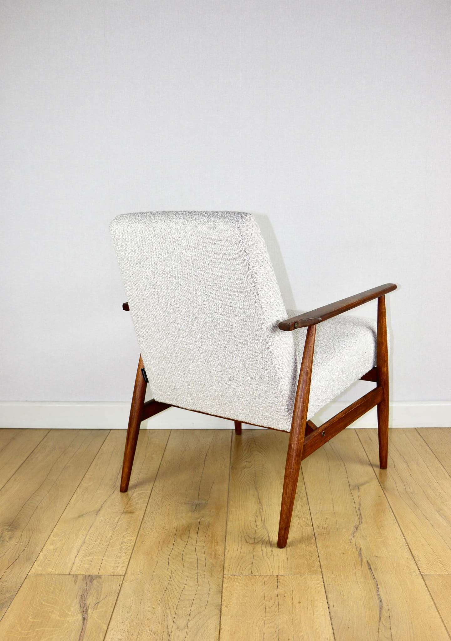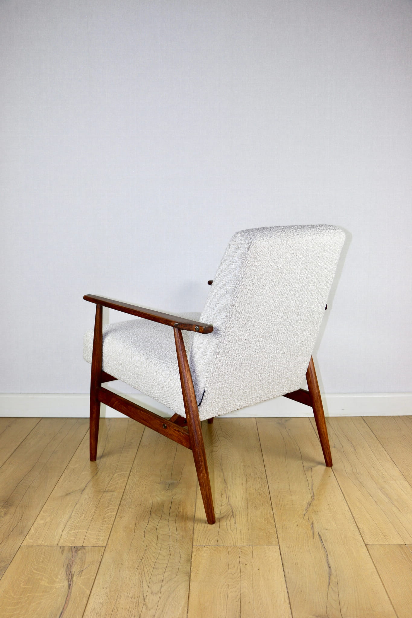 Odrestaurowany kultowy fotel Henryka Lis-a z roku 1970, nowe strukturalne obicie w naturalnej tkaninie boucle w kolorze biało - kremowym. Stelaż drewniany połączony z podłokietnikami w ciemnej kolorystyce drewna pokryty lakierem bezbarwnym.