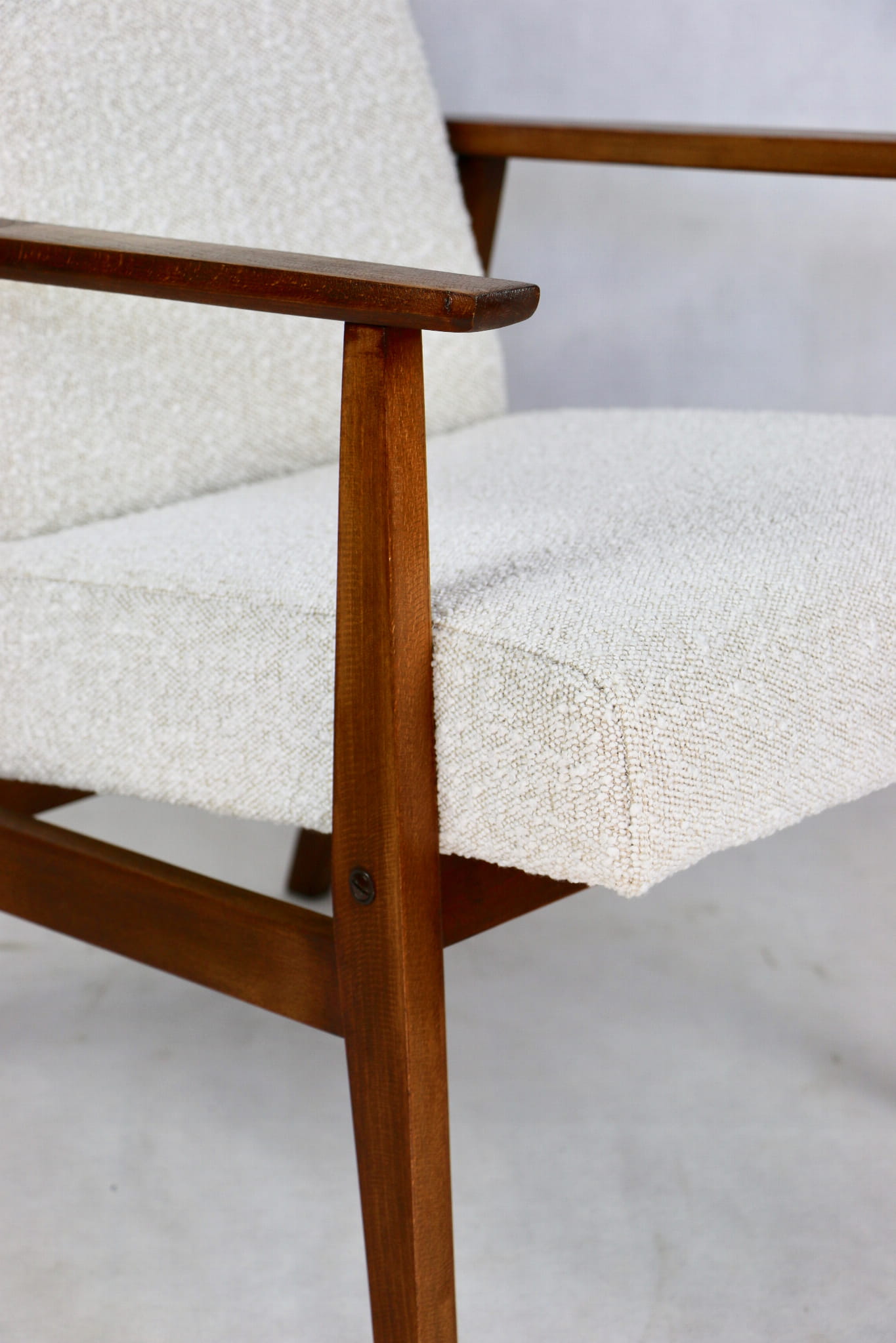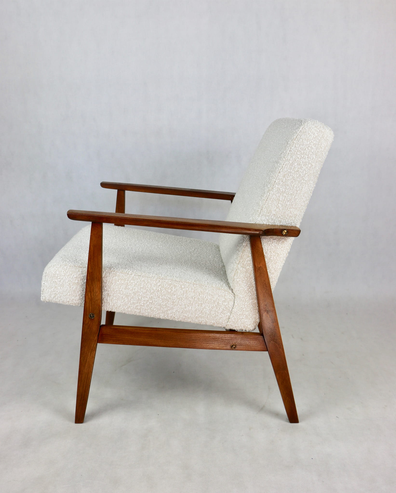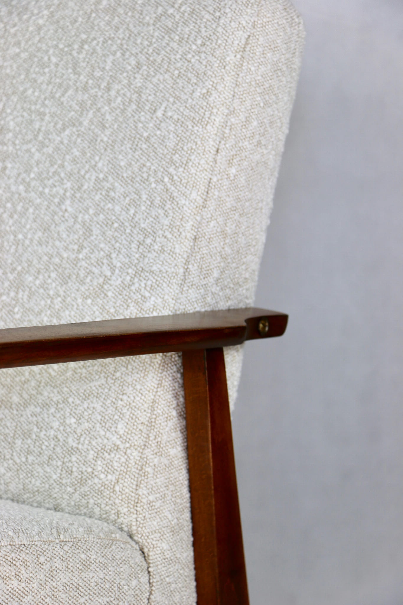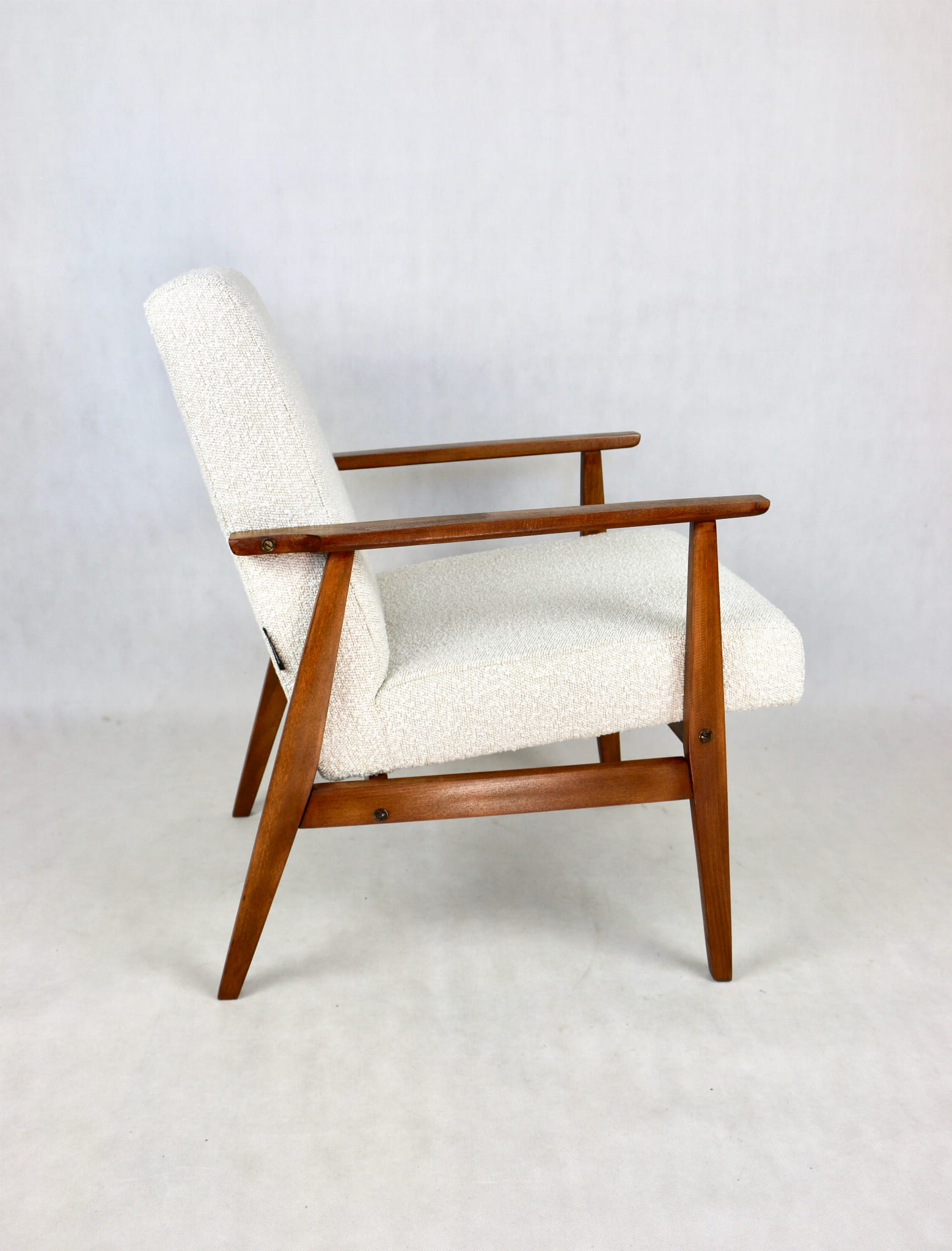 Odrestaurowany fotel Henryka Lis-a z roku 1970, nowe strukturalne obicie w naturalnej tkaninie w kolorze beżowym. Stelaż drewniany połączony z podłokietnikami w naturalnej kolorystyce drewna.