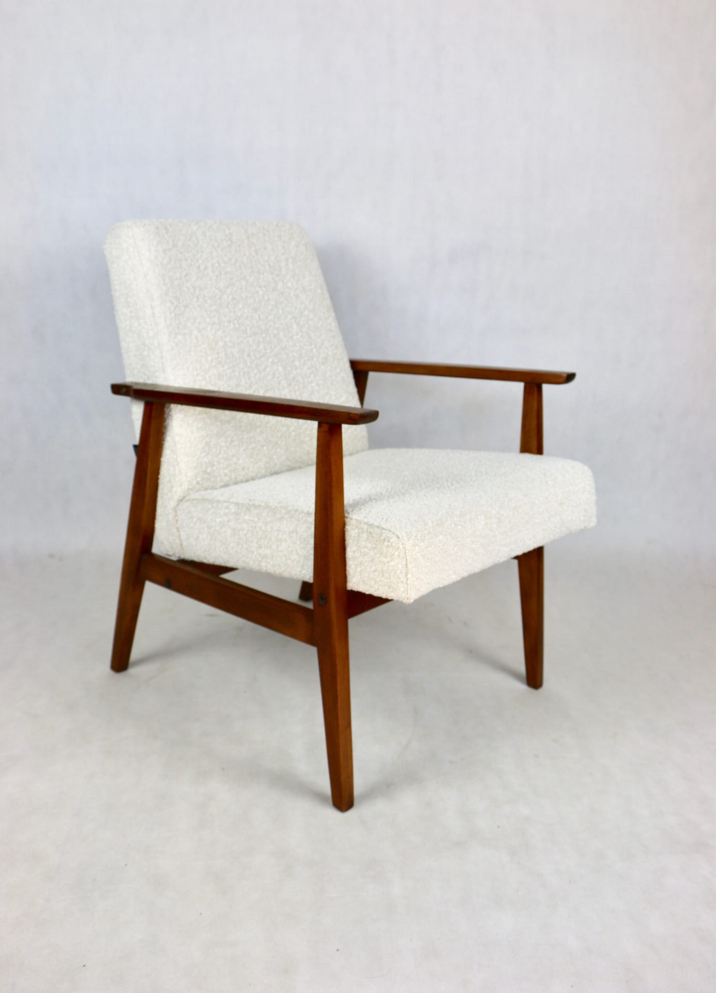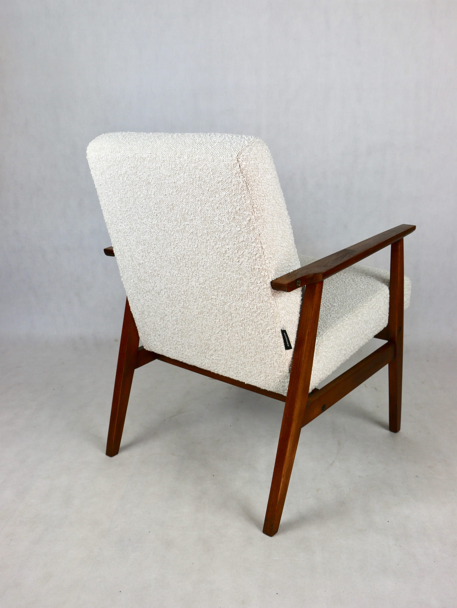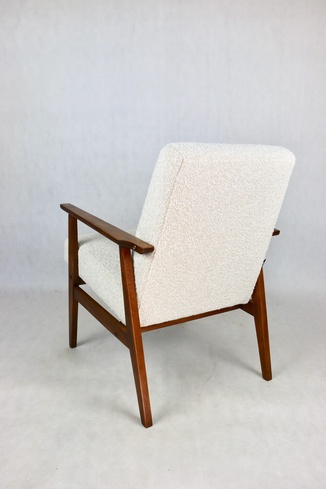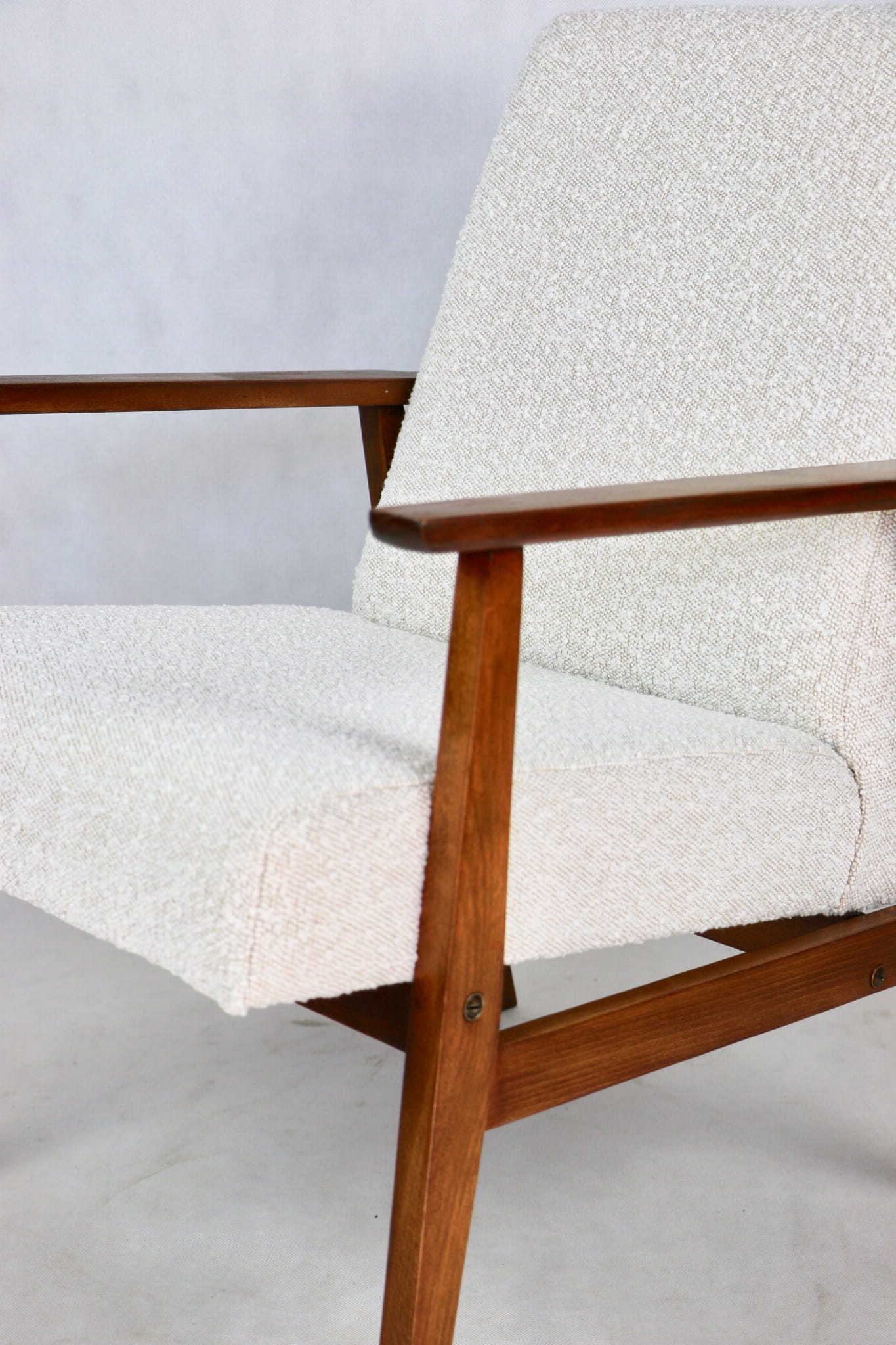 Odrestaurowany fotel Henryka Lis-a z roku 1970, nowe strukturalne obicie w naturalnej tkaninie w kolorze beżowym. Stelaż drewniany połączony z podłokietnikami w naturalnej kolorystyce drewna.