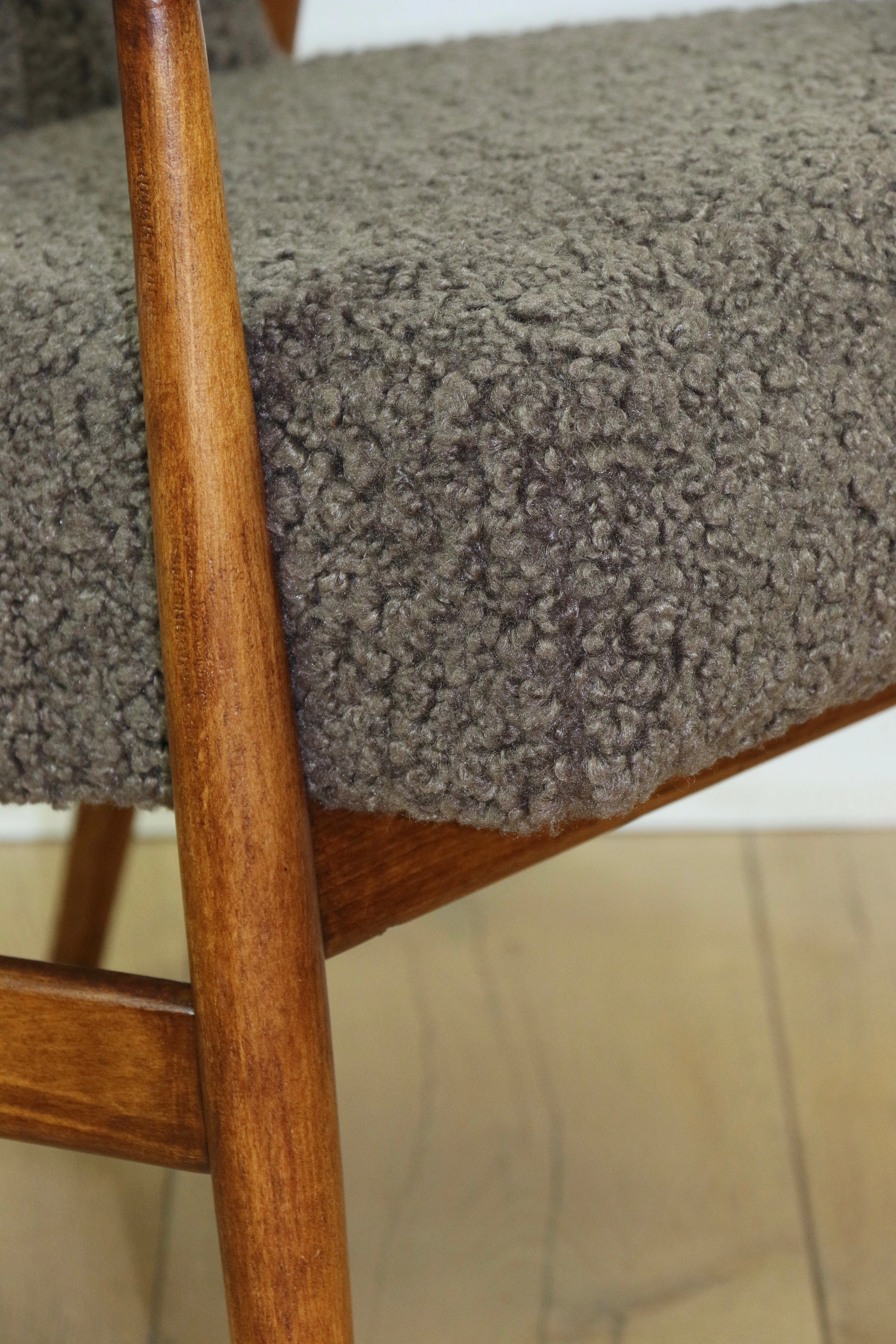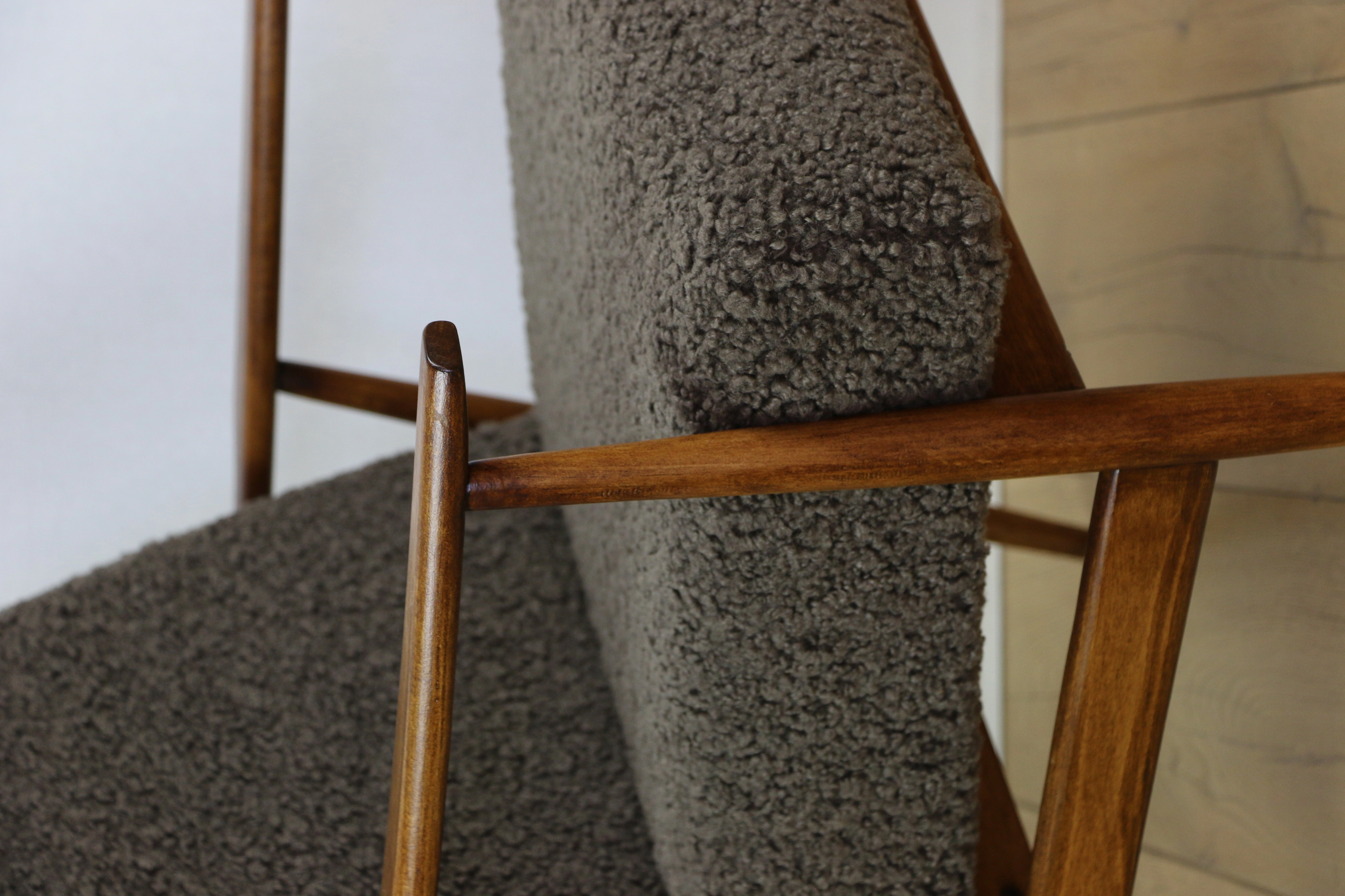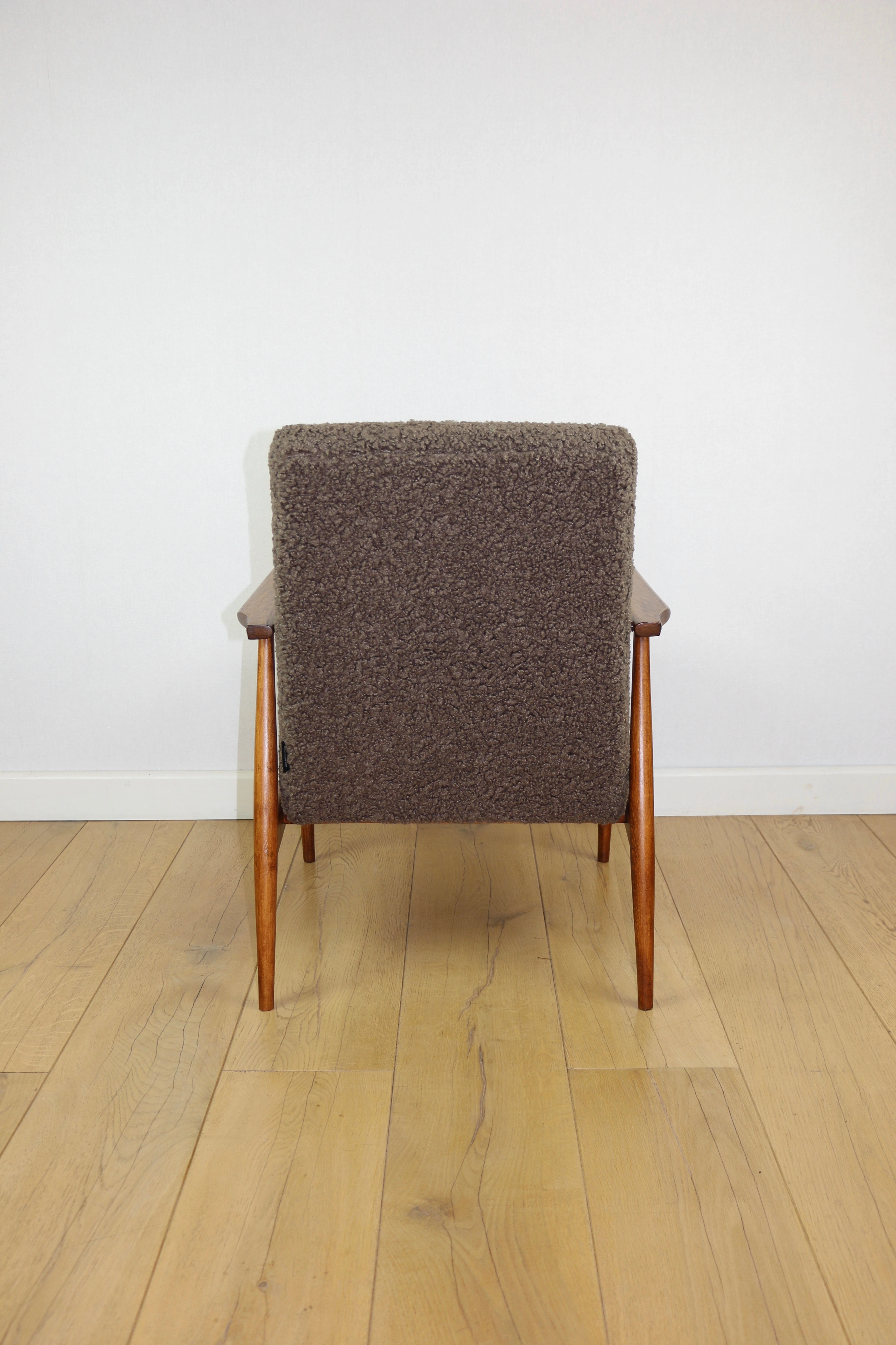 Odrestaurowany kultowy fotel Henryka Lis-a z roku 1970, nowe obicie w tkaninie boucle baranek w kolorze brązowym. Stelaż drewniany połączony z podłokietnikami w ciemnej naturalnej kolorystyce drewna bukowego pokryty lakiero-woskiem.