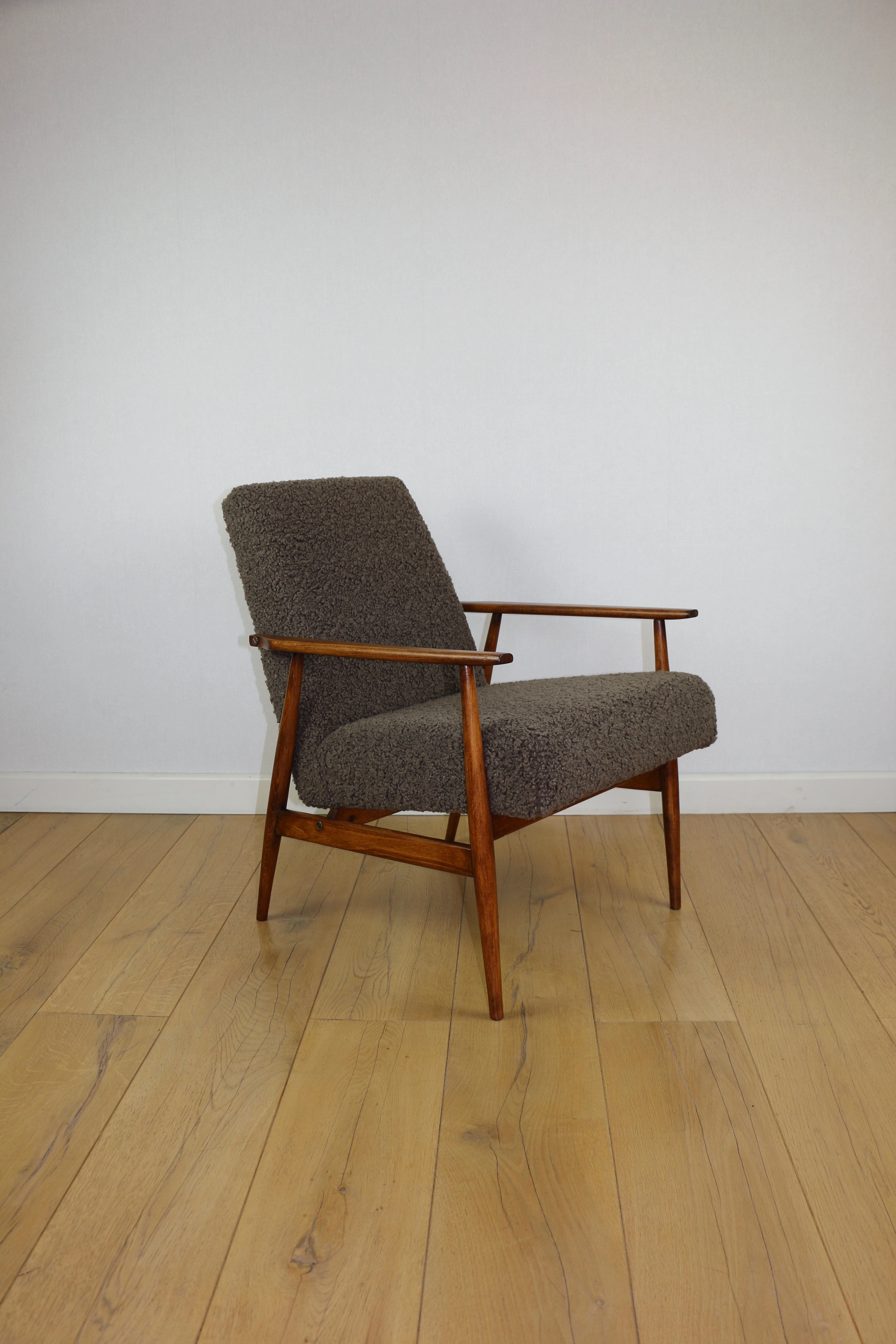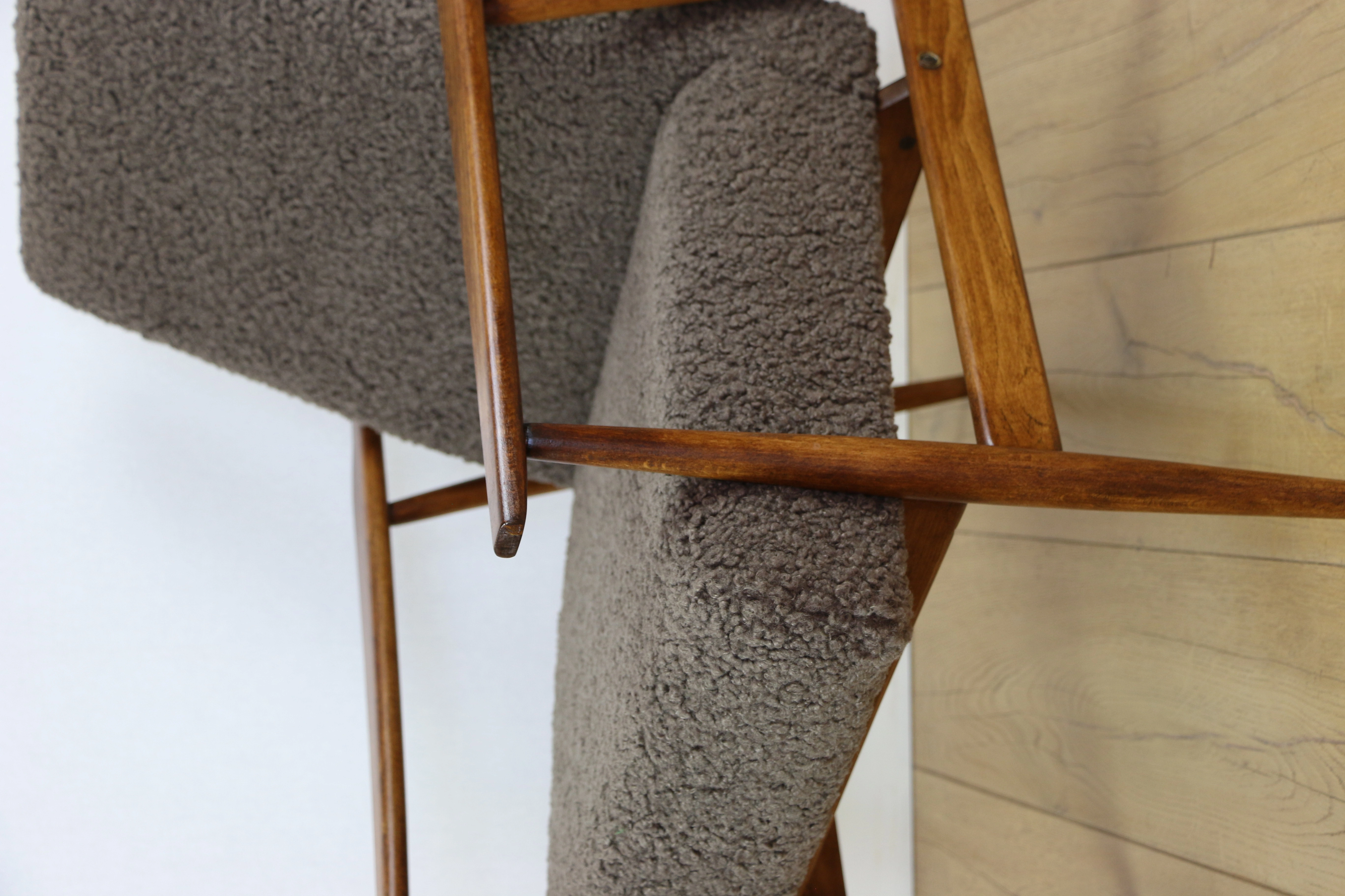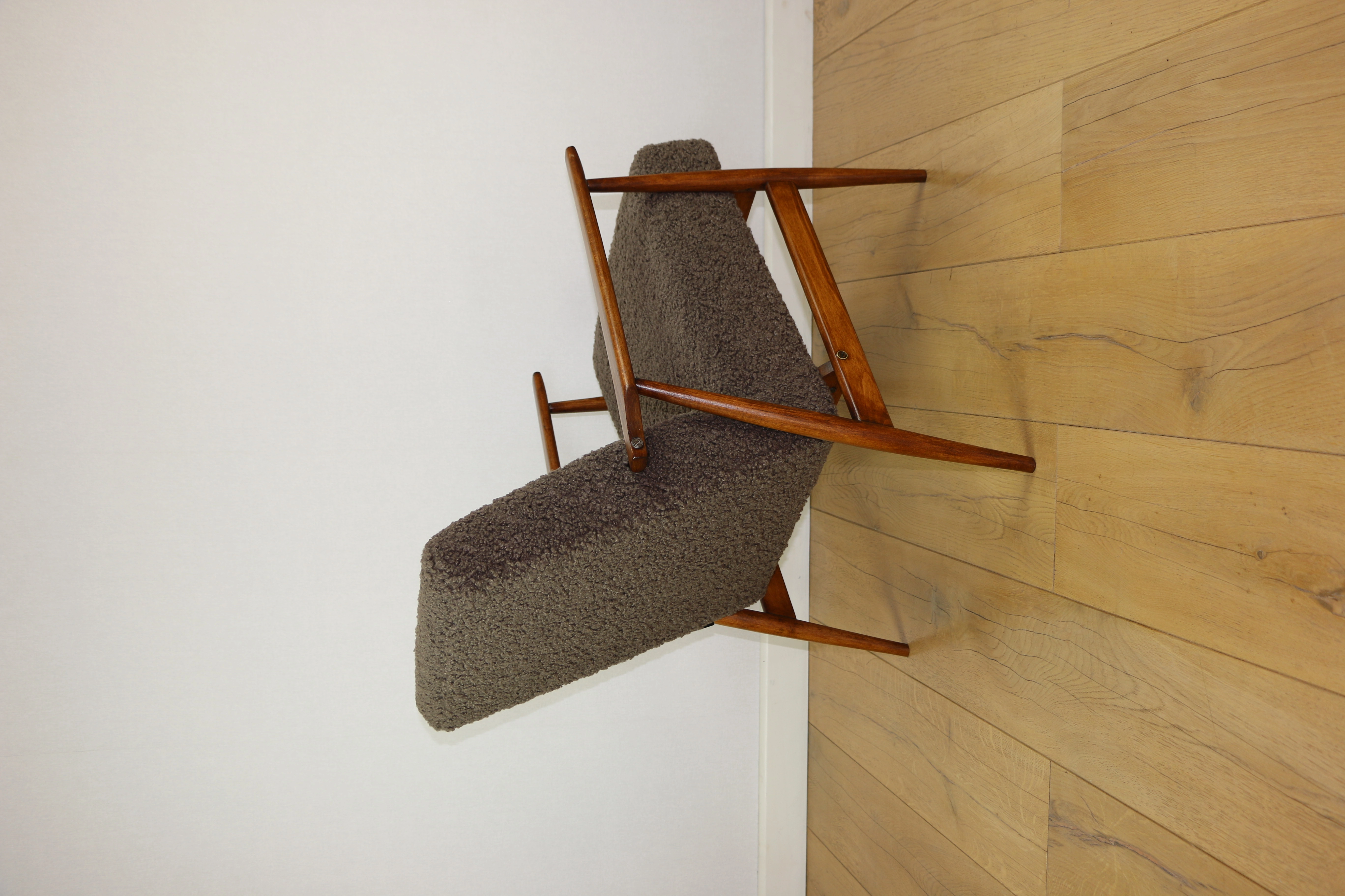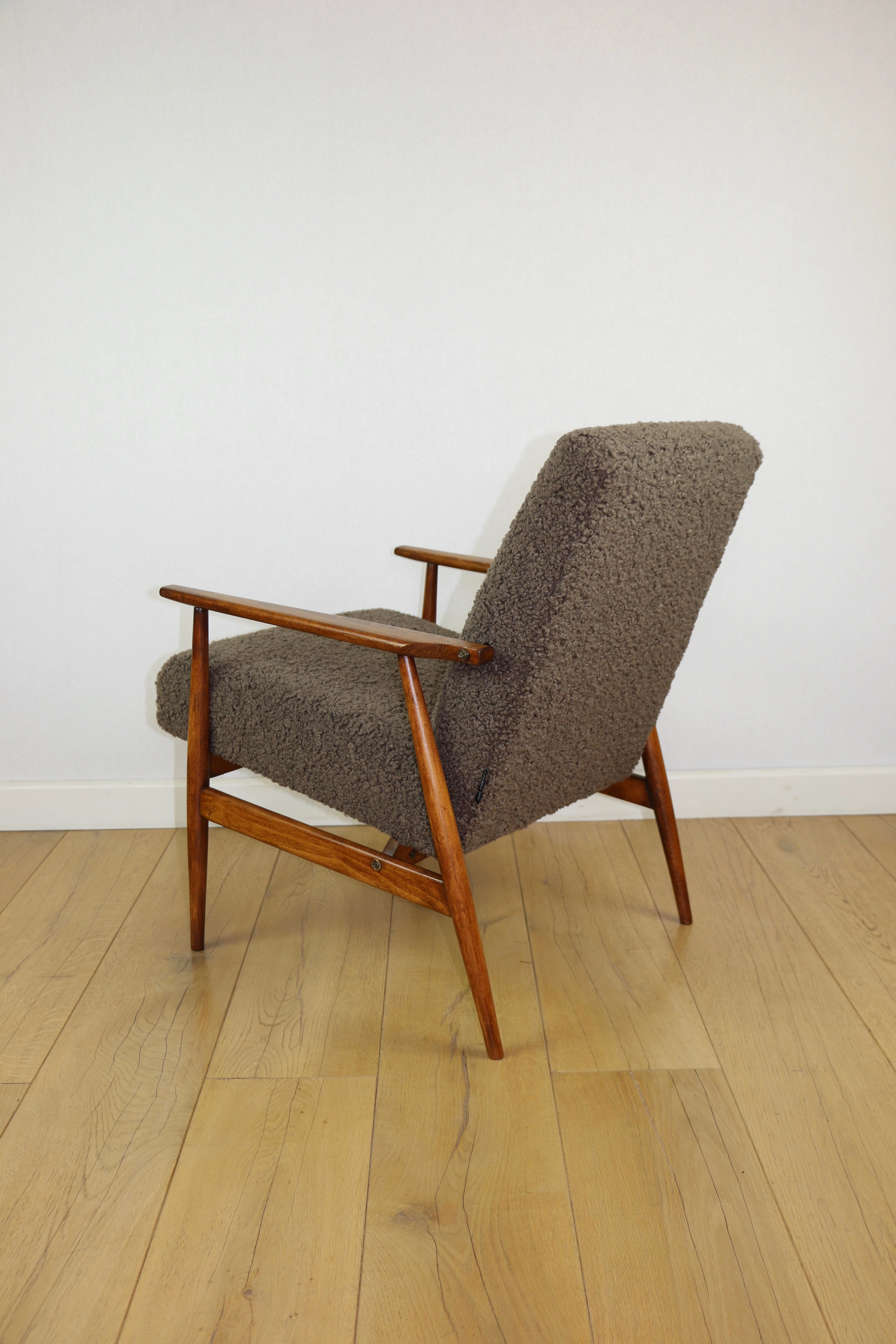 Odrestaurowany kultowy fotel Henryka Lis-a z roku 1970, nowe obicie w tkaninie boucle baranek w kolorze brązowym. Stelaż drewniany połączony z podłokietnikami w ciemnej naturalnej kolorystyce drewna bukowego pokryty lakiero-woskiem.