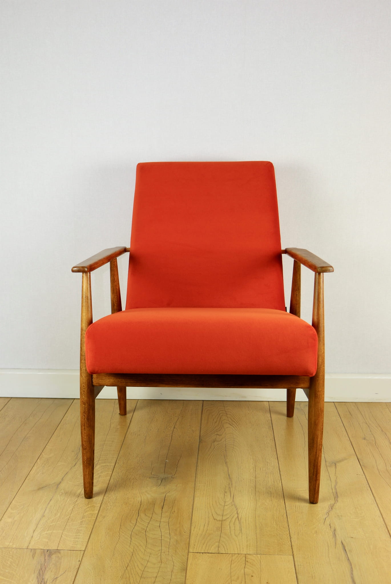 Odrestaurowany fotel Henryka Lis-a z roku 1970, nowe welwetowe obicie w kolorze pomarańczowym. Stelaż drewniany połączony z podłokietnikami w ciemnej kolorystyce drewna.