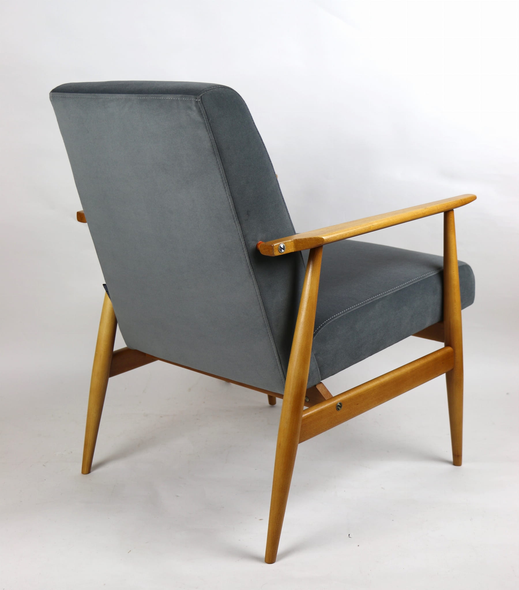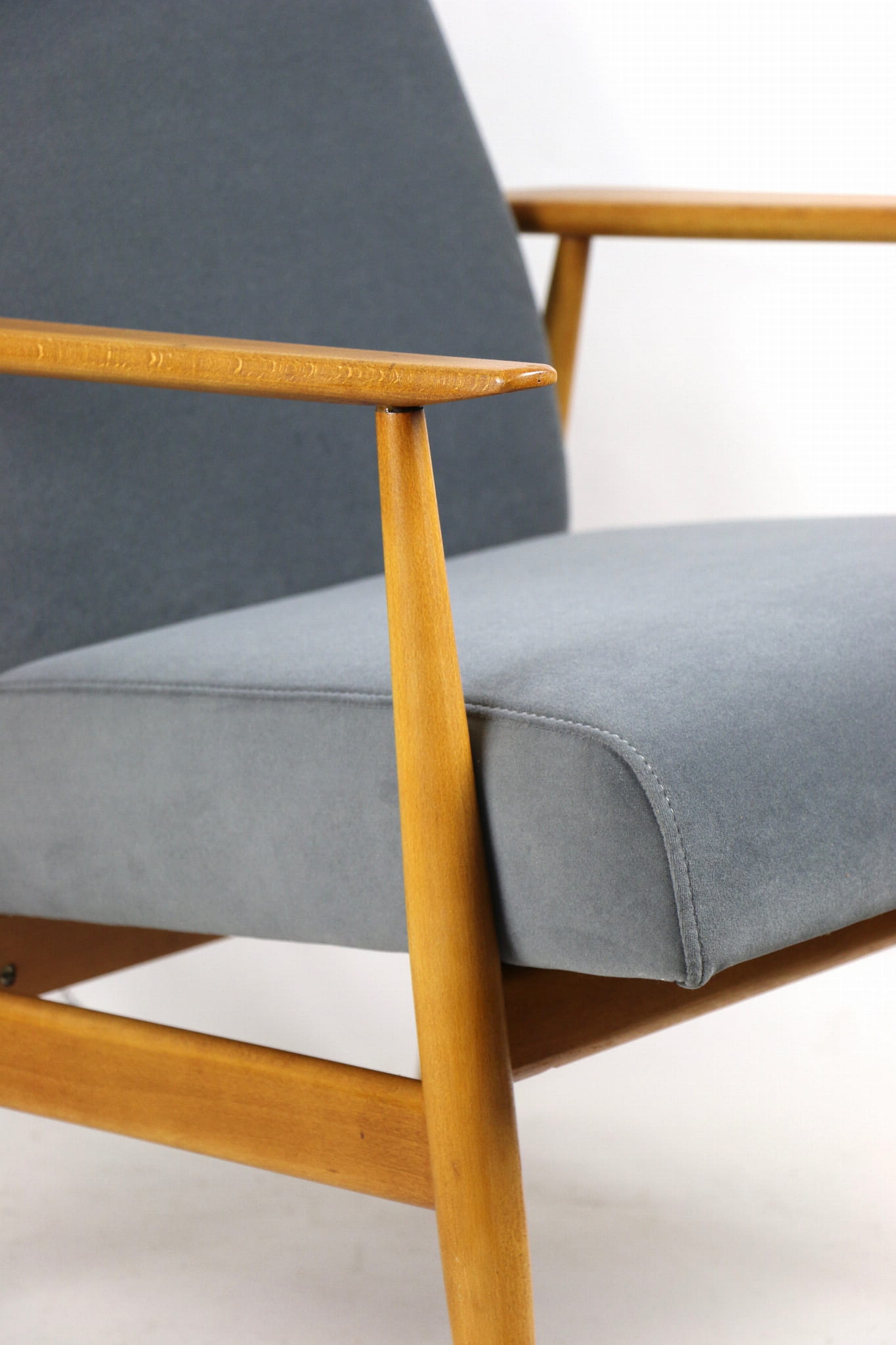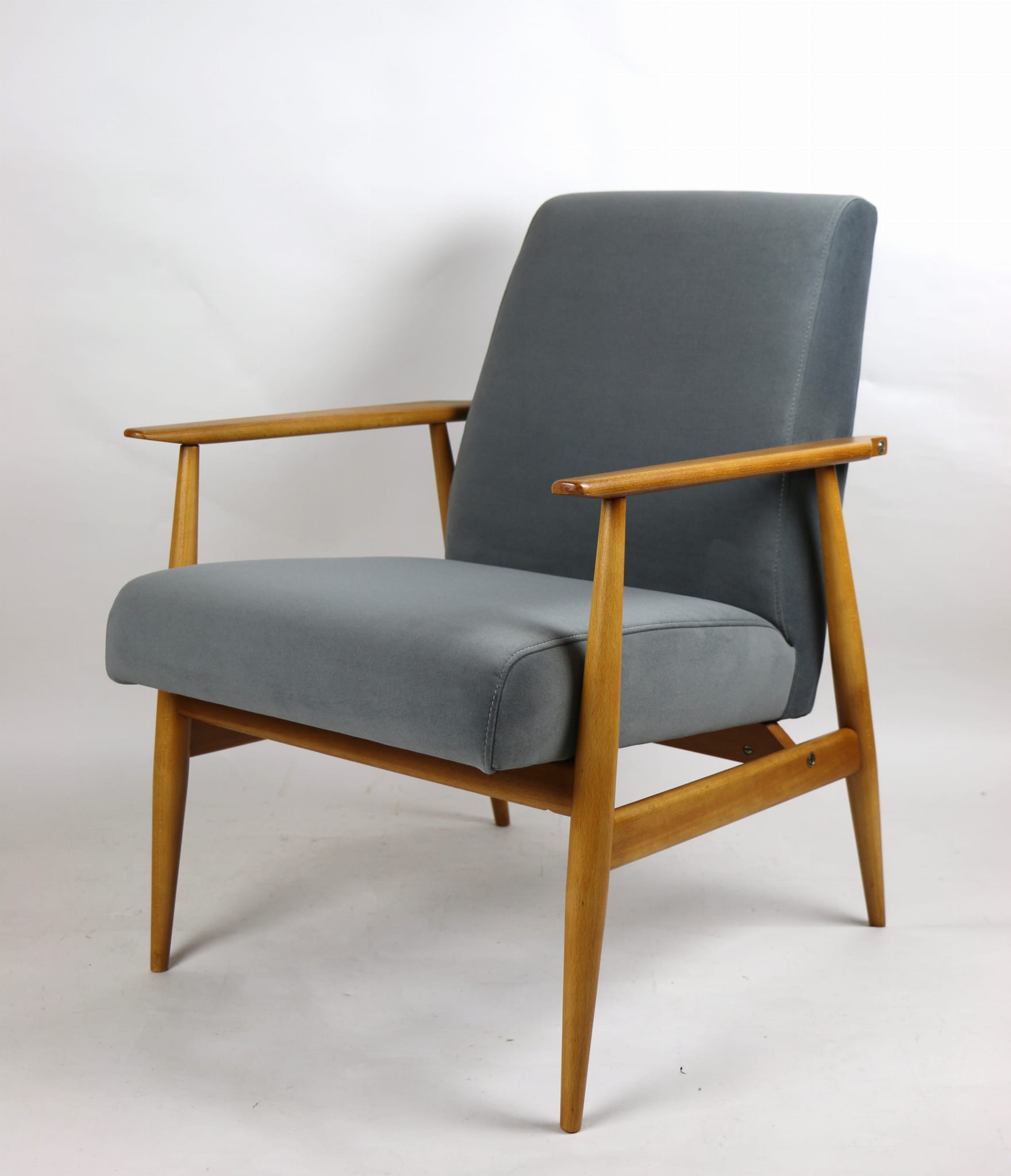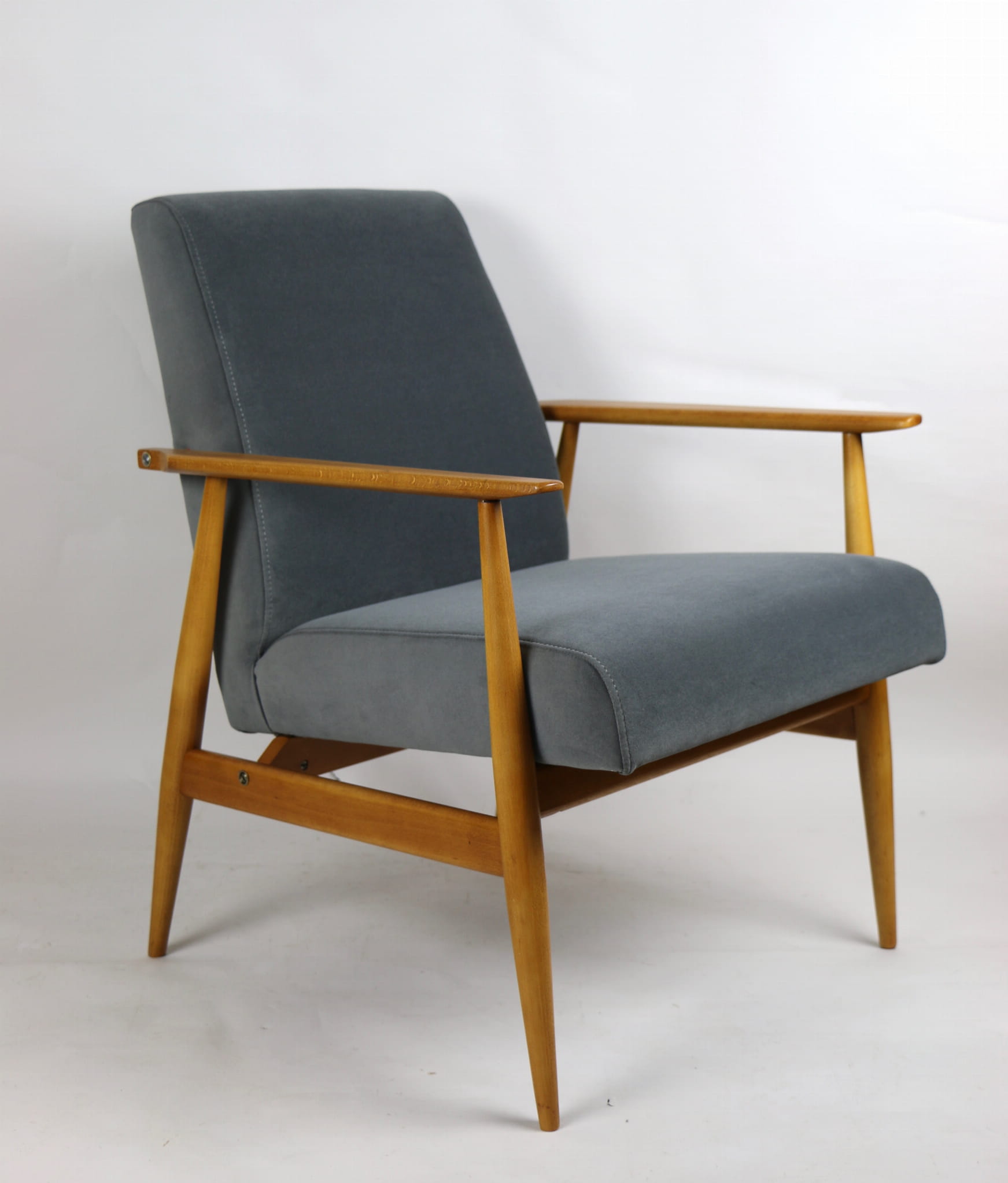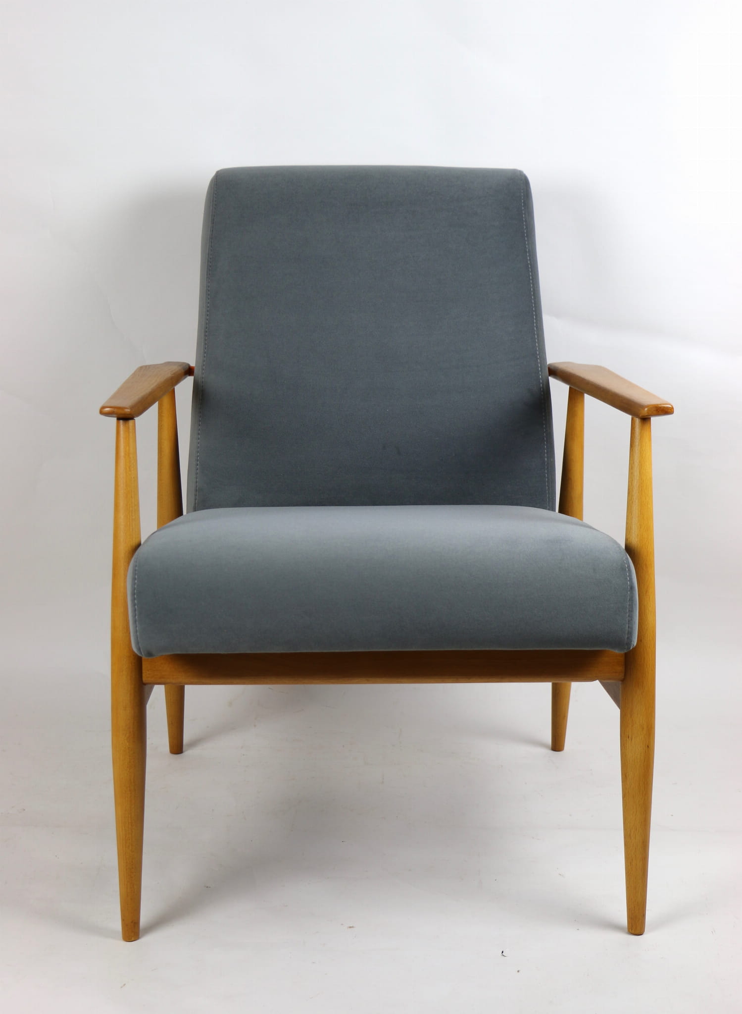 W pełni odrestaurowany fotel projektu H.Lis, który posiada nowe aksamitne obicie w pięknym szarym kolorze z serii Jade. Stelaż drewniany połączony z podłokietnikami w jasnej naturalnej kolorystyce drewna.