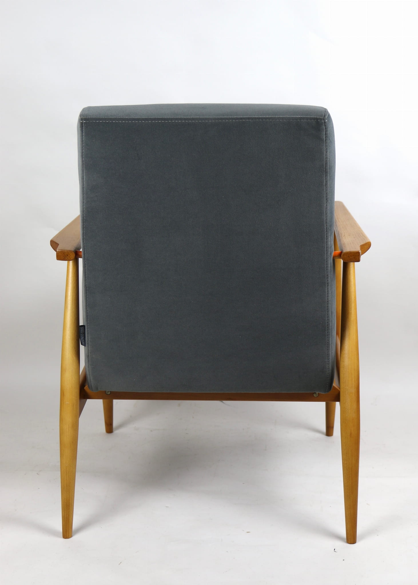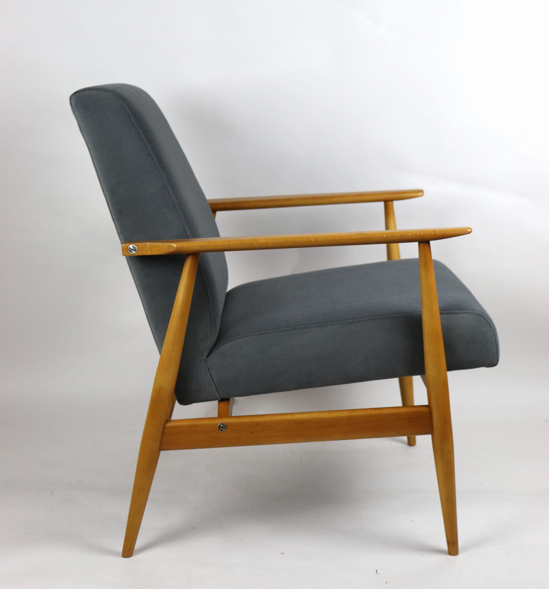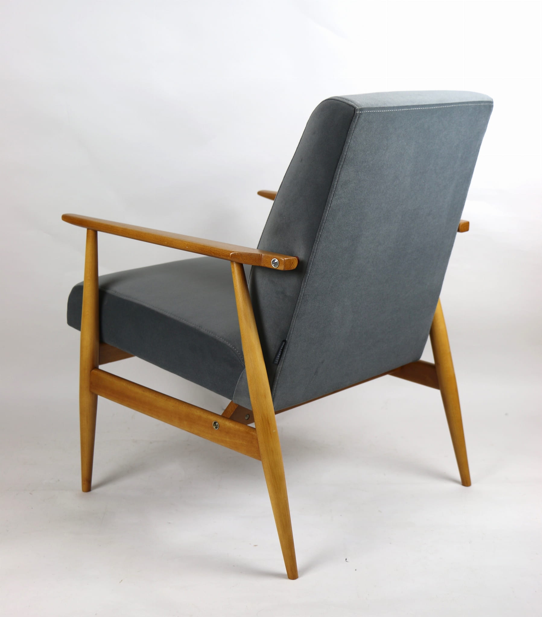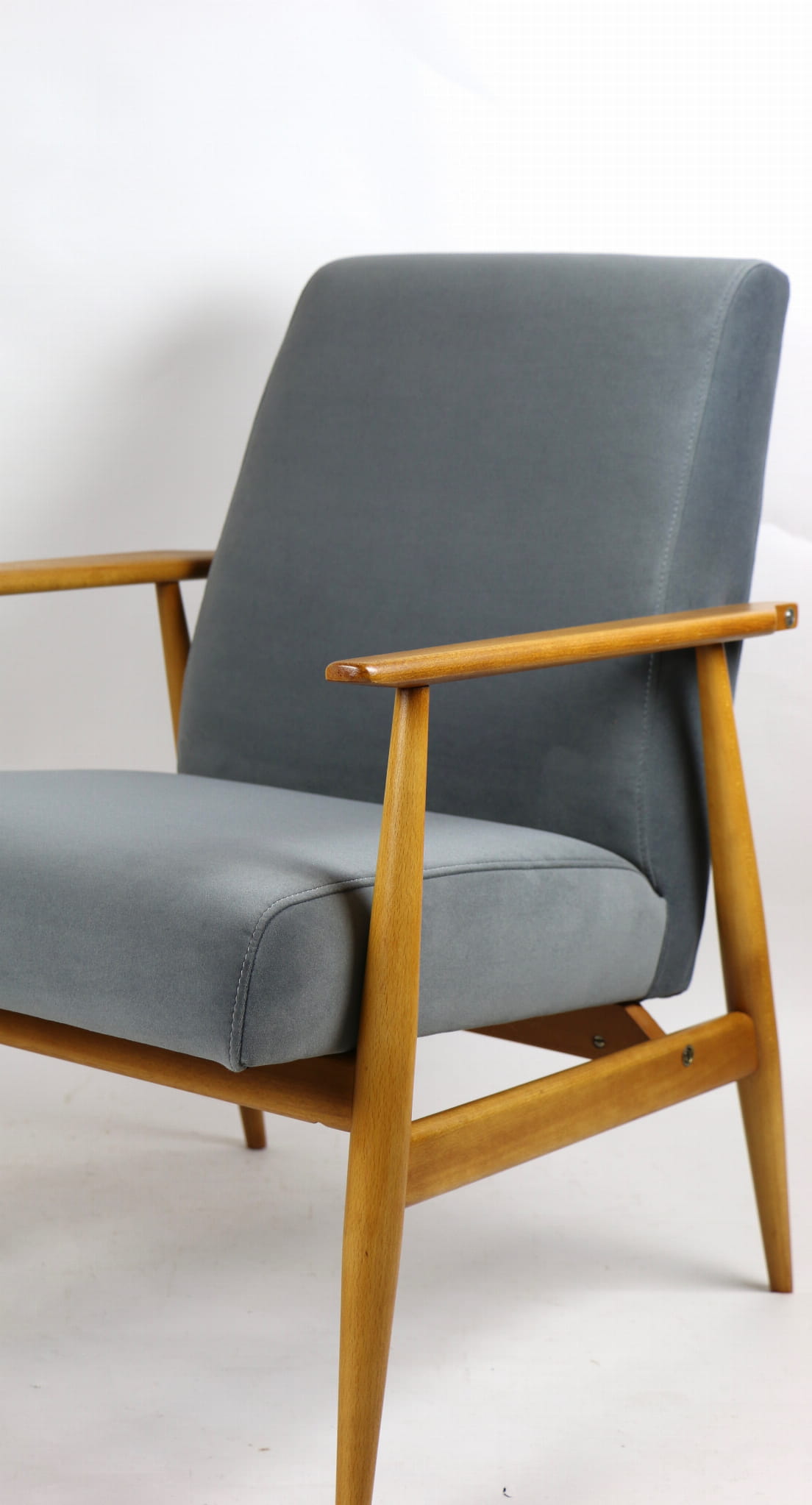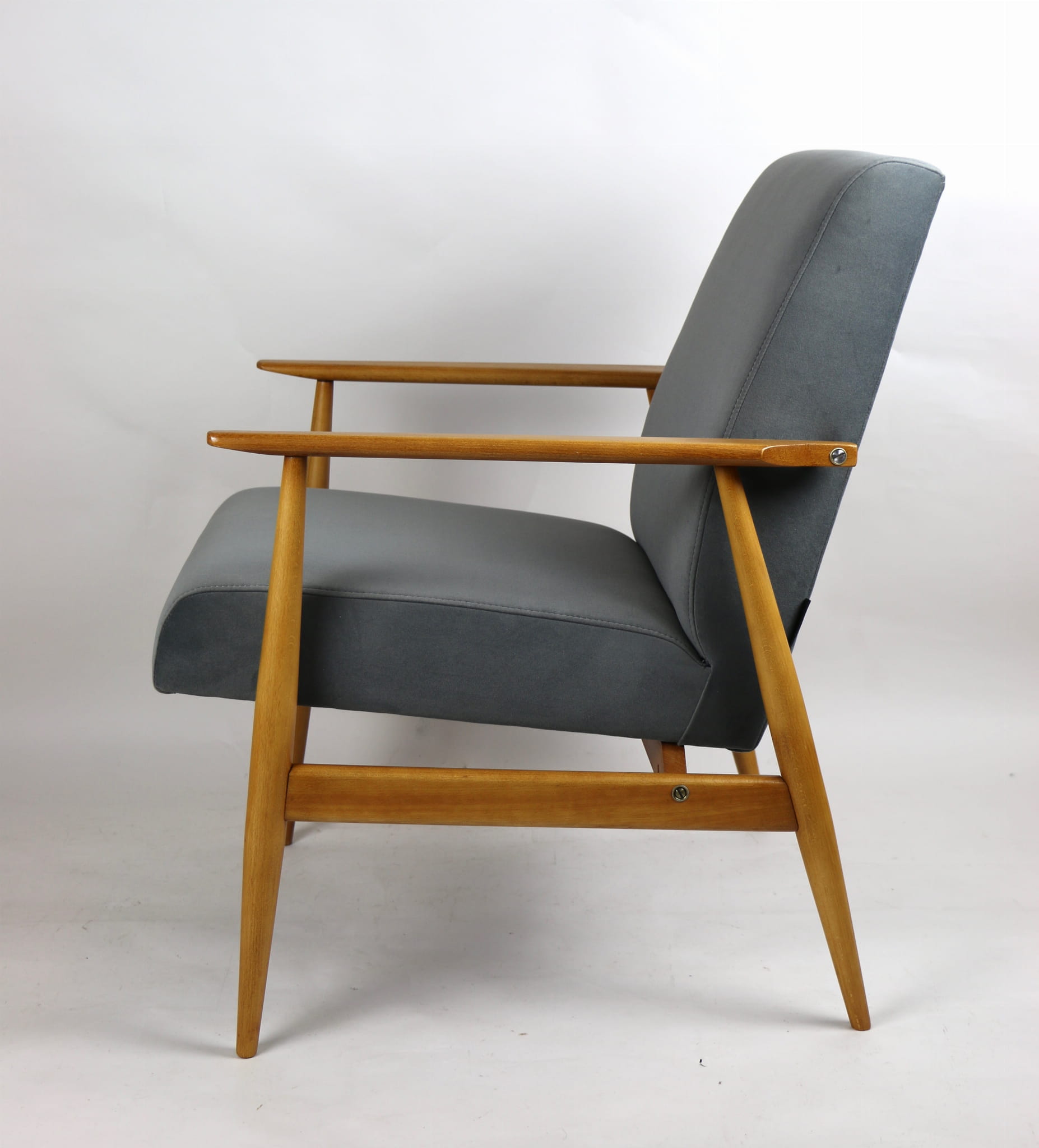 W pełni odrestaurowany fotel projektu H.Lis, który posiada nowe aksamitne obicie w pięknym szarym kolorze z serii Jade. Stelaż drewniany połączony z podłokietnikami w jasnej naturalnej kolorystyce drewna.