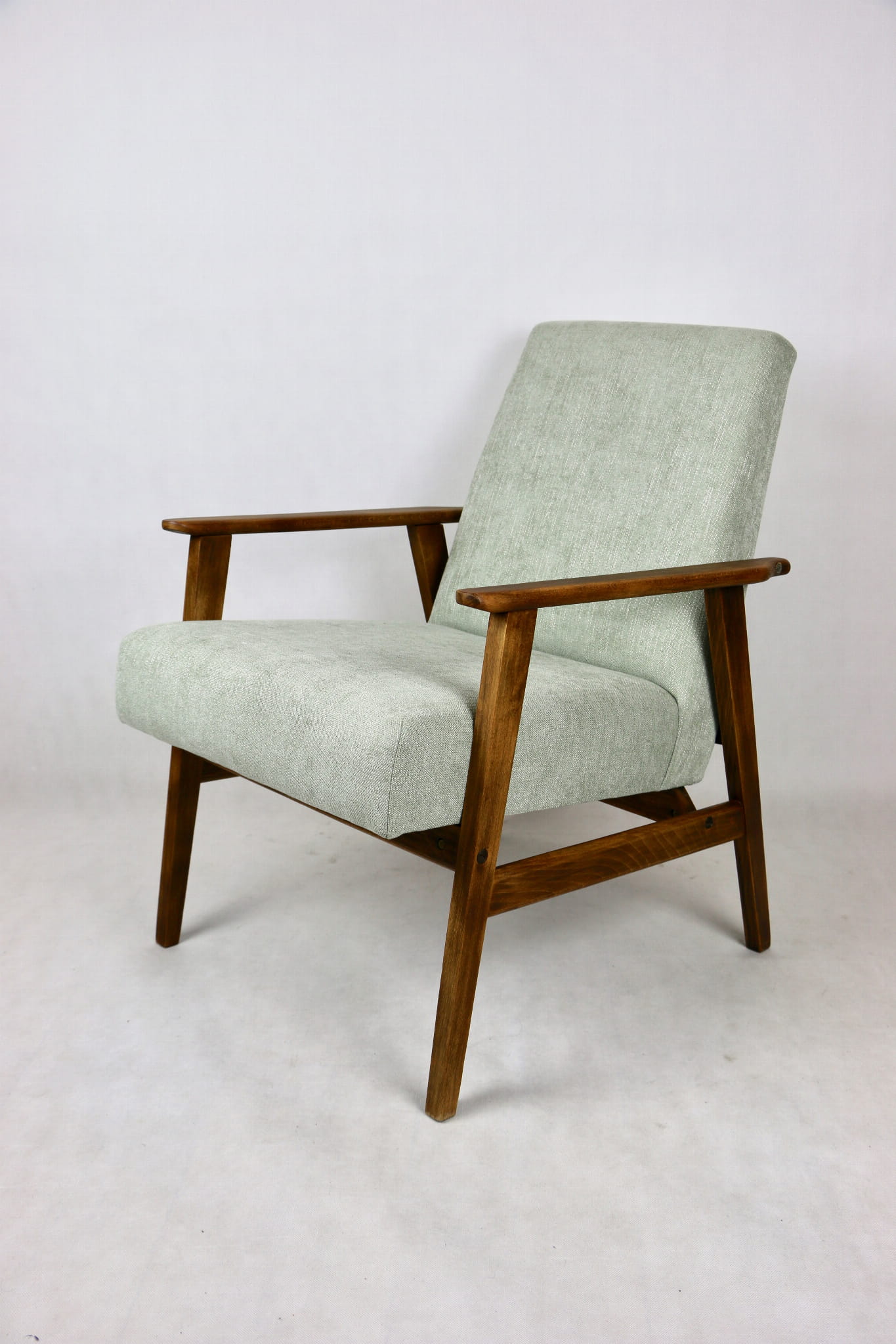 Odrestaurowany fotel Henryka Lis-a z roku 1970, nowe strukturalne obicie w tkaninie w kolorze zielonym z serii Danubio. Stelaż drewniany połączony z podłokietnikami w ciemnej kolorystyce drewna.