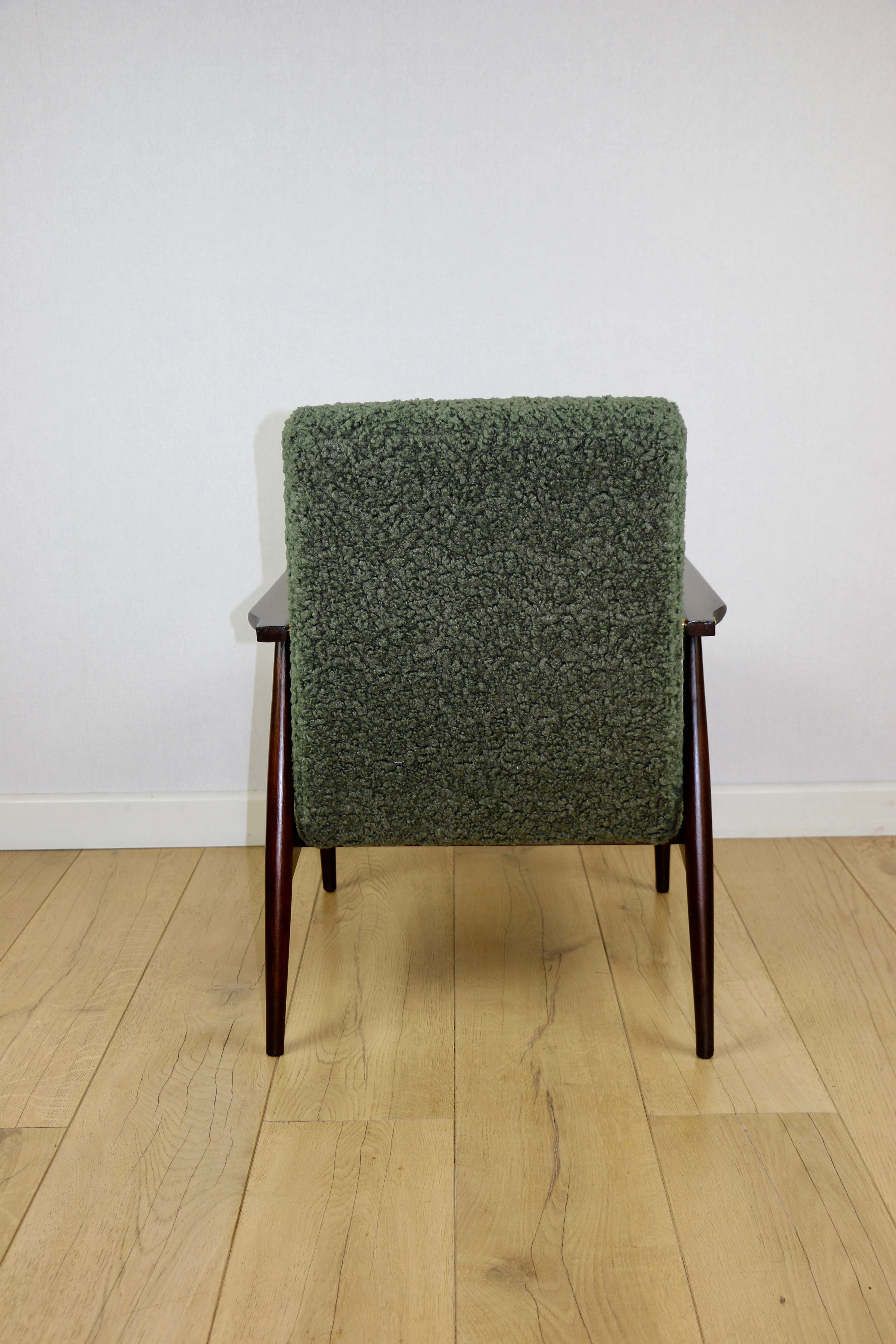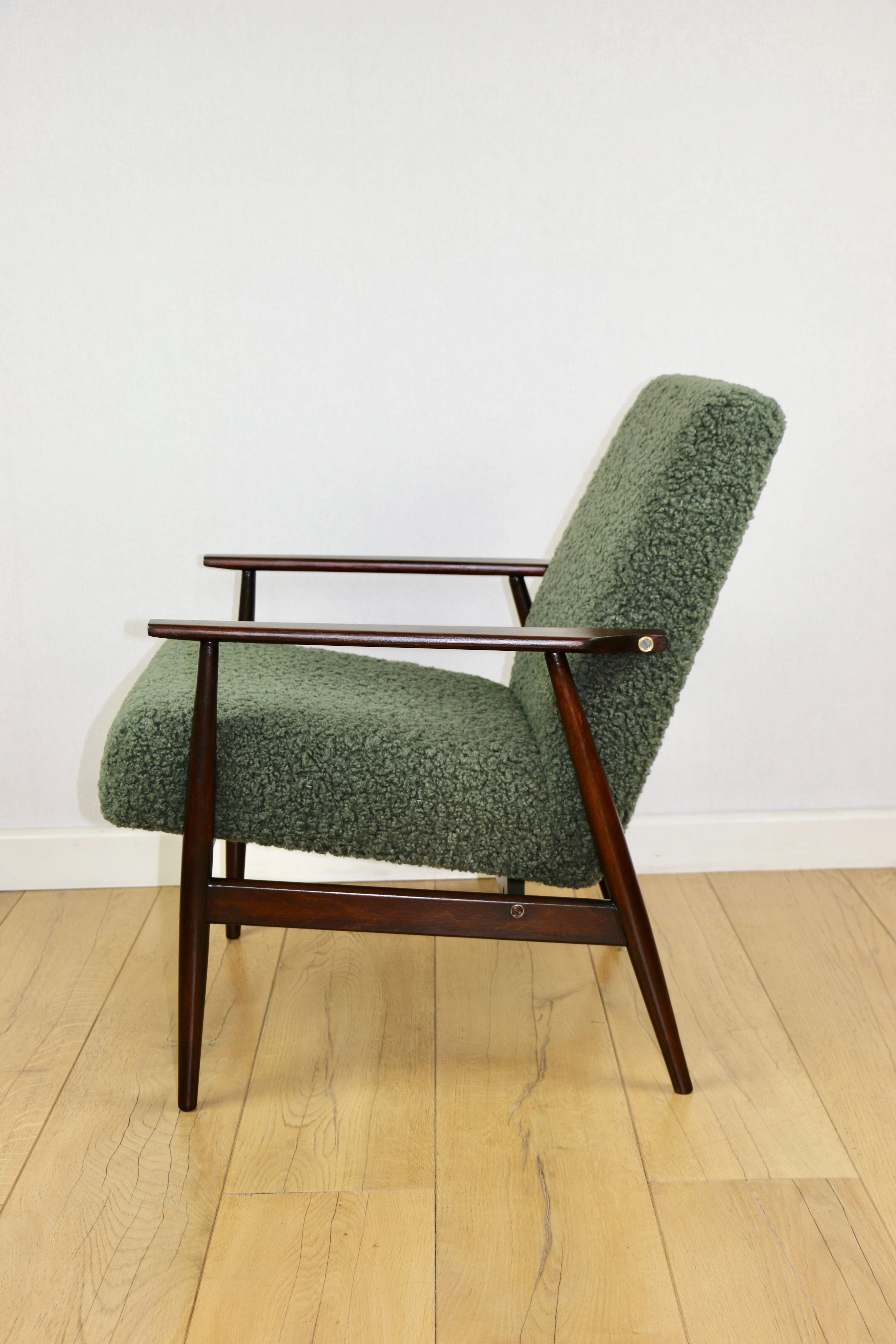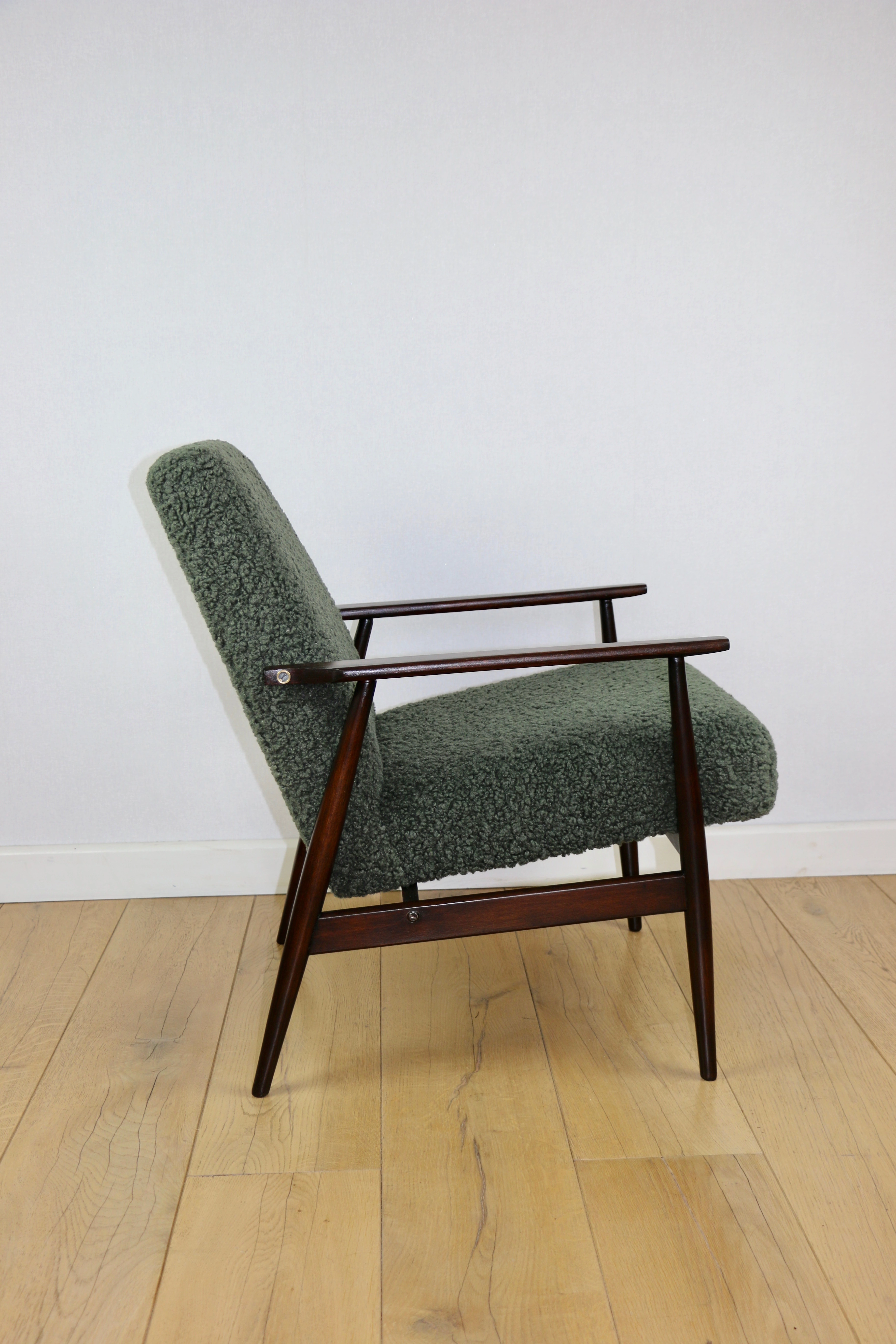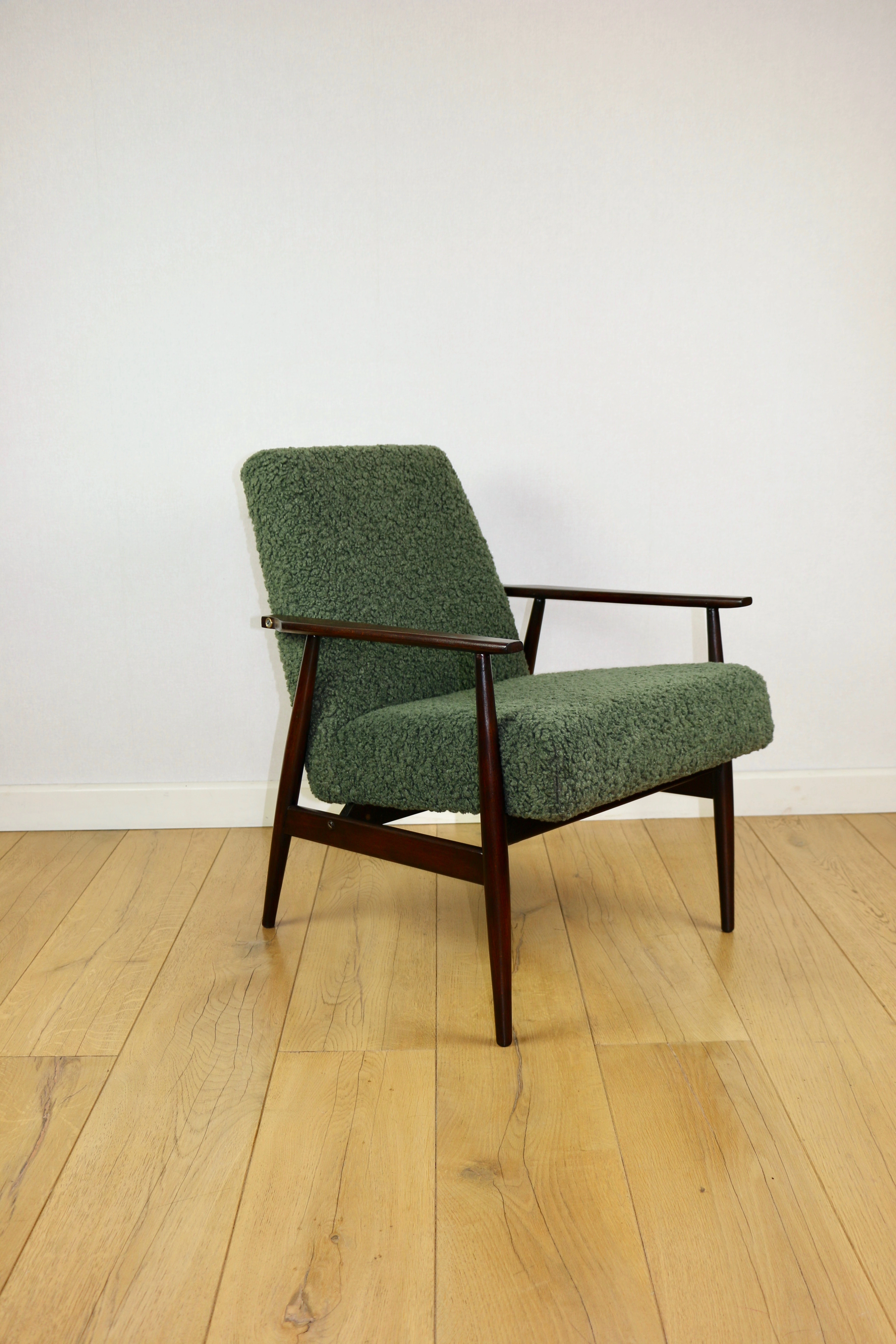 Odrestaurowany kultowy fotel Henryka Lis-a z roku 1970, nowe obicie w tkaninie boucle baranek w kolorze zielonym. Stelaż drewniany połączony z podłokietnikami w ciemnej naturalnej kolorystyce drewna bukowego pokryty lakiero-woskiem.