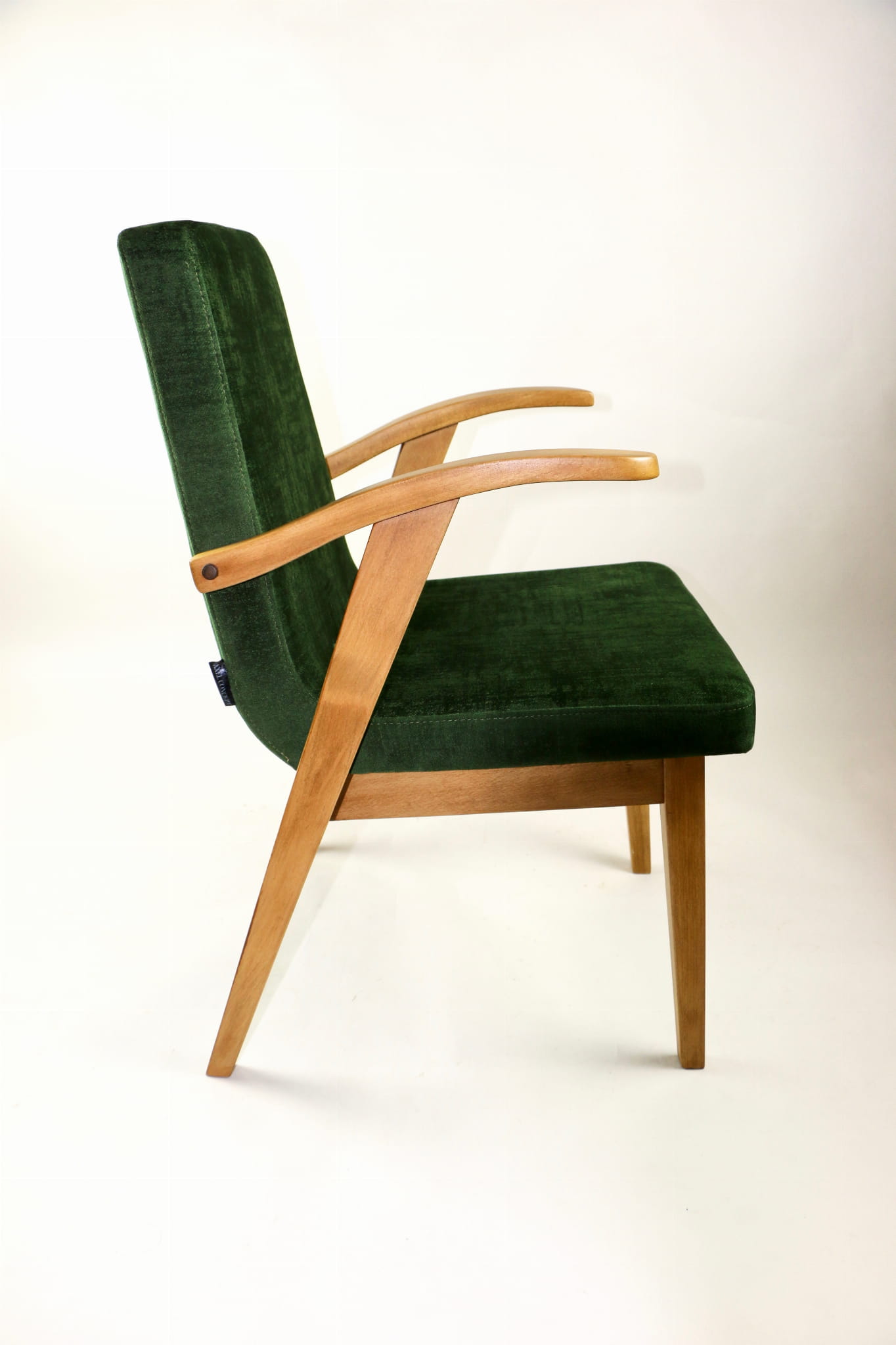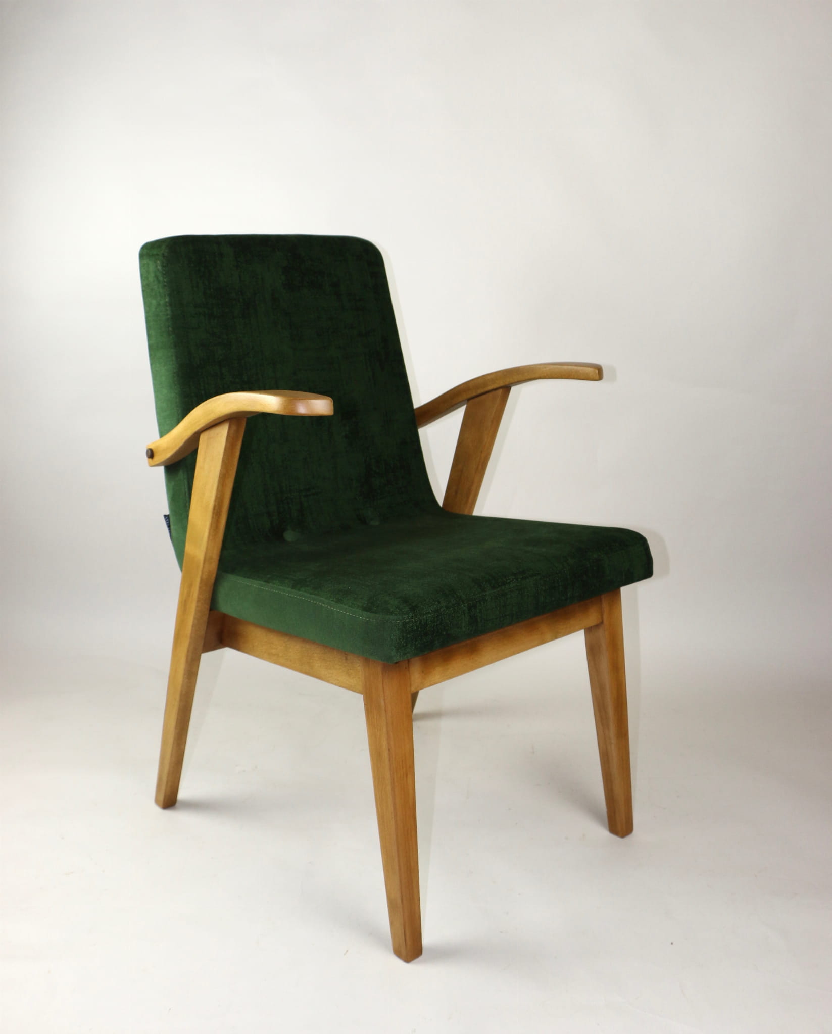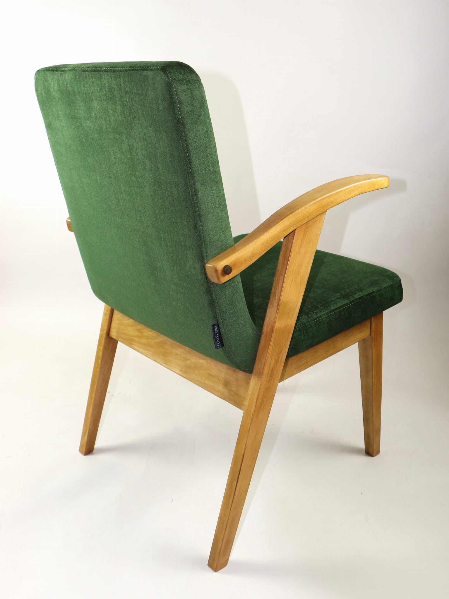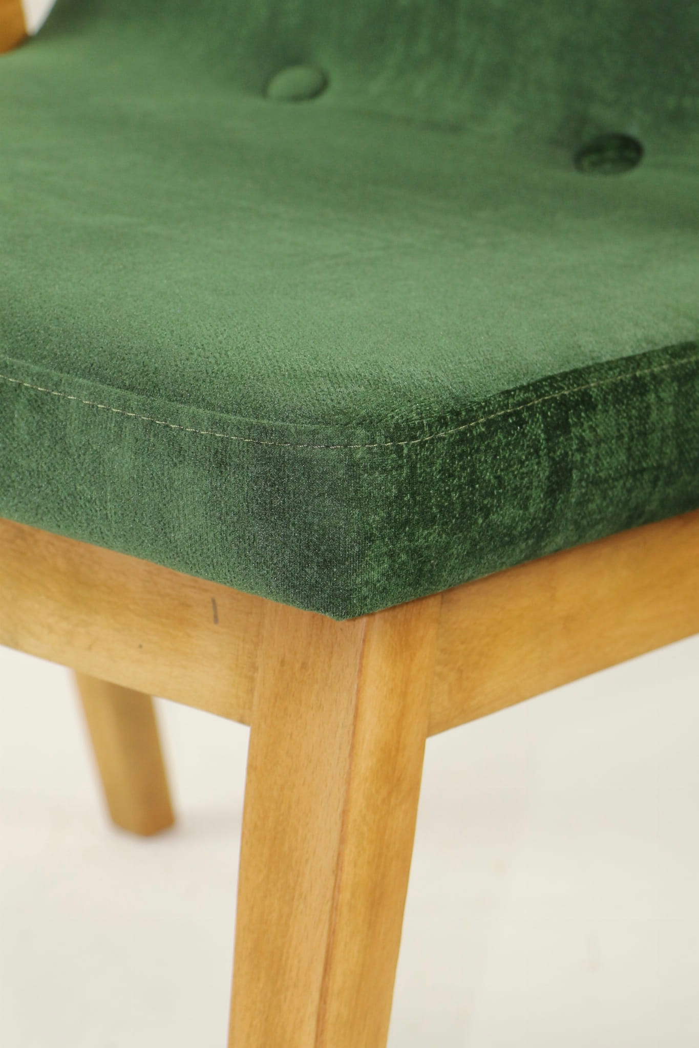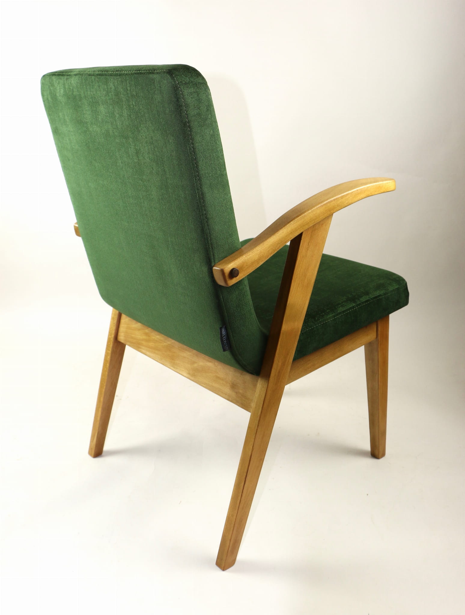 Fotel projektu M. Puchały. Kompletnie odrestaurowany. Nowe obicie pokryte najwyższej jakości aksamitnym materiałem tapicerskim w kolorze pięknej zieleni - seria Chameleon. Stelaż drewniany połączony z podłokietnikami w kolorze jasnego dębu.