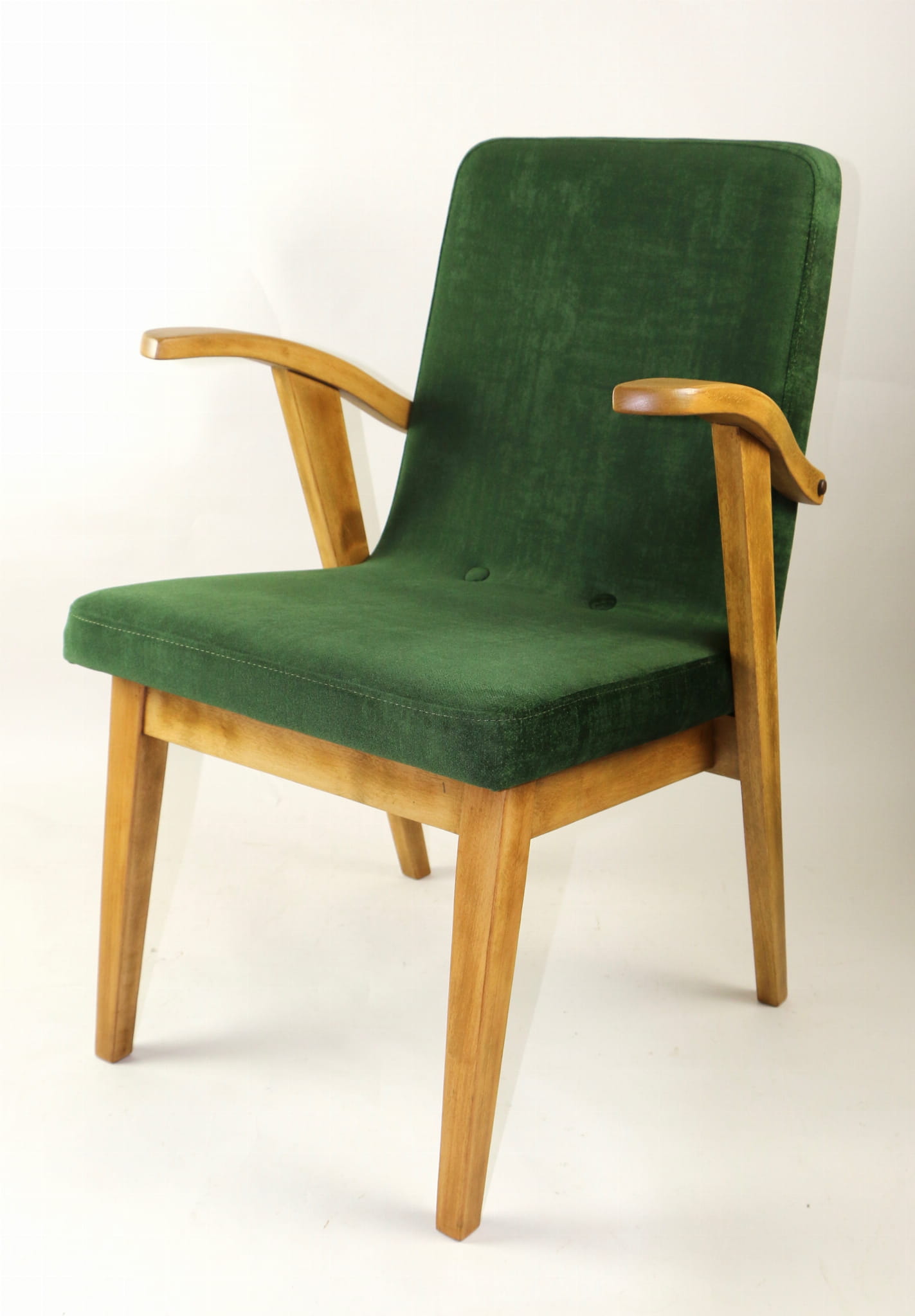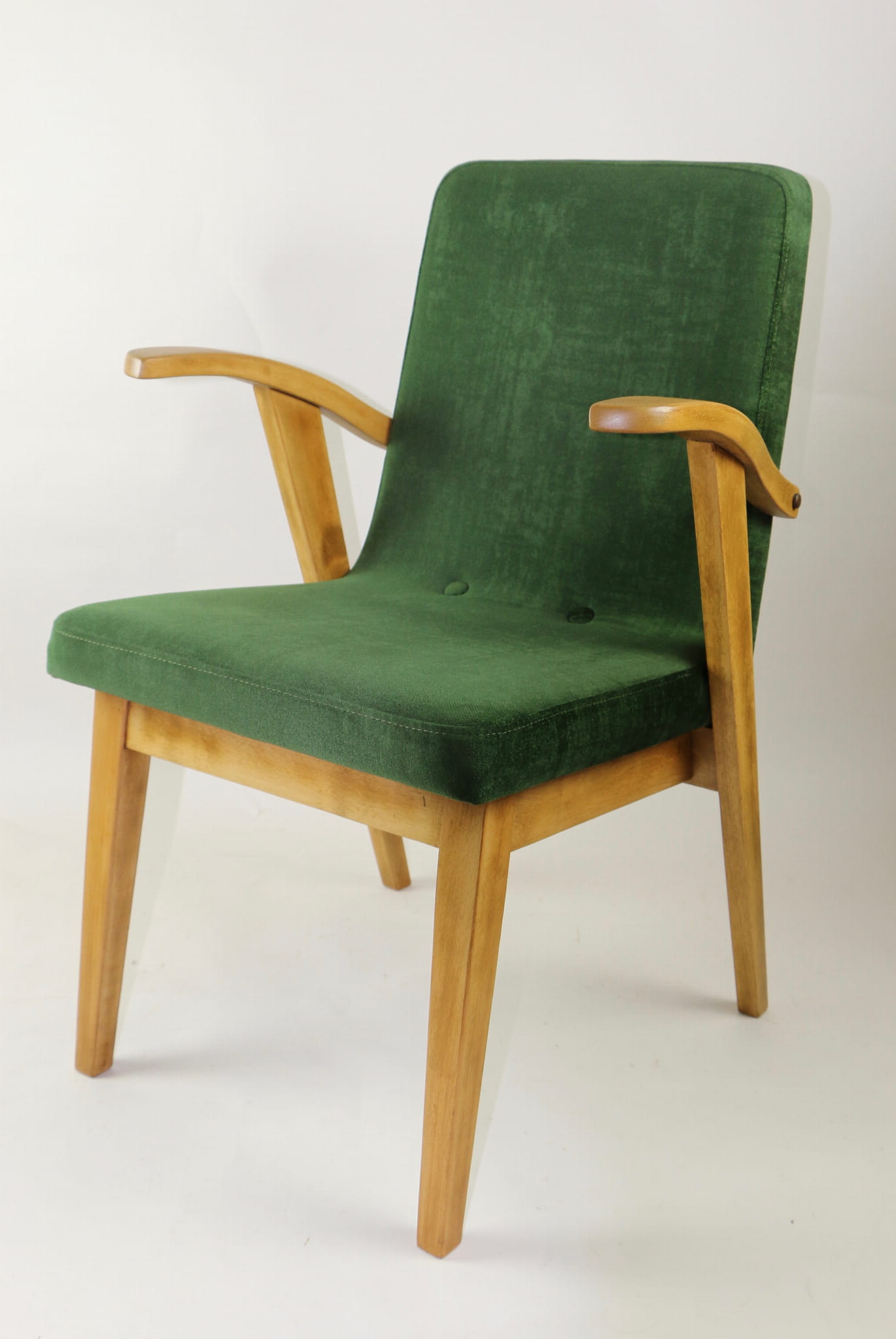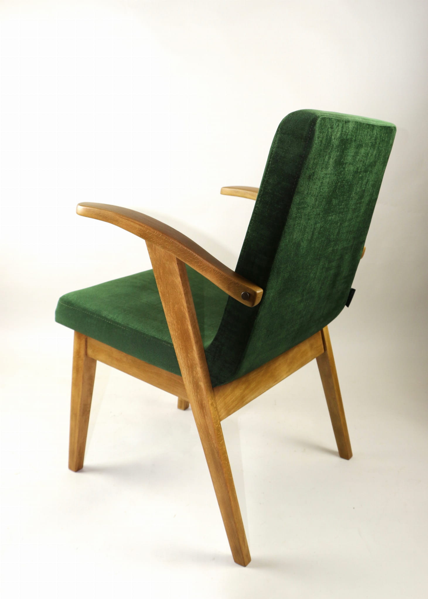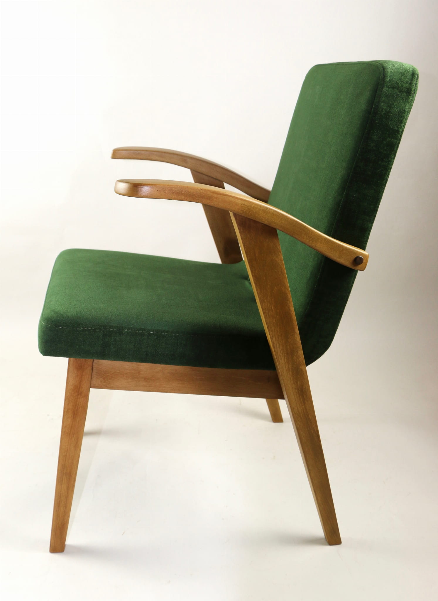 Fotel projektu M. Puchały. Kompletnie odrestaurowany. Nowe obicie pokryte najwyższej jakości aksamitnym materiałem tapicerskim w kolorze pięknej zieleni - seria Chameleon. Stelaż drewniany połączony z podłokietnikami w kolorze jasnego dębu.