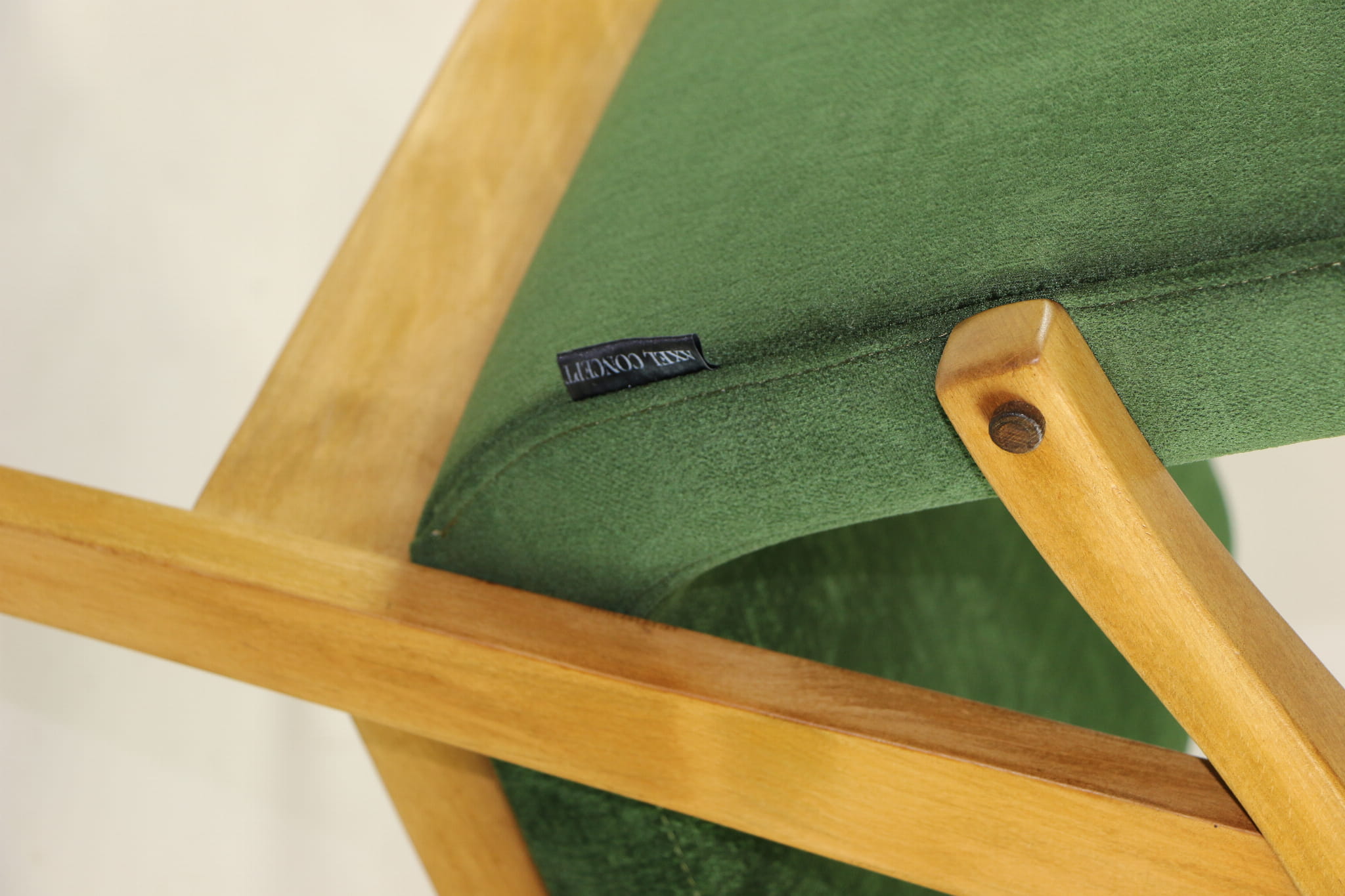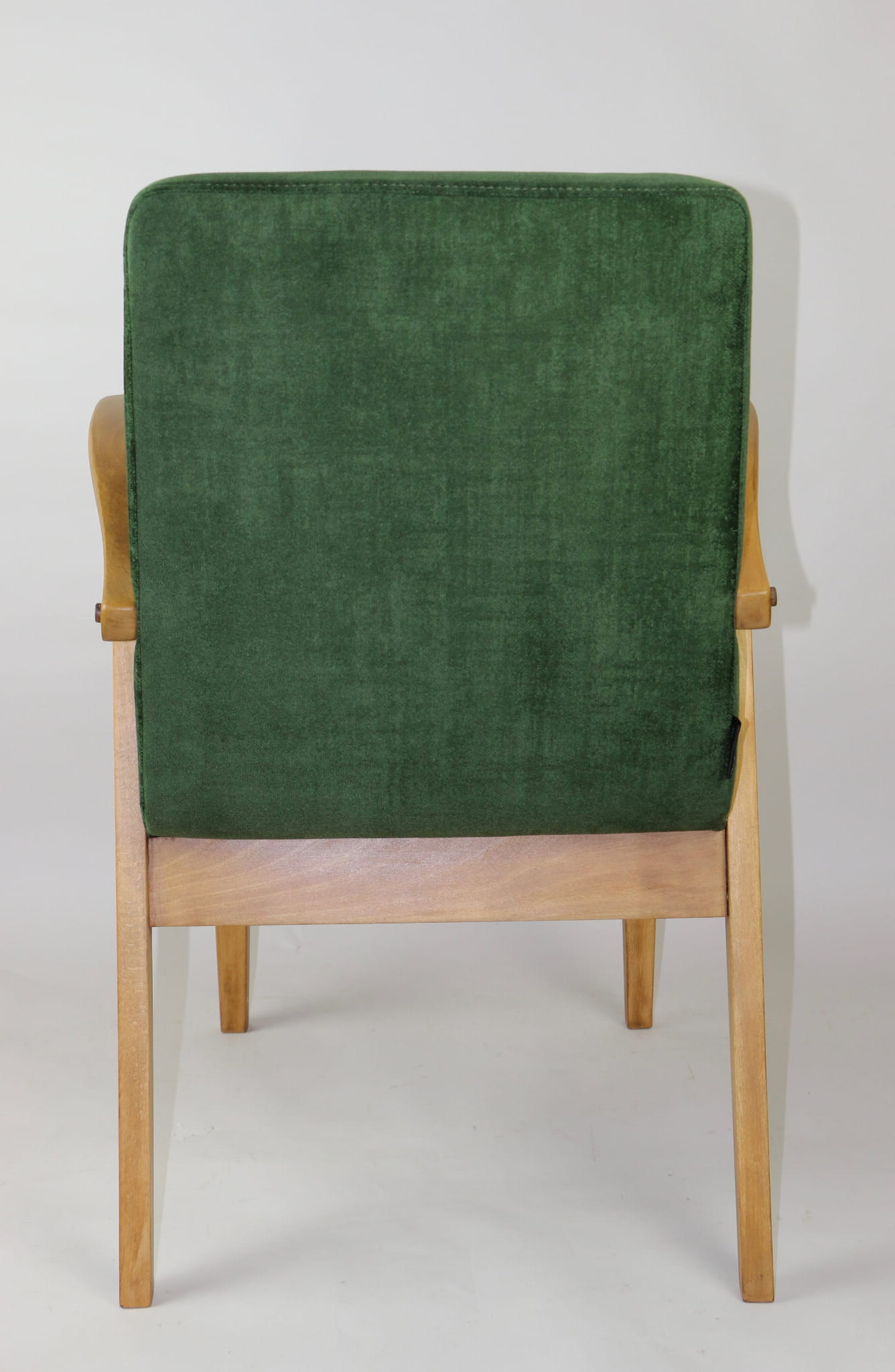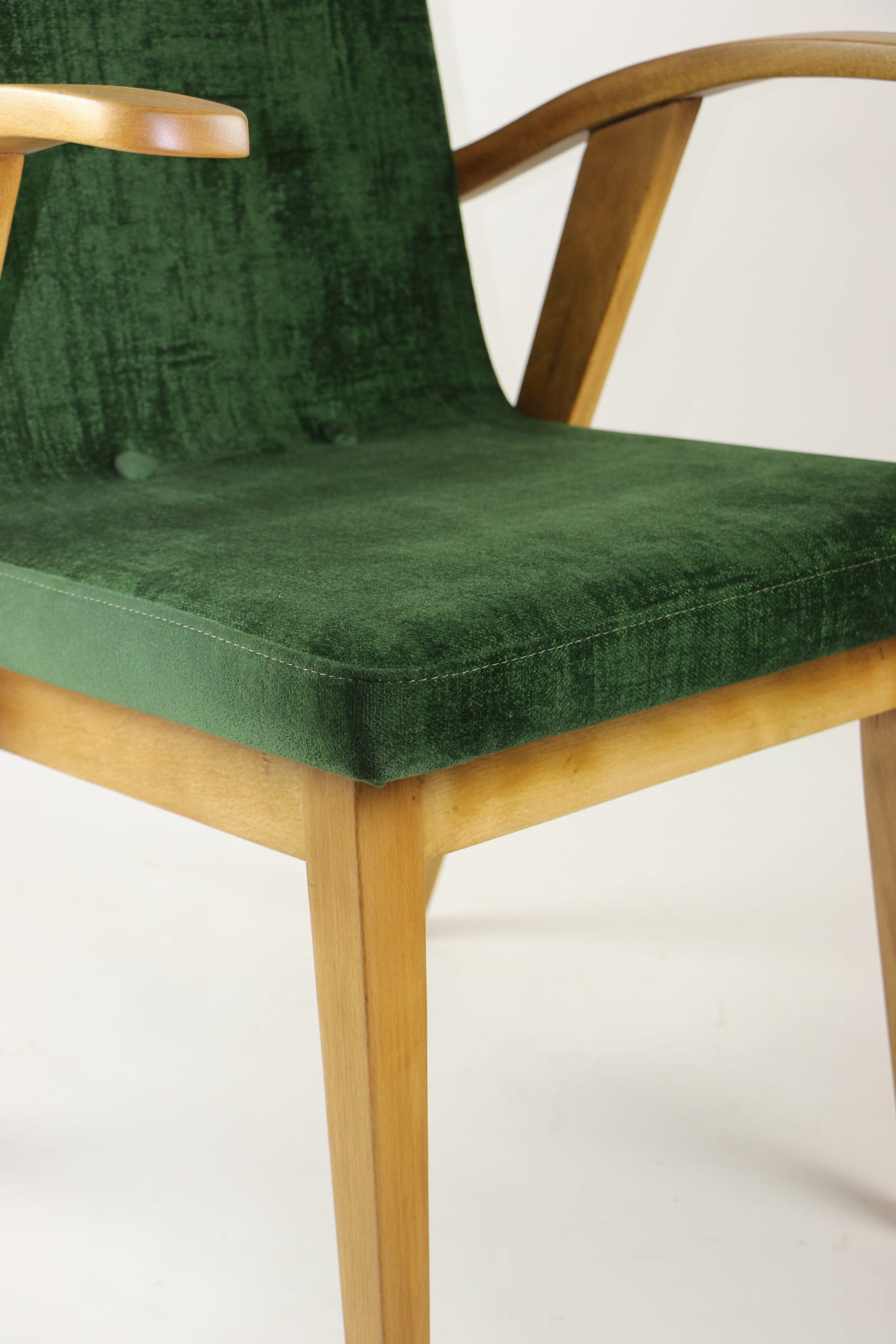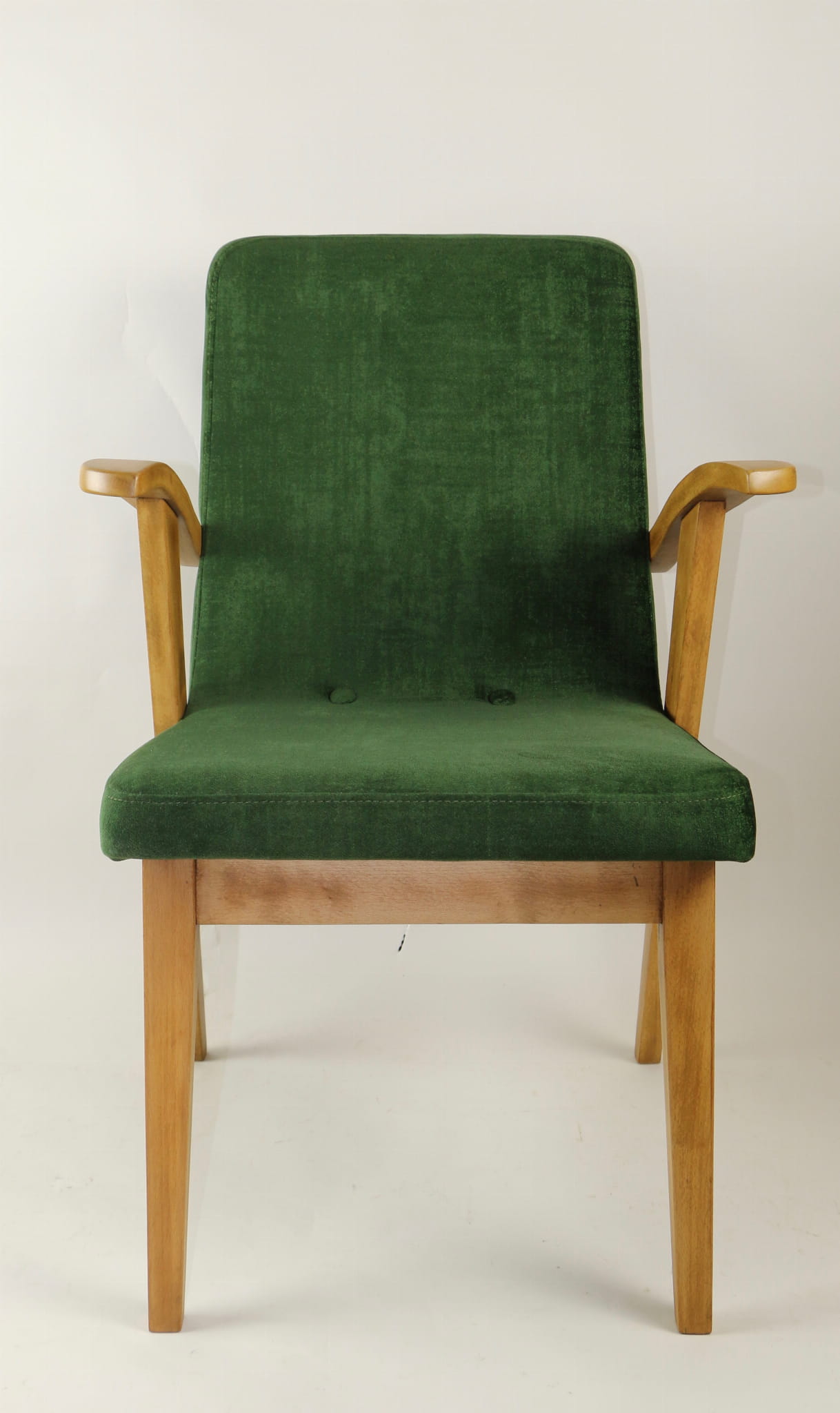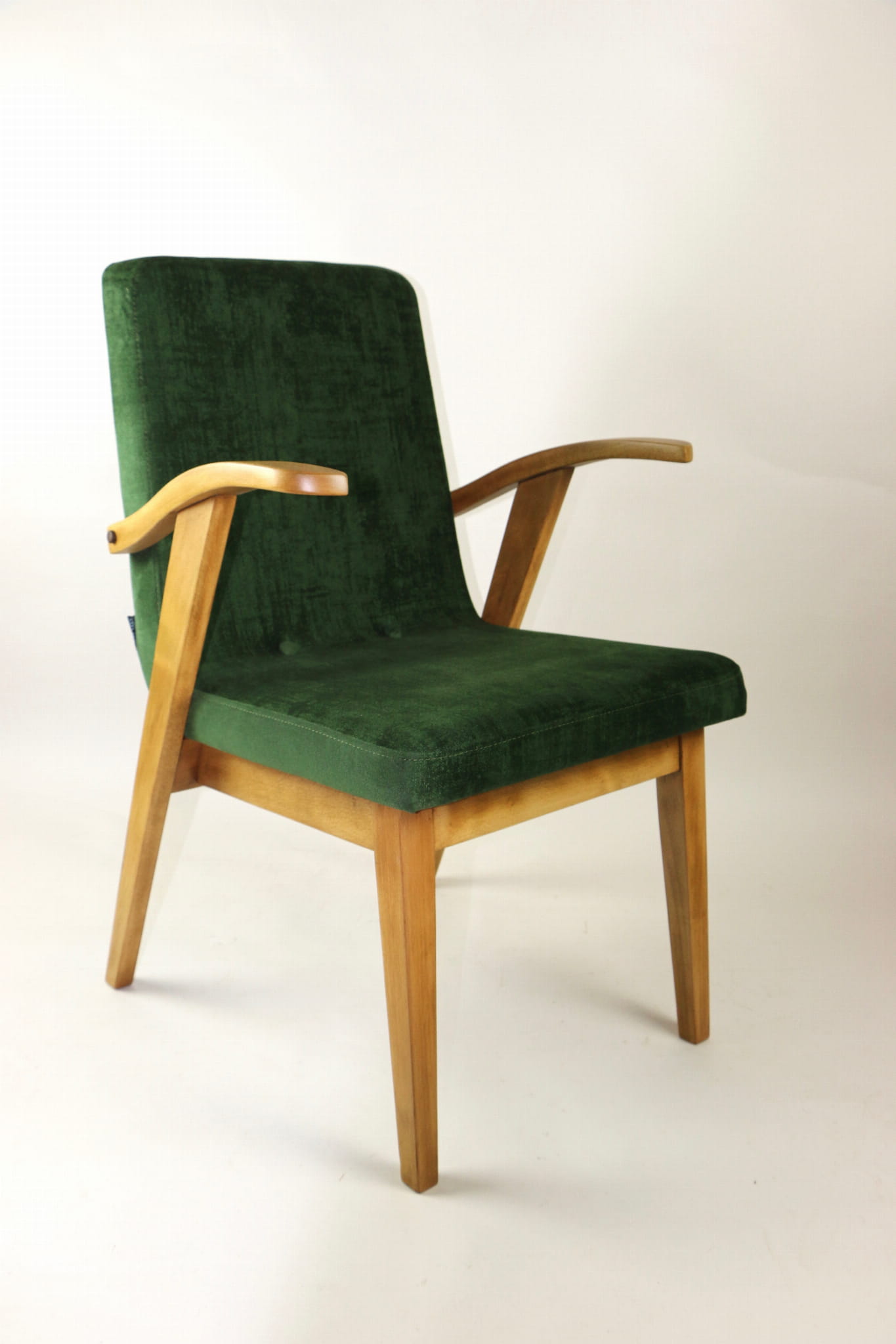 Fotel projektu M. Puchały. Kompletnie odrestaurowany. Nowe obicie pokryte najwyższej jakości aksamitnym materiałem tapicerskim w kolorze pięknej zieleni - seria Chameleon. Stelaż drewniany połączony z podłokietnikami w kolorze jasnego dębu.