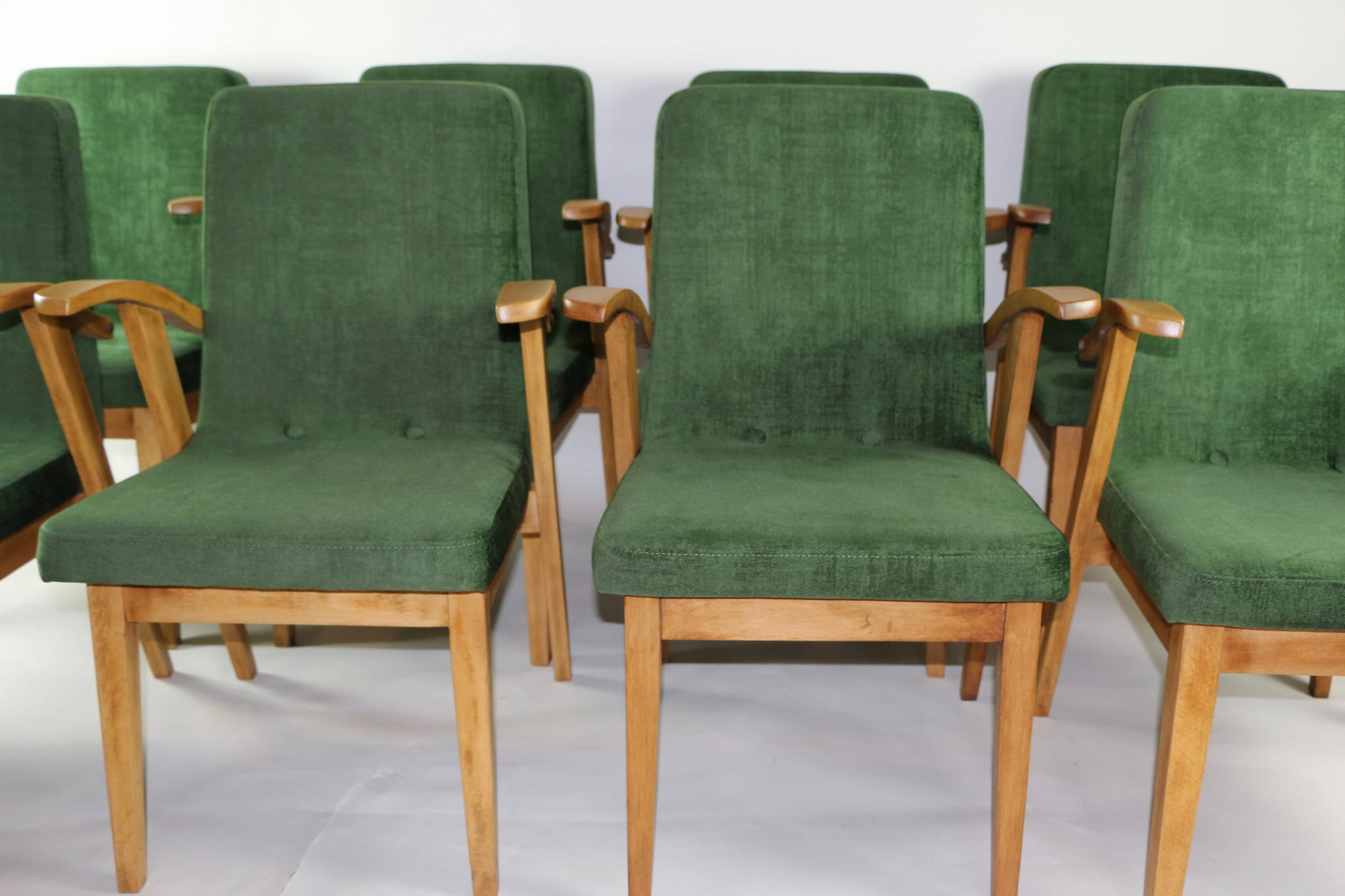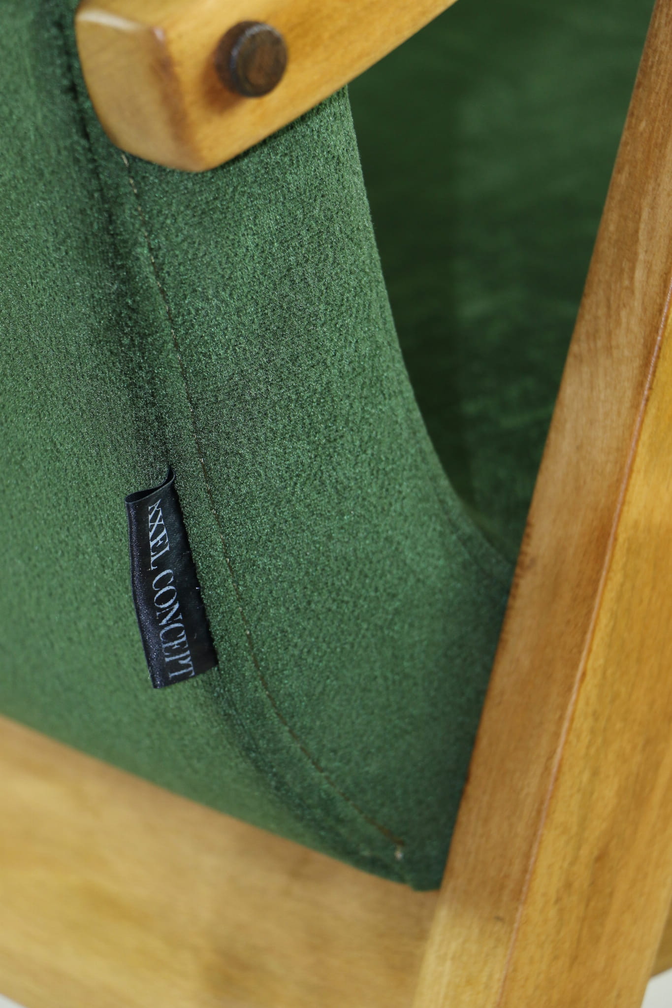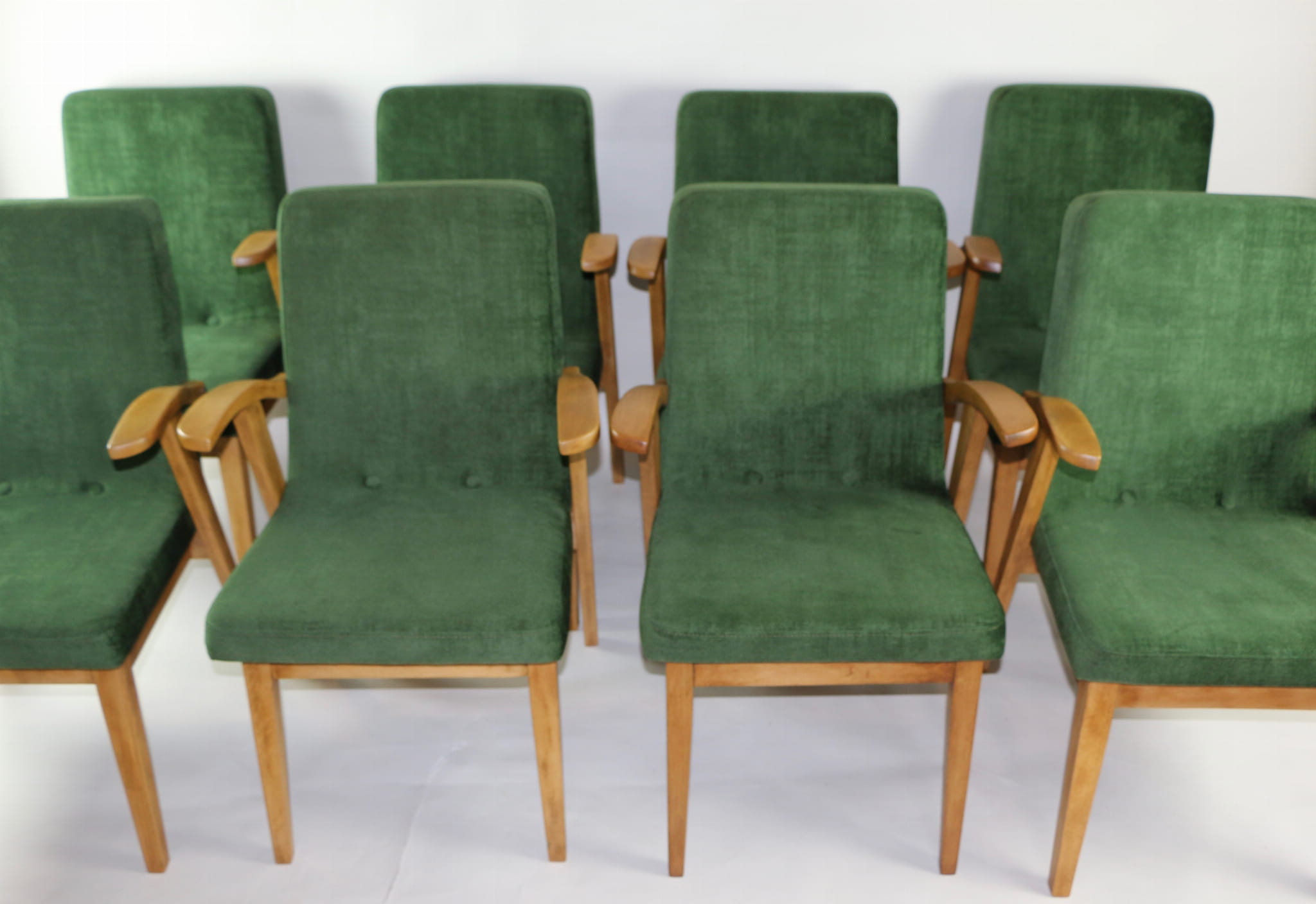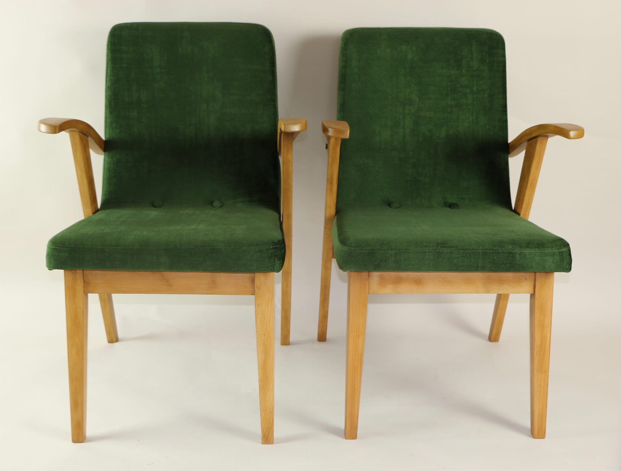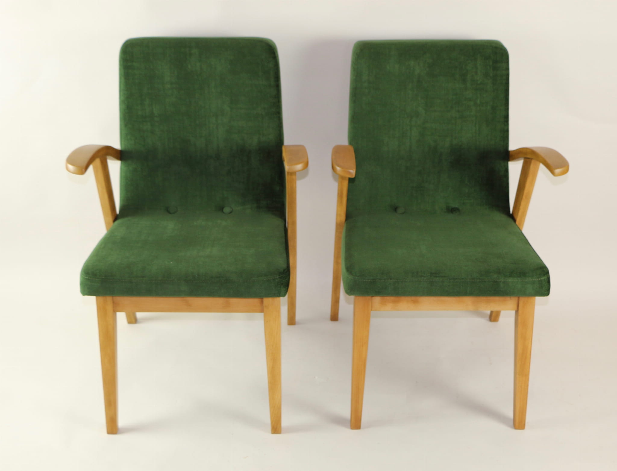 Fotel projektu M. Puchały. Kompletnie odrestaurowany. Nowe obicie pokryte najwyższej jakości aksamitnym materiałem tapicerskim w kolorze pięknej zieleni - seria Chameleon. Stelaż drewniany połączony z podłokietnikami w kolorze jasnego dębu.