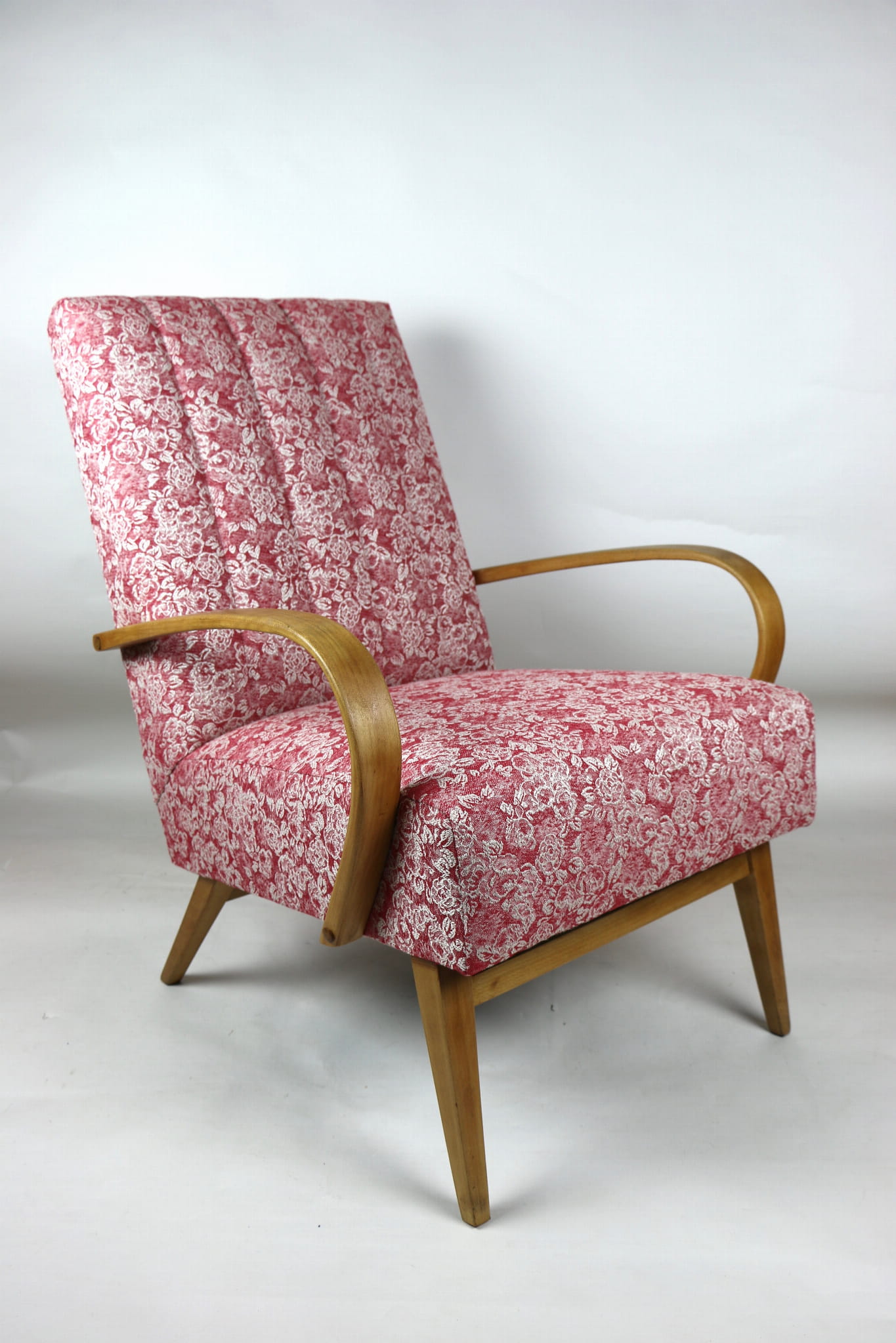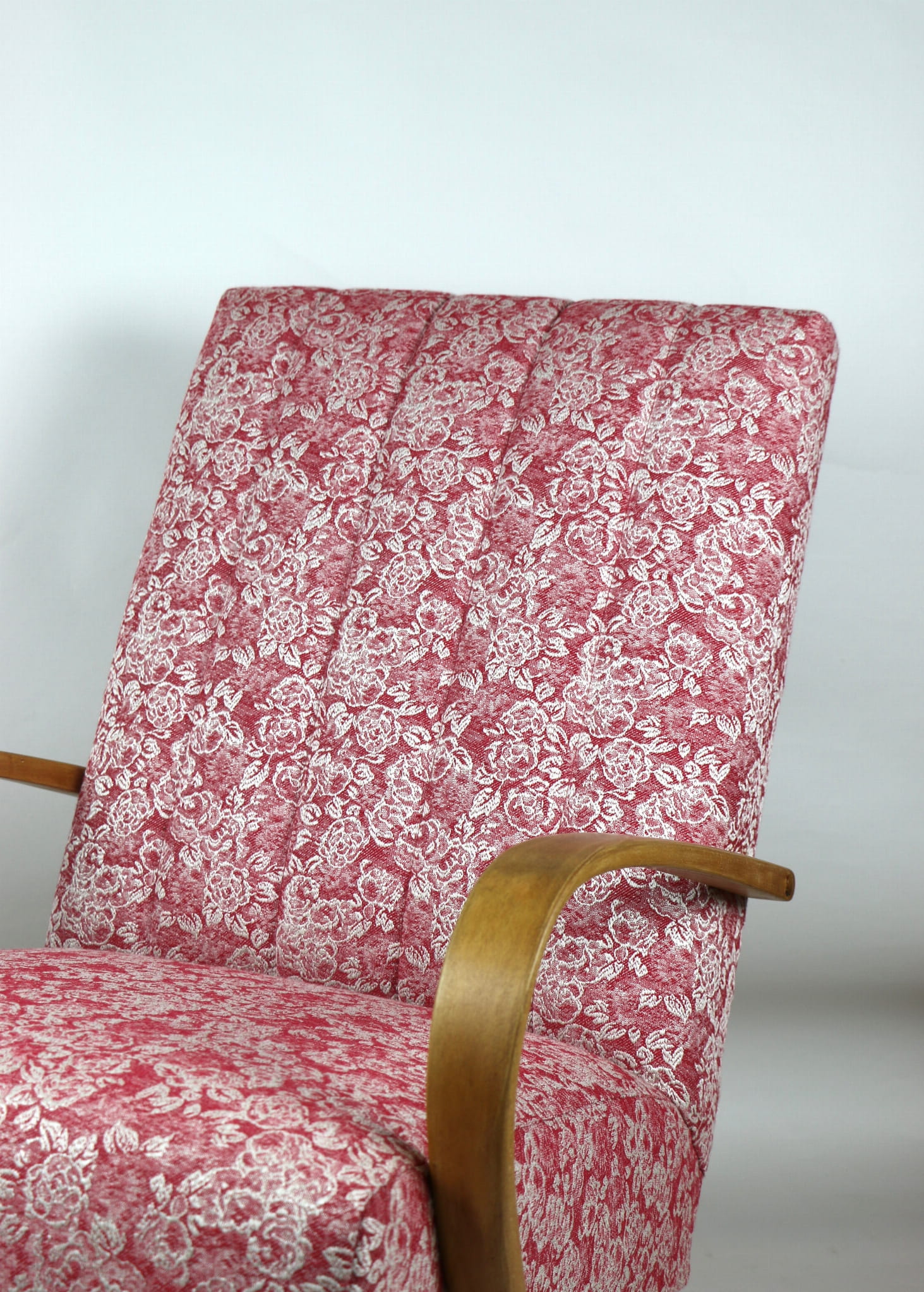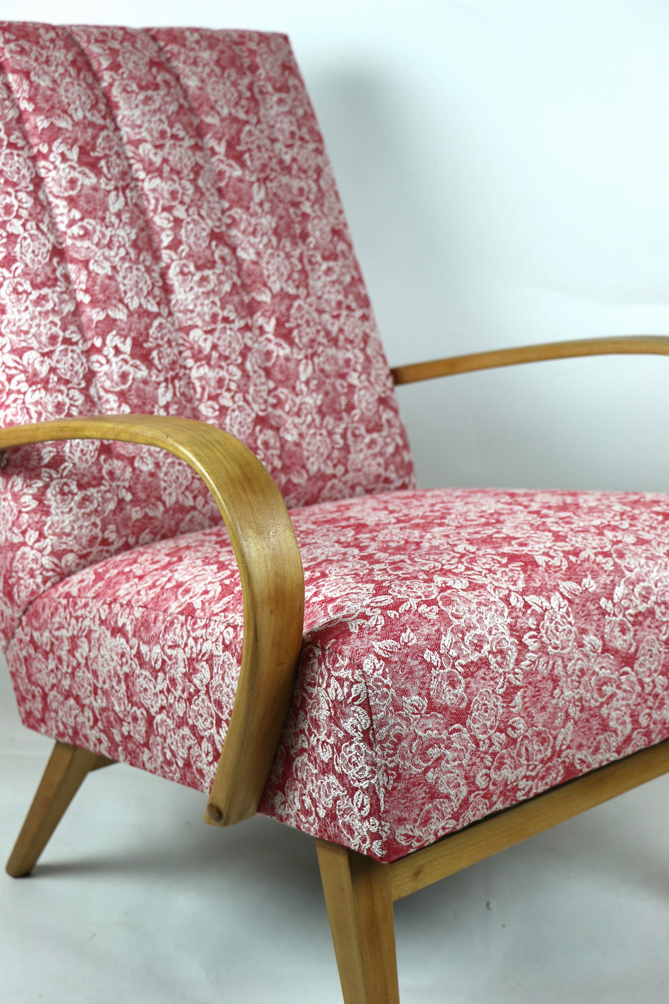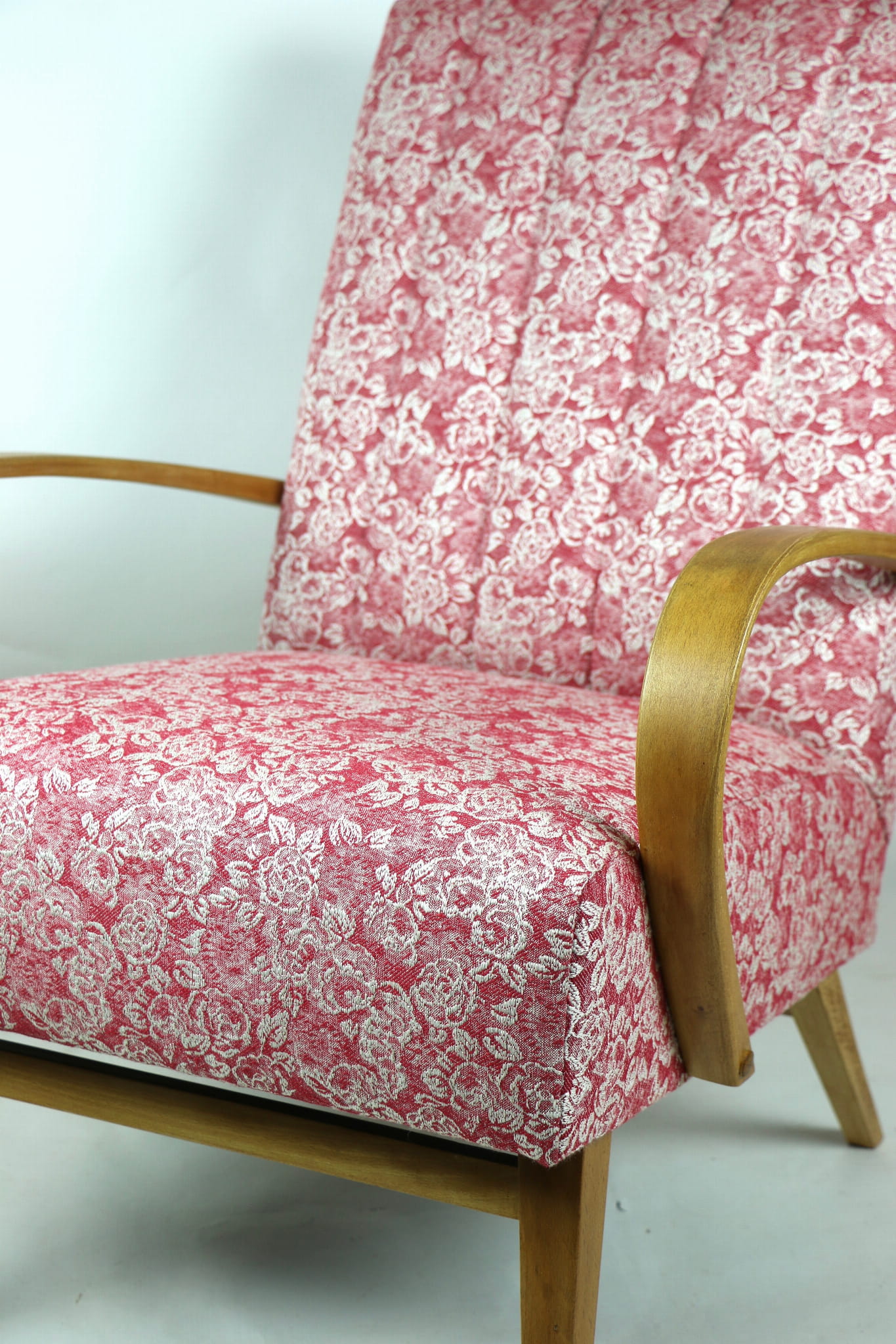 Fotel gięty Art Deco, kompletnie odrestaurowany. Nowa tapicerka w kolorze ciemnym różowym z tkaniny naturalnej wraz z wypełnieniem w bardzo ciekawe motywy kwiatowe - włoska tkanina Interno. Podparcia i nóżki drewniane w naturalnej kolorystyce drewna.
