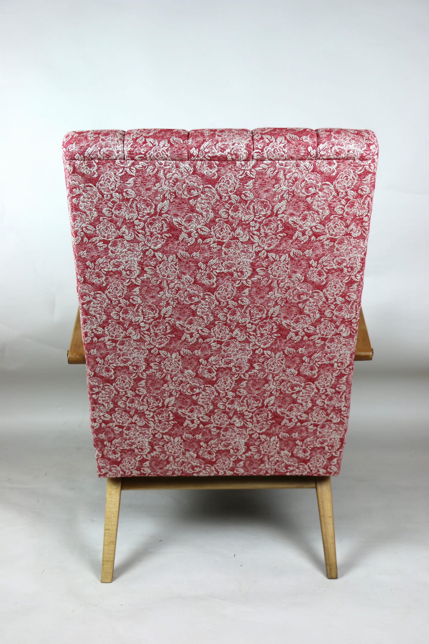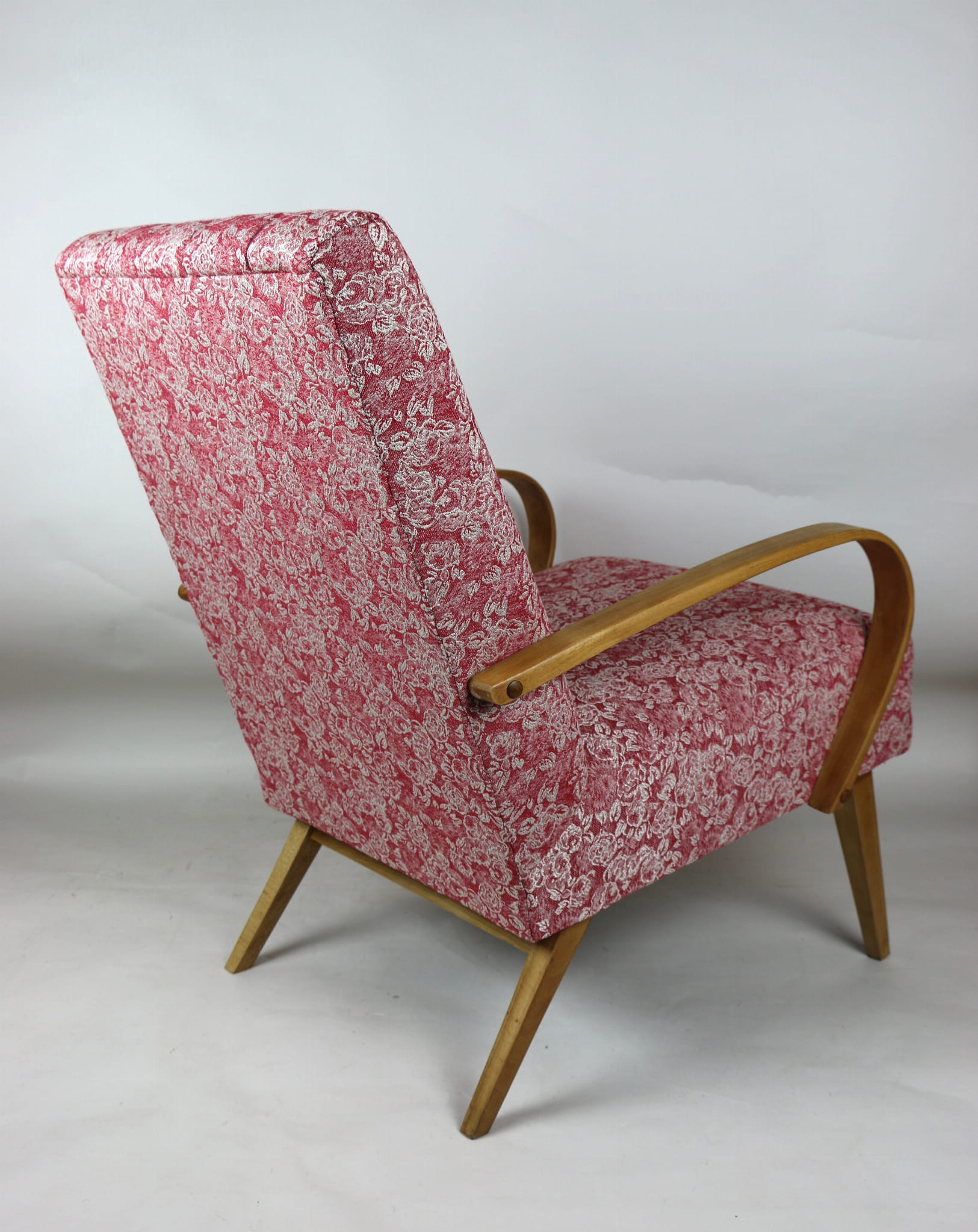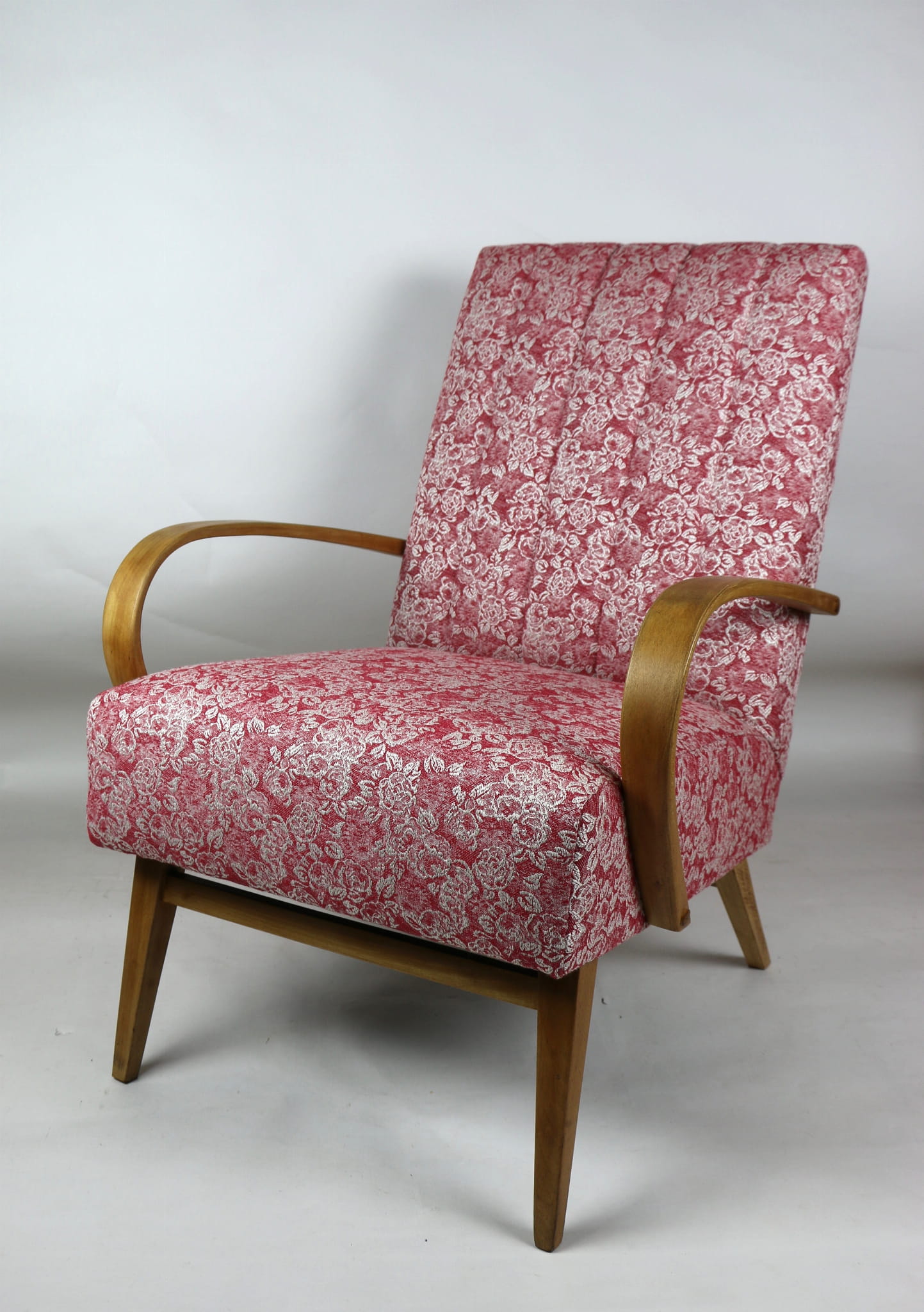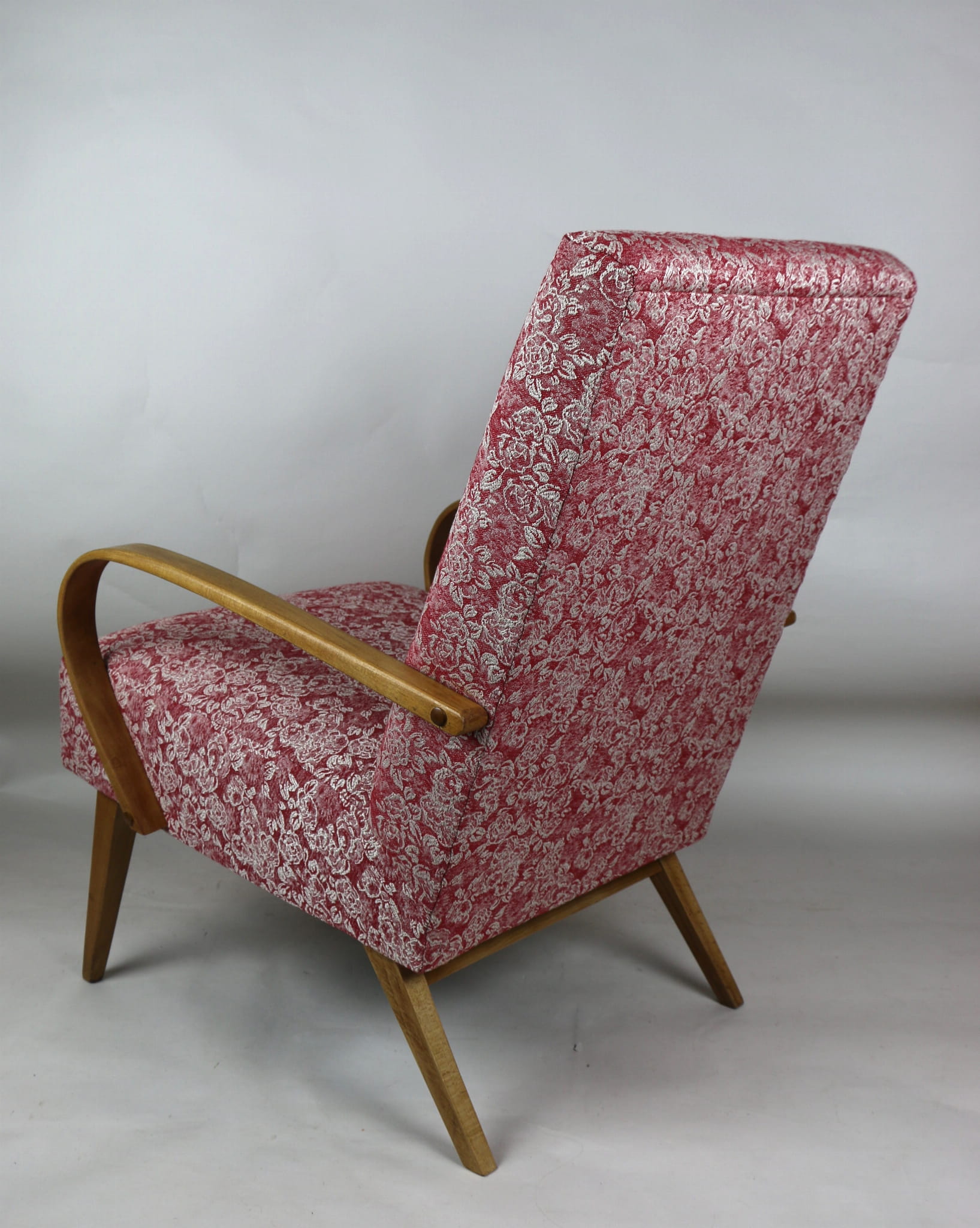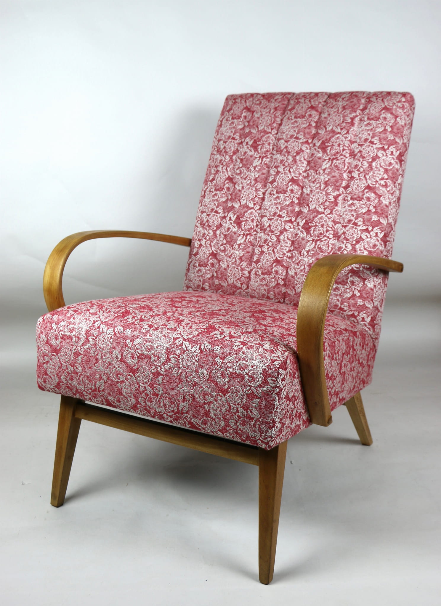 Fotel gięty Art Deco, kompletnie odrestaurowany. Nowa tapicerka w kolorze ciemnym różowym z tkaniny naturalnej wraz z wypełnieniem w bardzo ciekawe motywy kwiatowe - włoska tkanina Interno. Podparcia i nóżki drewniane w naturalnej kolorystyce drewna.