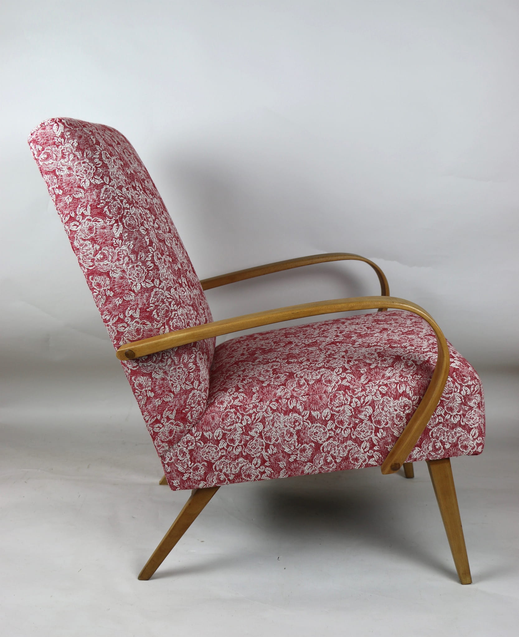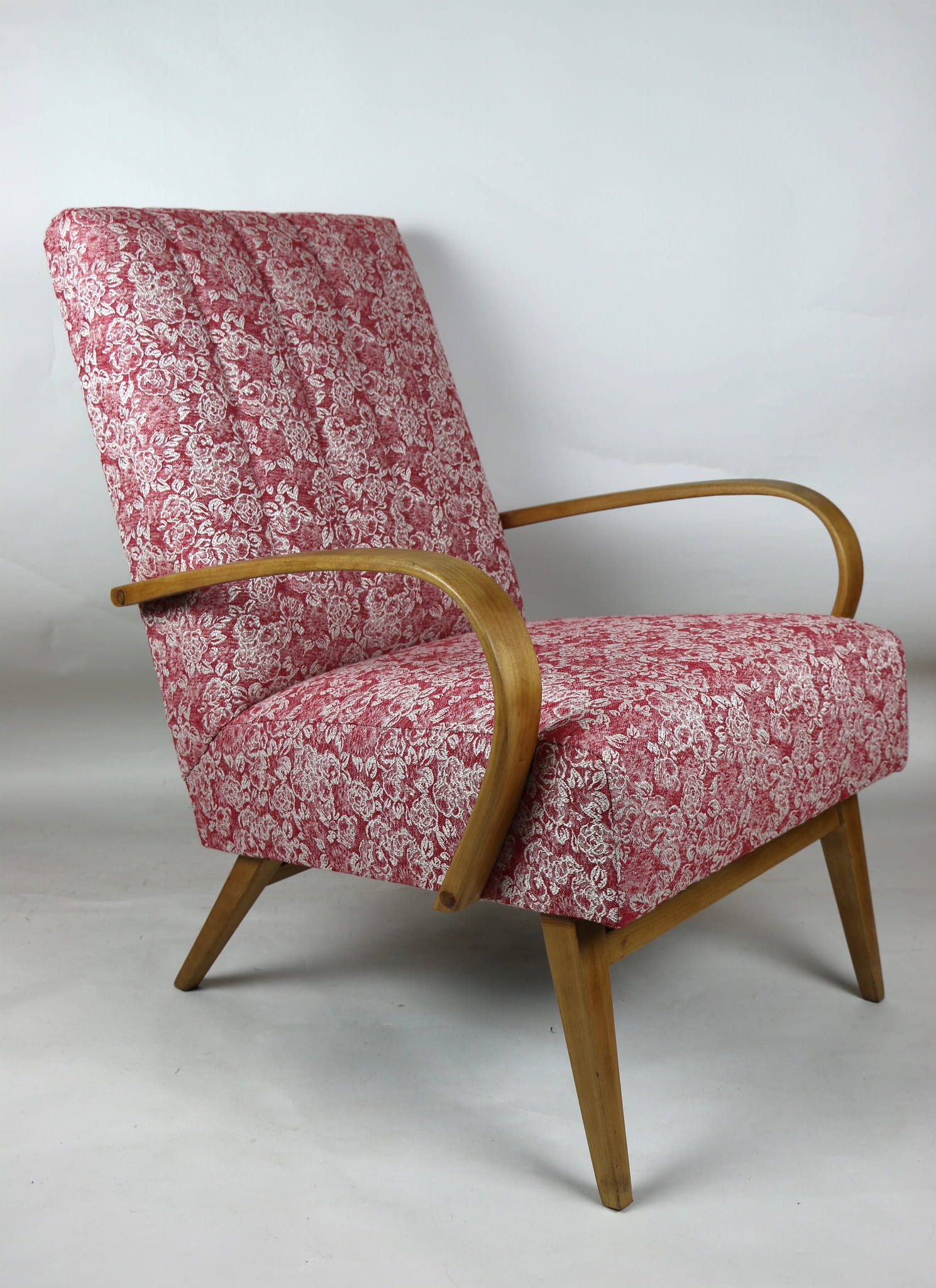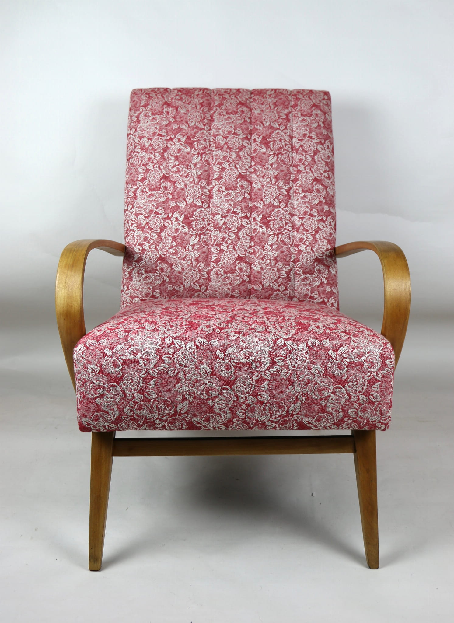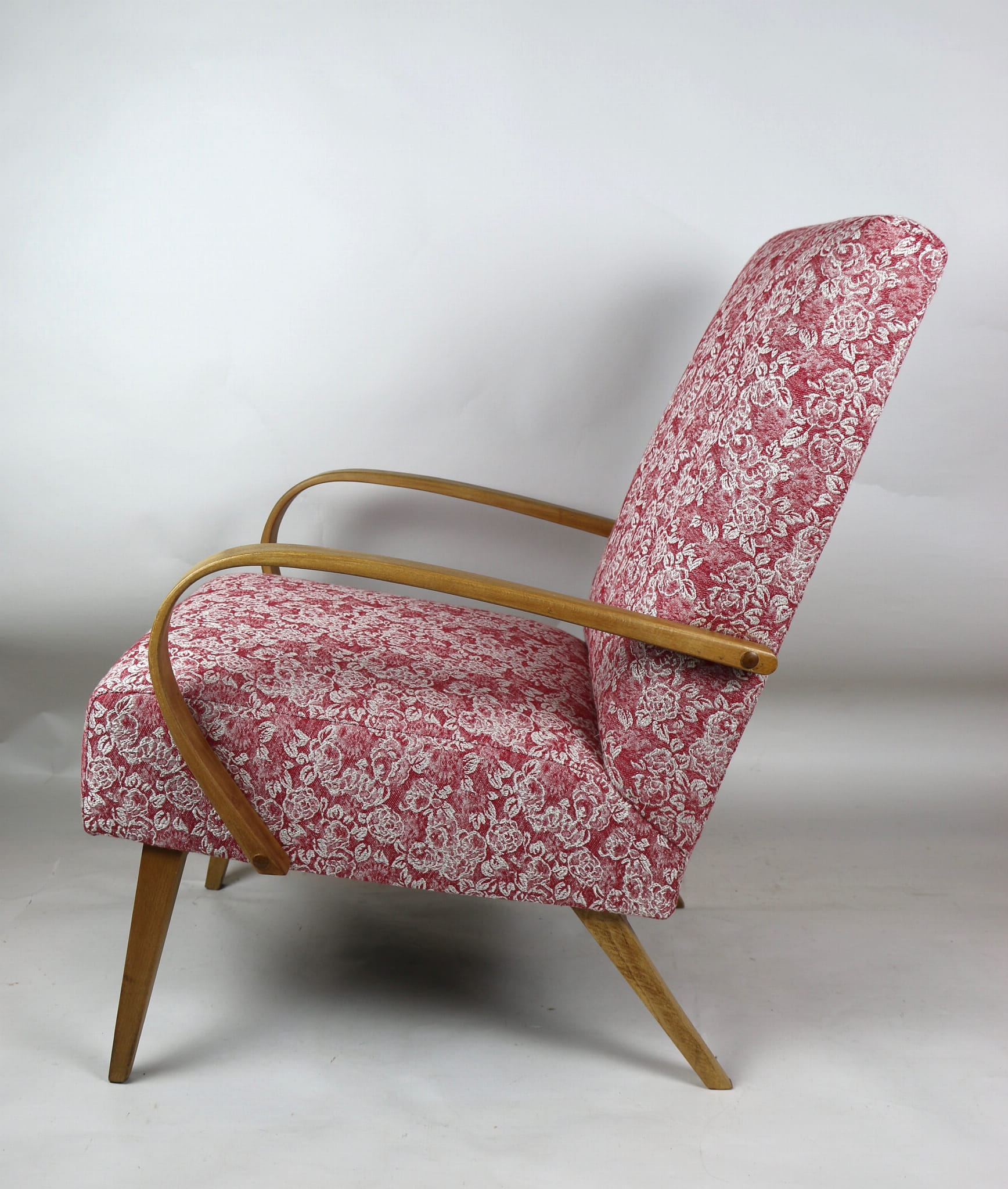 Fotel gięty Art Deco, kompletnie odrestaurowany. Nowa tapicerka w kolorze ciemnym różowym z tkaniny naturalnej wraz z wypełnieniem w bardzo ciekawe motywy kwiatowe - włoska tkanina Interno. Podparcia i nóżki drewniane w naturalnej kolorystyce drewna.