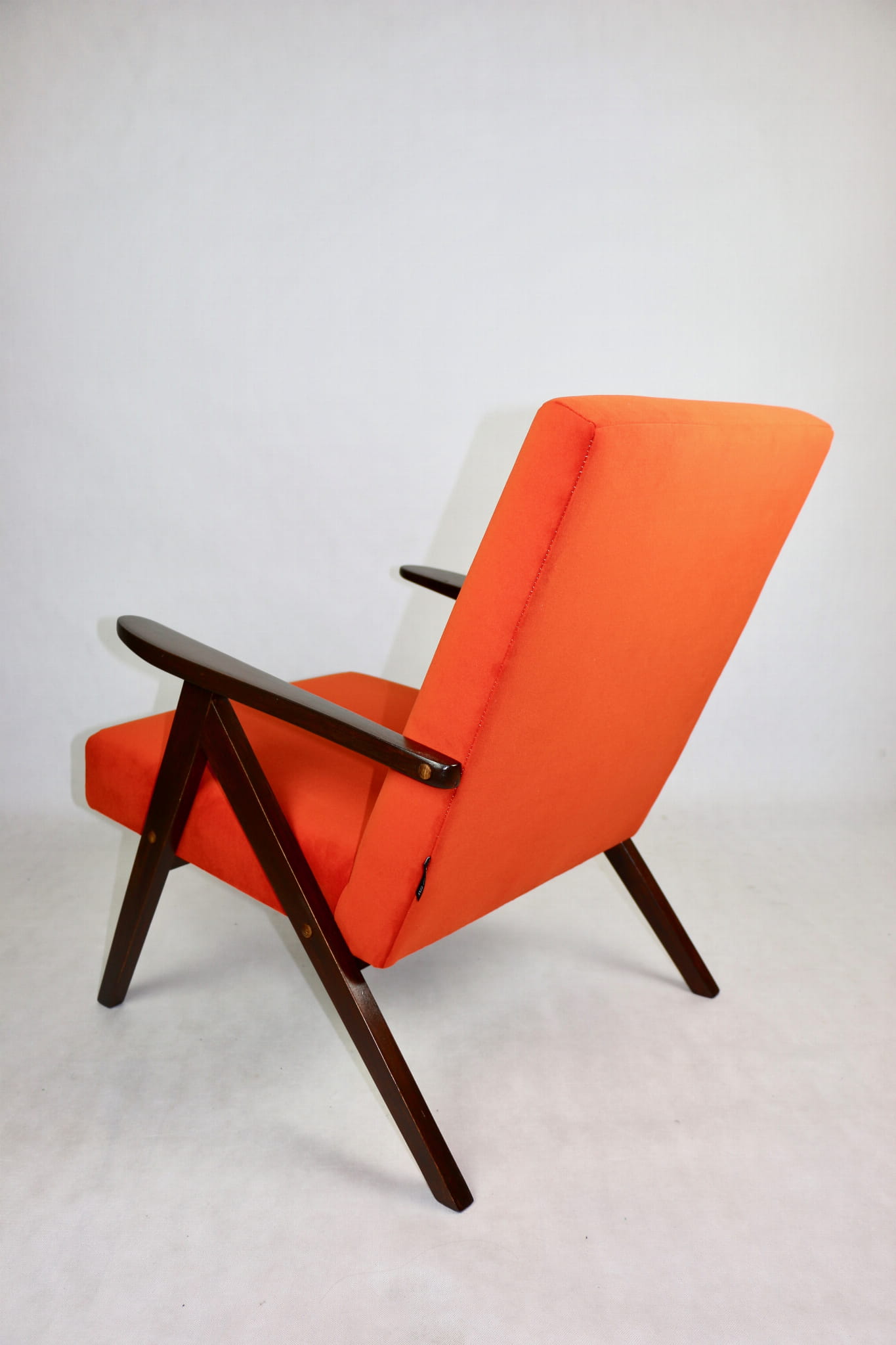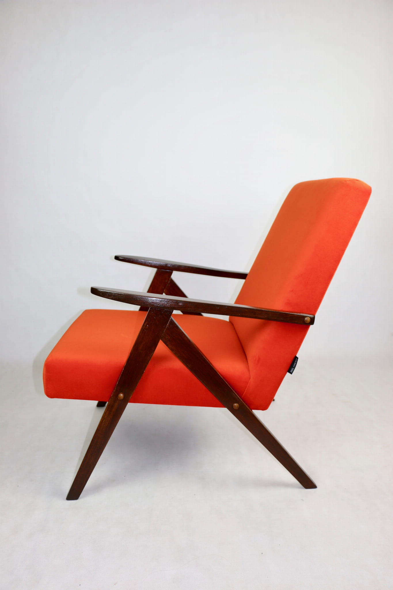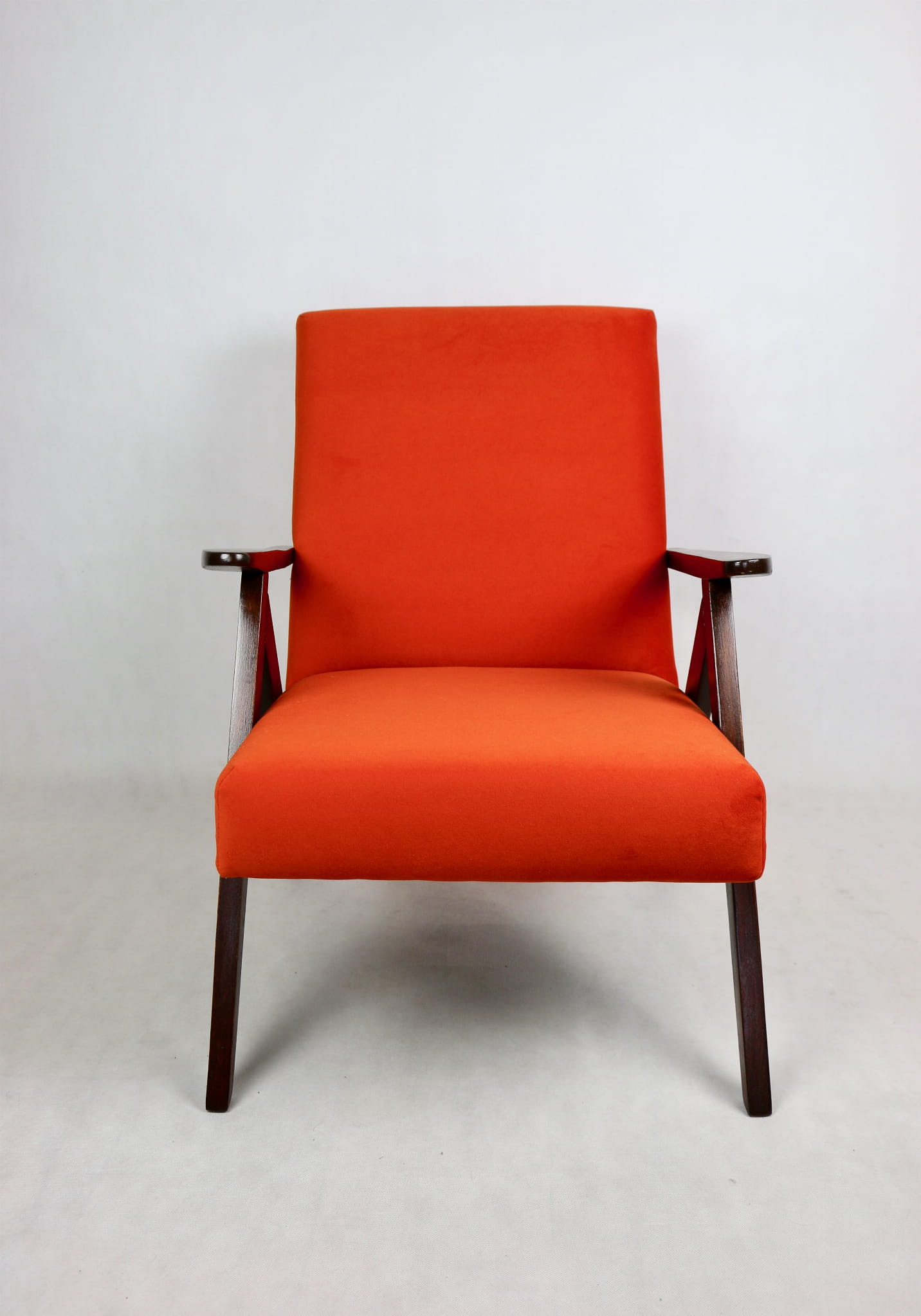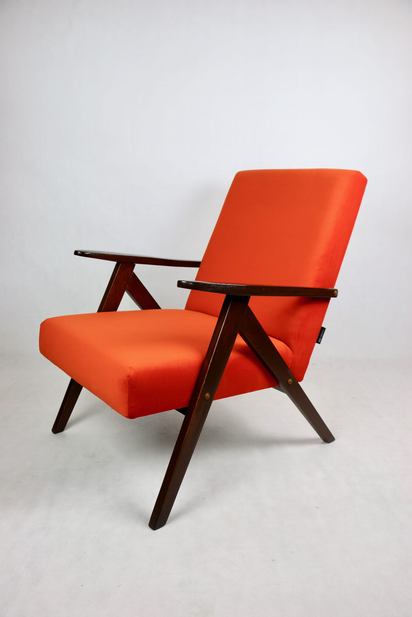 Fotel klasyczny Var B310 z lat 70-tych. Odrestaurowany, nowe obicie pokryte aksamitnym materiałem w kolorze pomarańczowym z serii Jade. Siedzisko bardzo wygodne, stelaż drewniany połączony z podłokietnikami w ciemnej kolorystyce drewna.