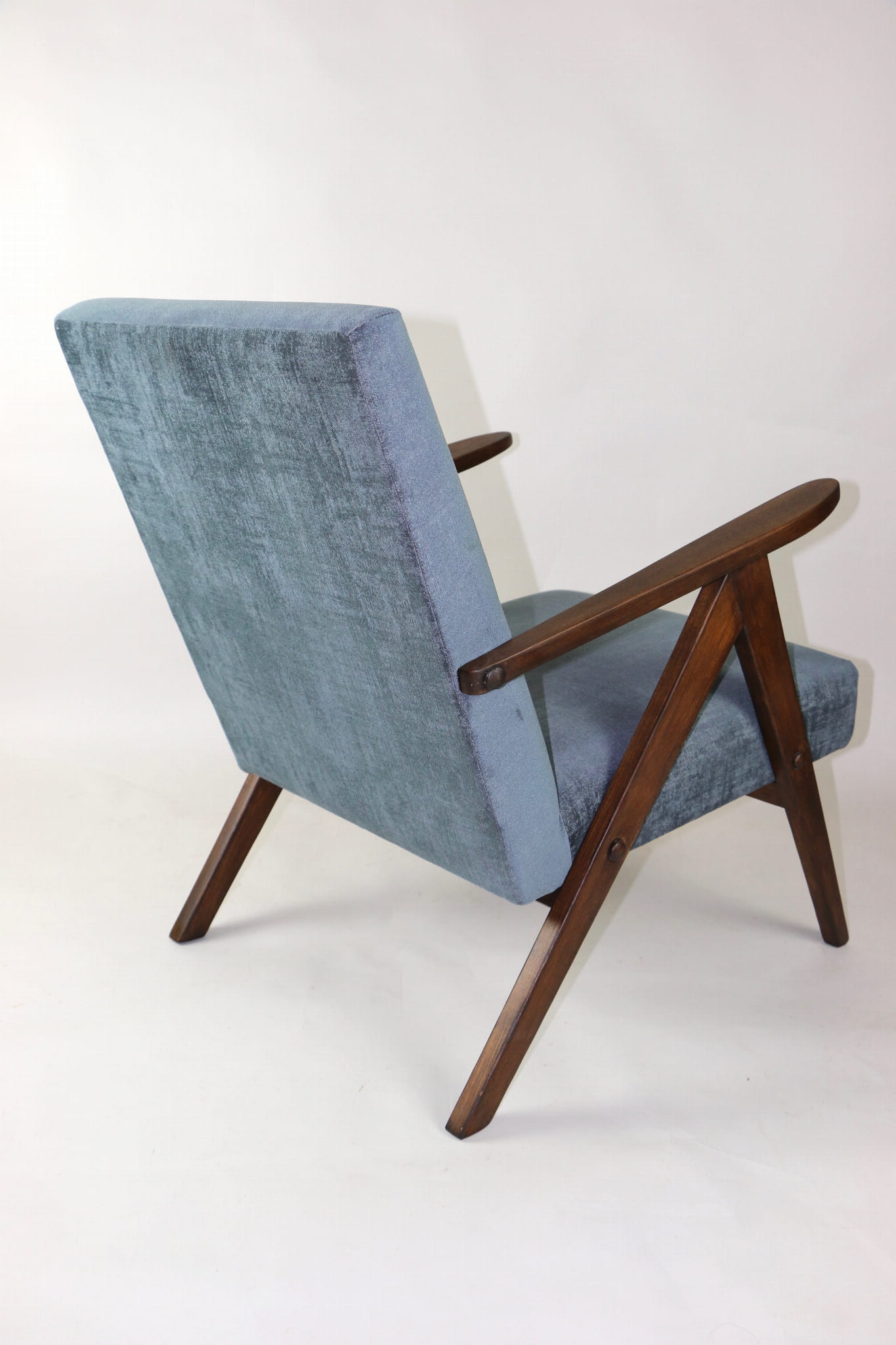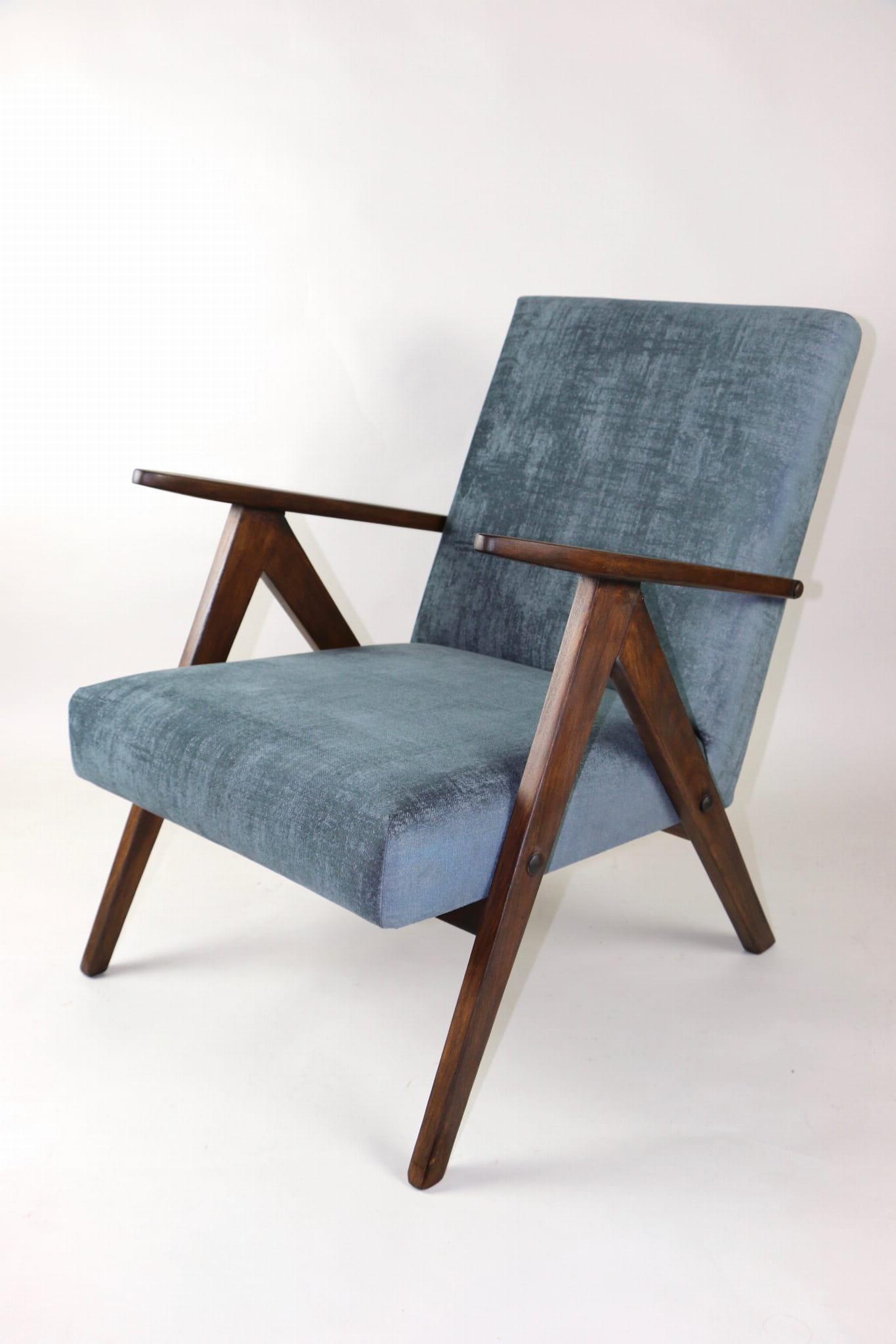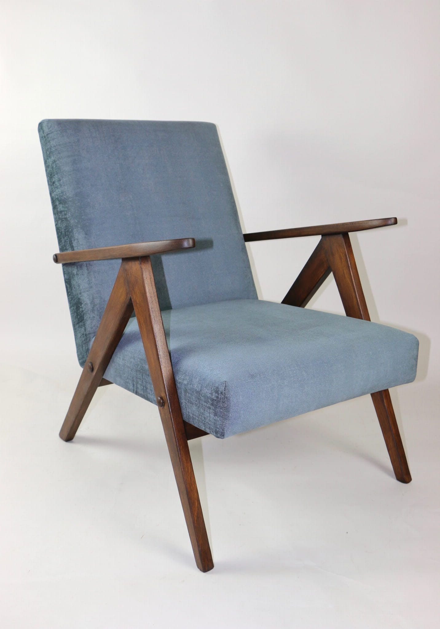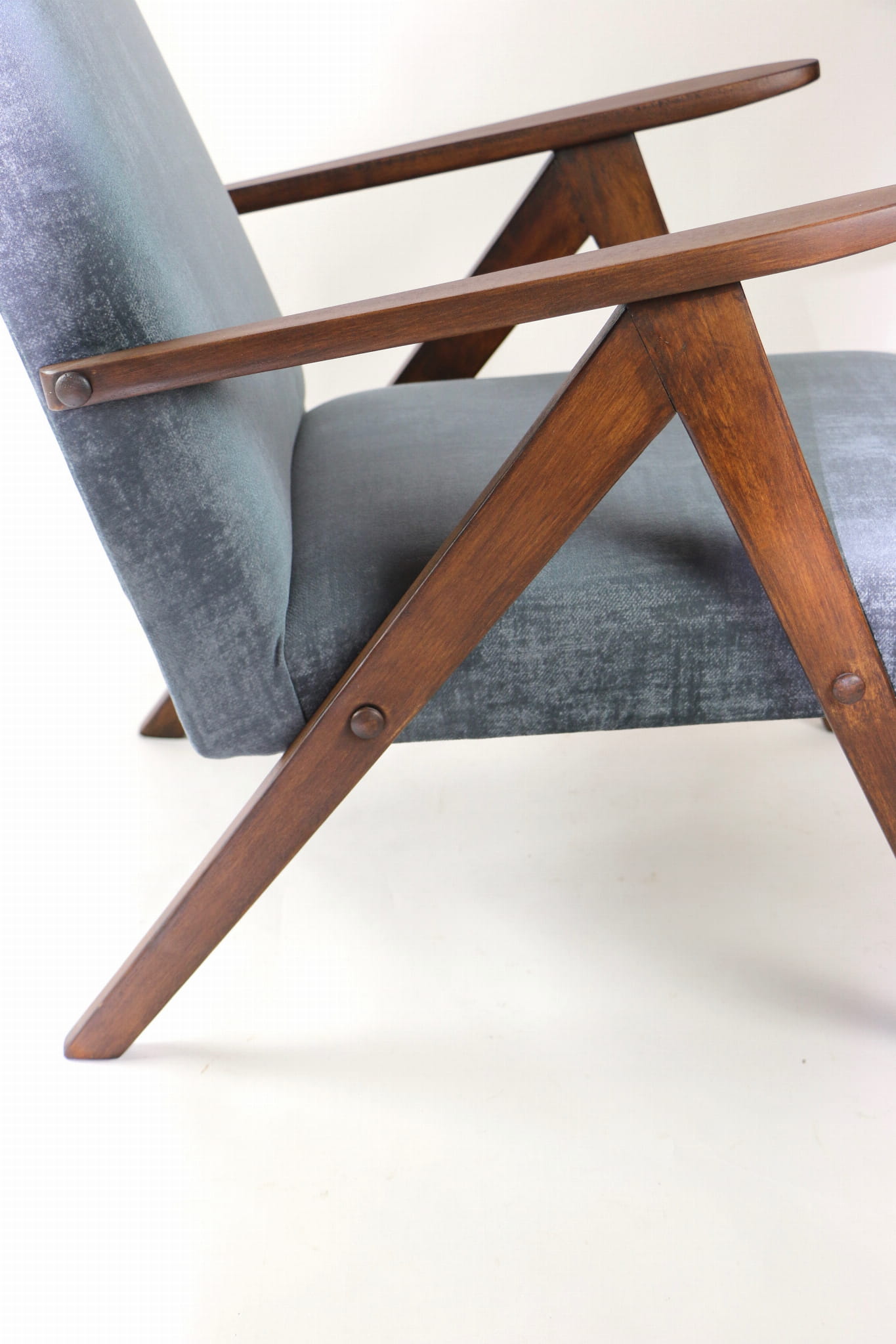 Fotel klasyczny Var B-310, lata 70. Odrestaurowany, nowe obicie pokryte aksamitnym materiałem w kolorze szarym - materiał welwetowy strukturalny z serii Chameleon . Siedzisko bardzo wygodne, stelaż drewniany połączony z podłokietnikami w ciemnej kolorystyce drewna. Wymiary wysokość : 80 cm, szerokość : 60 cm, szerokość siedziska: 49 cm, głębokość siedziska: 49cm, głębokość mebla: 72 cm, wysokość siedziska: 40 cm, wysokość podłokietnika:57 cm