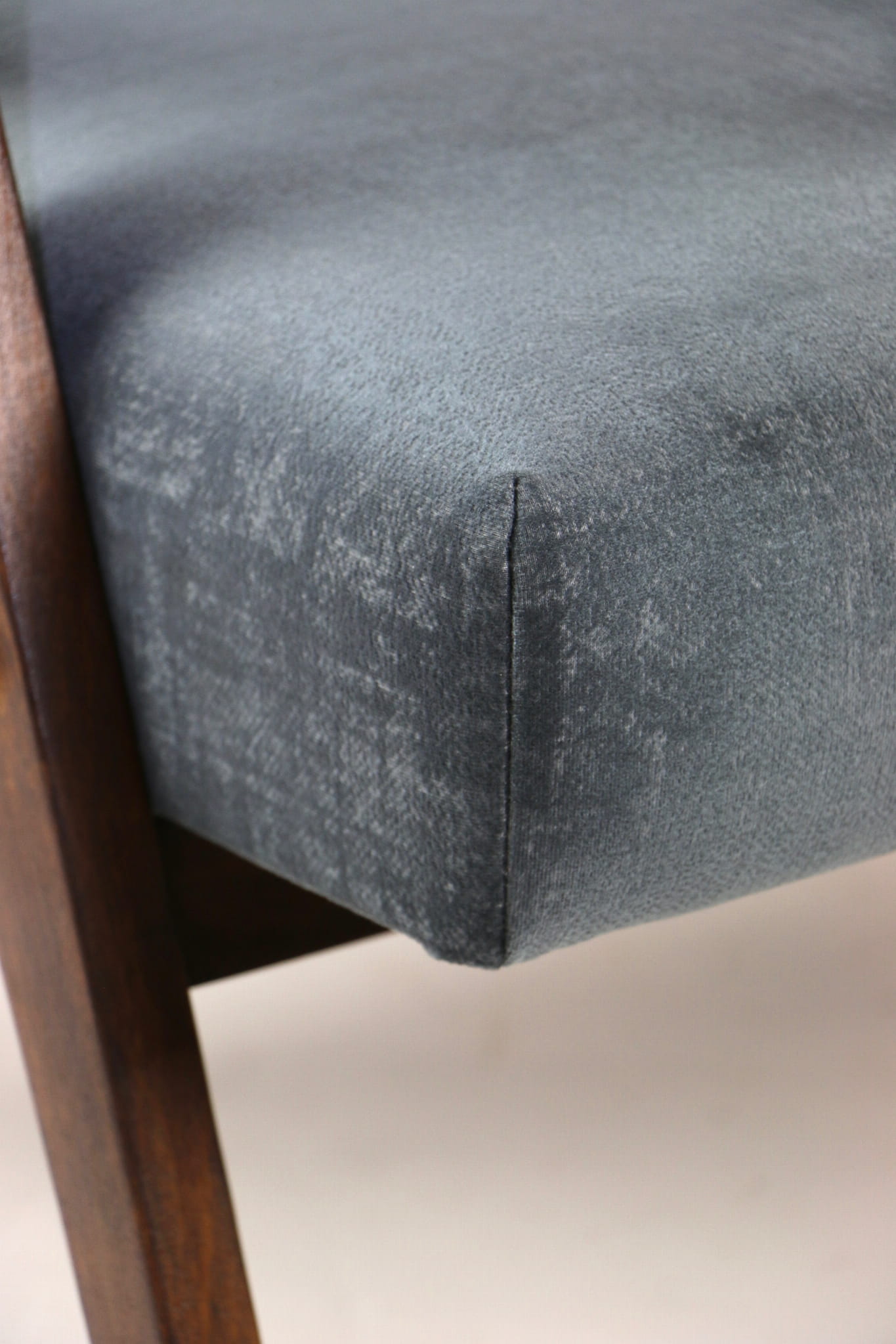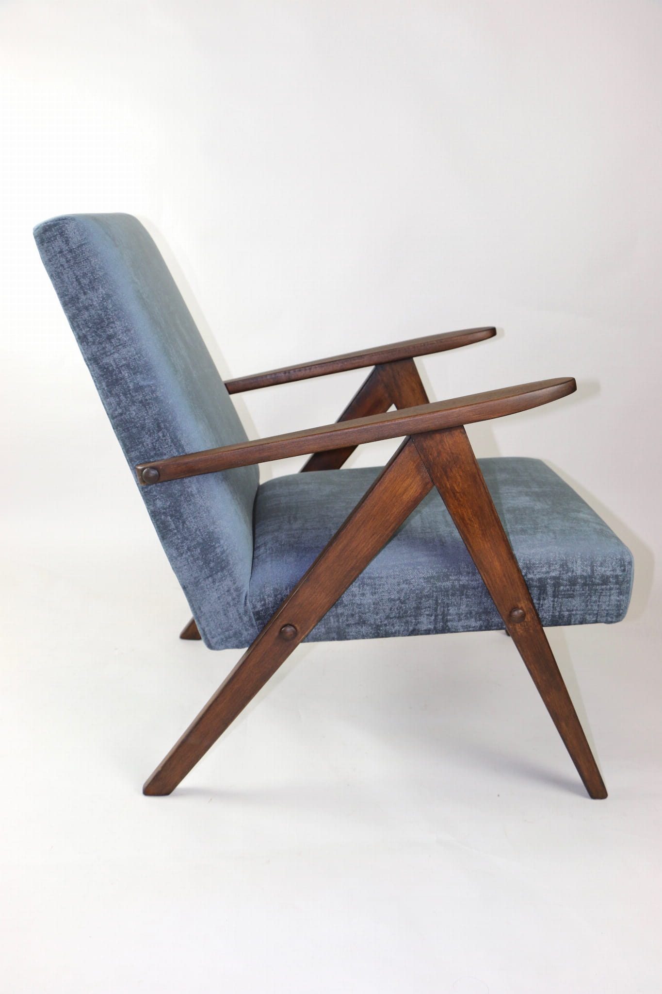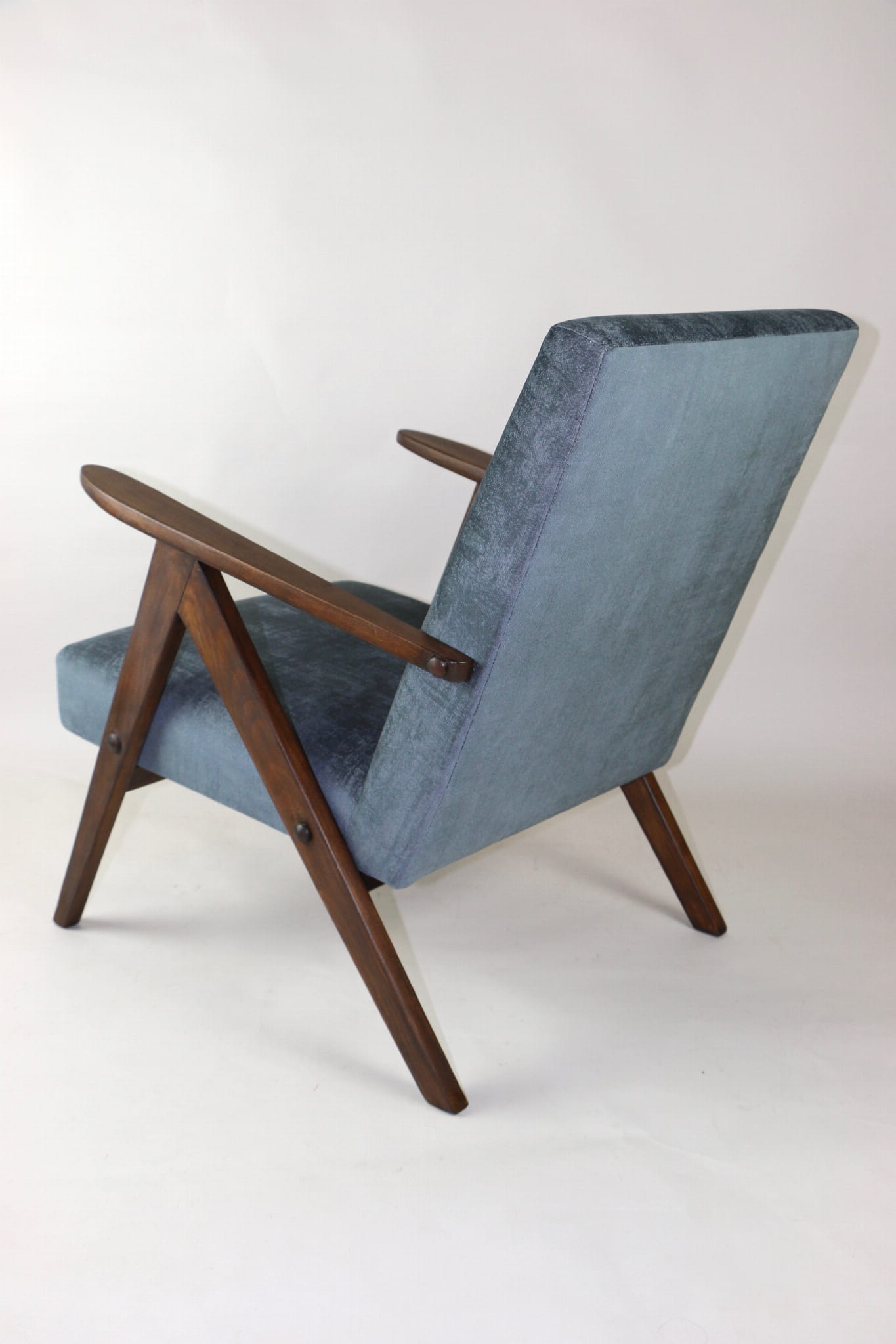 Fotel klasyczny Var B-310, lata 70. Odrestaurowany, nowe obicie pokryte aksamitnym materiałem w kolorze szarym - materiał welwetowy strukturalny z serii Chameleon . Siedzisko bardzo wygodne, stelaż drewniany połączony z podłokietnikami w ciemnej kolorystyce drewna. Wymiary wysokość : 80 cm, szerokość : 60 cm, szerokość siedziska: 49 cm, głębokość siedziska: 49cm, głębokość mebla: 72 cm, wysokość siedziska: 40 cm, wysokość podłokietnika:57 cm