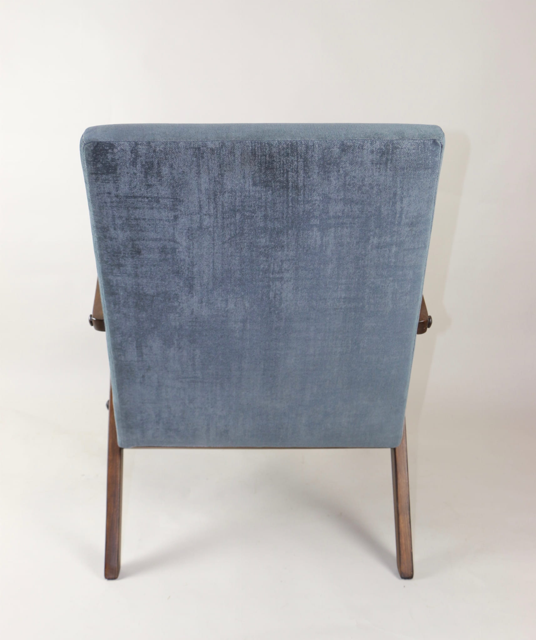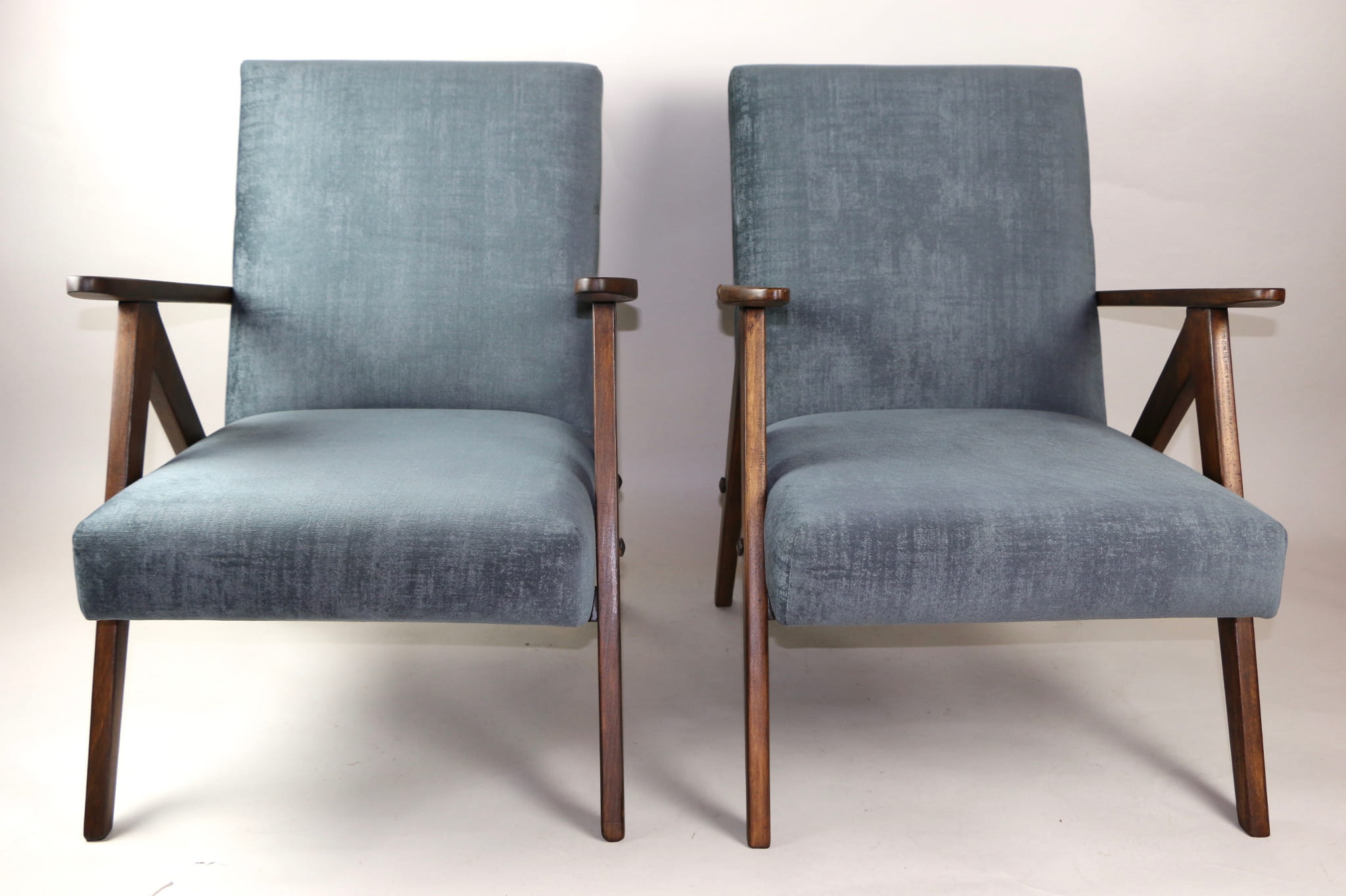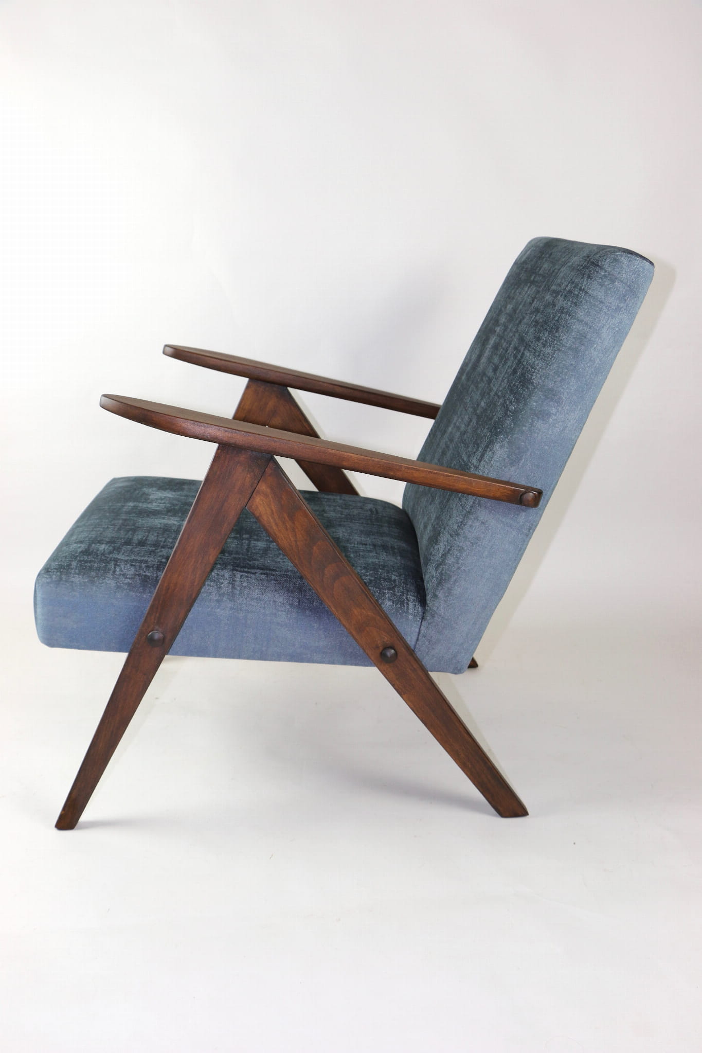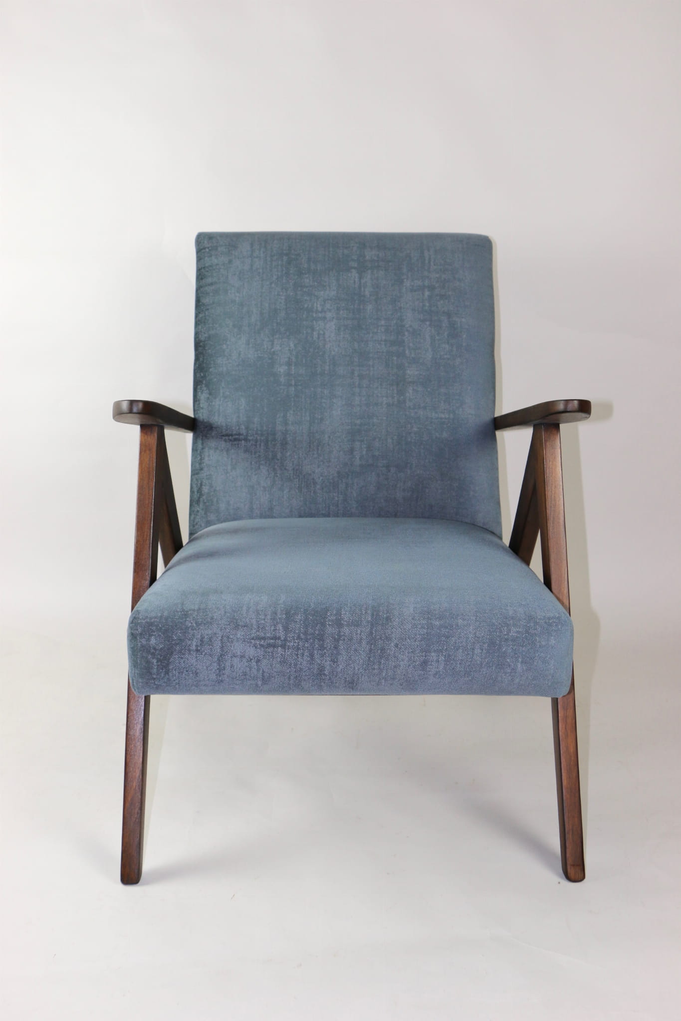 Fotel klasyczny Var B-310, lata 70. Odrestaurowany, nowe obicie pokryte aksamitnym materiałem w kolorze szarym - materiał welwetowy strukturalny z serii Chameleon . Siedzisko bardzo wygodne, stelaż drewniany połączony z podłokietnikami w ciemnej kolorystyce drewna. Wymiary wysokość : 80 cm, szerokość : 60 cm, szerokość siedziska: 49 cm, głębokość siedziska: 49cm, głębokość mebla: 72 cm, wysokość siedziska: 40 cm, wysokość podłokietnika:57 cm