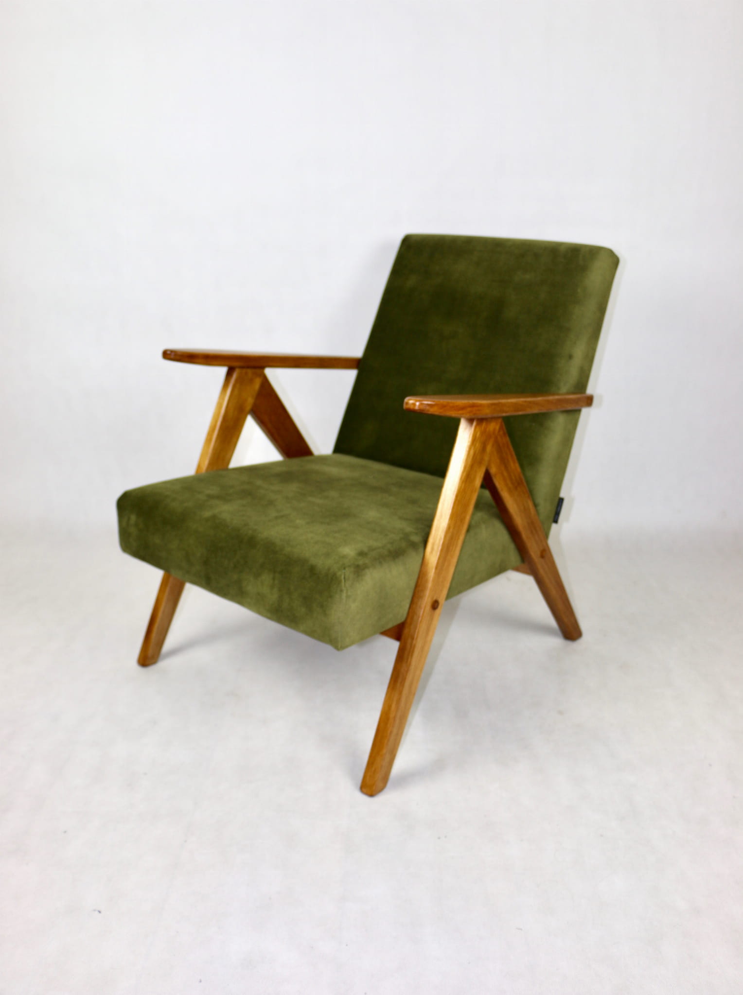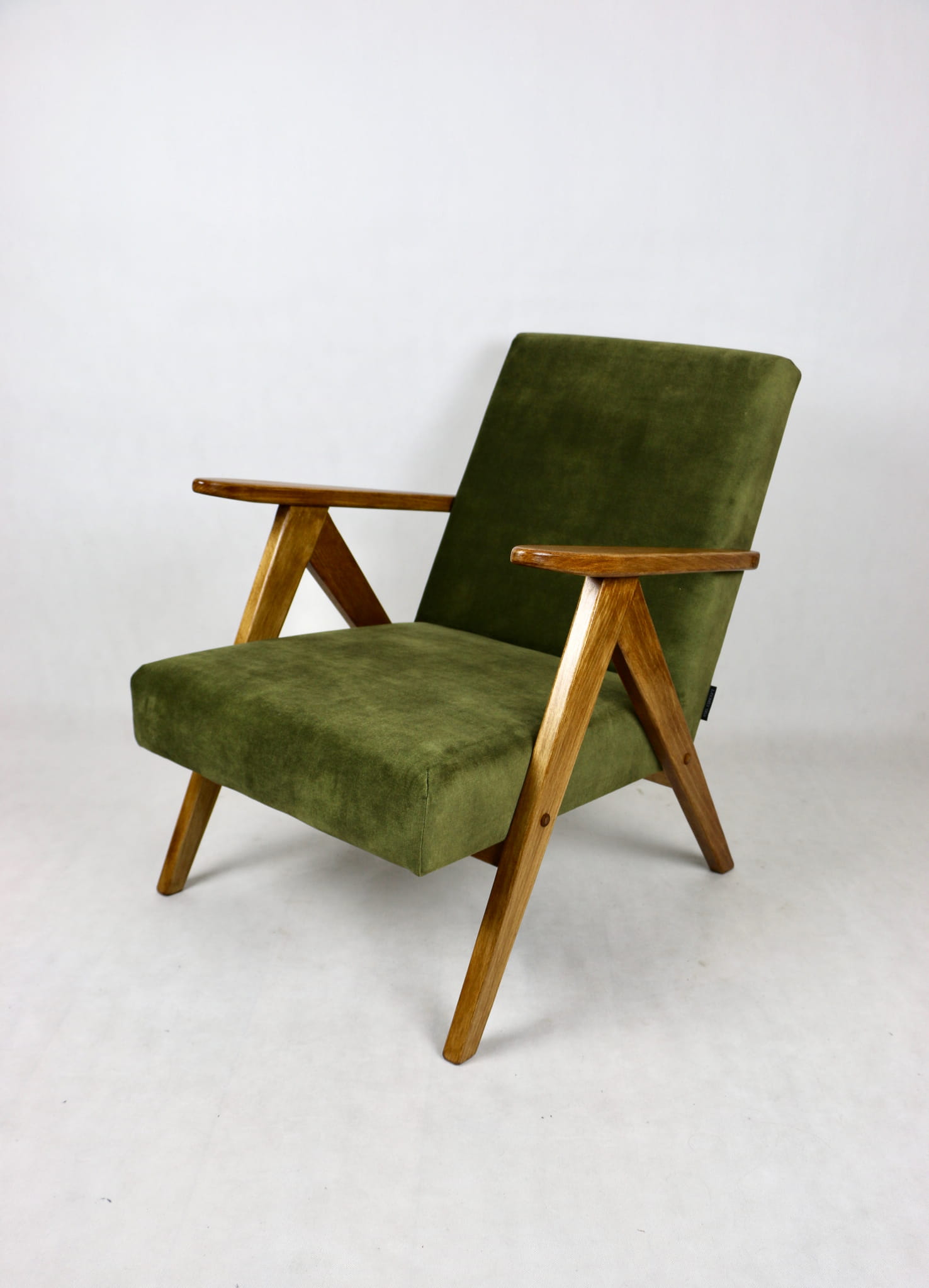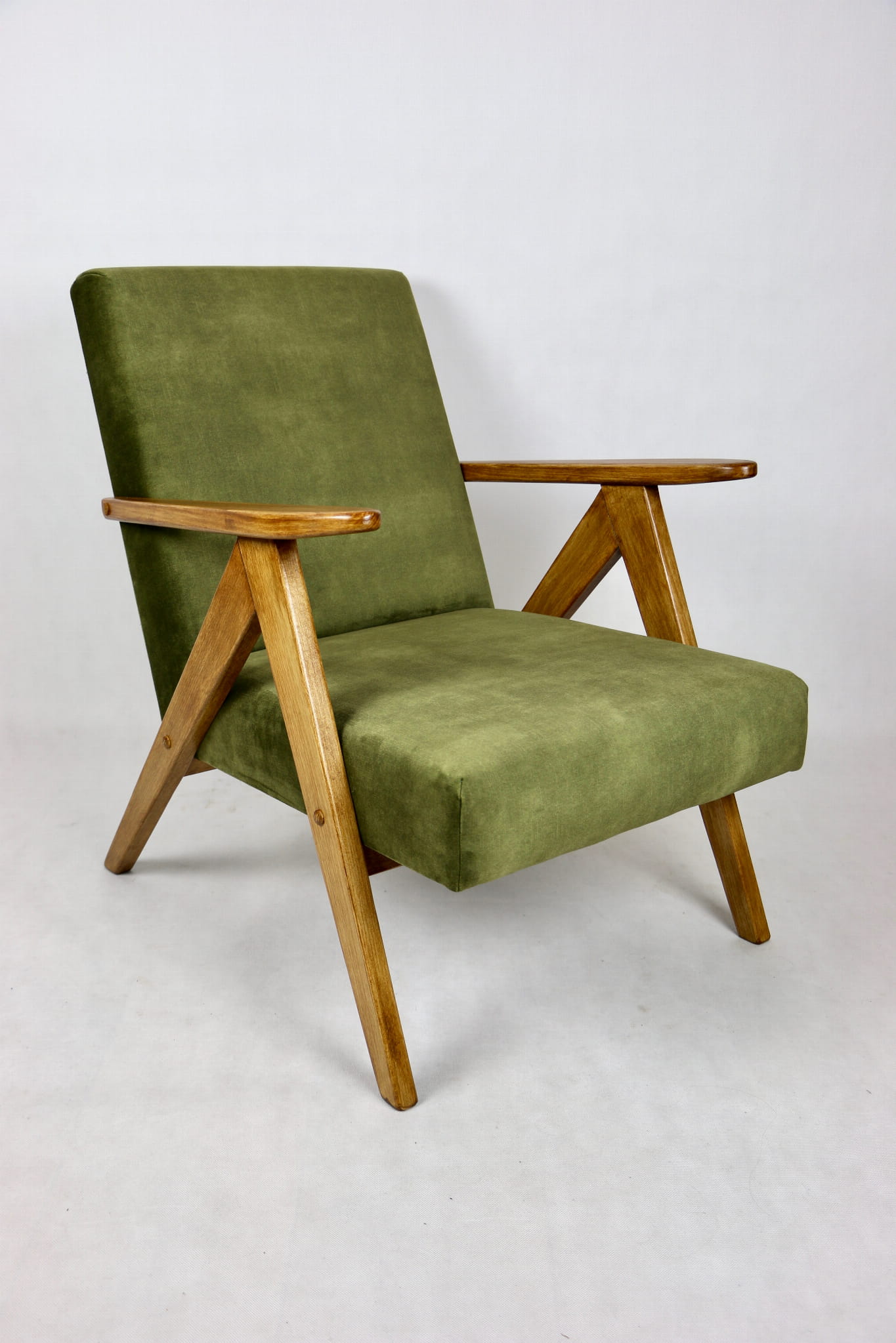 Fotel klasyczny Var B310 z lat 70-tych. Odrestaurowany, nowe obicie pokryte strukturalnym materiałem w kolorze zielonym oliwkowym. Siedzisko bardzo wygodne, stelaż drewniany połączony z podłokietnikami w ciemno-dębowej kolorystyce drewna.