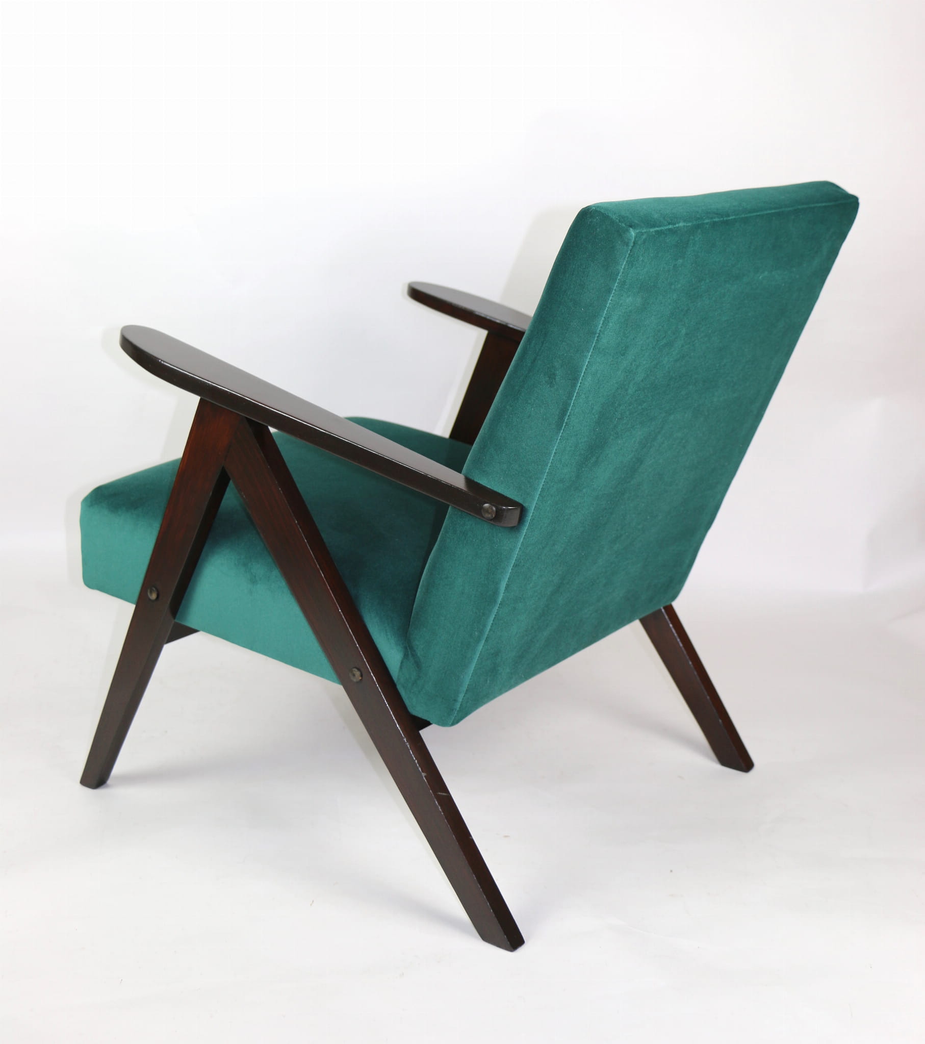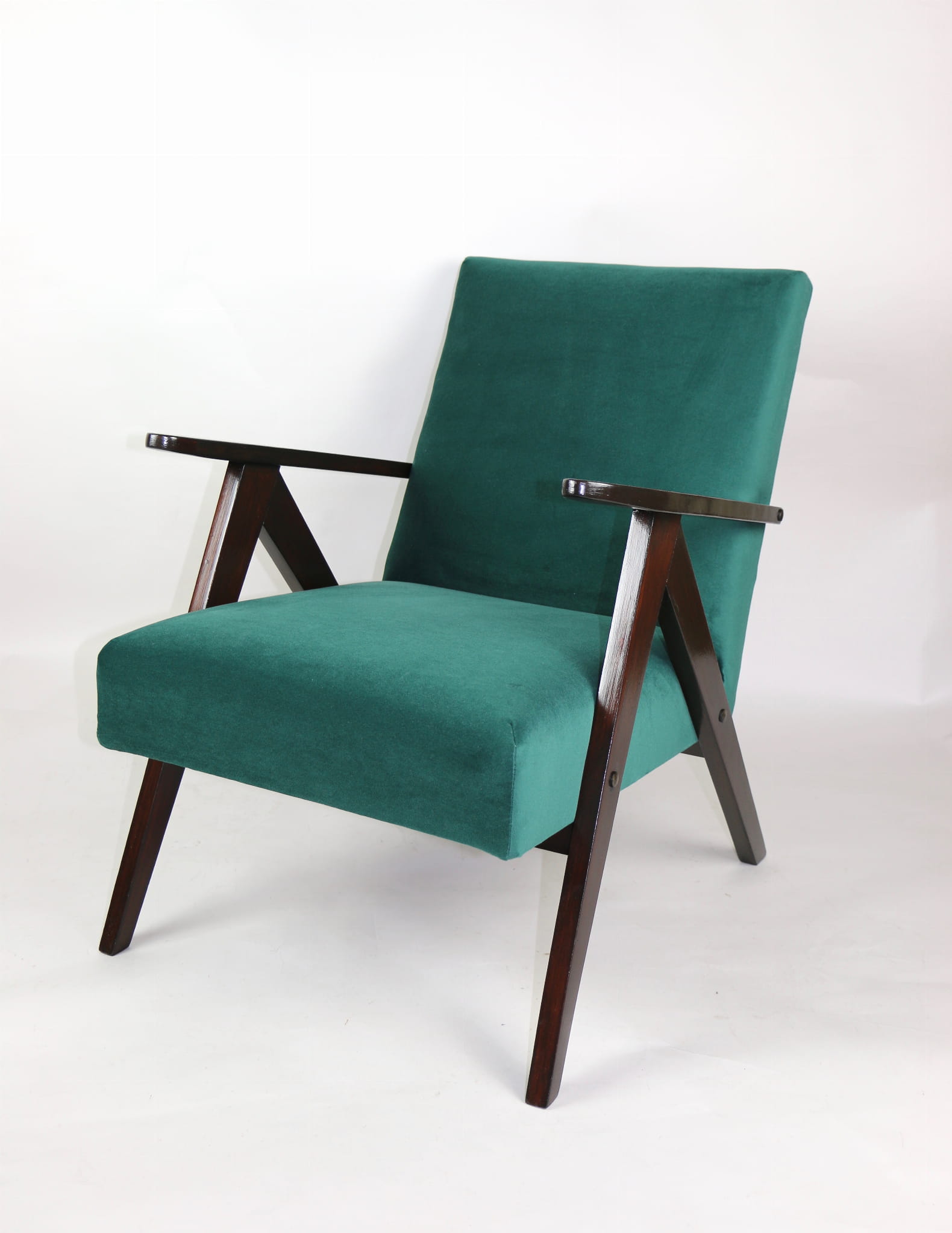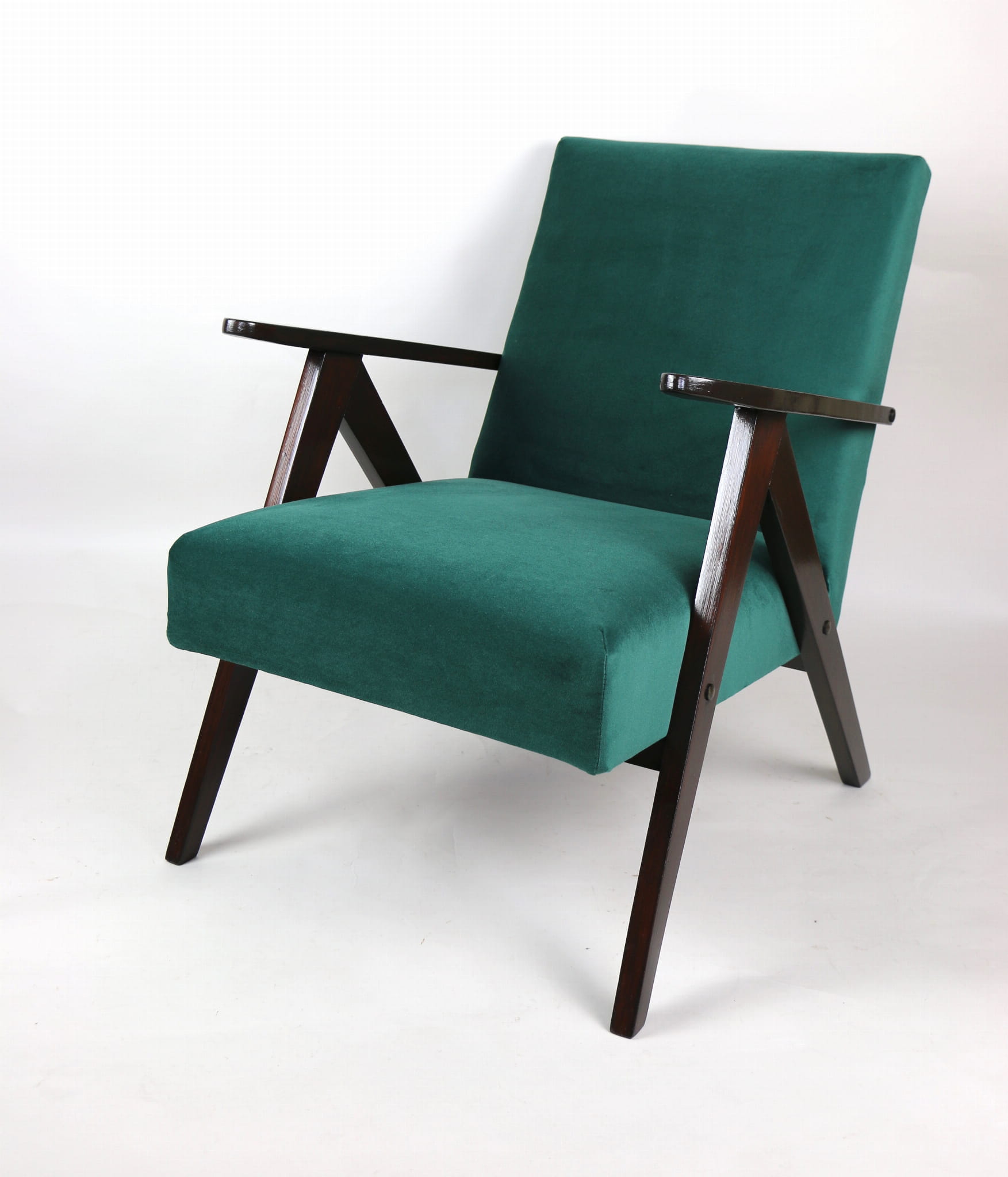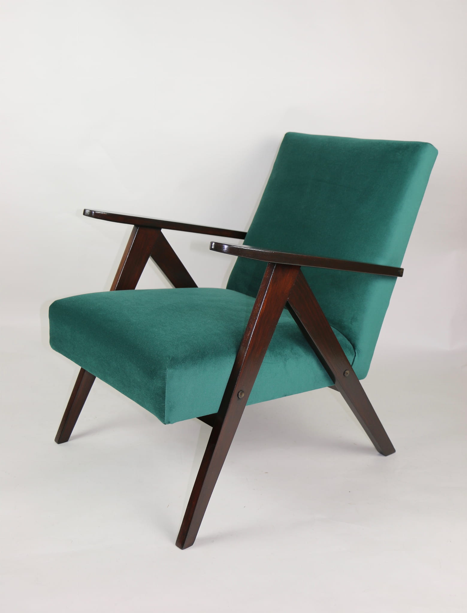 Fotel klasyczny Var B-310, lata 70. Odrestaurowany, nowe obicie pokryte aksamitnym materiałem w kolorze zielonym - materiał typu welwet - kolekcja Jade. Siedzisko bardzo wygodne, stelaż drewniany połączony z podłokietnikami w ciemnej kolorystyce drewna. Wymiary wysokość : 80 cm, szerokość : 60 cm, szerokość siedziska: 49 cm, głębokość siedziska: 49cm, głębokość mebla: 72 cm, wysokość siedziska: 40 cm, wysokość podłokietnika:57 cm