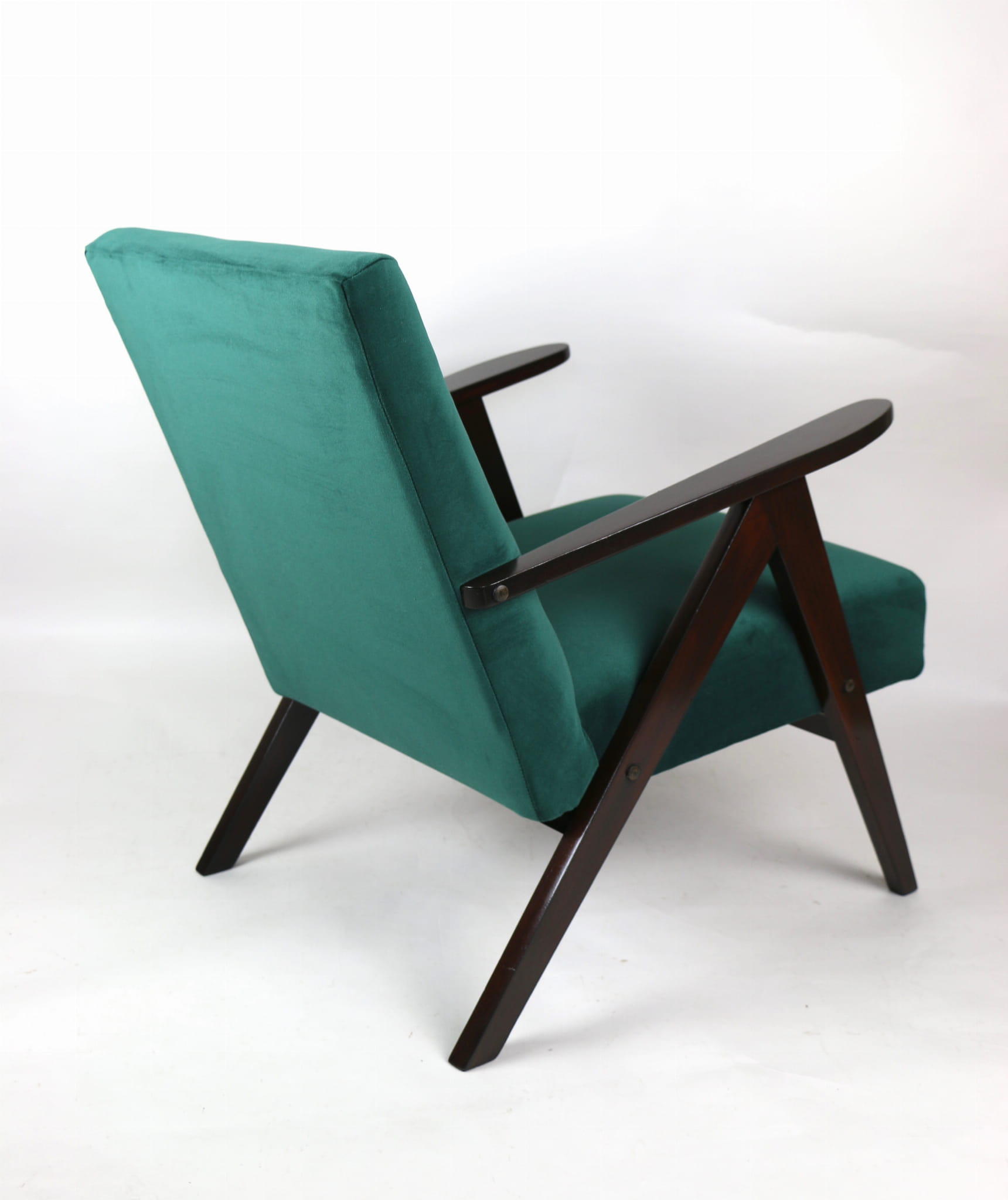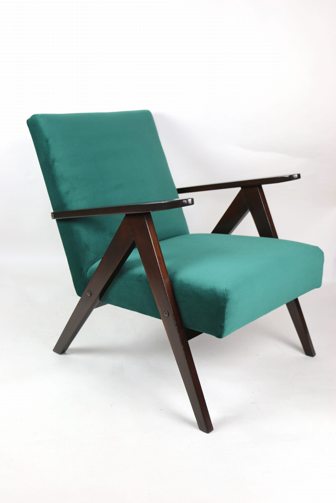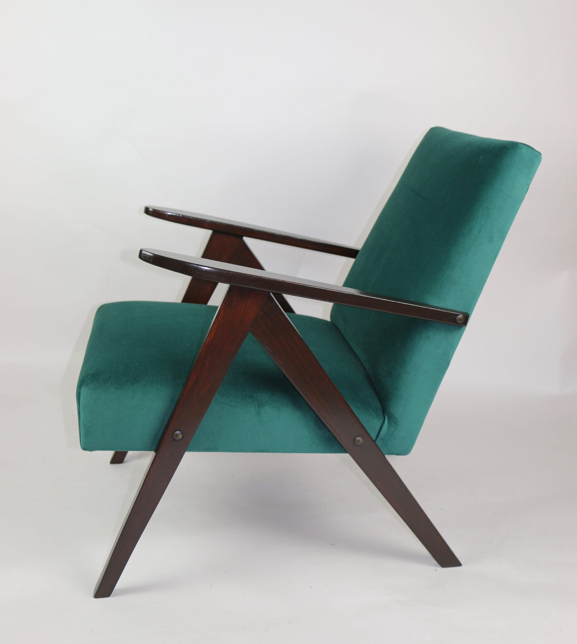 Fotel klasyczny Var B-310, lata 70. Odrestaurowany, nowe obicie pokryte aksamitnym materiałem w kolorze zielonym - materiał typu welwet - kolekcja Jade. Siedzisko bardzo wygodne, stelaż drewniany połączony z podłokietnikami w ciemnej kolorystyce drewna. Wymiary wysokość : 80 cm, szerokość : 60 cm, szerokość siedziska: 49 cm, głębokość siedziska: 49cm, głębokość mebla: 72 cm, wysokość siedziska: 40 cm, wysokość podłokietnika:57 cm