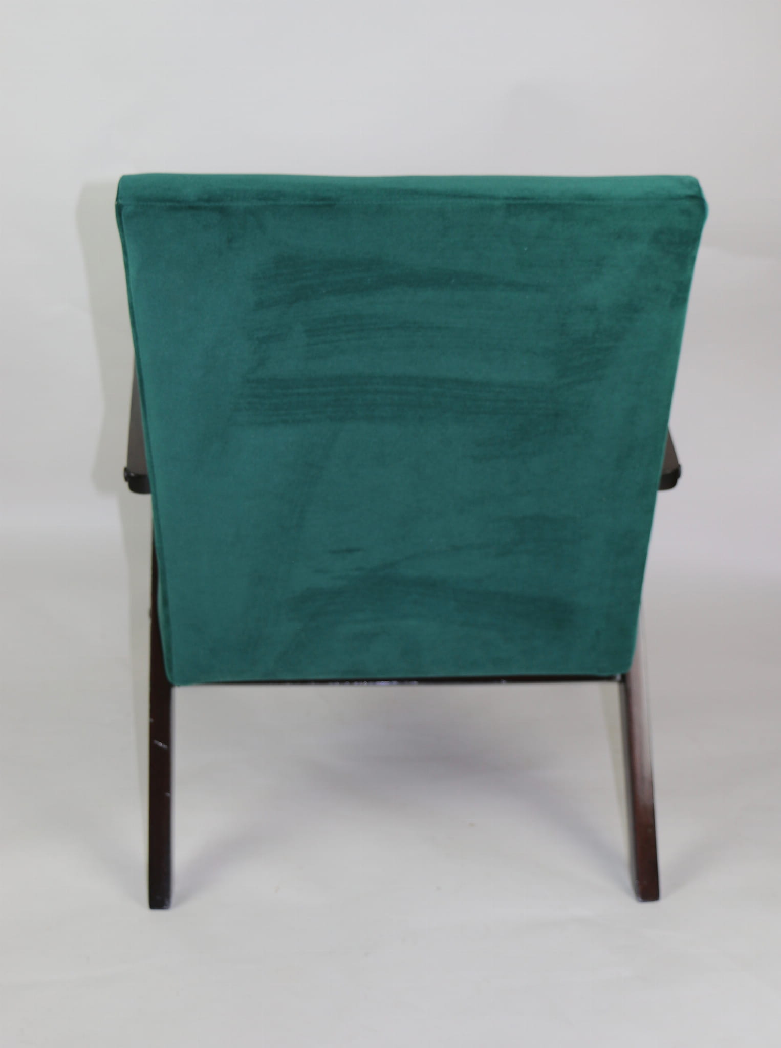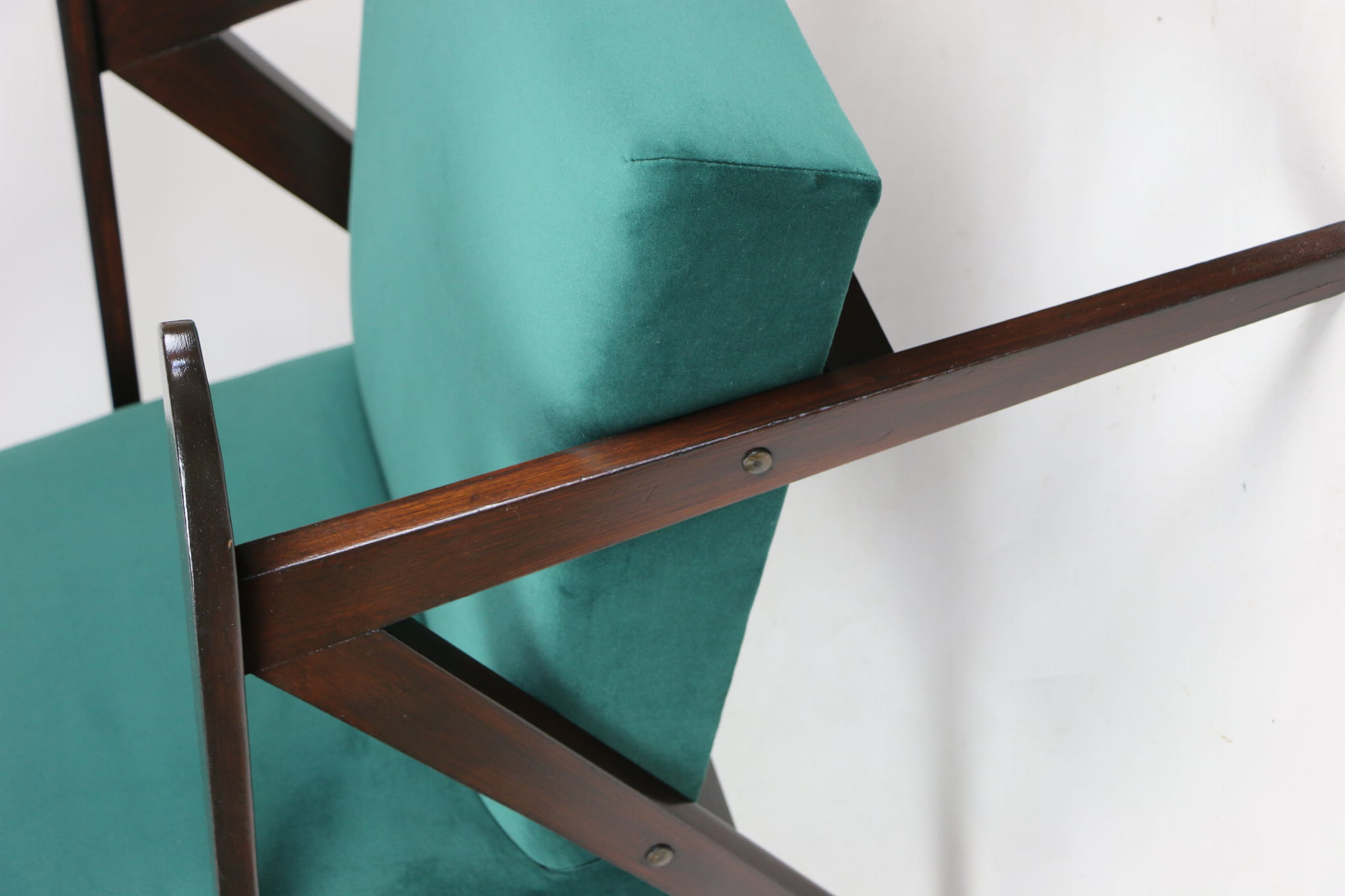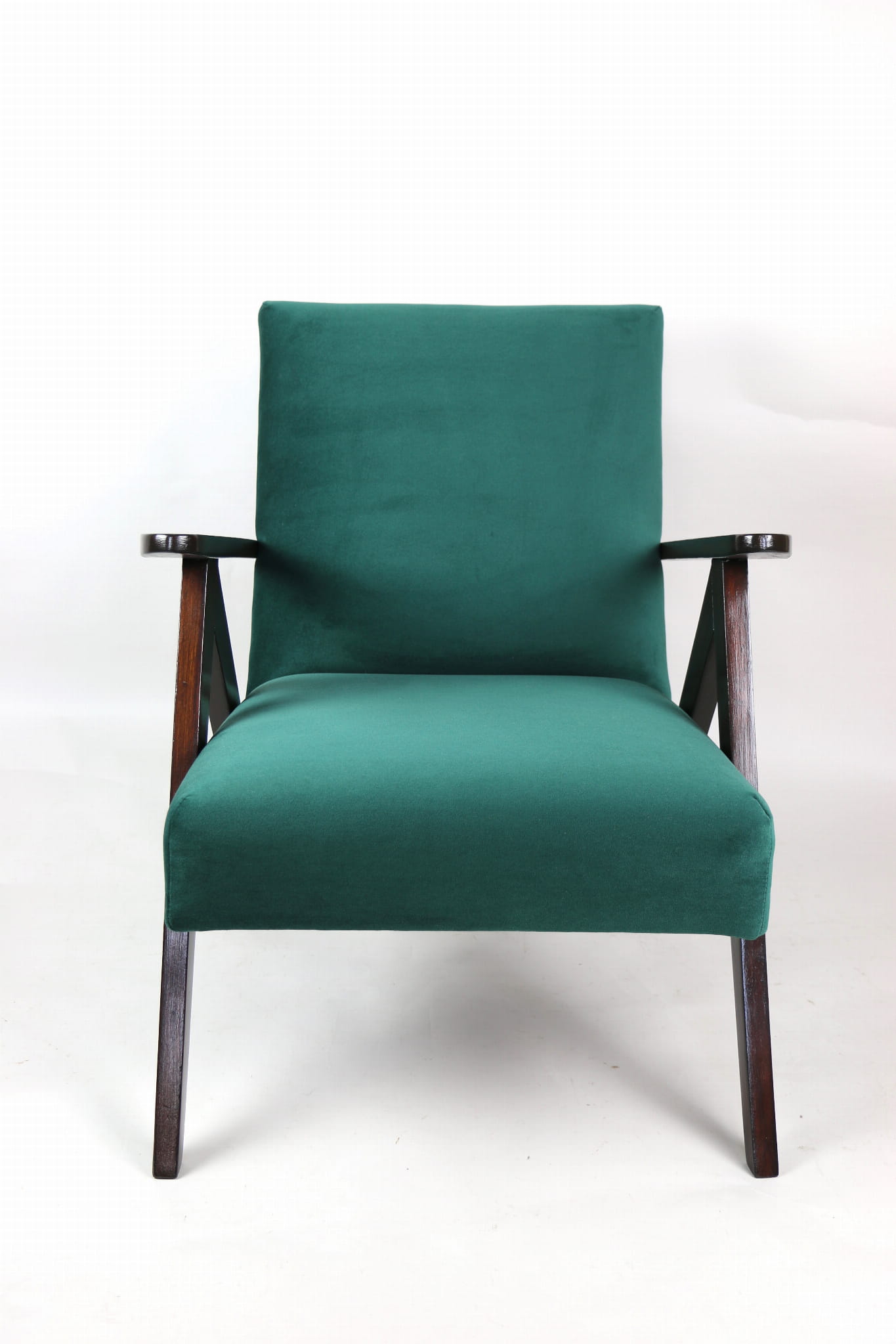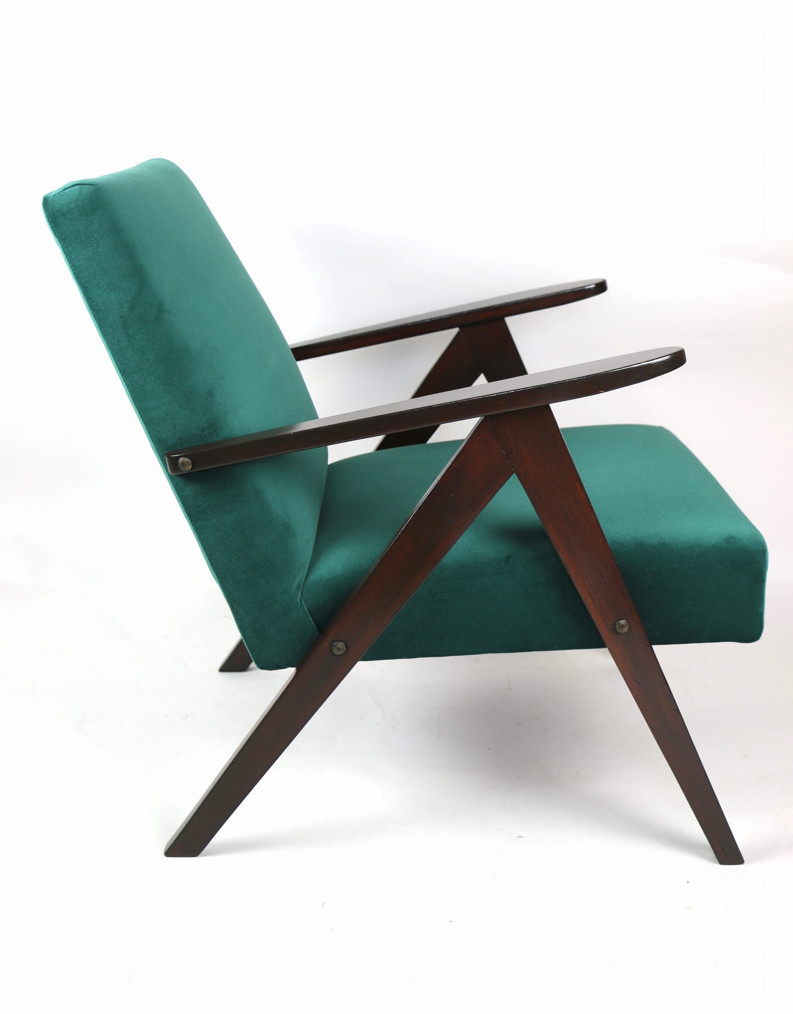 Fotel klasyczny Var B-310, lata 70. Odrestaurowany, nowe obicie pokryte aksamitnym materiałem w kolorze zielonym - materiał typu welwet - kolekcja Jade. Siedzisko bardzo wygodne, stelaż drewniany połączony z podłokietnikami w ciemnej kolorystyce drewna. Wymiary wysokość : 80 cm, szerokość : 60 cm, szerokość siedziska: 49 cm, głębokość siedziska: 49cm, głębokość mebla: 72 cm, wysokość siedziska: 40 cm, wysokość podłokietnika:57 cm