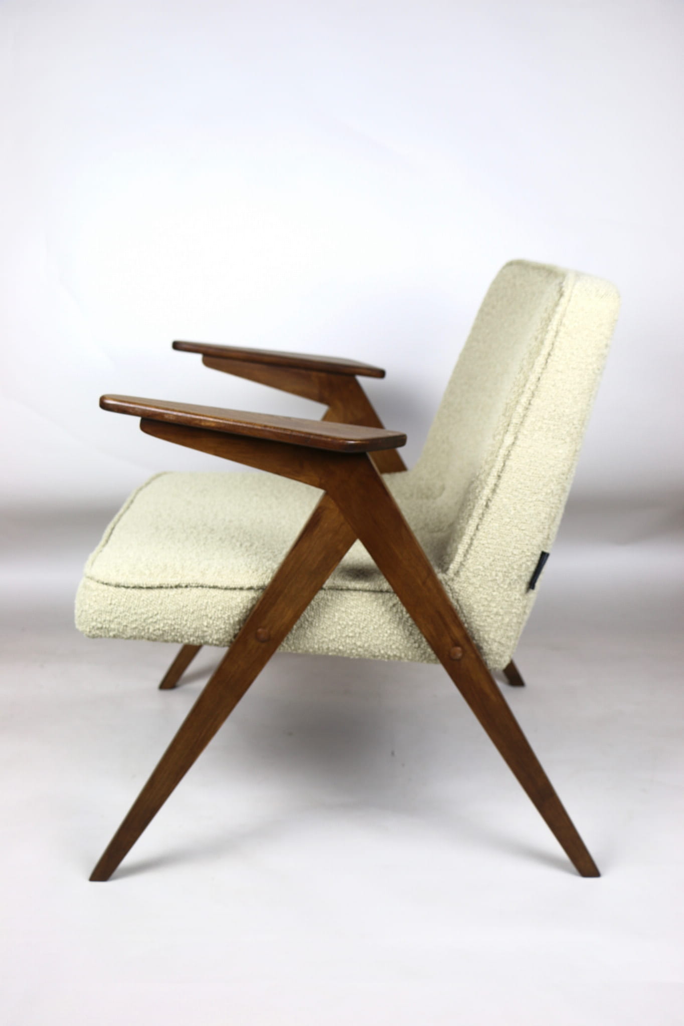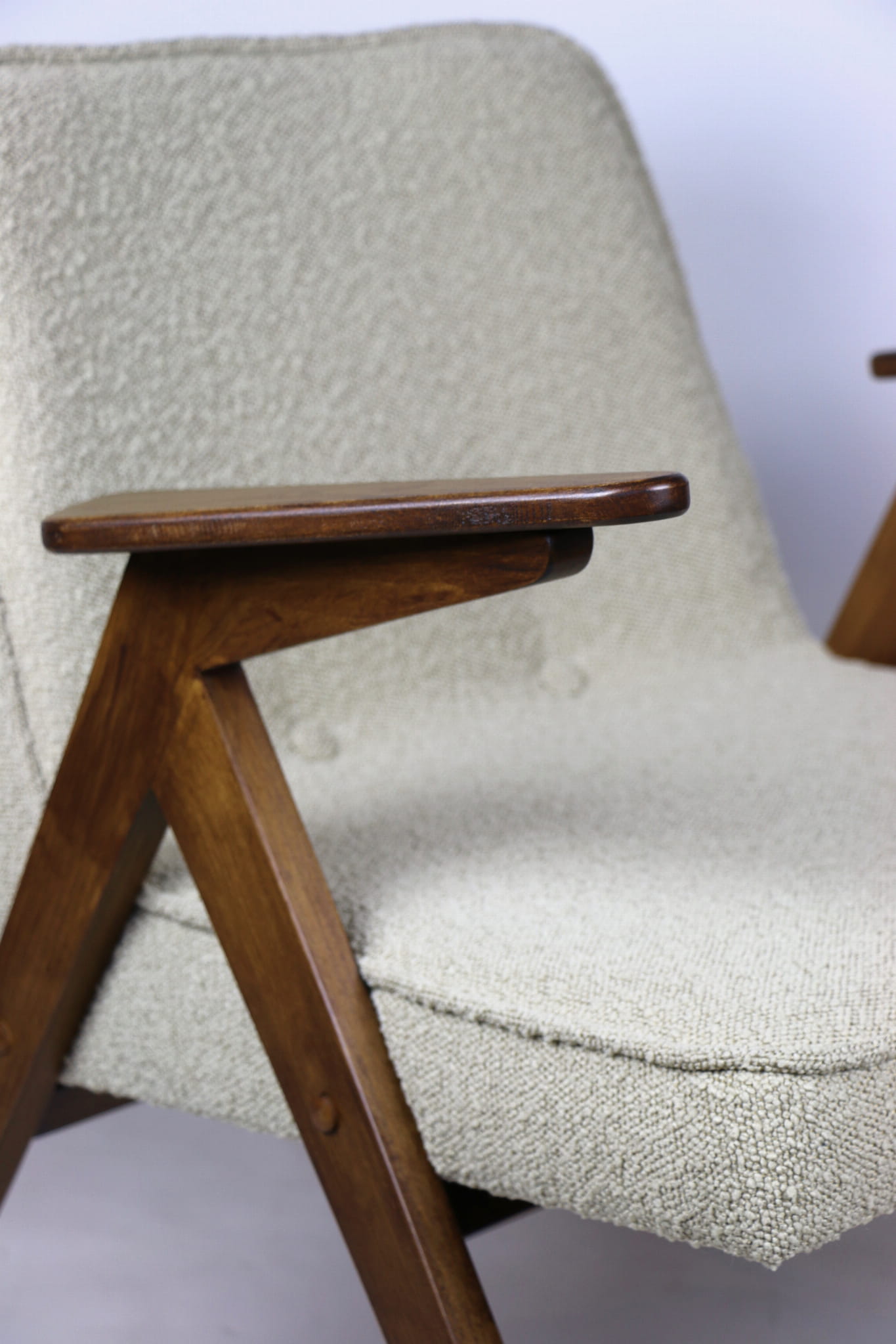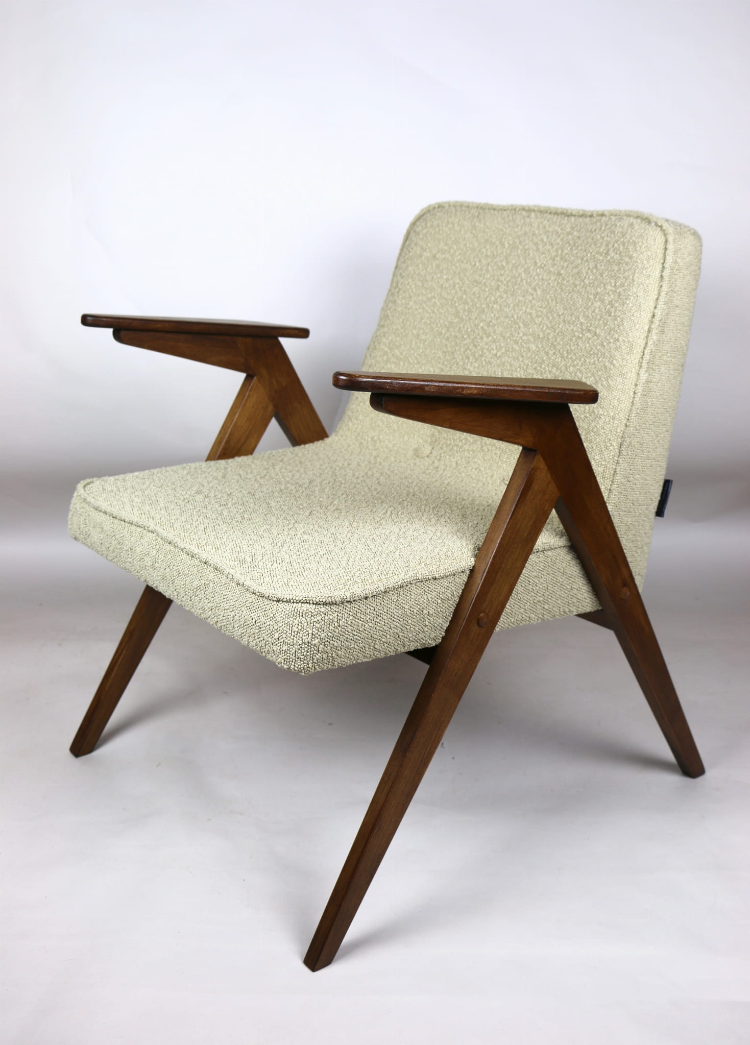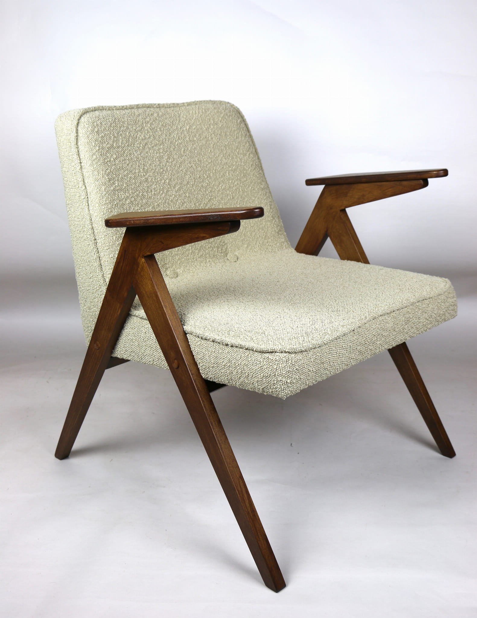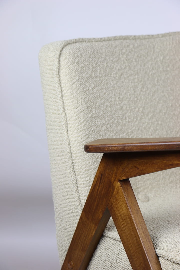 Fotel Bunny projektu Józefa Chierowskiego, który został całkowicie odrestaurowany. Nowe obicie pokryte strukturalnym materiałem tapicerskim w beżowym kolorze z materiału typu Boucle. Stelaż drewniany z podłokietnikami w kolorze orzechowego drewna.