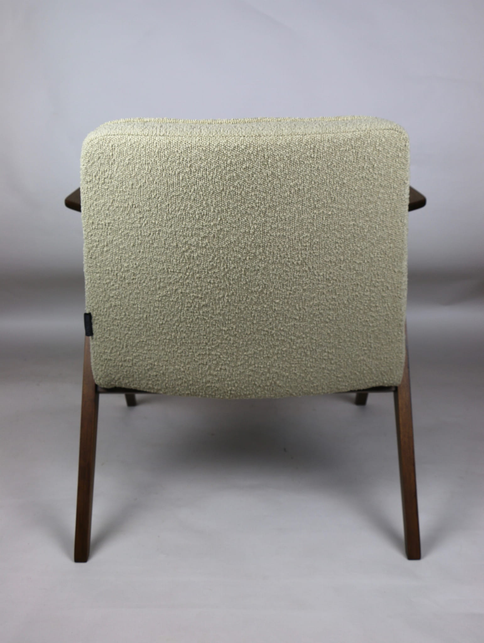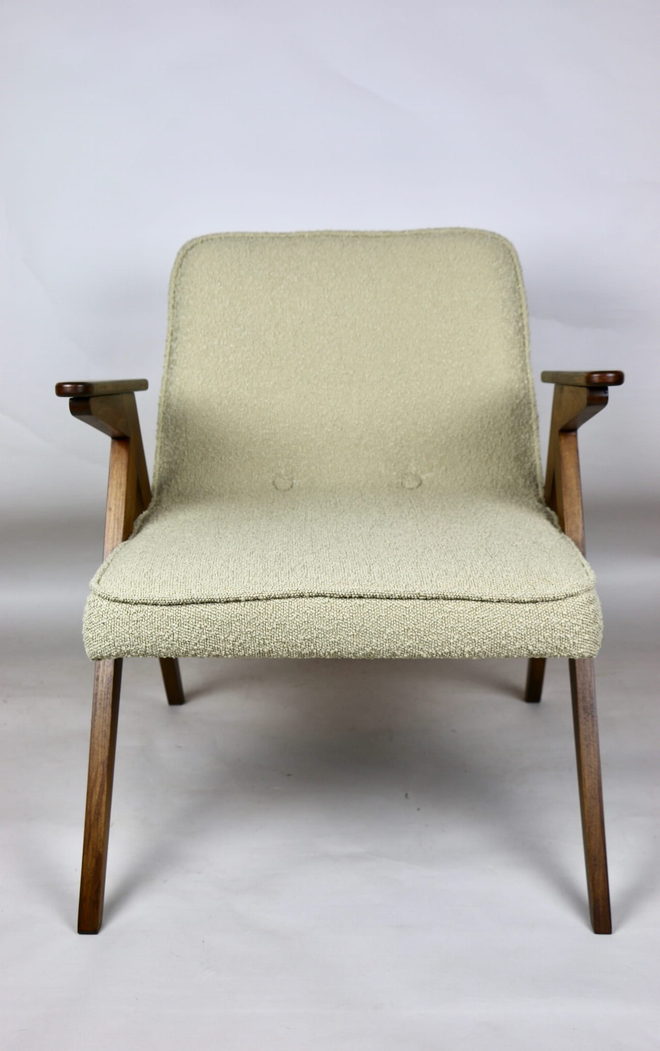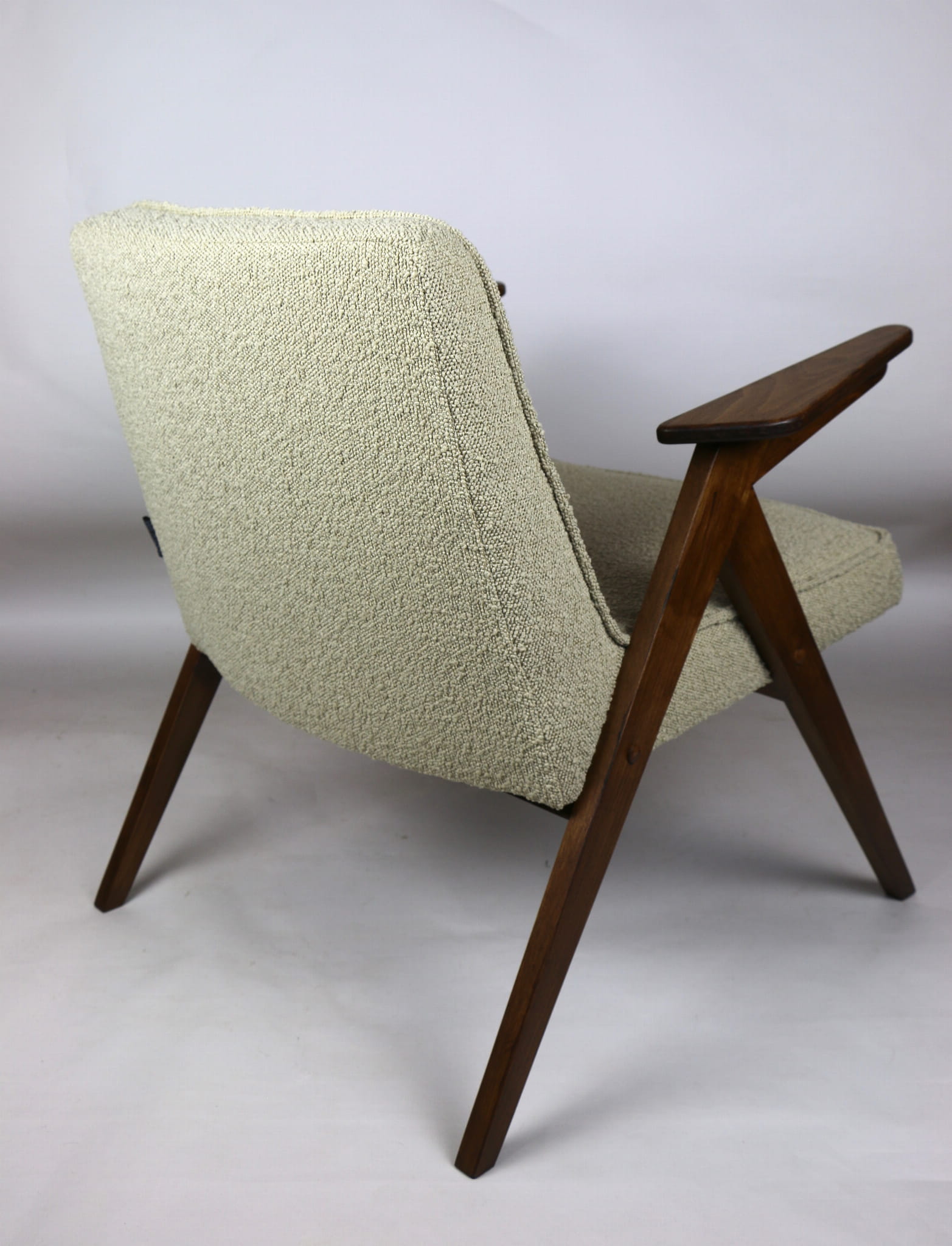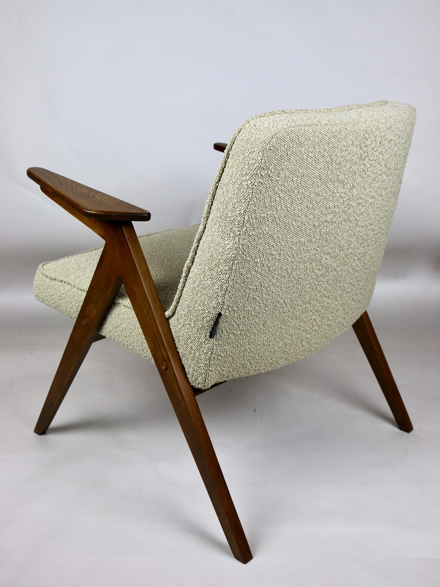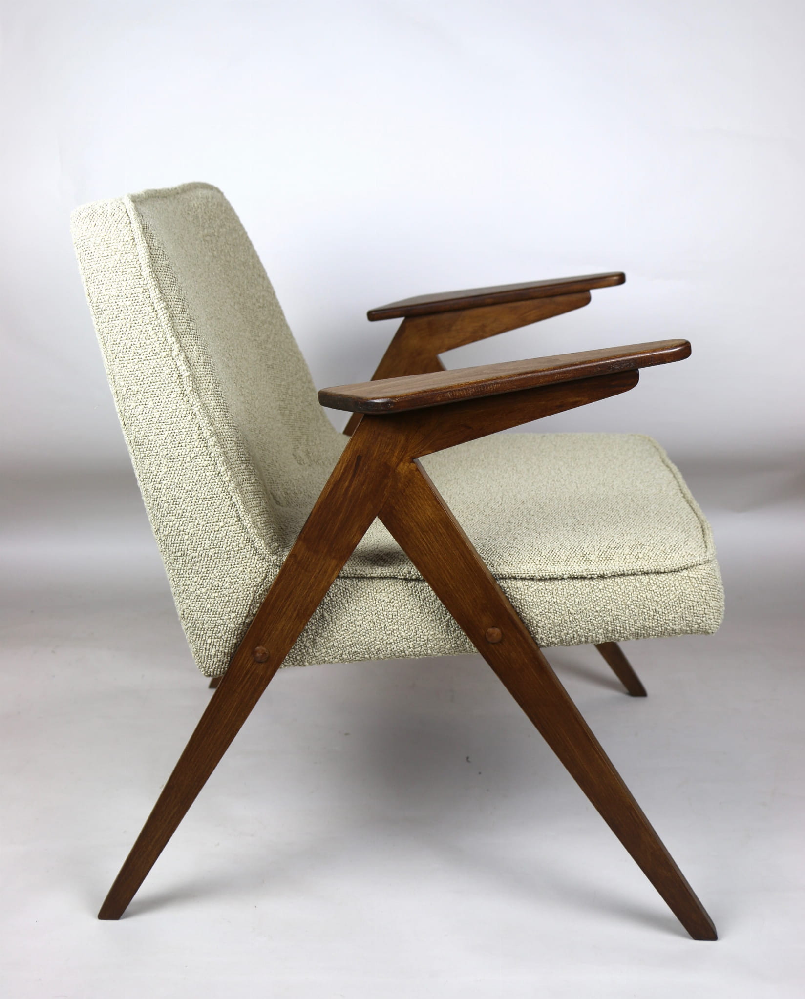 Fotel Bunny projektu Józefa Chierowskiego, który został całkowicie odrestaurowany. Nowe obicie pokryte strukturalnym materiałem tapicerskim w beżowym kolorze z materiału typu Boucle. Stelaż drewniany z podłokietnikami w kolorze orzechowego drewna.