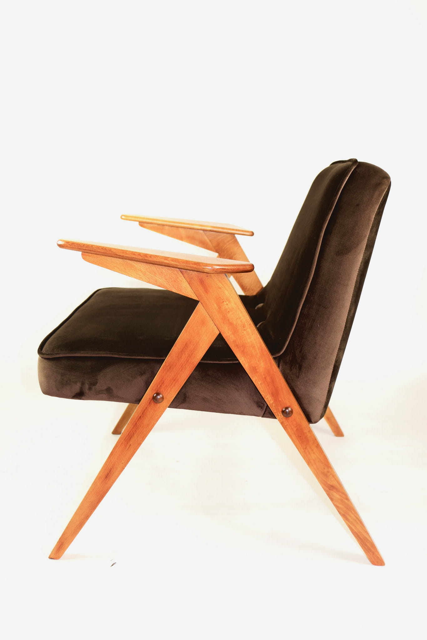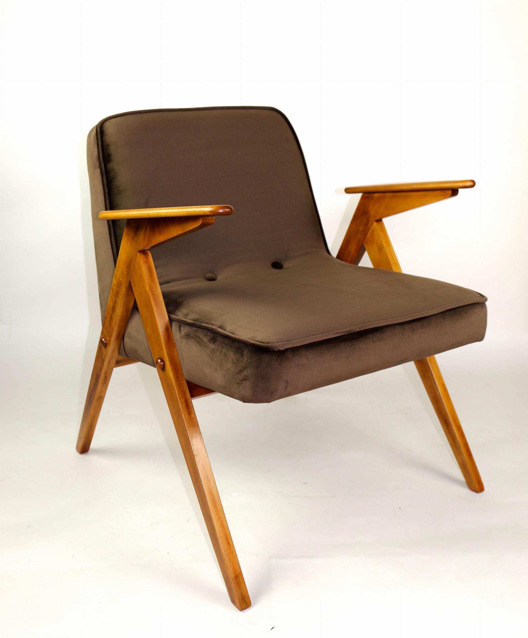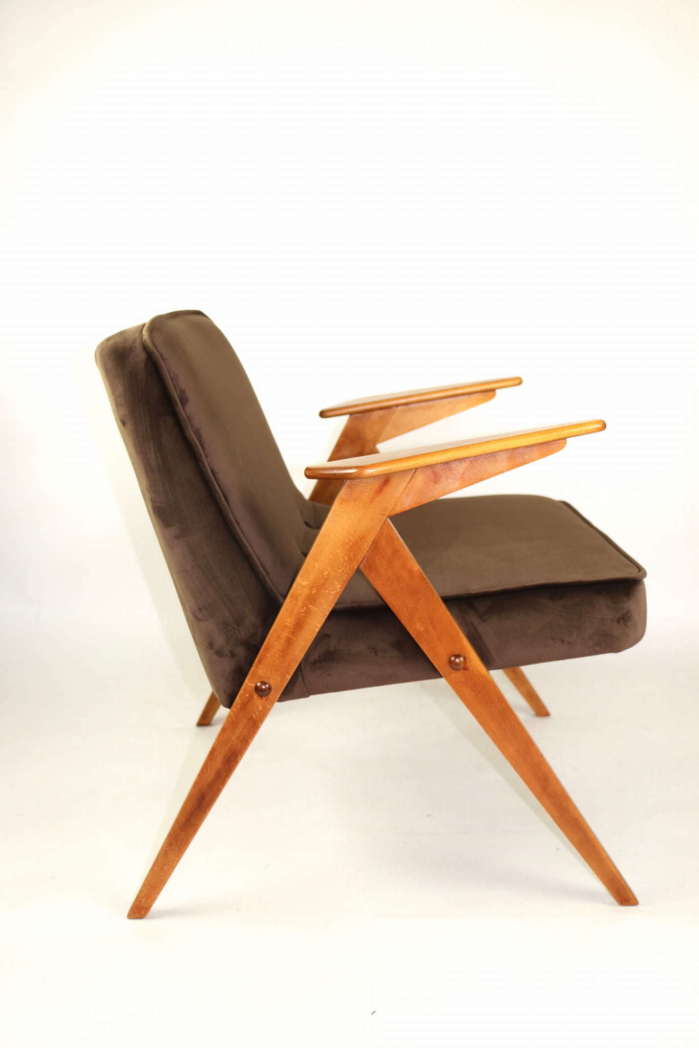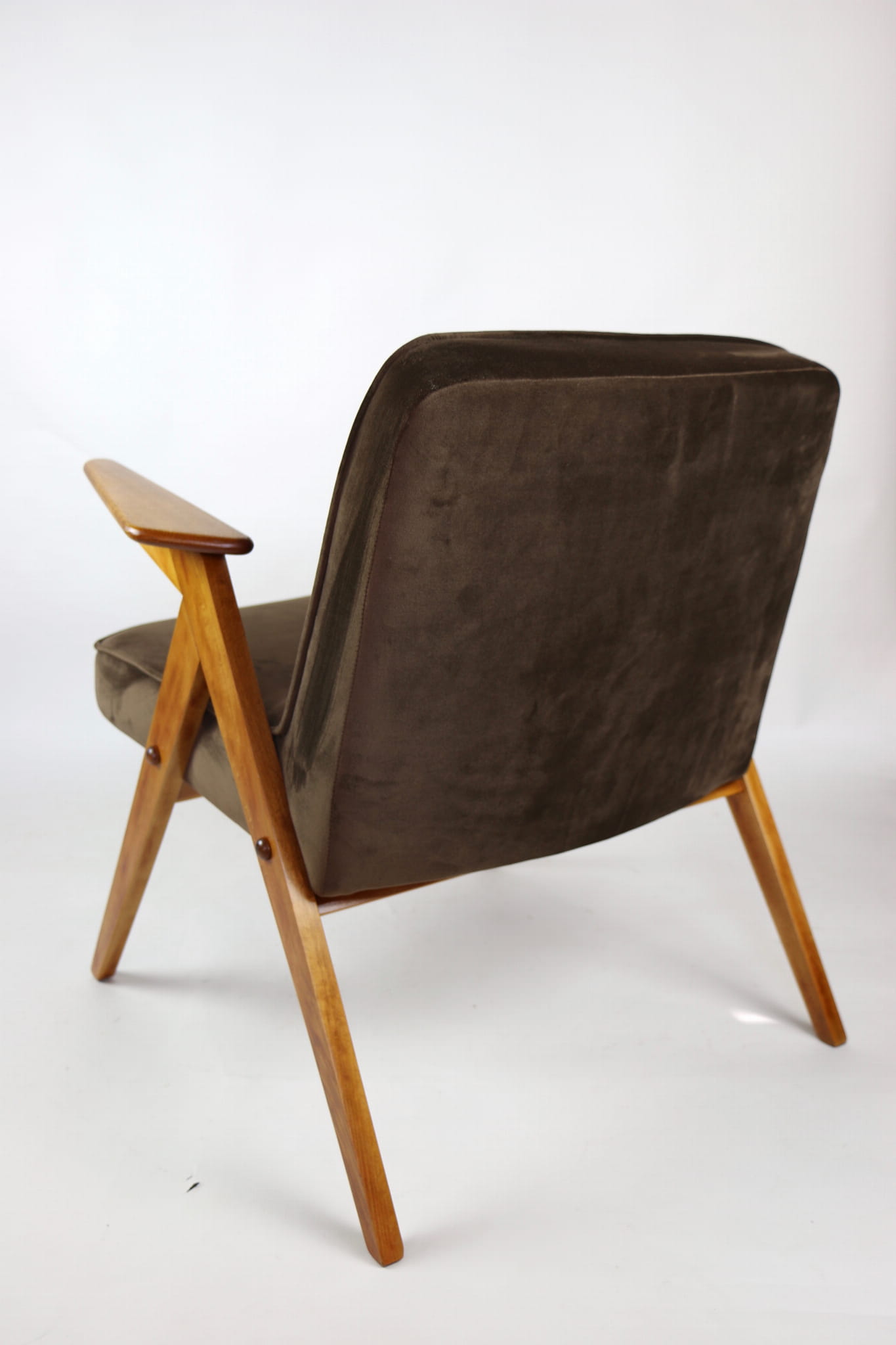 Fotel Bunny całkowicie odrestaurowany. Nowe obicie pokryte aksamitnym materiałem tapicerskim w kolorze brązowym. Stelaż drewniany z podłokietnikami w kolorze naturalnego drewna.