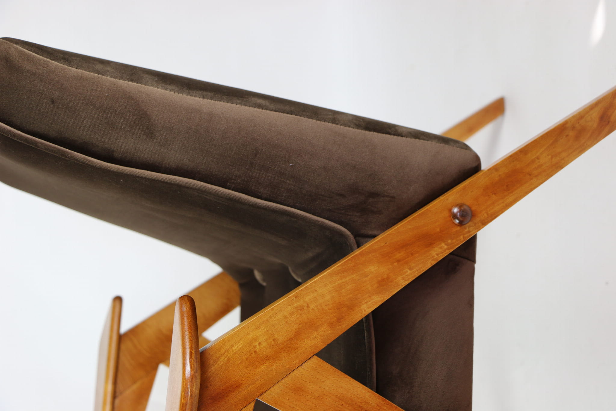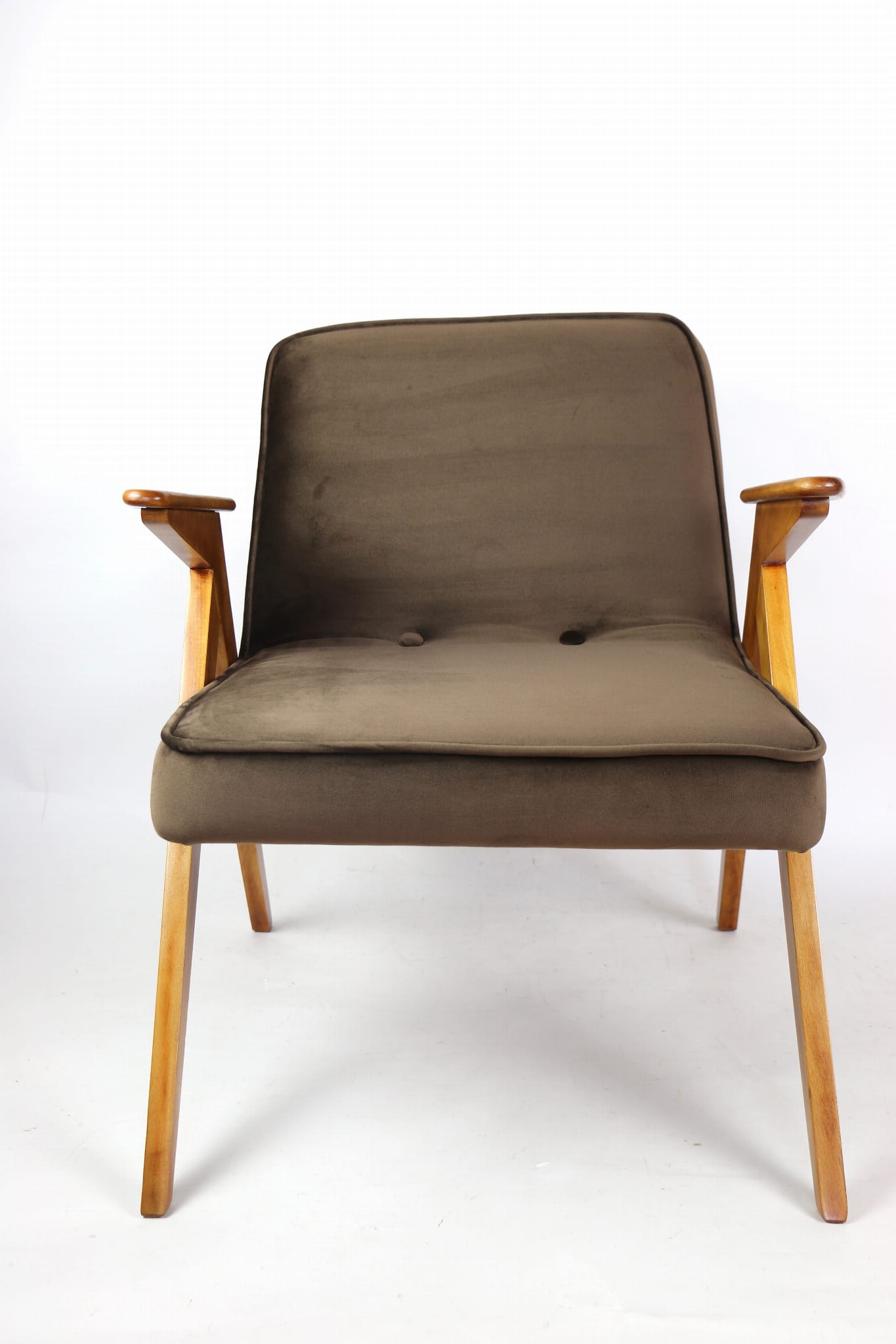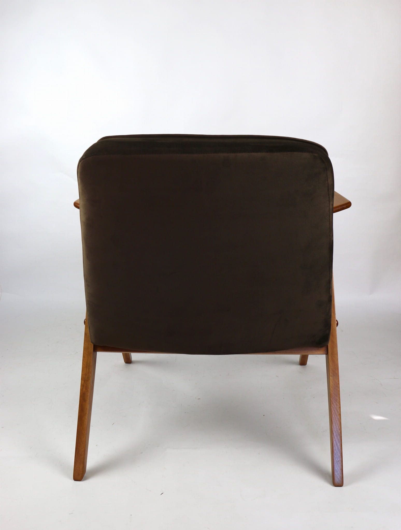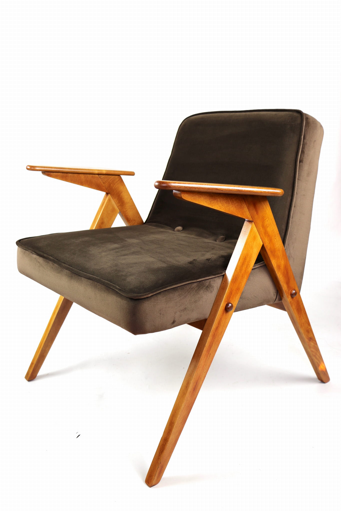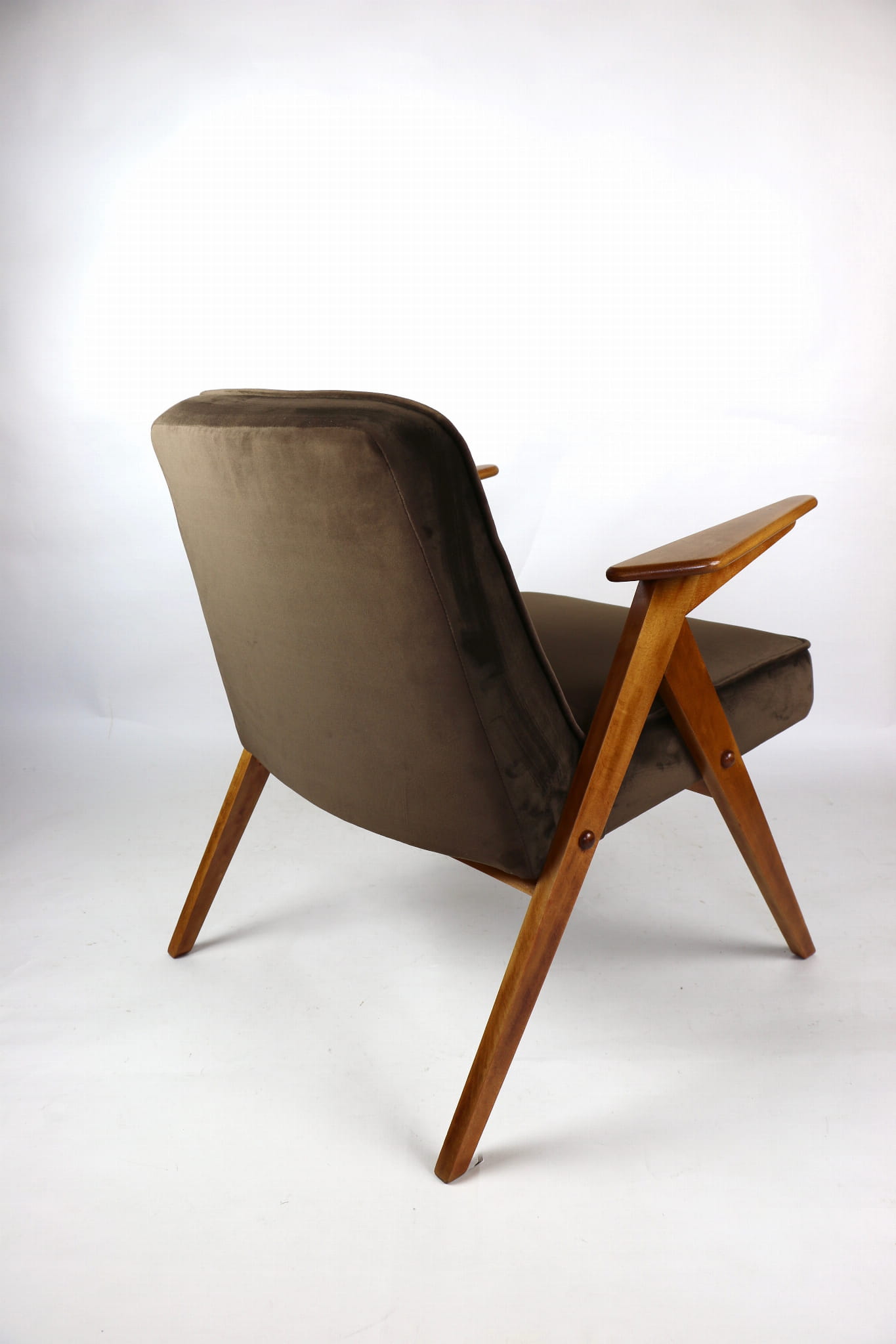 Fotel Bunny całkowicie odrestaurowany. Nowe obicie pokryte aksamitnym materiałem tapicerskim w kolorze brązowym. Stelaż drewniany z podłokietnikami w kolorze naturalnego drewna.