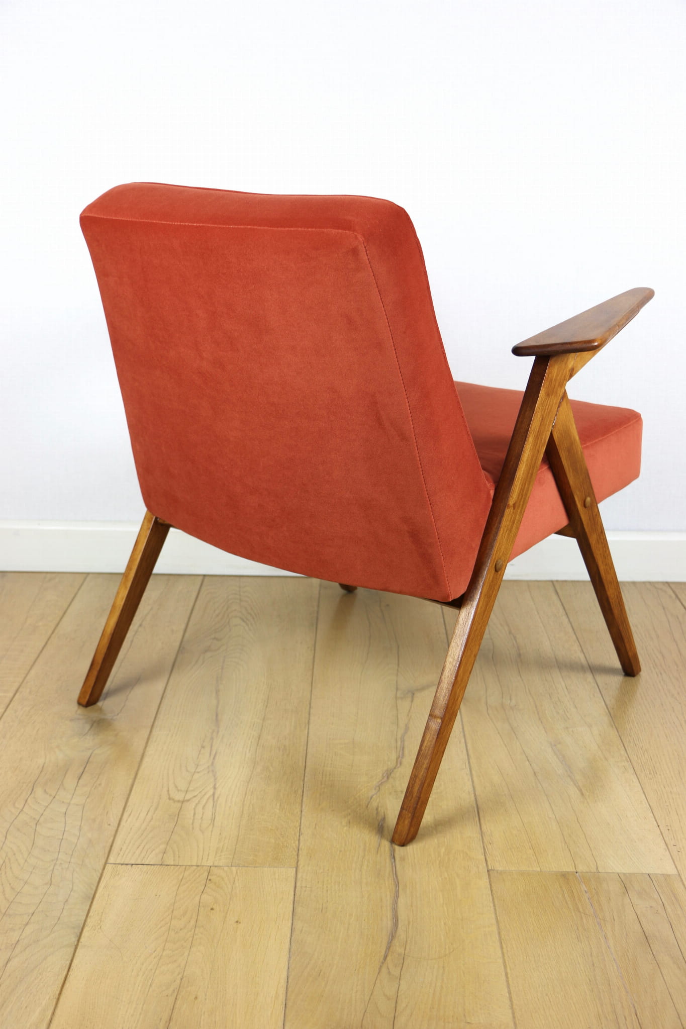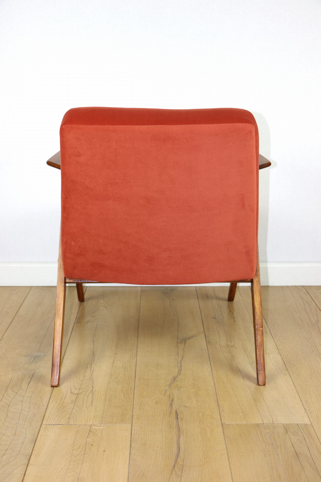 Fotel Bunny projektu Józefa Chierowskiego, który został całkowicie odrestaurowany. Nowe obicie pokryte aksamitnym materiałem tapicerskim z serii Jade w pomarańczowo - ceglastym kolorze.