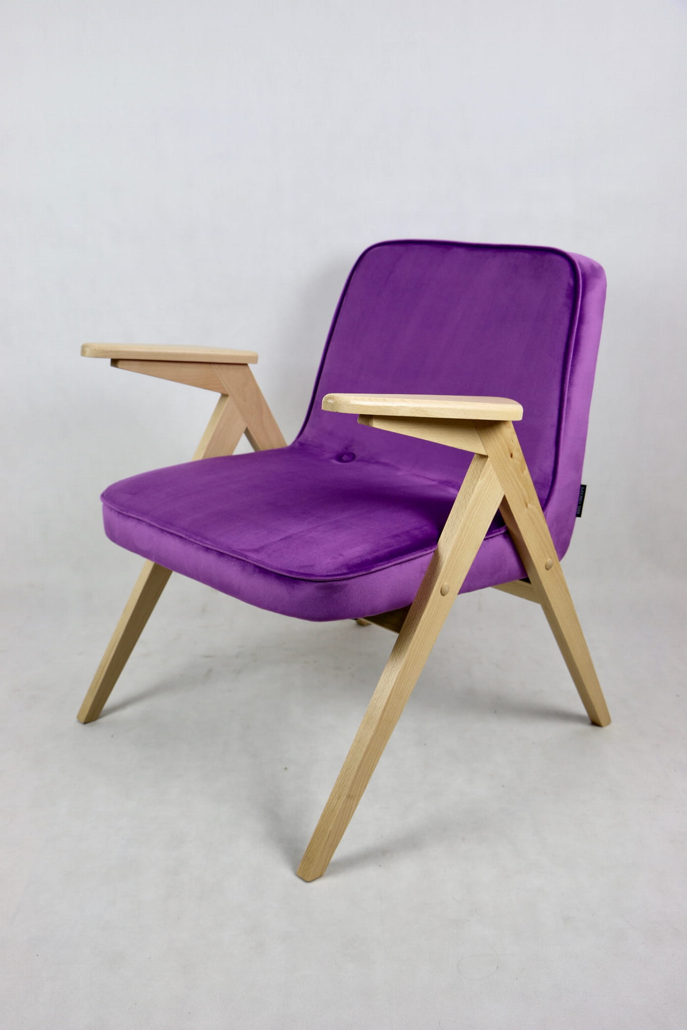 Fotel Bunny projektu Józefa Chierowskiego, który został całkowicie odrestaurowany. Nowe obicie pokryte materiałem tapicerskim w bordowym welwecie z serii Quartz. Stelaż drewniany z podłokietnikami w kolorze naturalnego drewna bukowego pokryty lakierem satynowym.