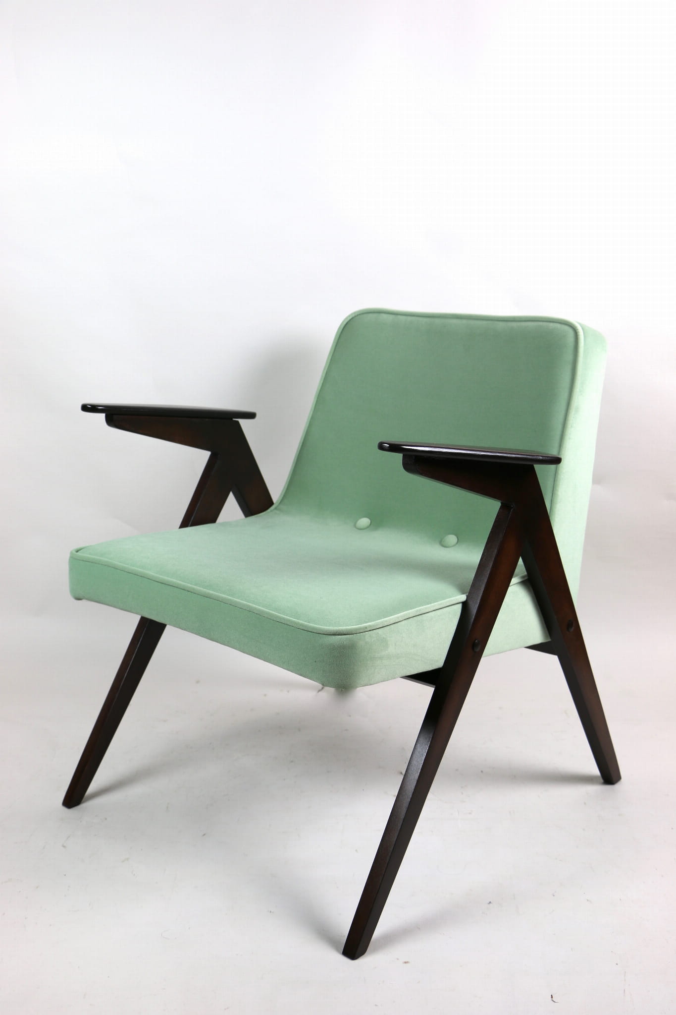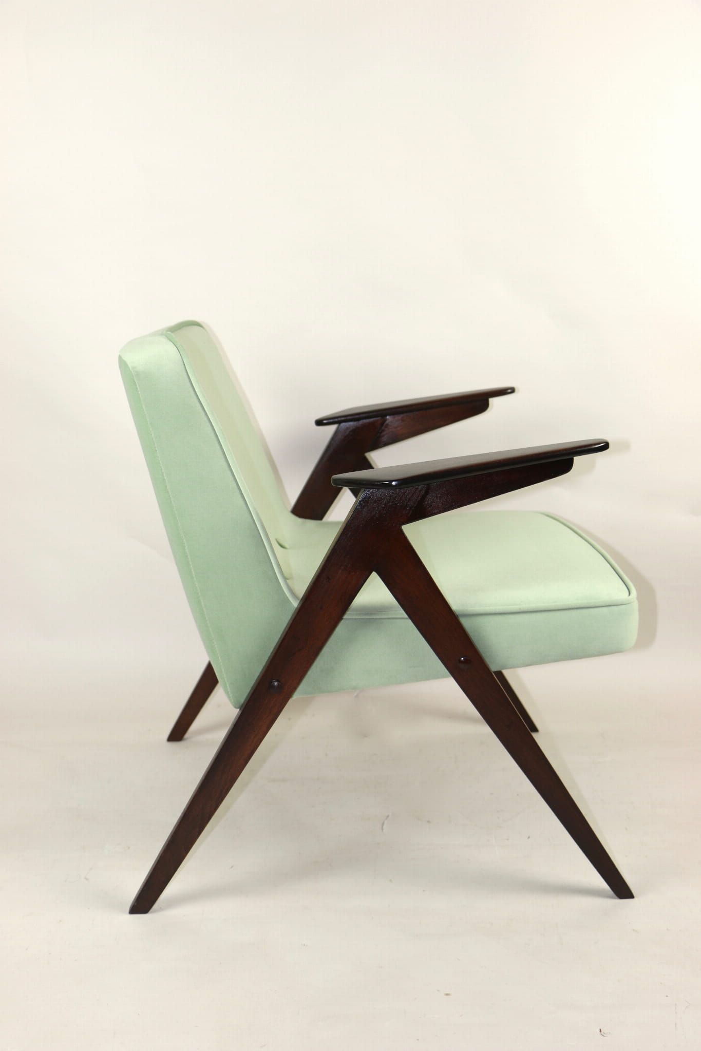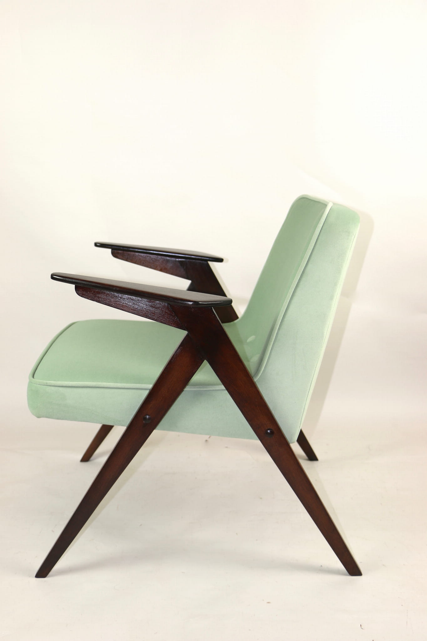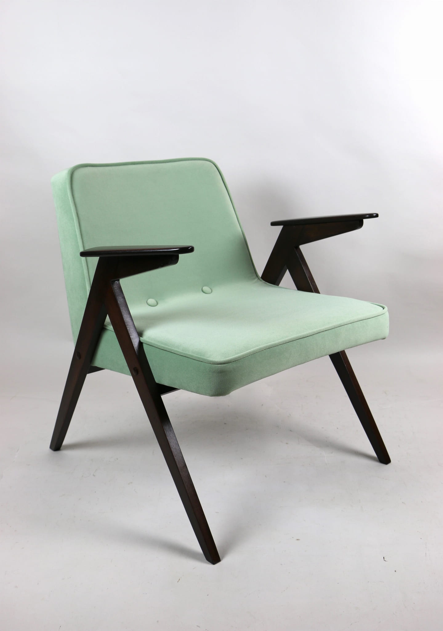 Fotel Bunny projektu Józefa Chierowskiego, który został całkowicie odrestaurowany. Nowe obicie pokryte materiałem tapicerskim w jasny-zielonym kolorze z serii Jade - kolor 501 - welwet easy to clean. Stelaż drewniany z podłokietnikami w kolorze orzechowego drewna.