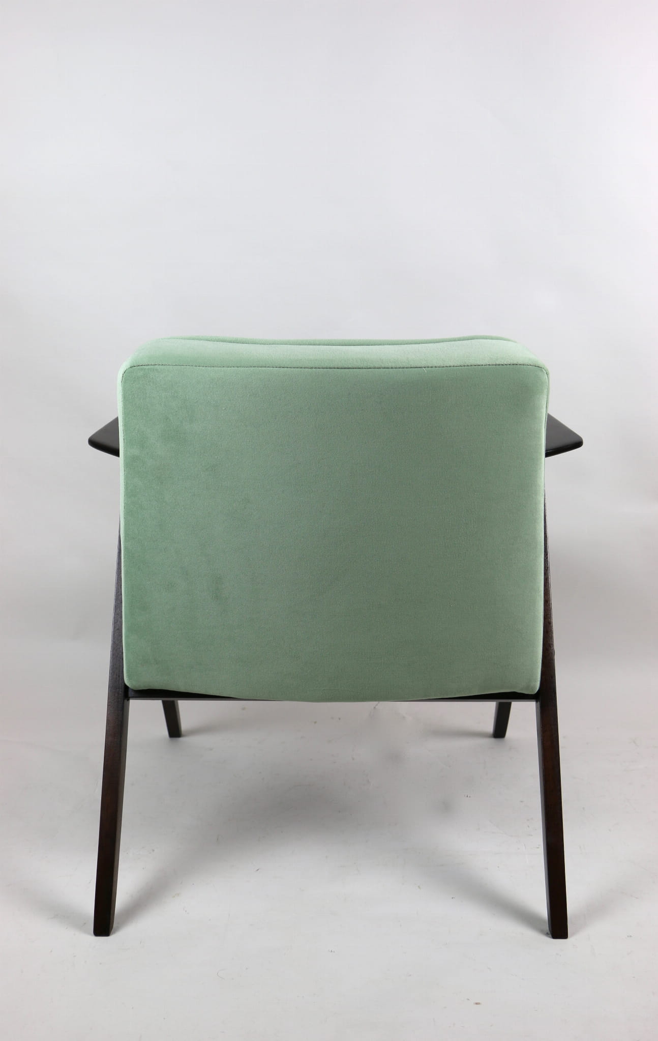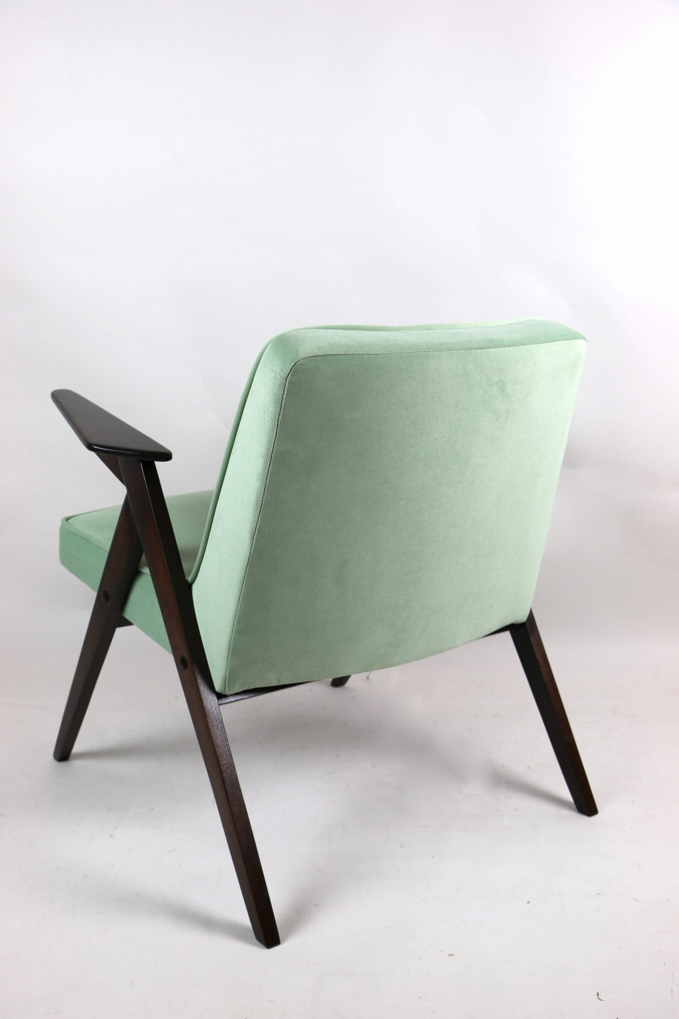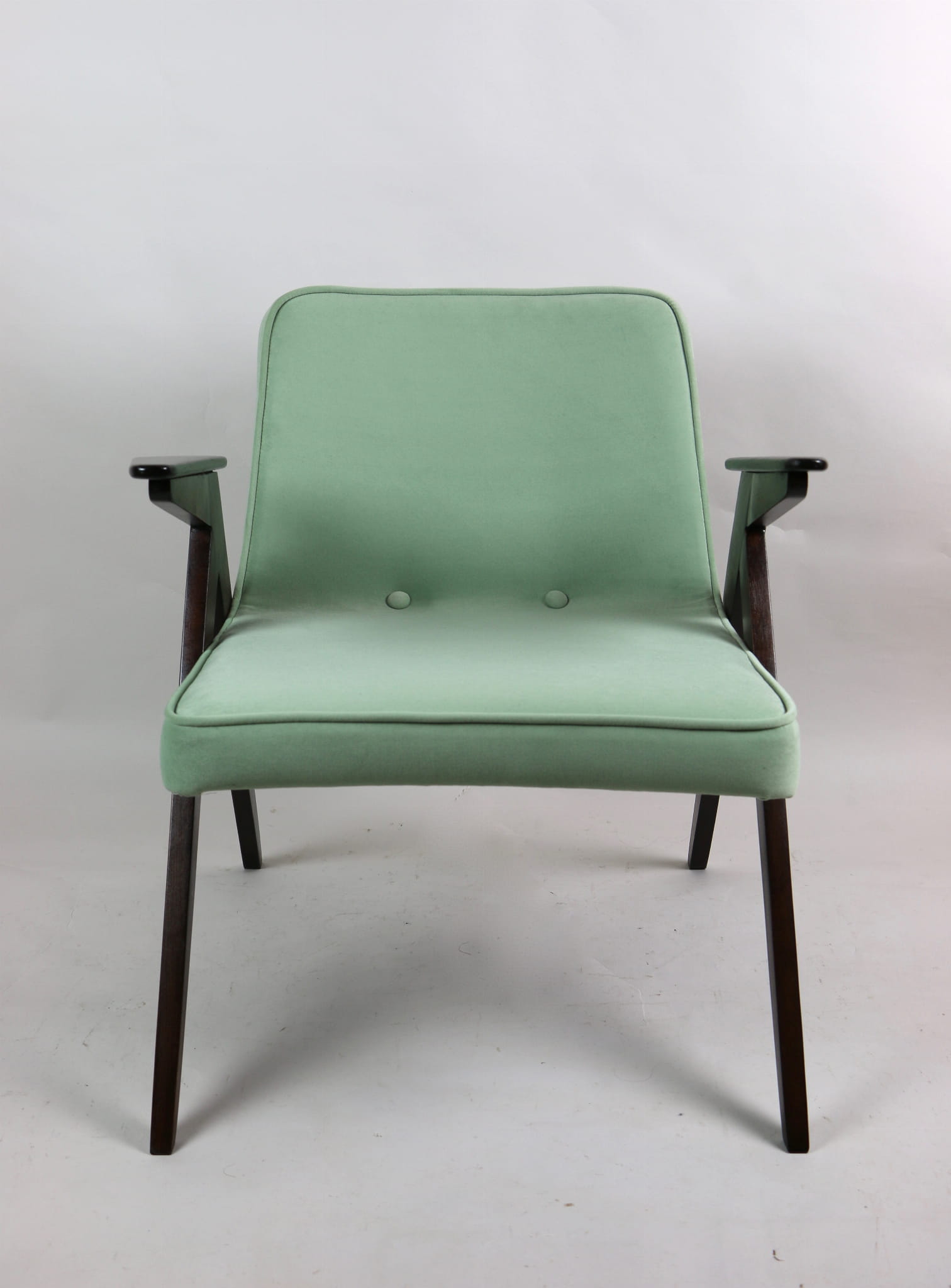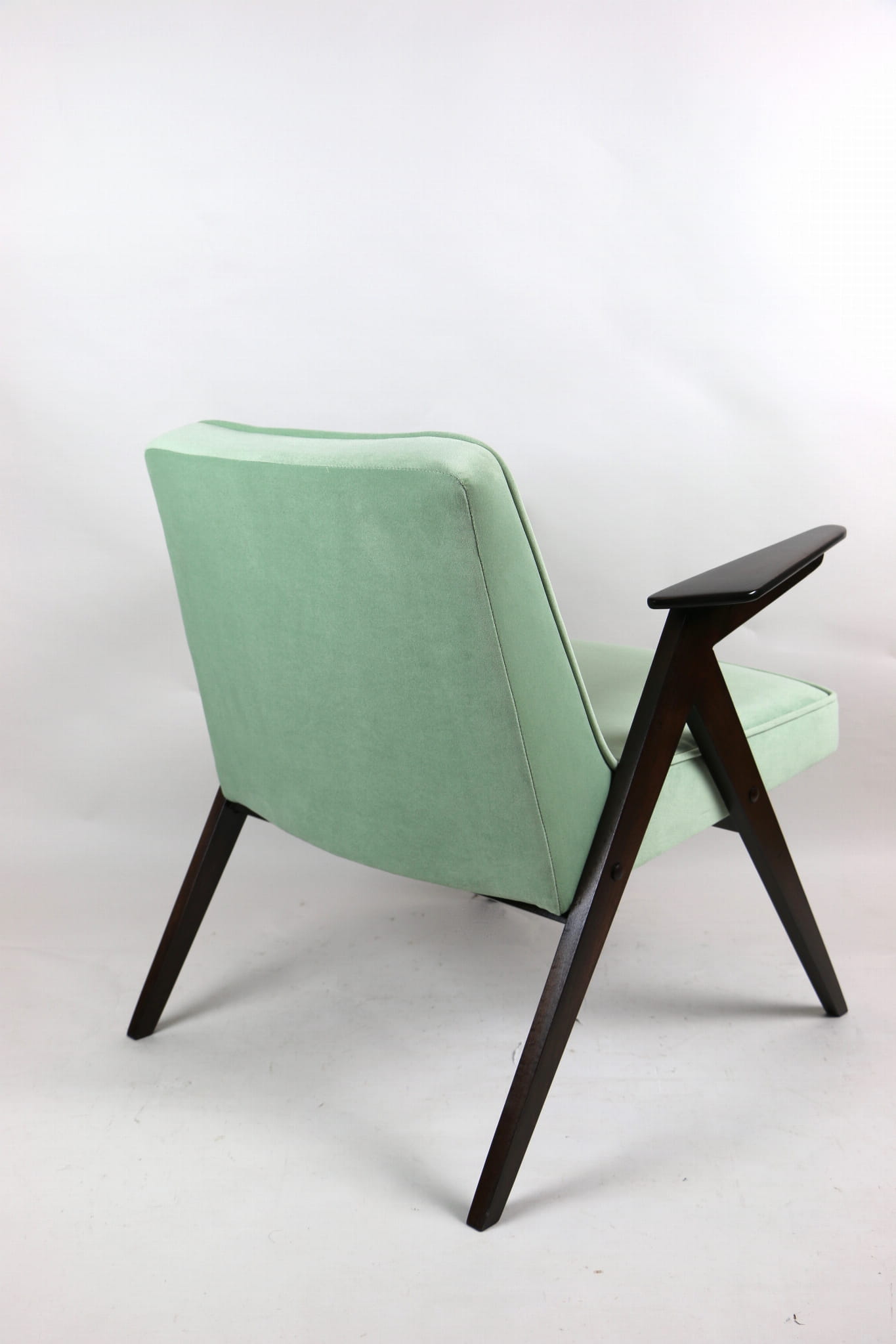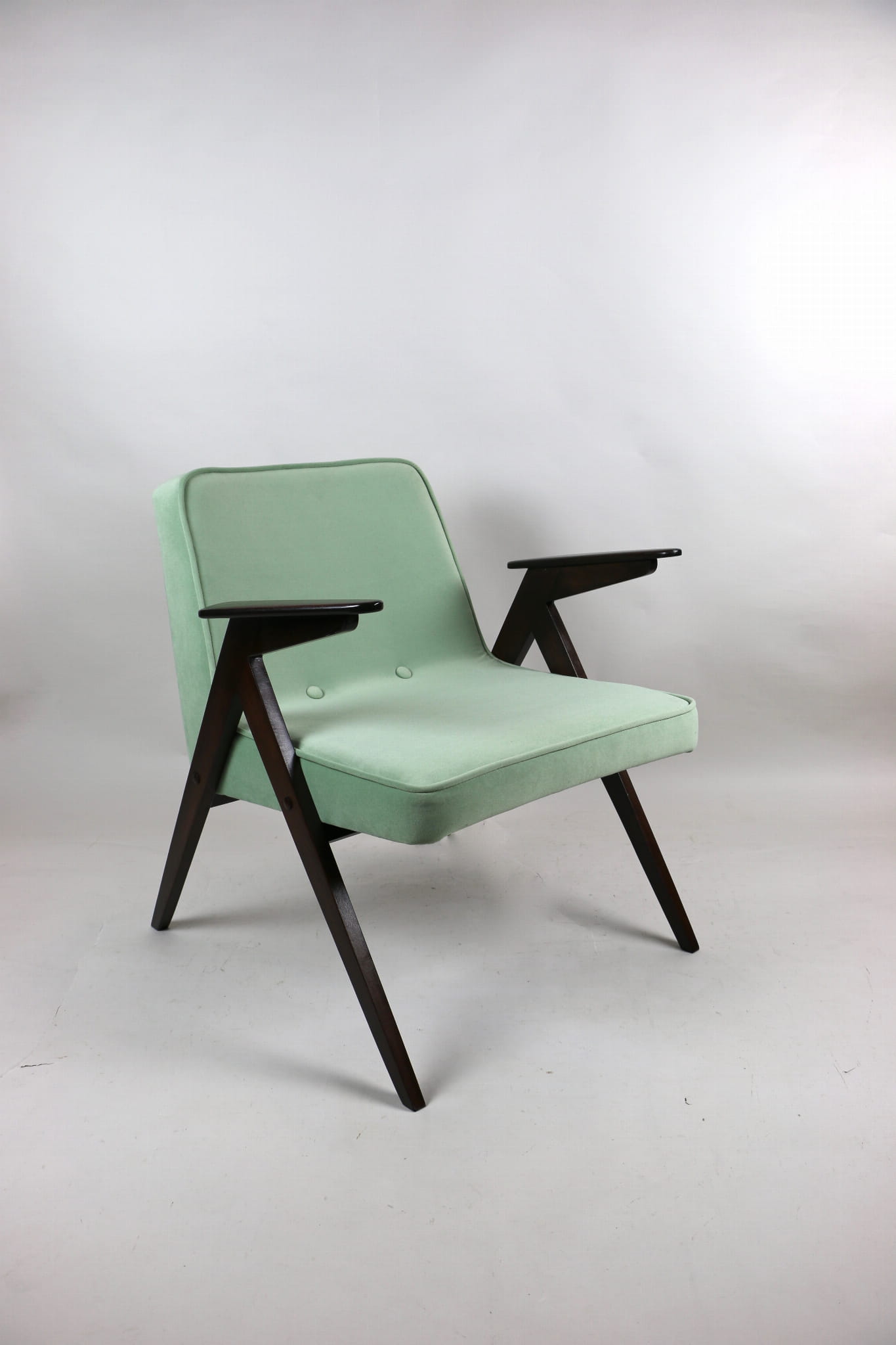 Fotel Bunny projektu Józefa Chierowskiego, który został całkowicie odrestaurowany. Nowe obicie pokryte materiałem tapicerskim w jasny-zielonym kolorze z serii Jade - kolor 501 - welwet easy to clean. Stelaż drewniany z podłokietnikami w kolorze orzechowego drewna.