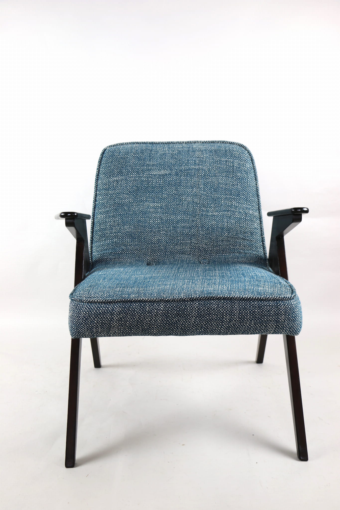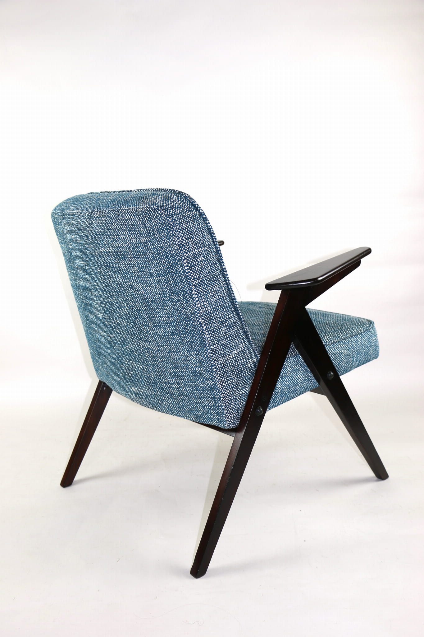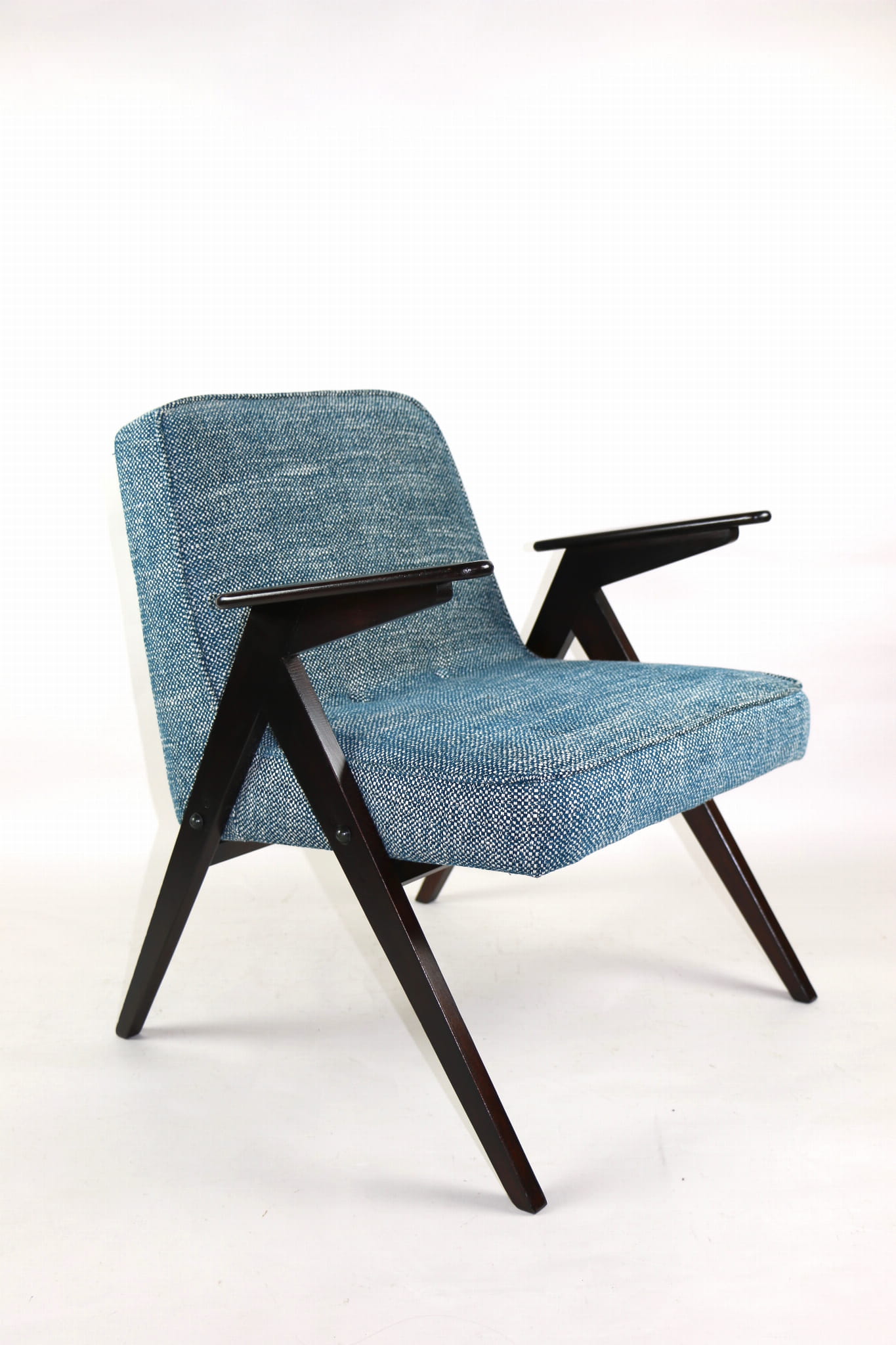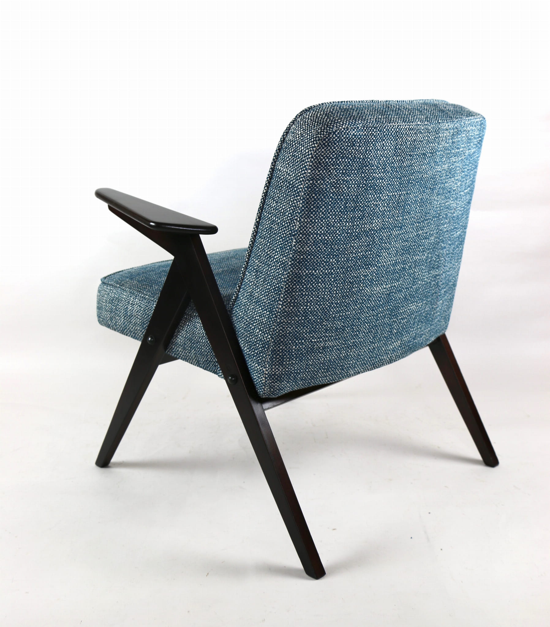 Fotel Bunny z lat 70 został całkowicie odrestaurowany. Zyskał nowe obicie pokryte naturalnym materiałem tapicerskim strukturalnym w kolorze granatowo - morskim. Stelaż drewniany z podłokietnikami w kolorze ciemnego drewna utrwalony lakierem.