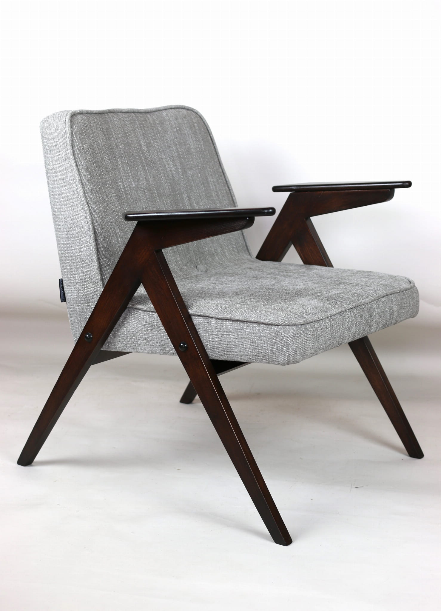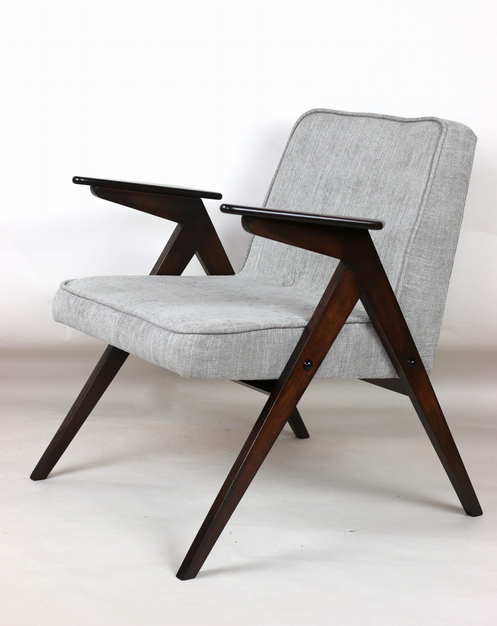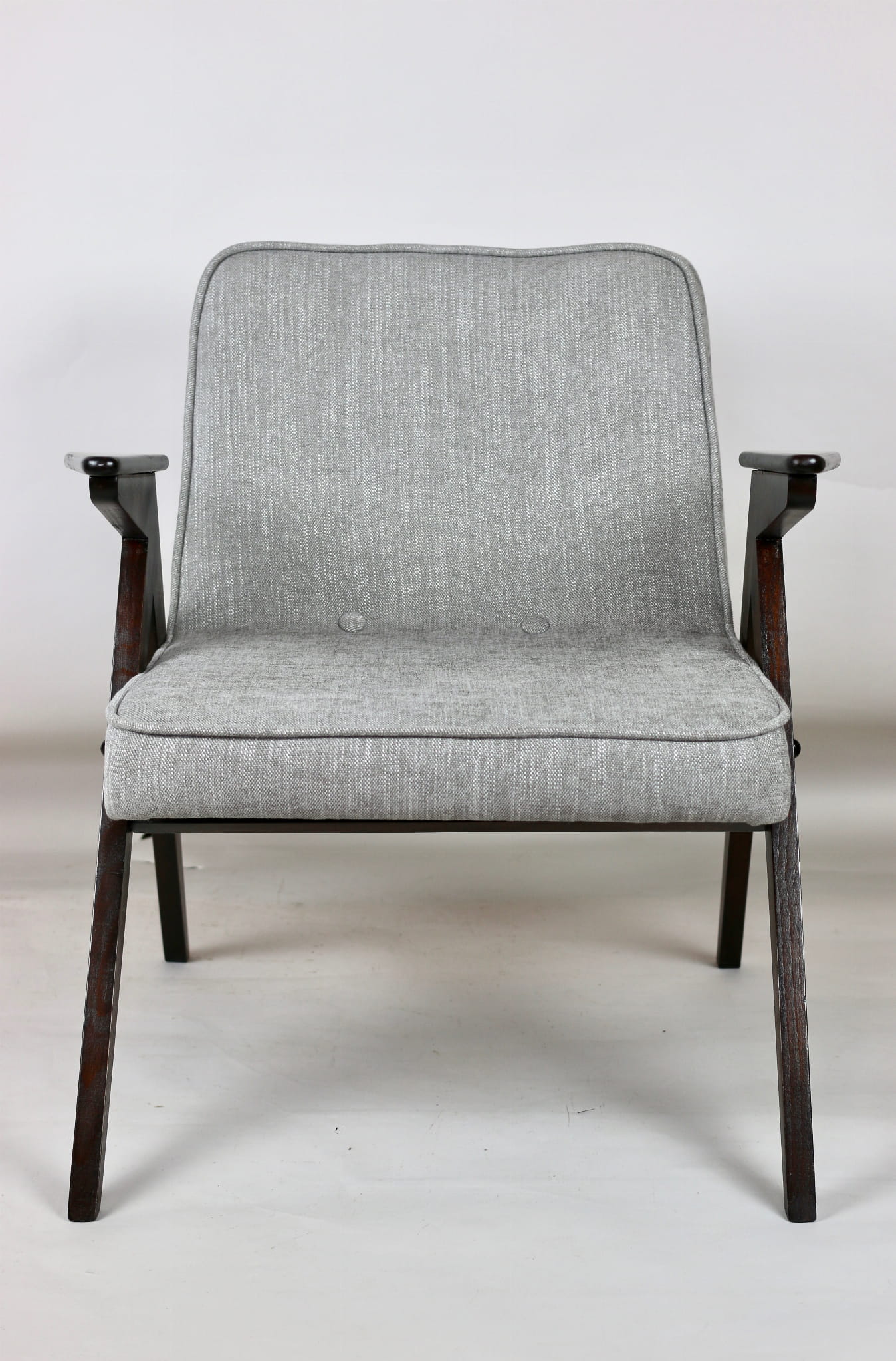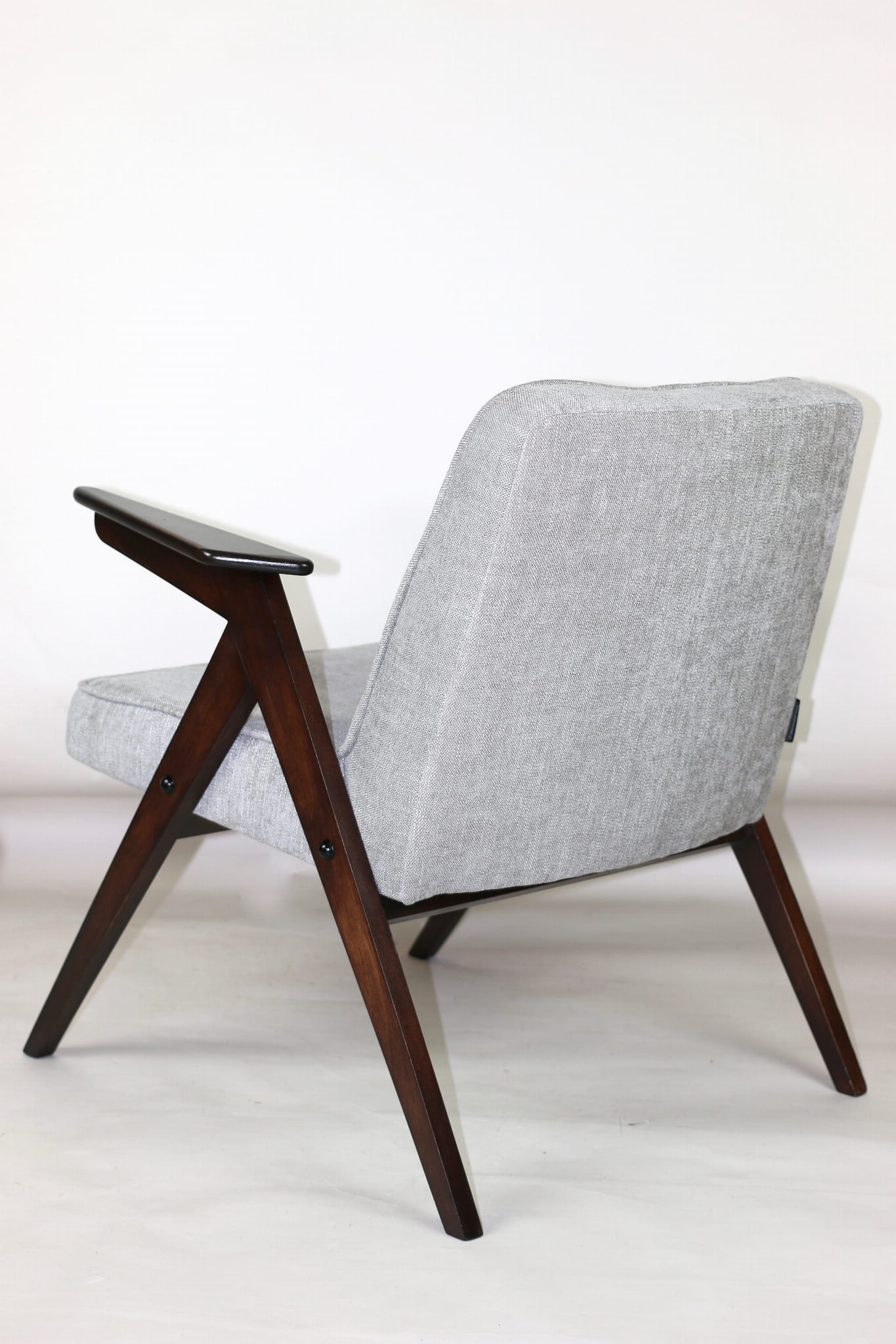 Fotel Bunny z lat 70 został całkowicie odrestaurowany. Zyskał nowe obicie pokryte strukturalnym naturalnym materiałem tapicerskim w kolorze jasno szarym / srebrnym z serii Boston. Stelaż drewniany z podłokietnikami w kolorze ciemnego drewna utrwalony lakierowoskiem.