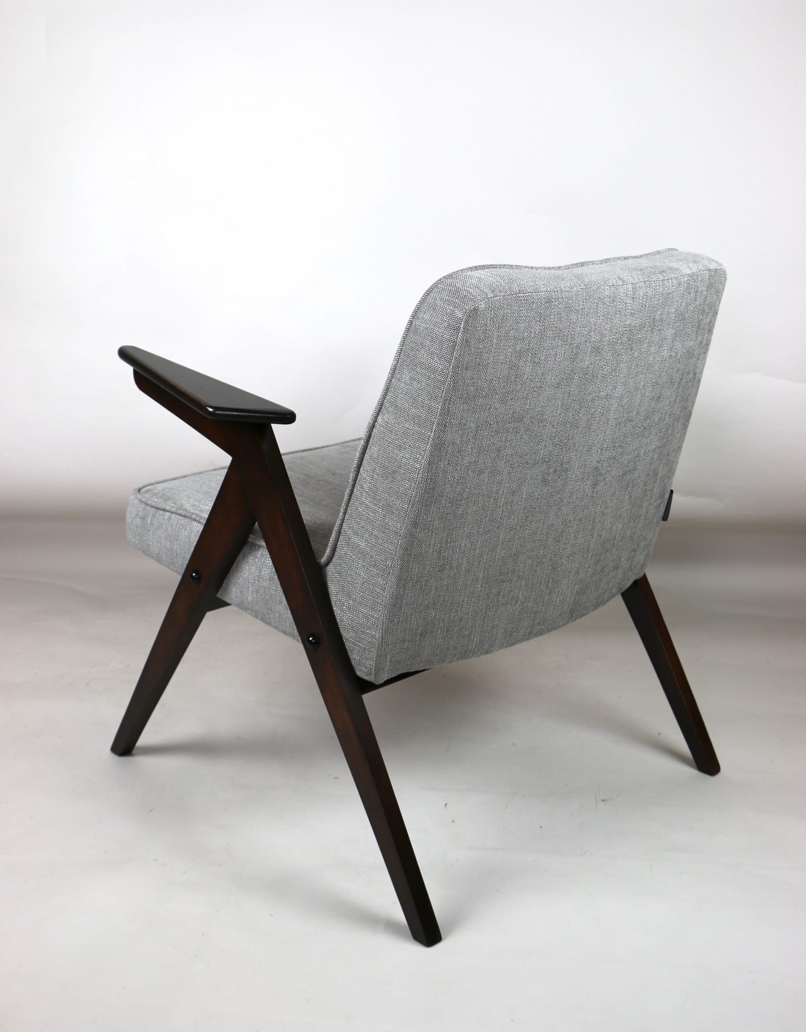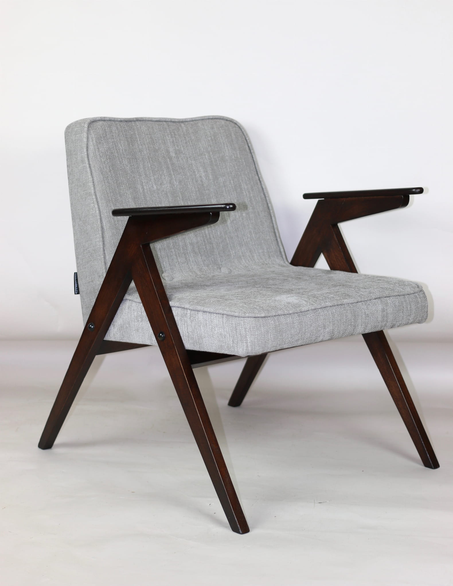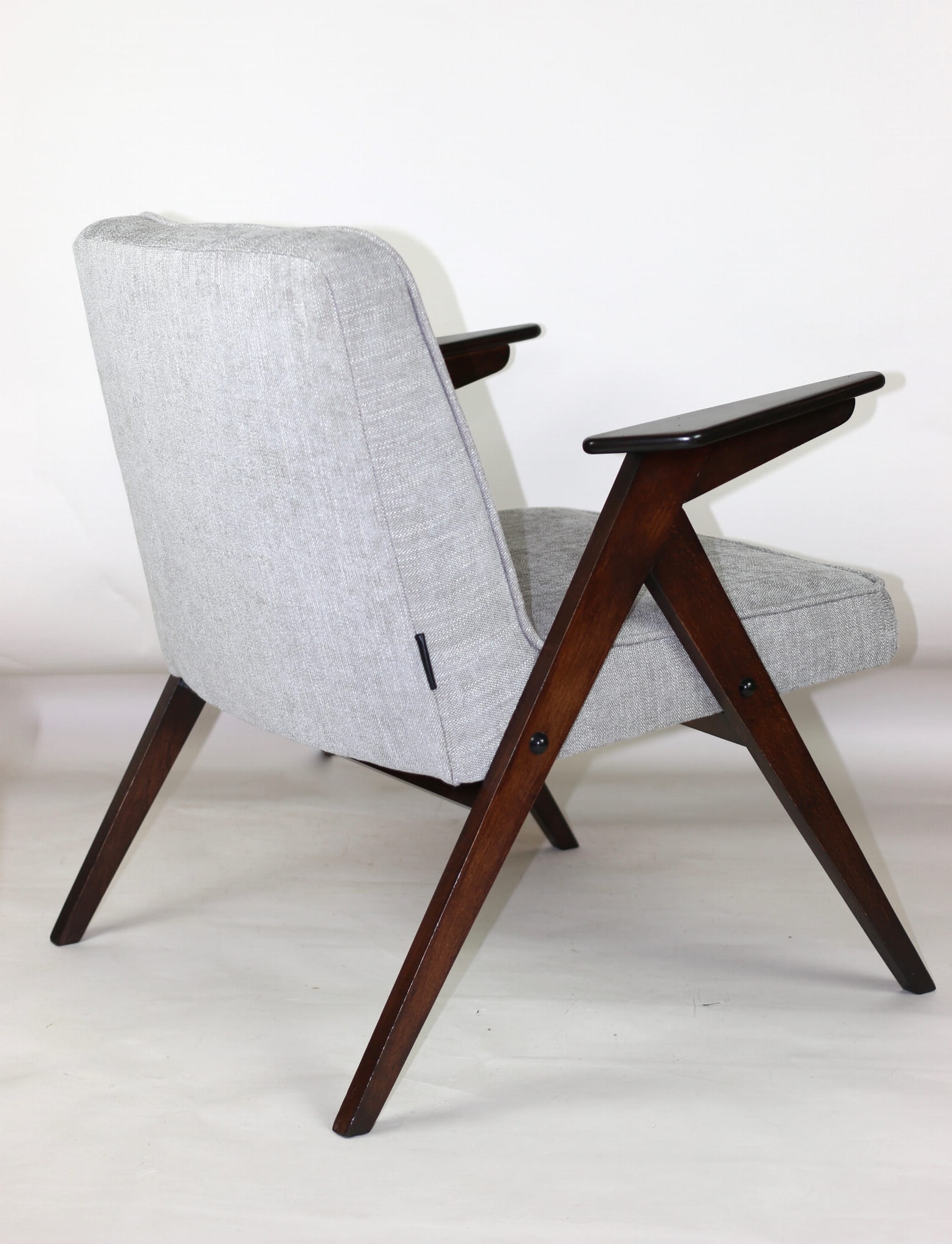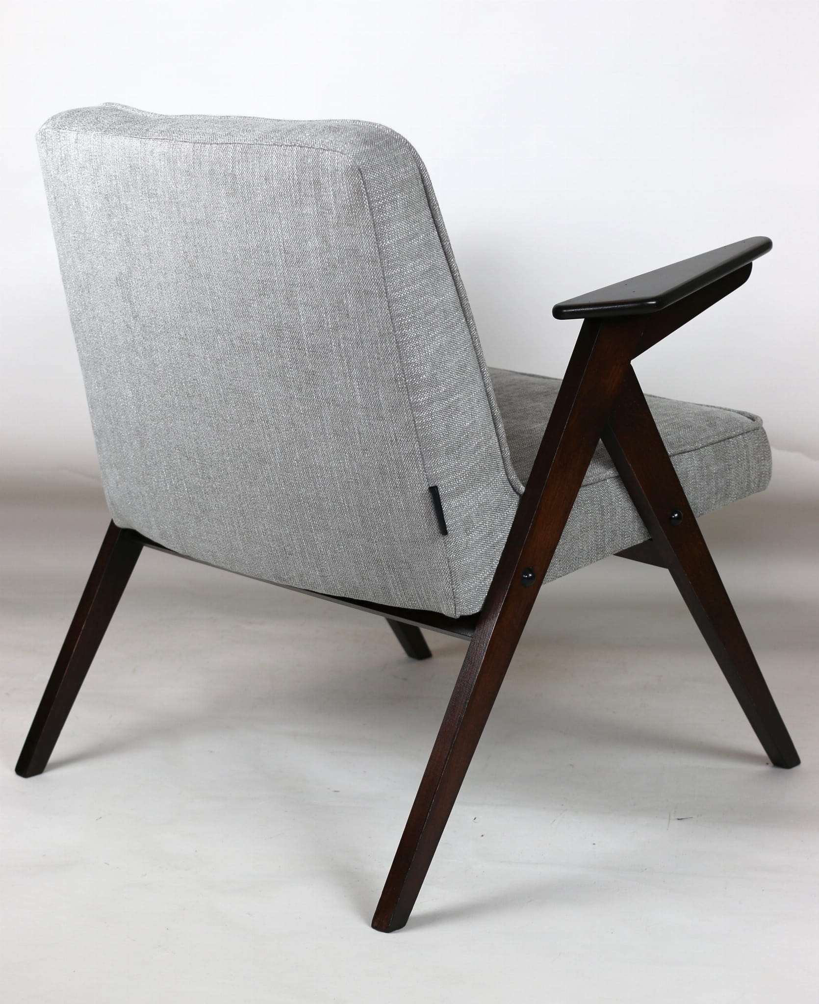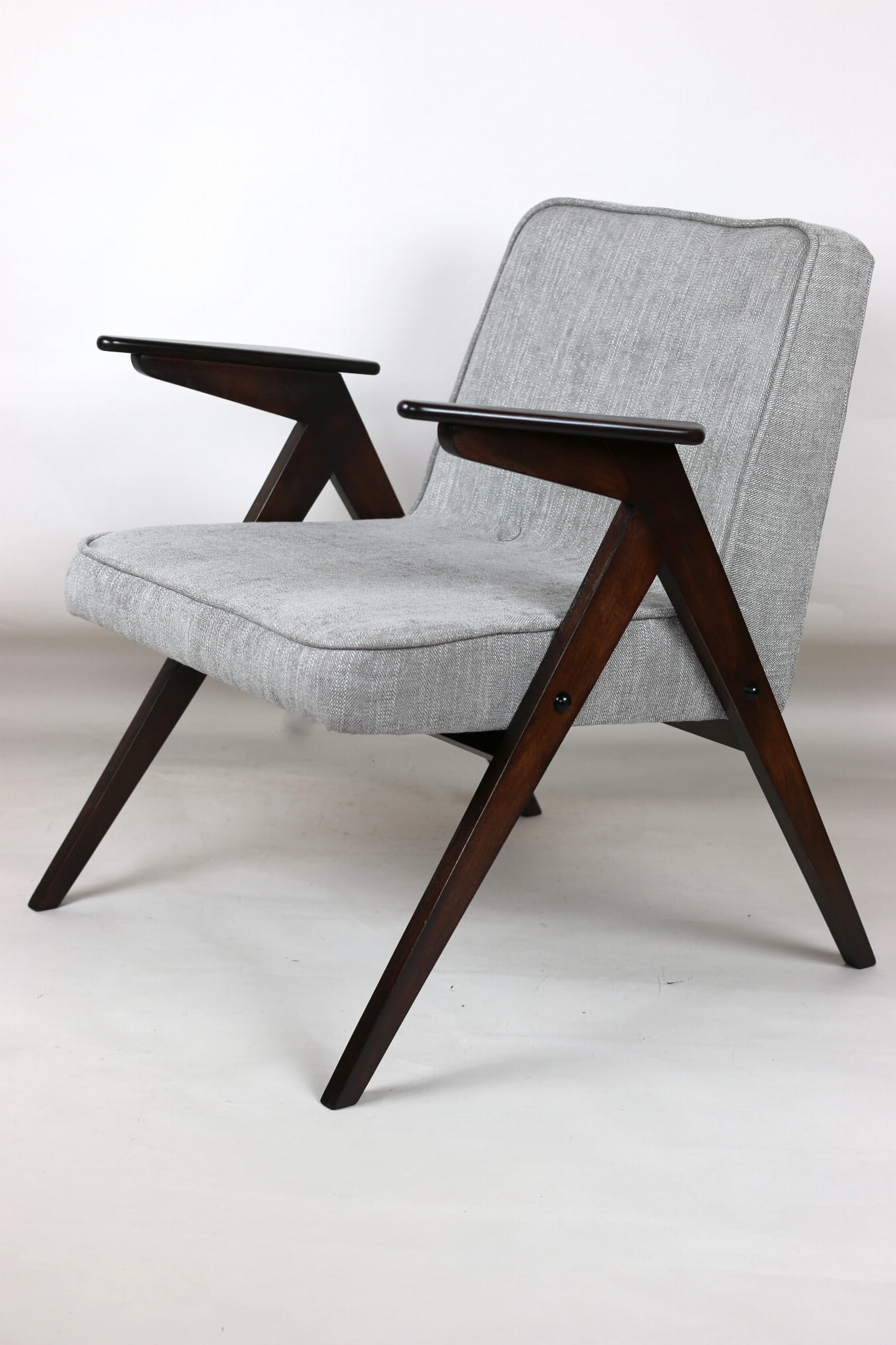 Fotel Bunny z lat 70 został całkowicie odrestaurowany. Zyskał nowe obicie pokryte strukturalnym naturalnym materiałem tapicerskim w kolorze jasno szarym / srebrnym z serii Boston. Stelaż drewniany z podłokietnikami w kolorze ciemnego drewna utrwalony lakierowoskiem.