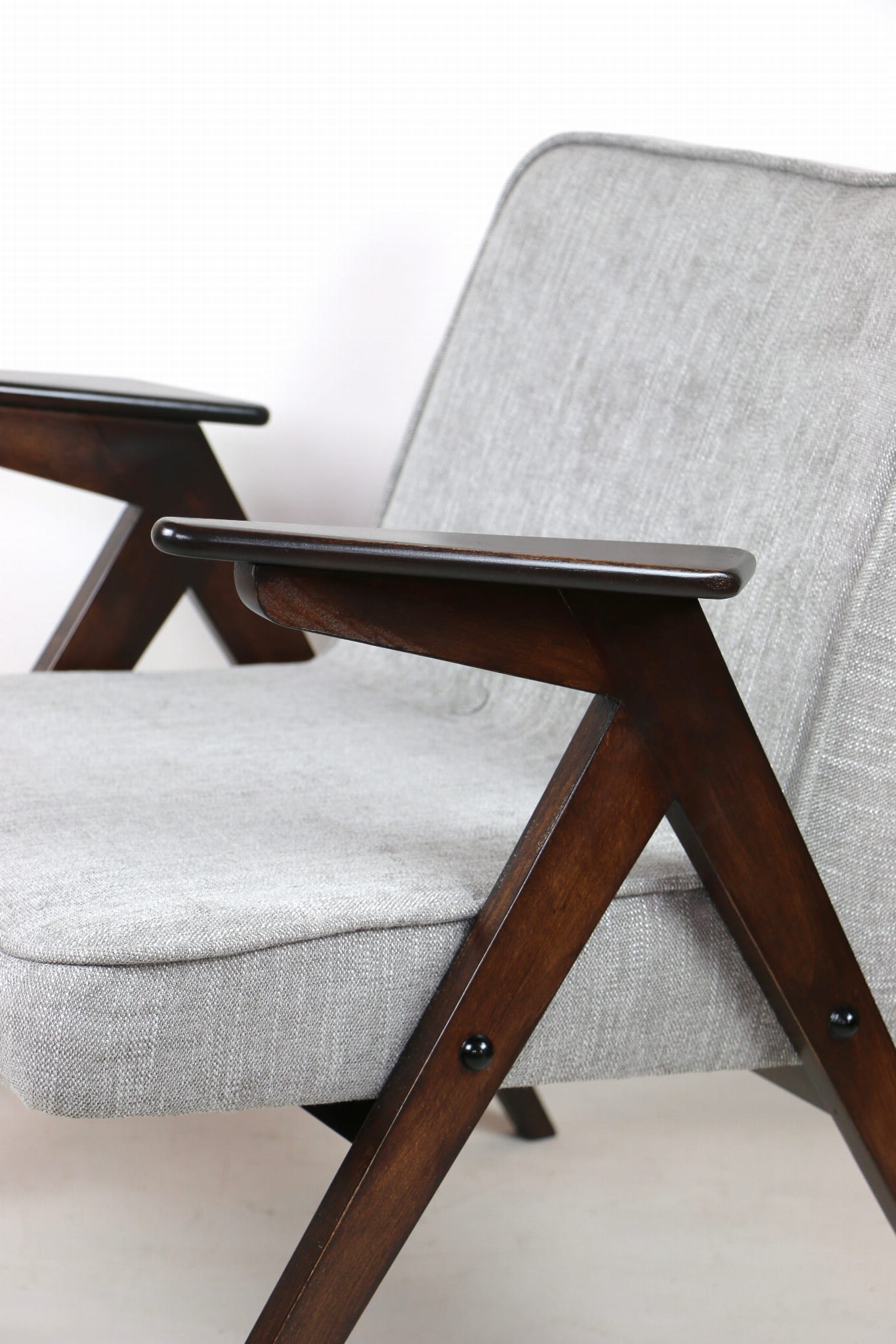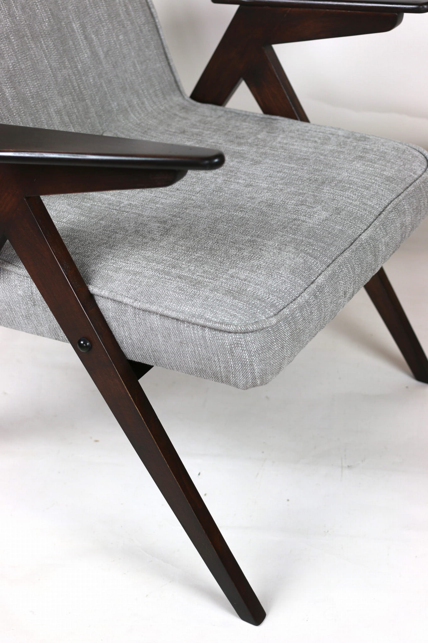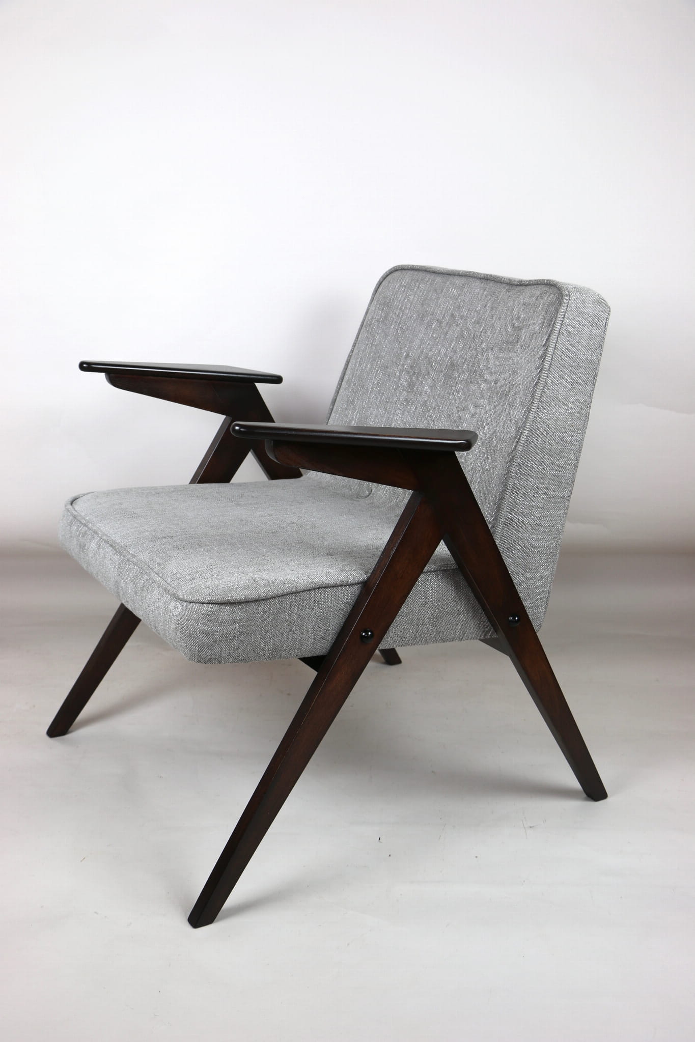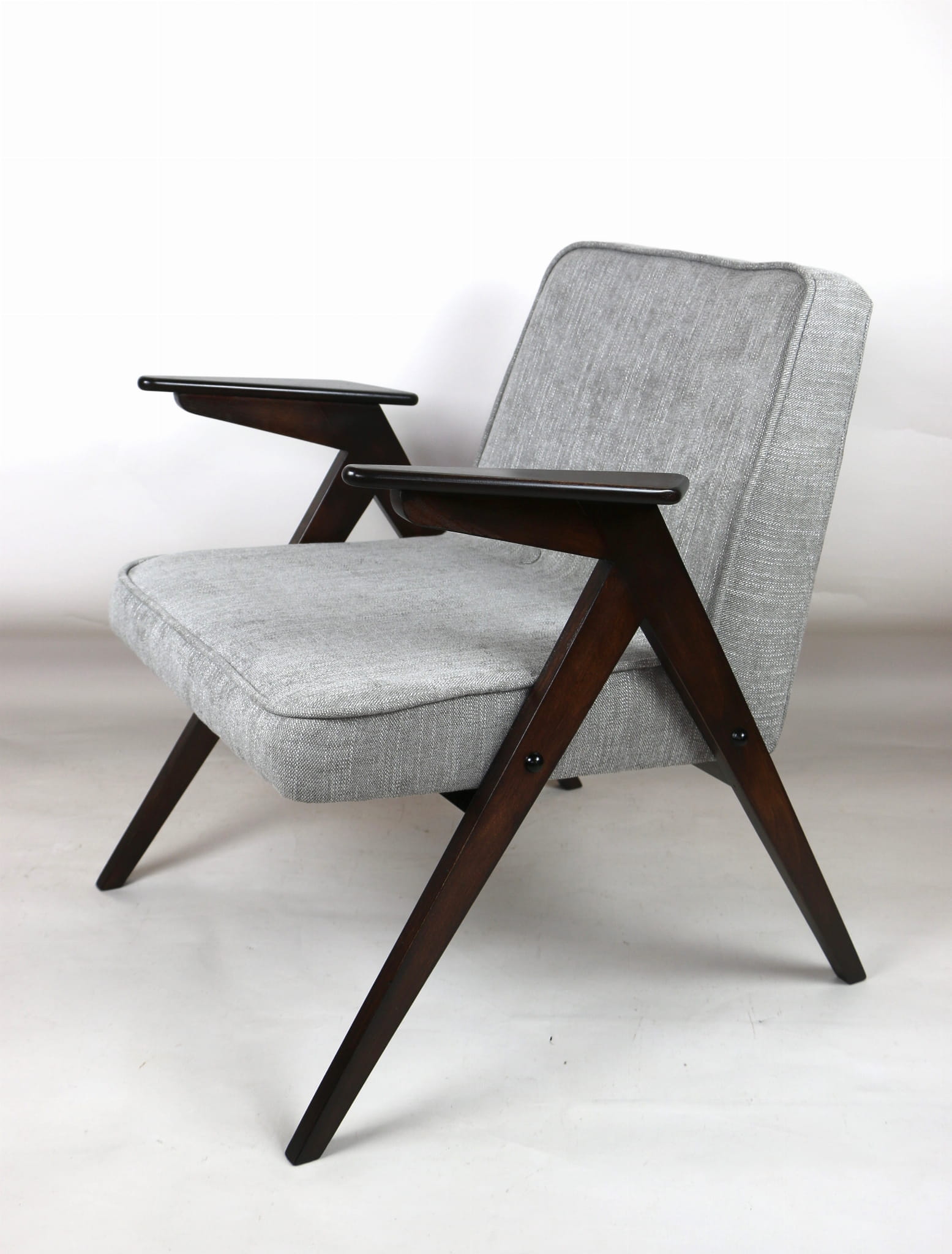 Fotel Bunny z lat 70 został całkowicie odrestaurowany. Zyskał nowe obicie pokryte strukturalnym naturalnym materiałem tapicerskim w kolorze jasno szarym / srebrnym z serii Boston. Stelaż drewniany z podłokietnikami w kolorze ciemnego drewna utrwalony lakierowoskiem.