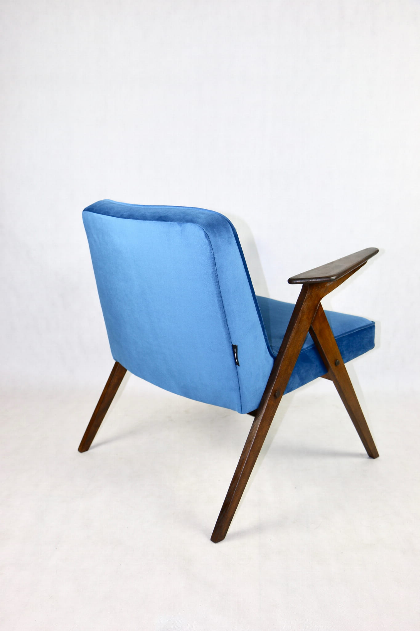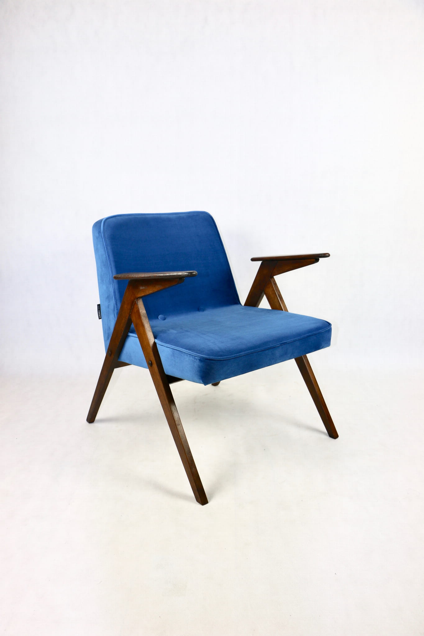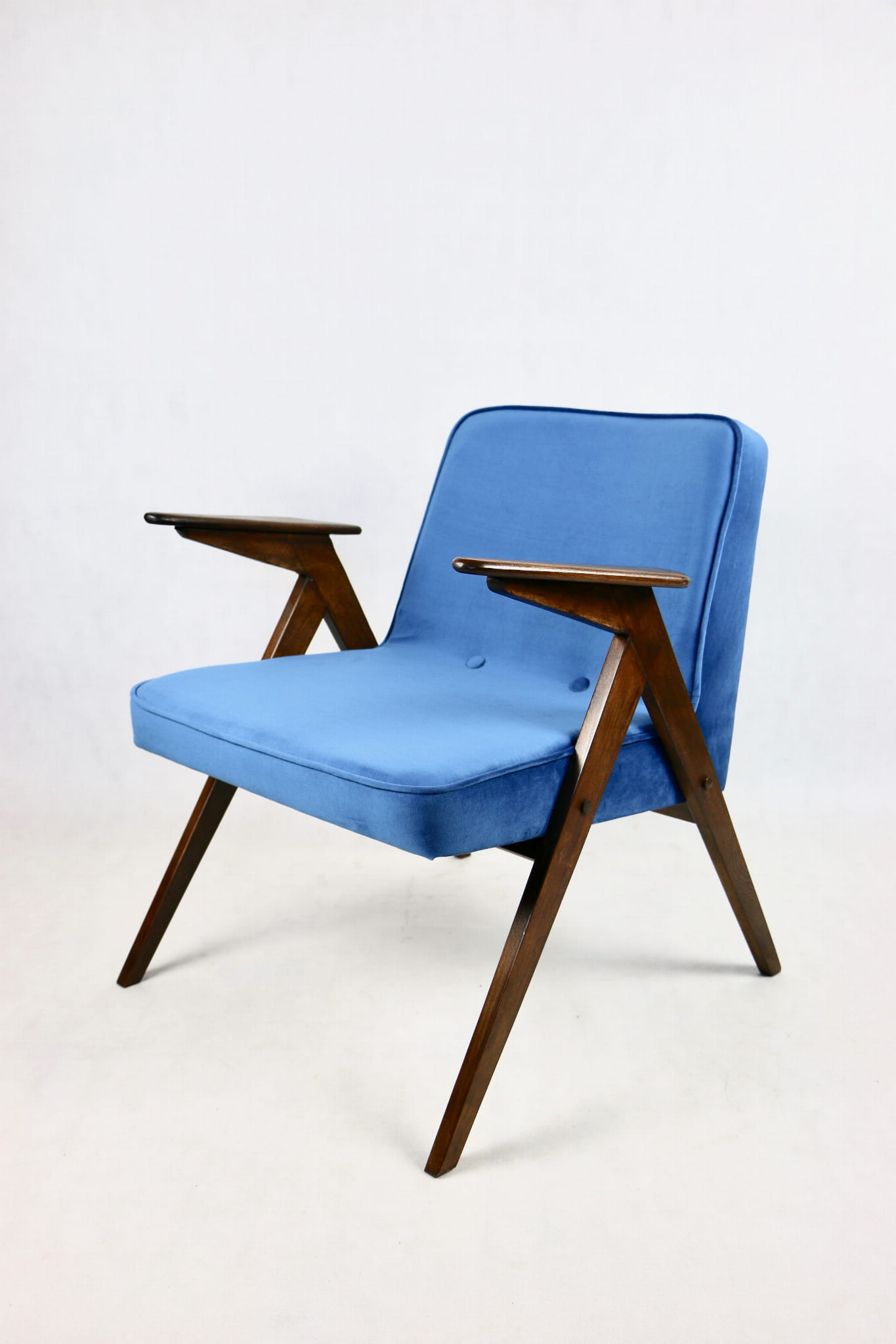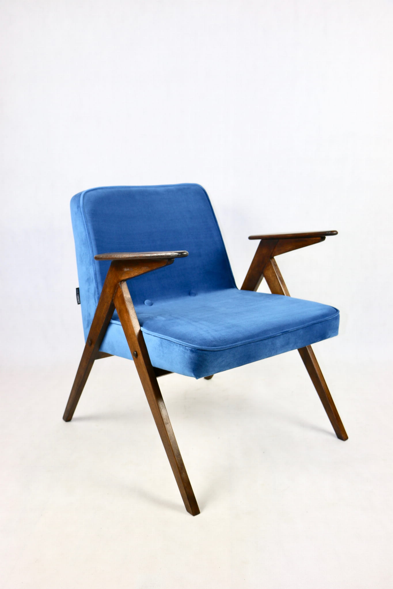Fotel Bunny projektu Józefa Chierowskiego, który został całkowicie odrestaurowany. Nowe obicie pokryte materiałem tapicerskim w niebieskim kolorze z serii Paris - kolor Ocean. Stelaż drewniany z podłokietnikami w kolorze ciemnego drewna został polakierowany lakierobejcą.