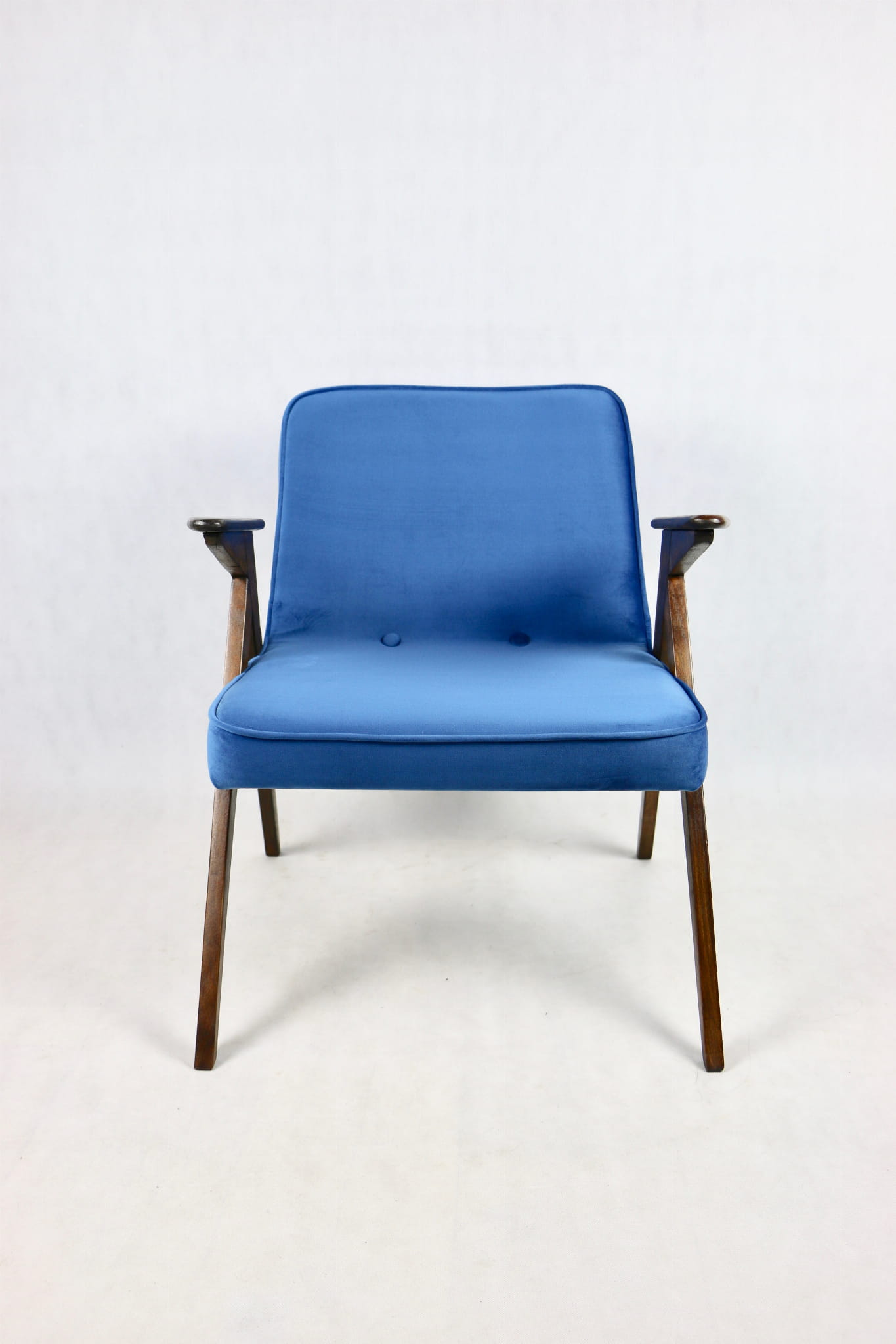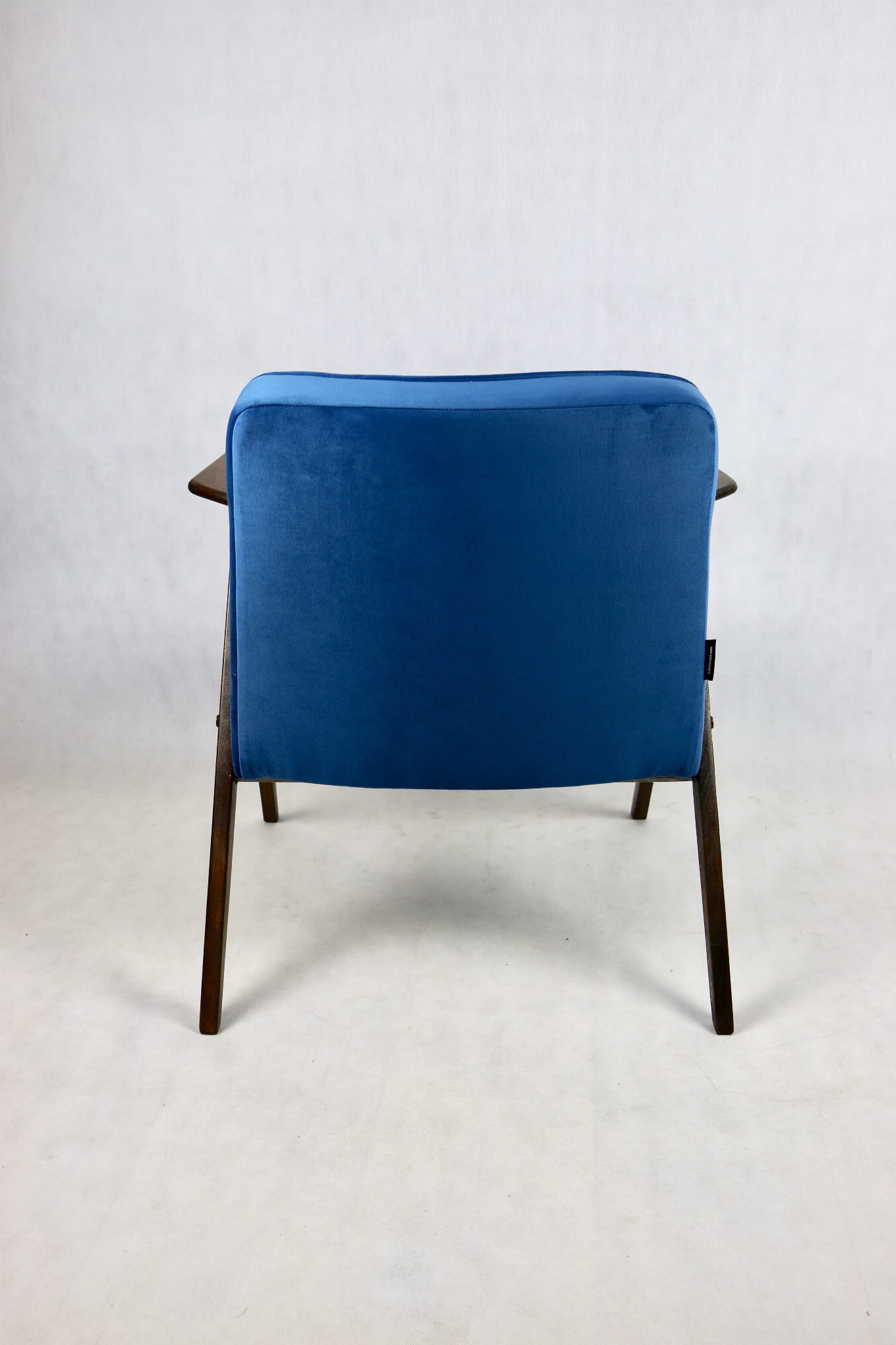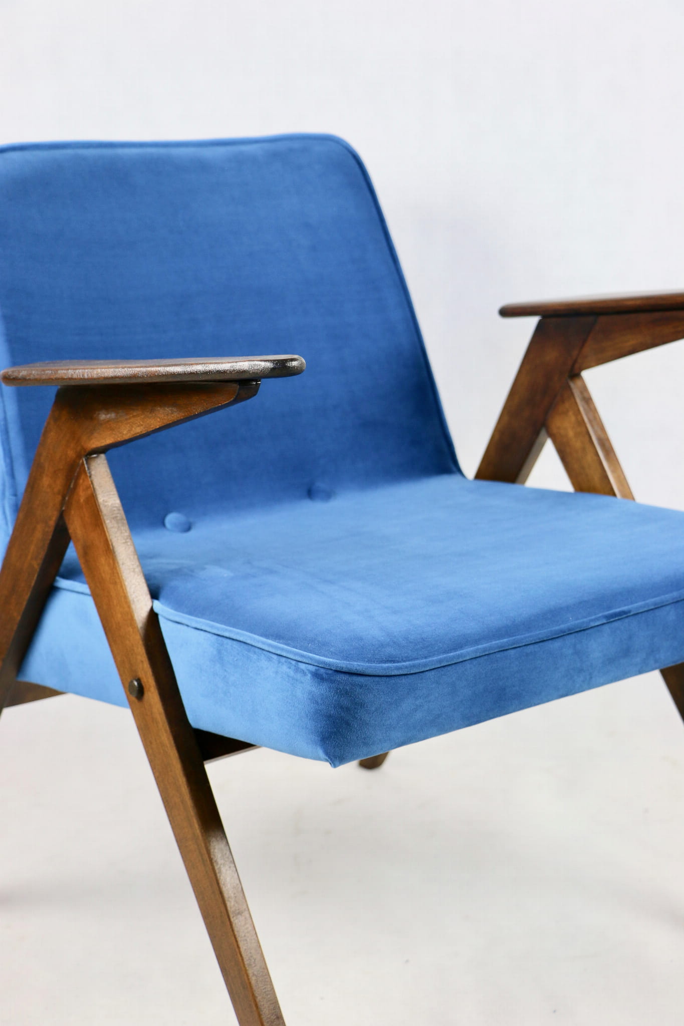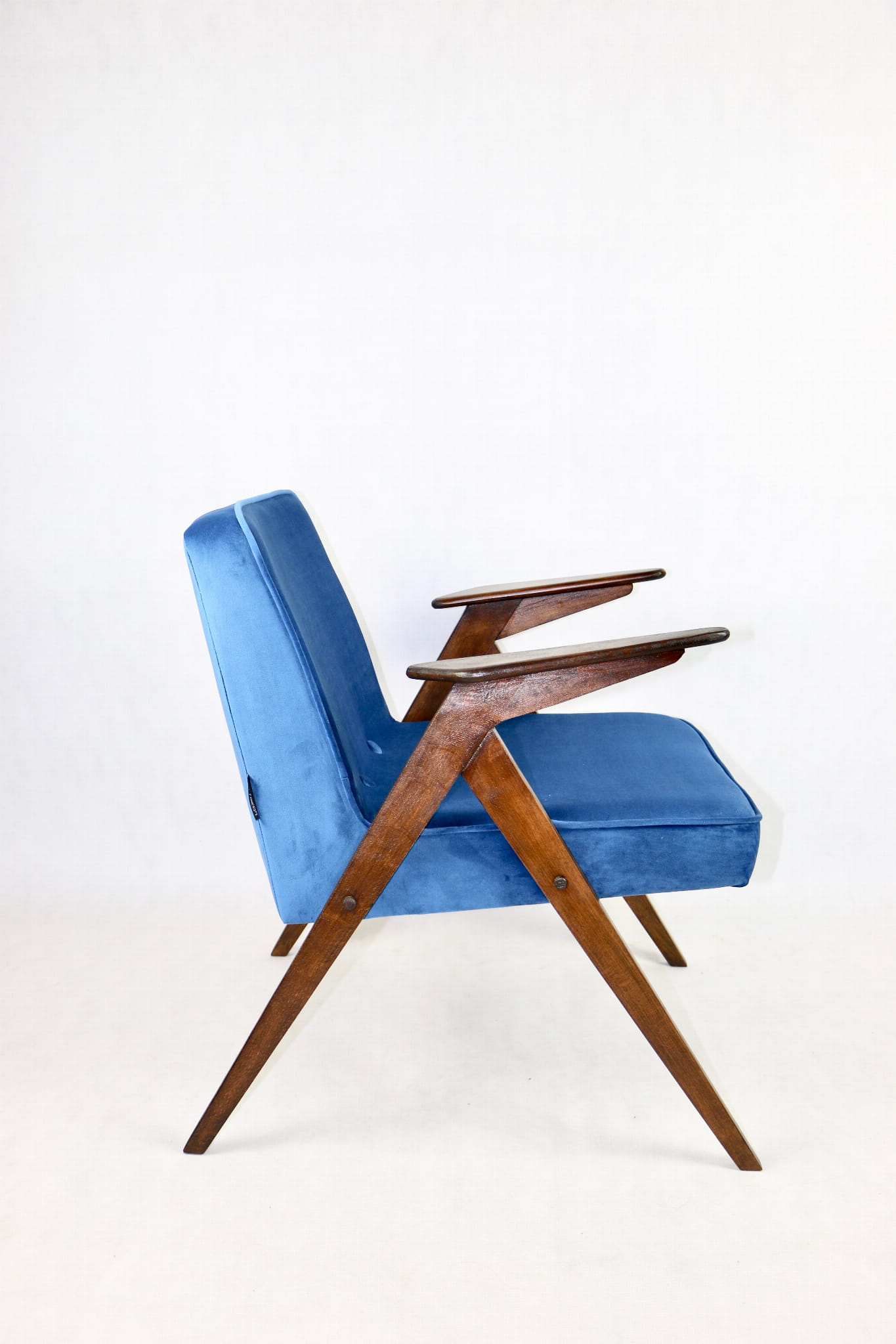 Fotel Bunny projektu Józefa Chierowskiego, który został całkowicie odrestaurowany. Nowe obicie pokryte materiałem tapicerskim w niebieskim kolorze z serii Paris - kolor Ocean. Stelaż drewniany z podłokietnikami w kolorze ciemnego drewna został polakierowany lakierobejcą.