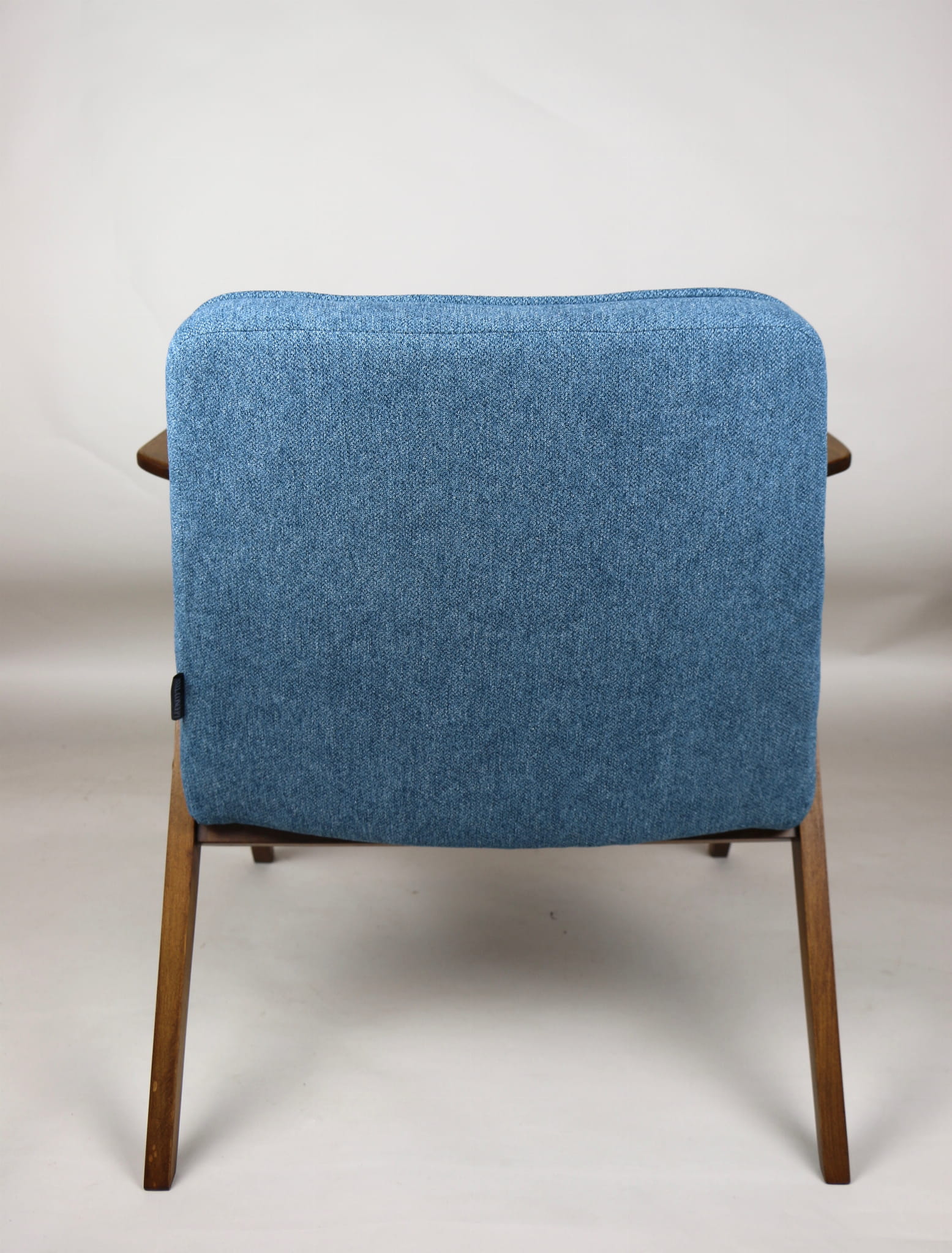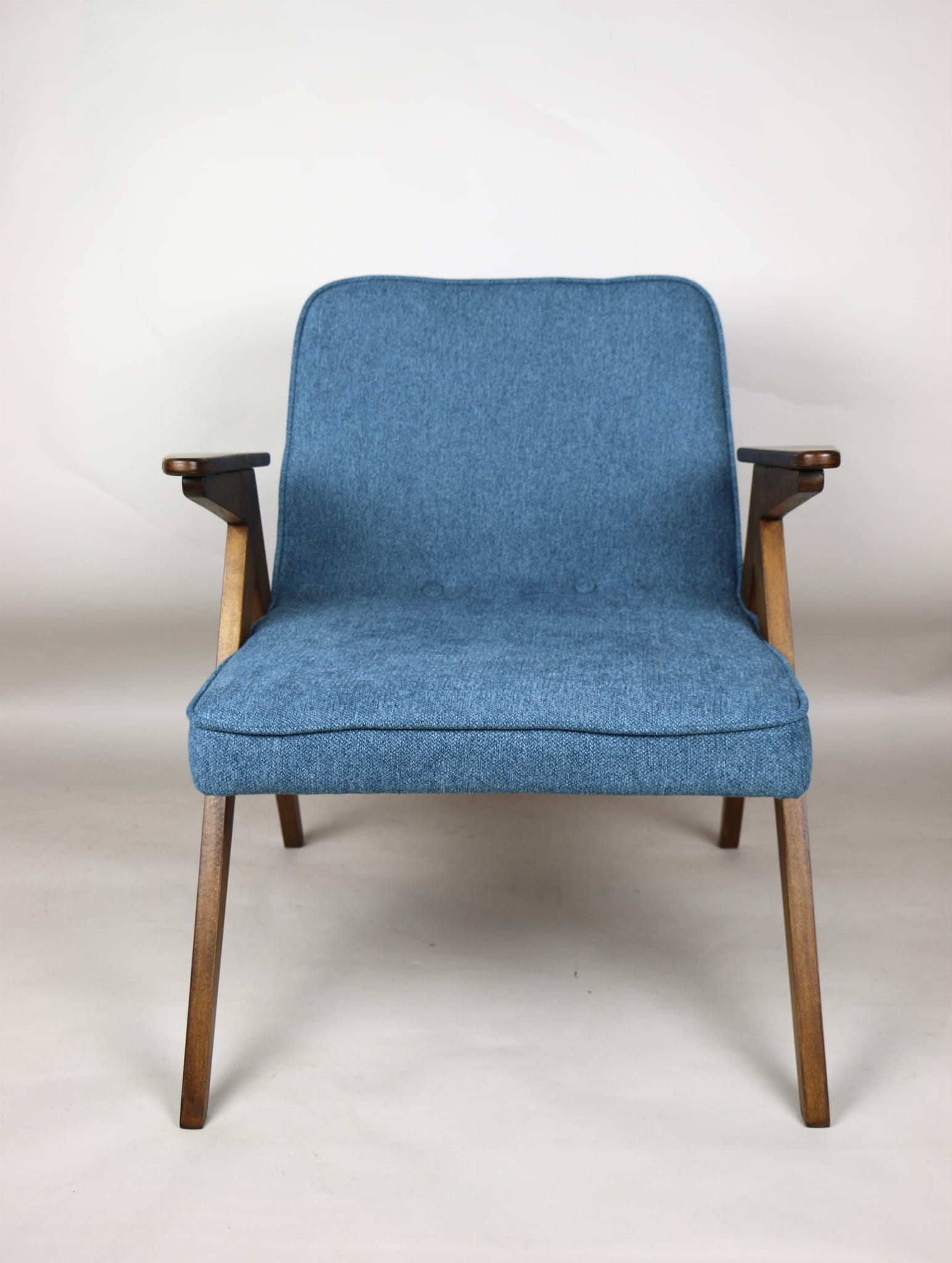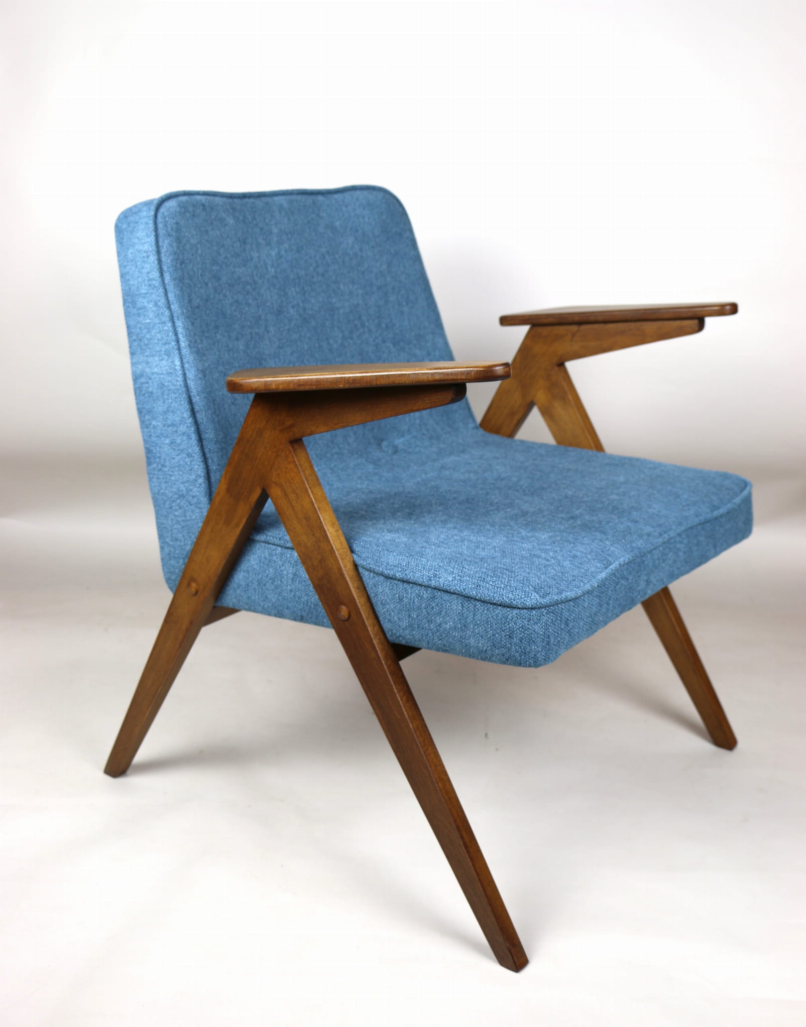 Fotel Bunny projektu Józefa Chierowskiego, który został całkowicie odrestaurowany. Nowe obicie pokryte strukturalnym materiałem tapicerskim w niebieskim kolorze z serii Queens. Stelaż drewniany z podłokietnikami w kolorze orzechowego drewna.