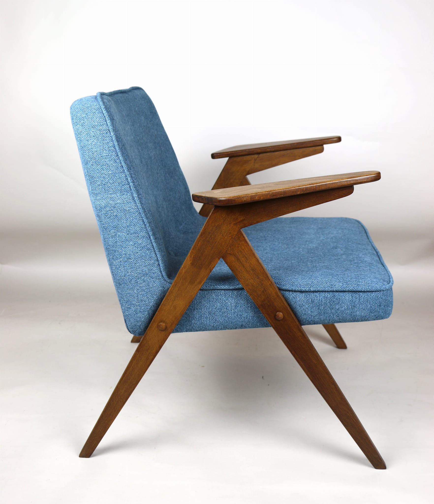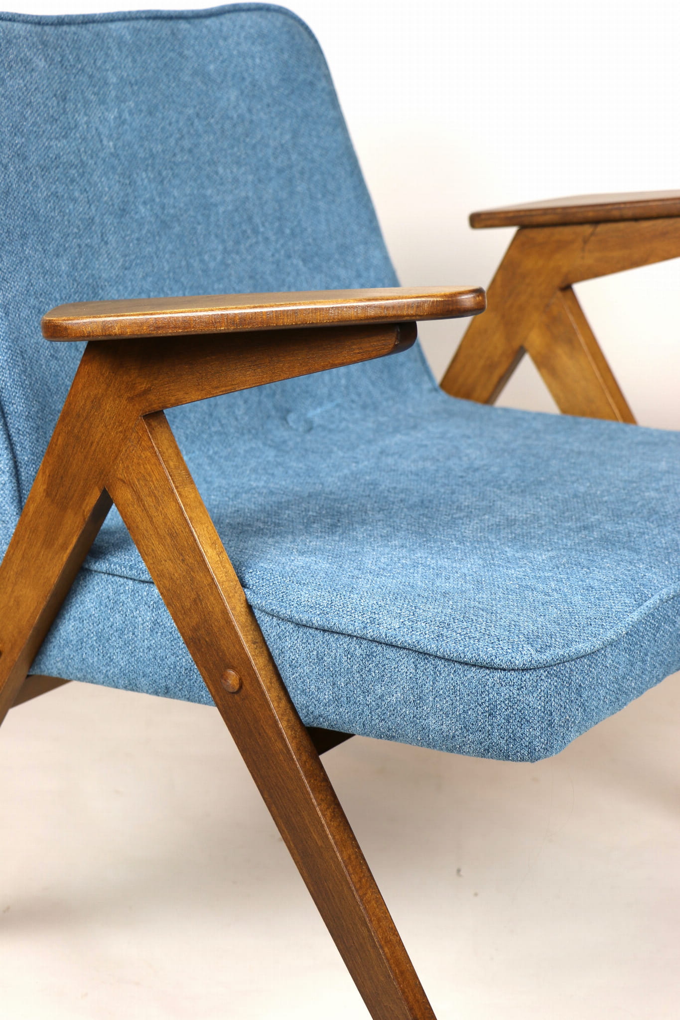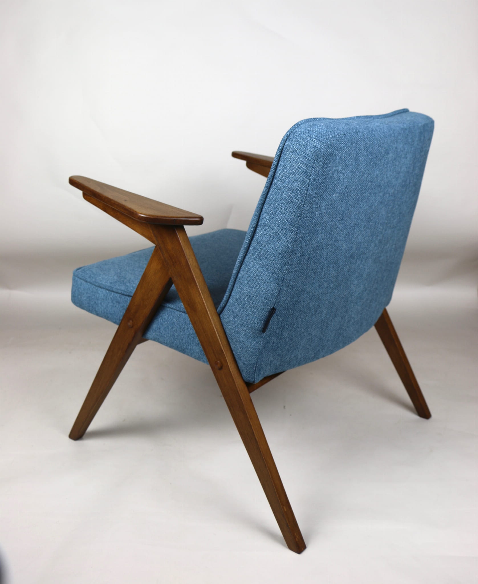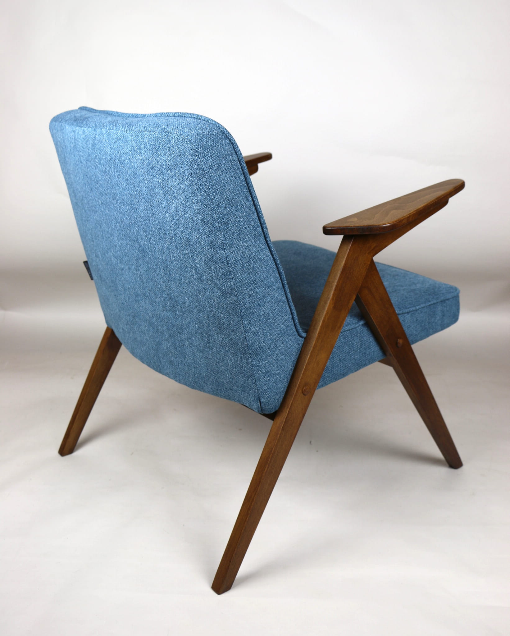 Fotel Bunny projektu Józefa Chierowskiego, który został całkowicie odrestaurowany. Nowe obicie pokryte strukturalnym materiałem tapicerskim w niebieskim kolorze z serii Queens. Stelaż drewniany z podłokietnikami w kolorze orzechowego drewna.