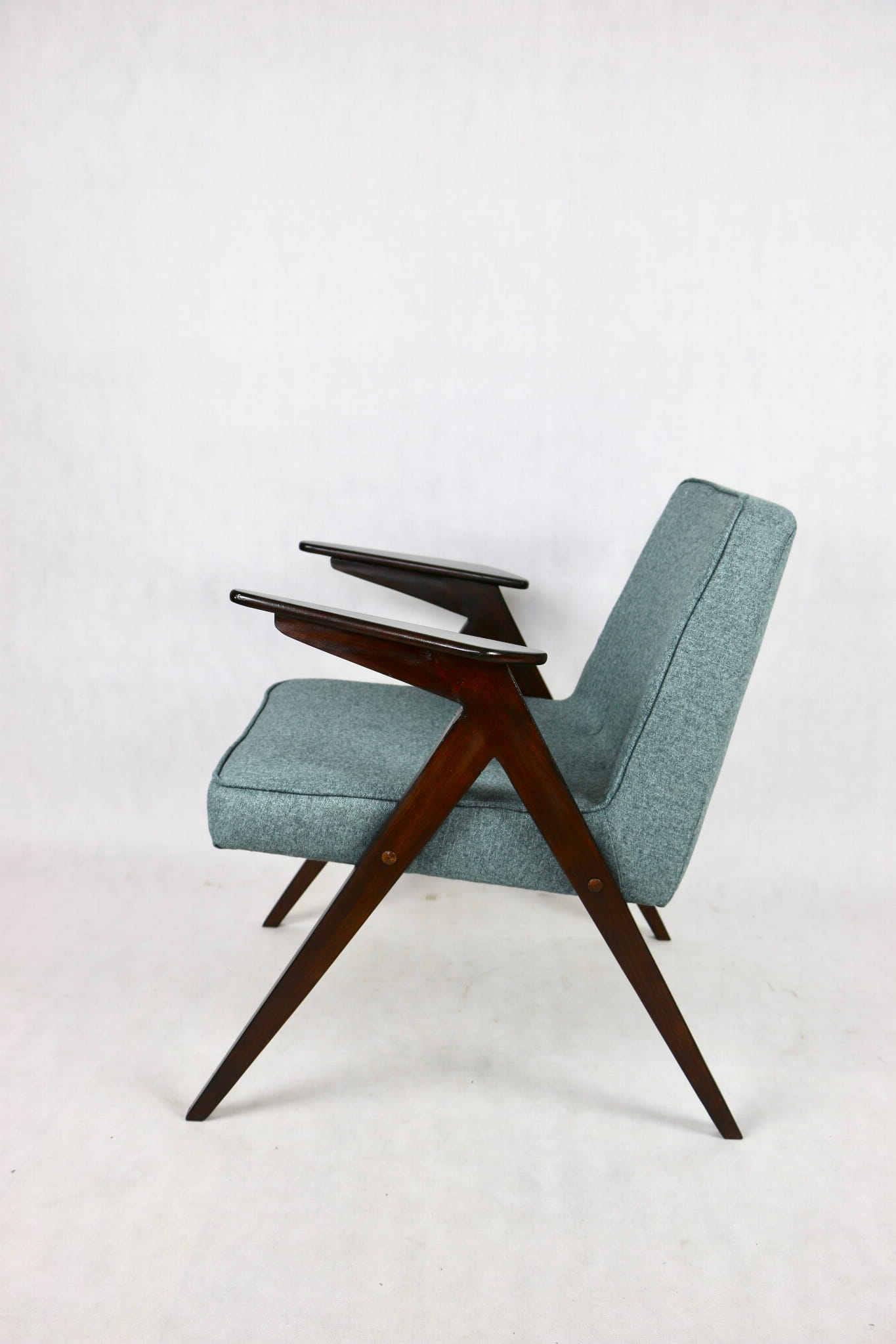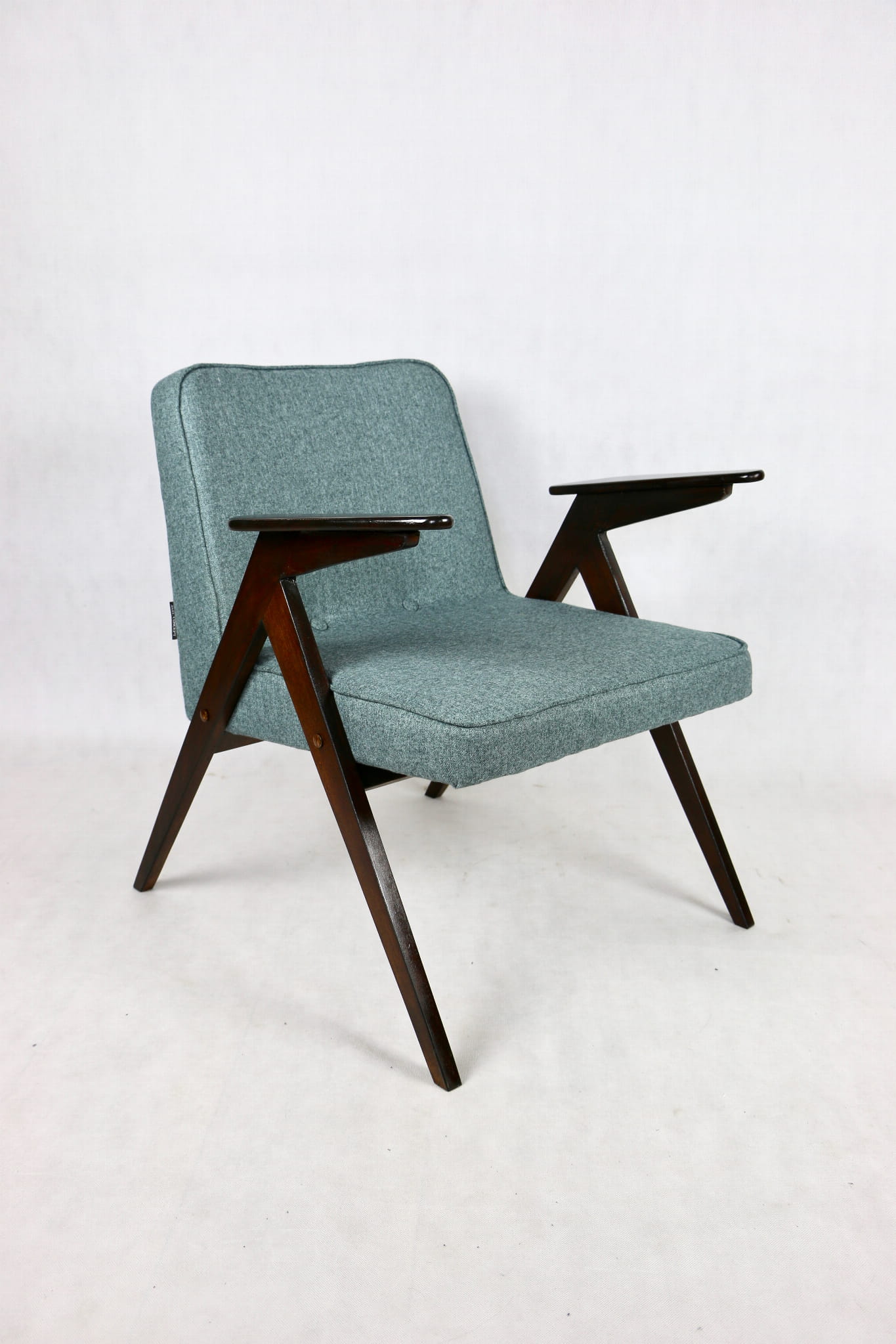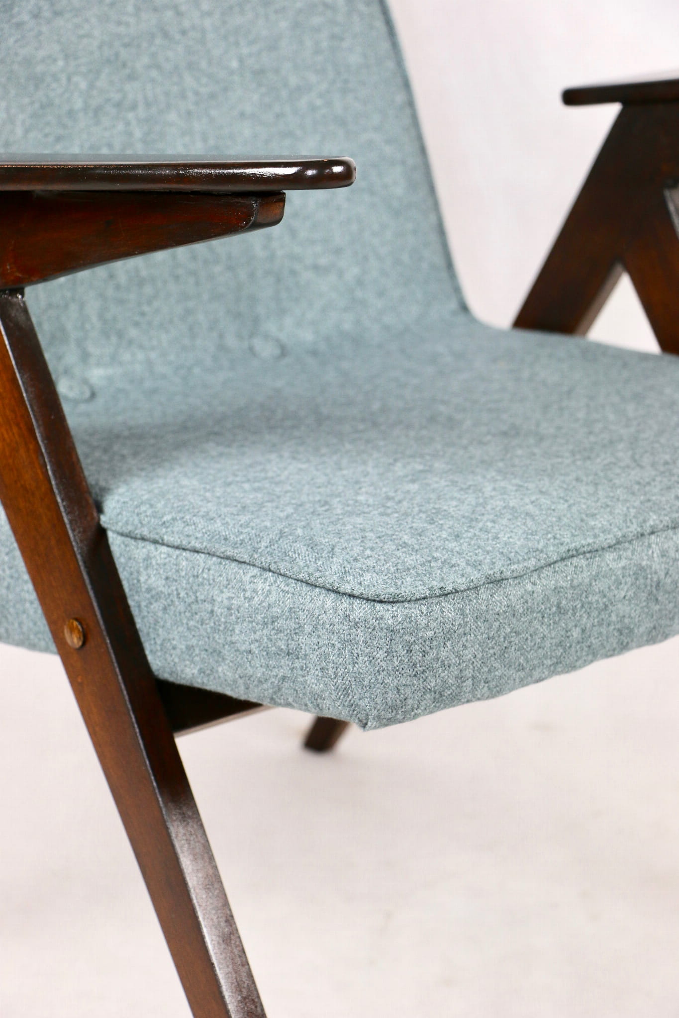 Fotel Bunny projektu Józefa Chierowskiego, który został całkowicie odrestaurowany. Nowe obicie pokryte materiałem tapicerskim w turkusowym - niebieskim kolorze z serii Tweed. Stelaż drewniany z podłokietnikami w kolorze ciemnego drewna został polakierowany lakierobejcą.