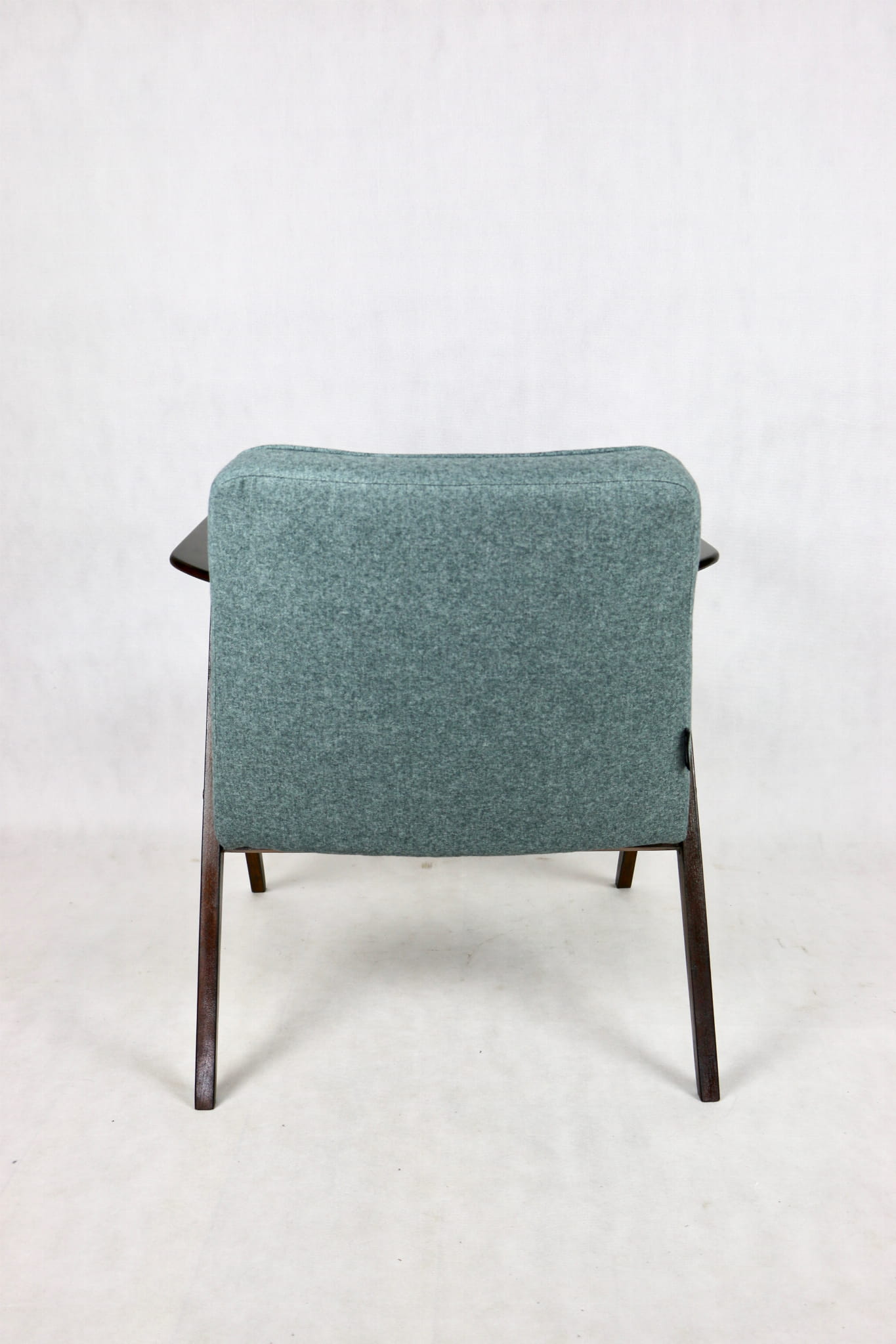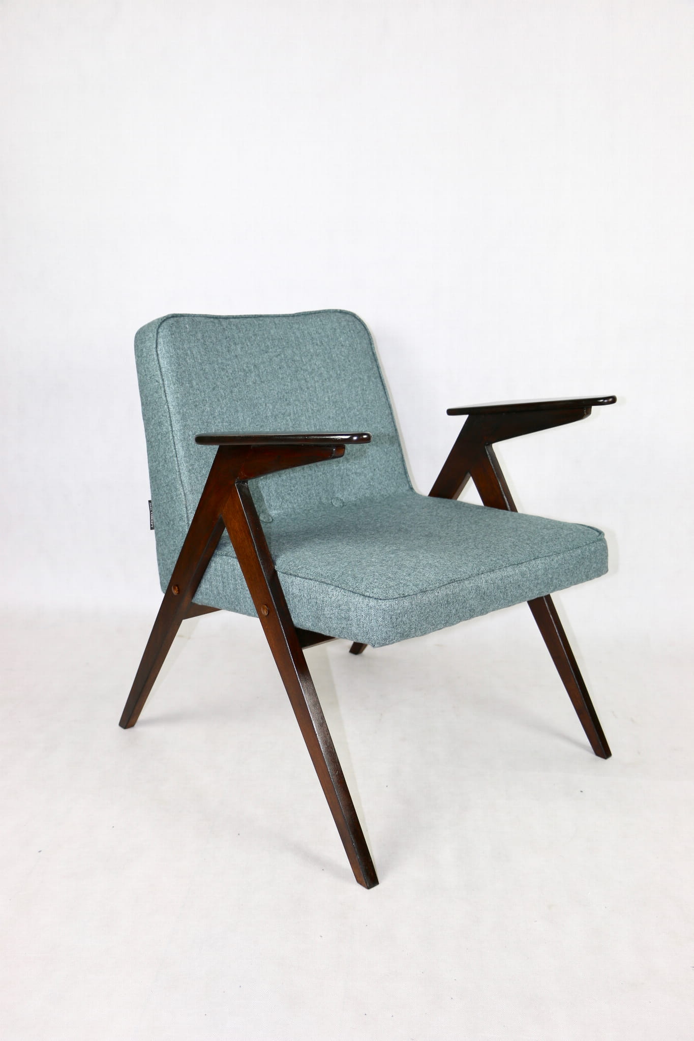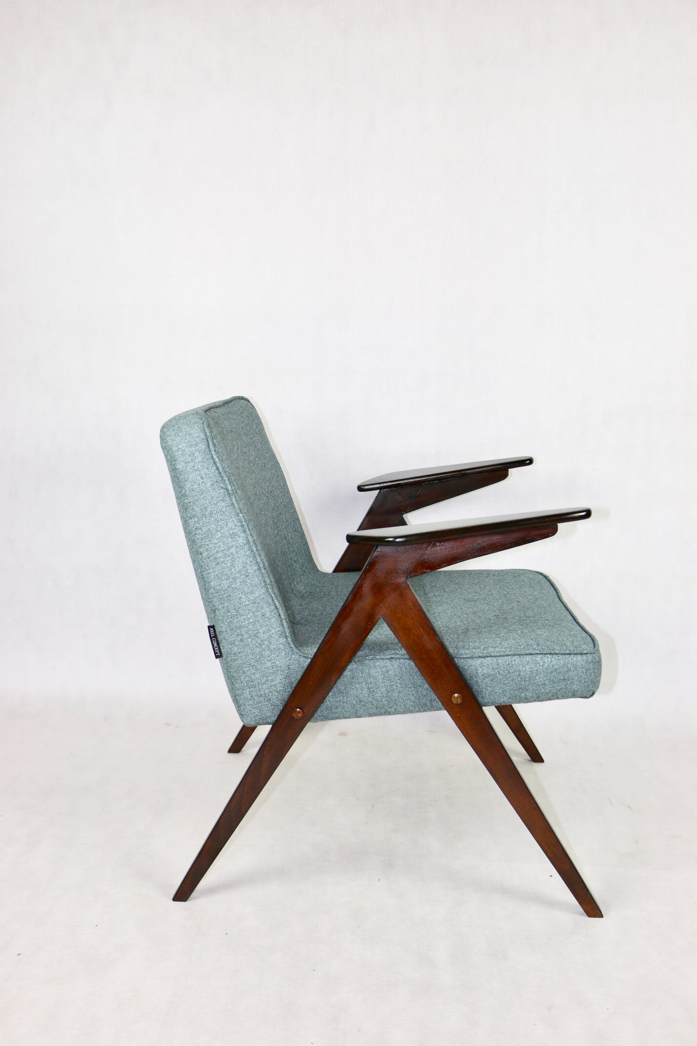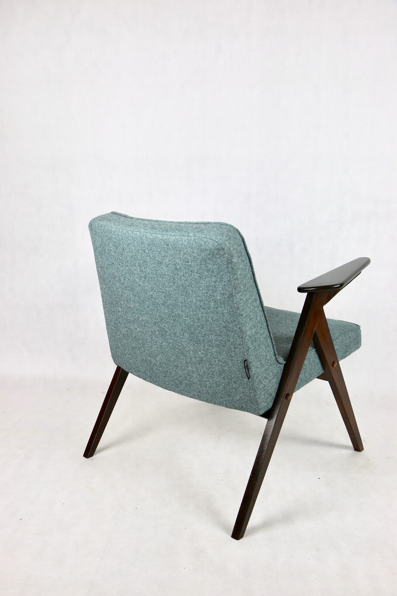 Fotel Bunny projektu Józefa Chierowskiego, który został całkowicie odrestaurowany. Nowe obicie pokryte materiałem tapicerskim w turkusowym - niebieskim kolorze z serii Tweed. Stelaż drewniany z podłokietnikami w kolorze ciemnego drewna został polakierowany lakierobejcą.