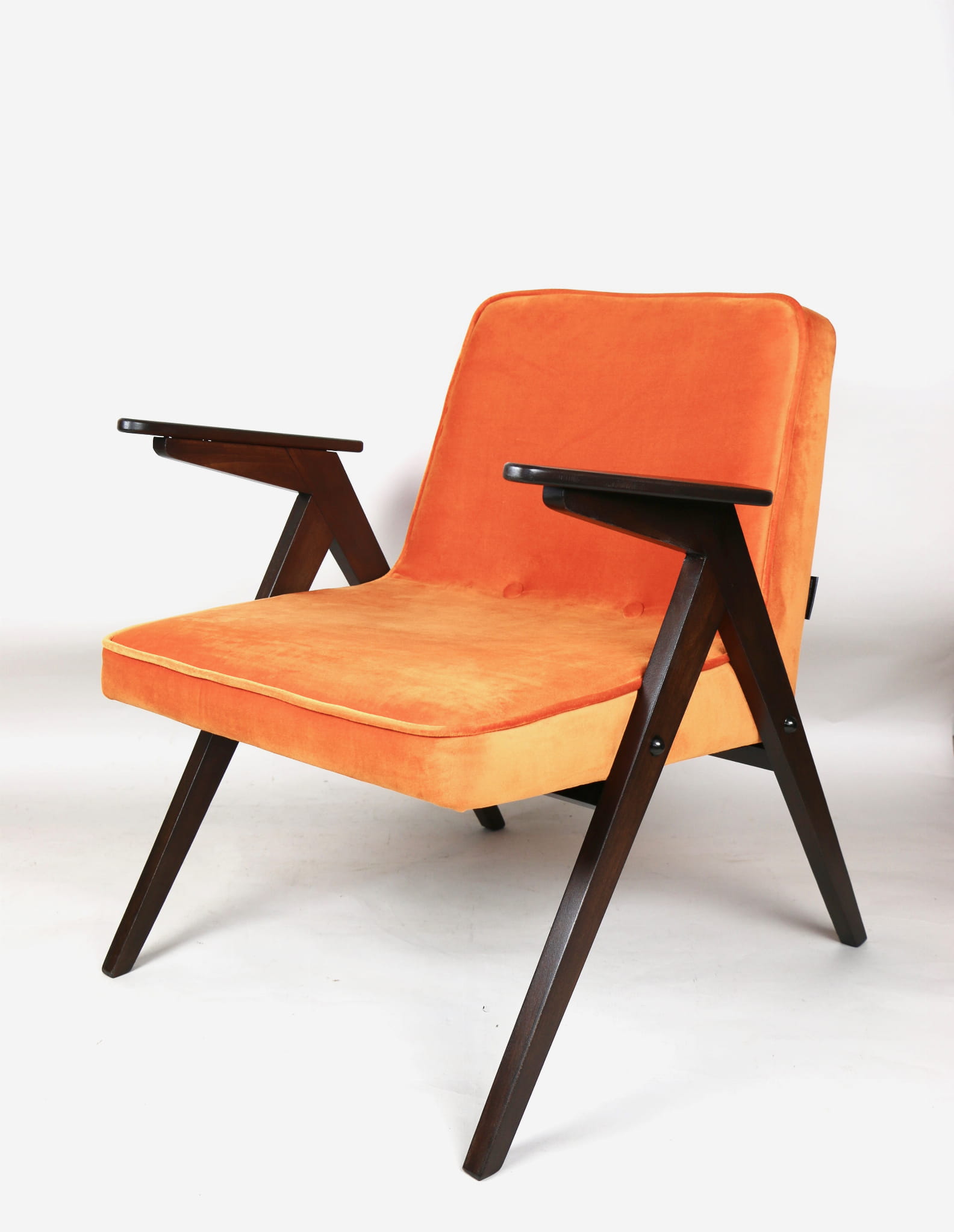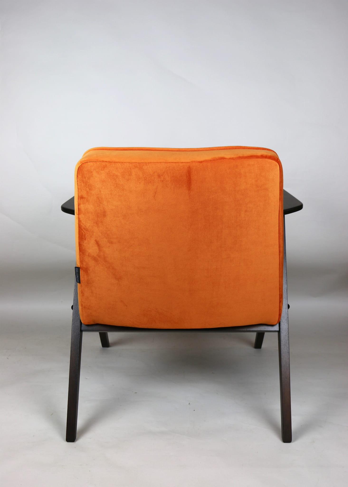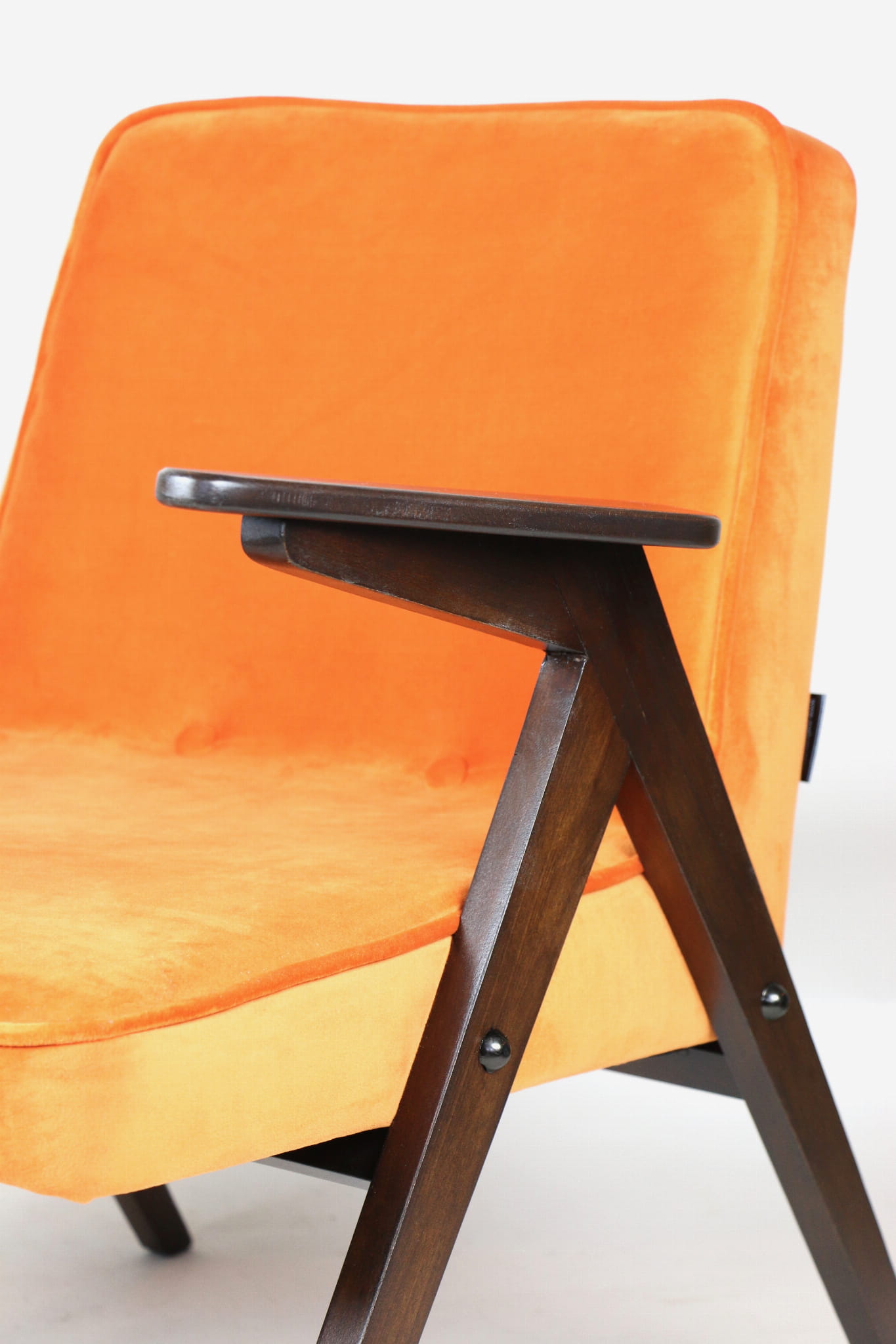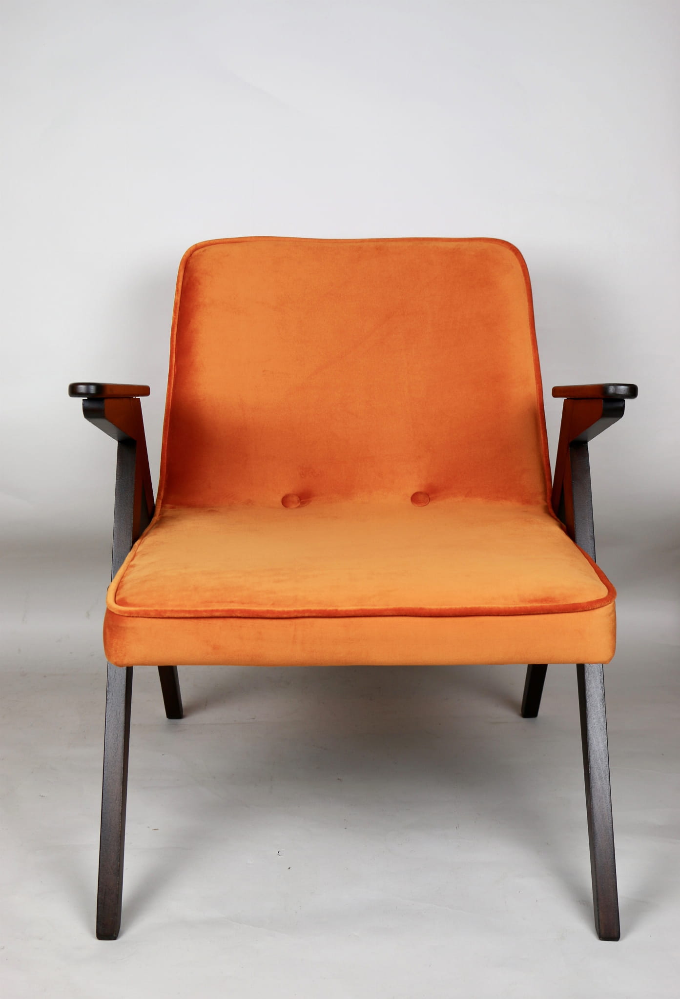 Fotel Bunny projektu Józefa Chierowskiego, który został całkowicie odrestaurowany. Nowe obicie pokryte aksamitnym materiałem tapicerskim w pomarańczowym kolorze z serii Quartz. Stelaż drewniany z podłokietnikami w kolorze ciemniejszego drewna.