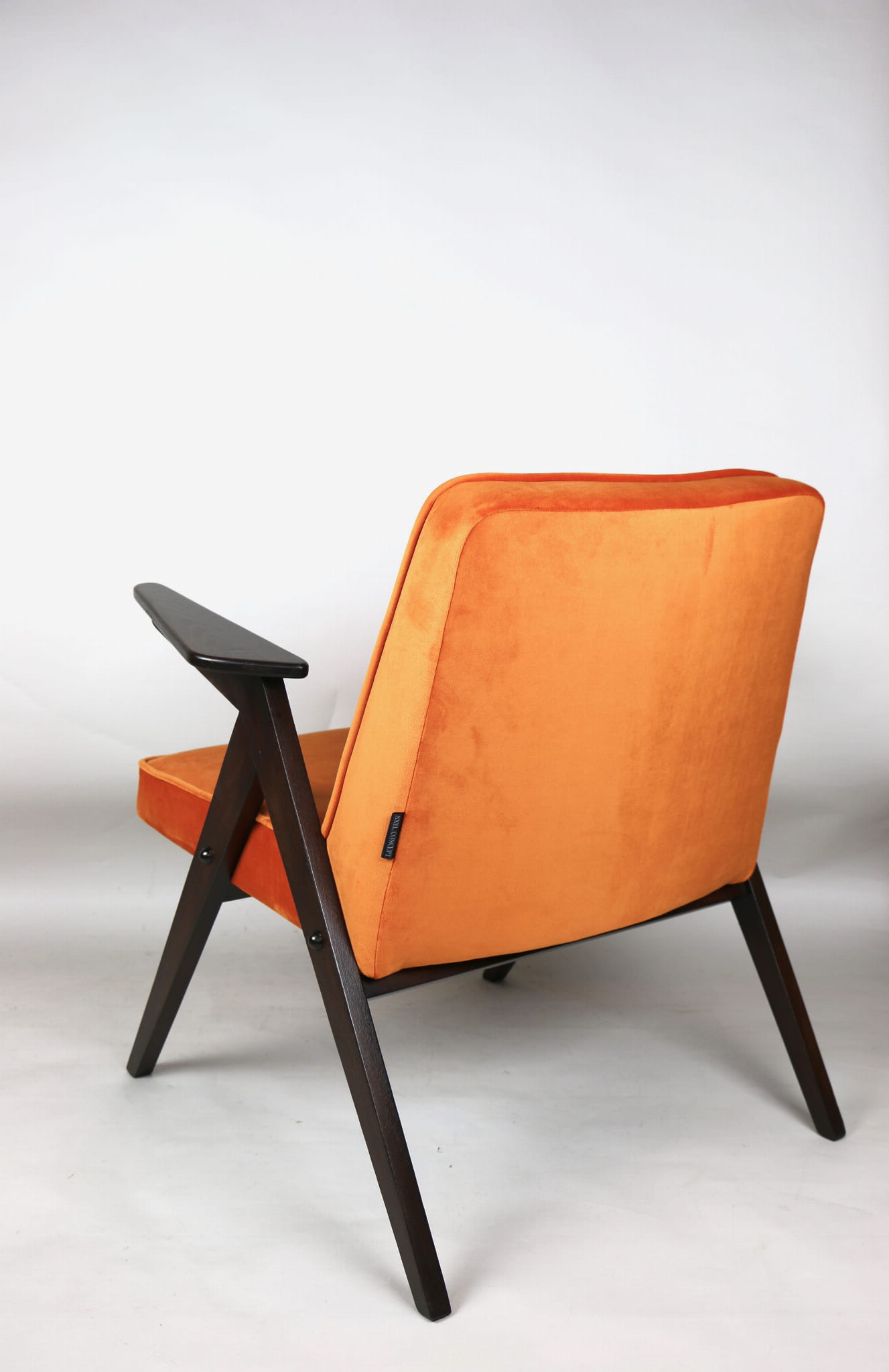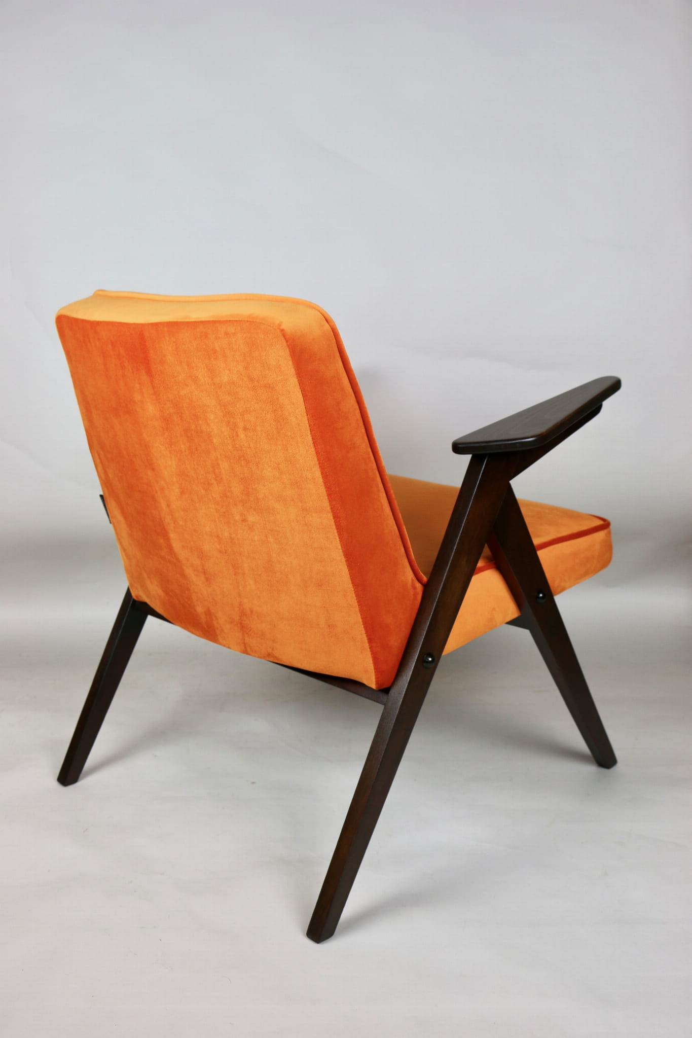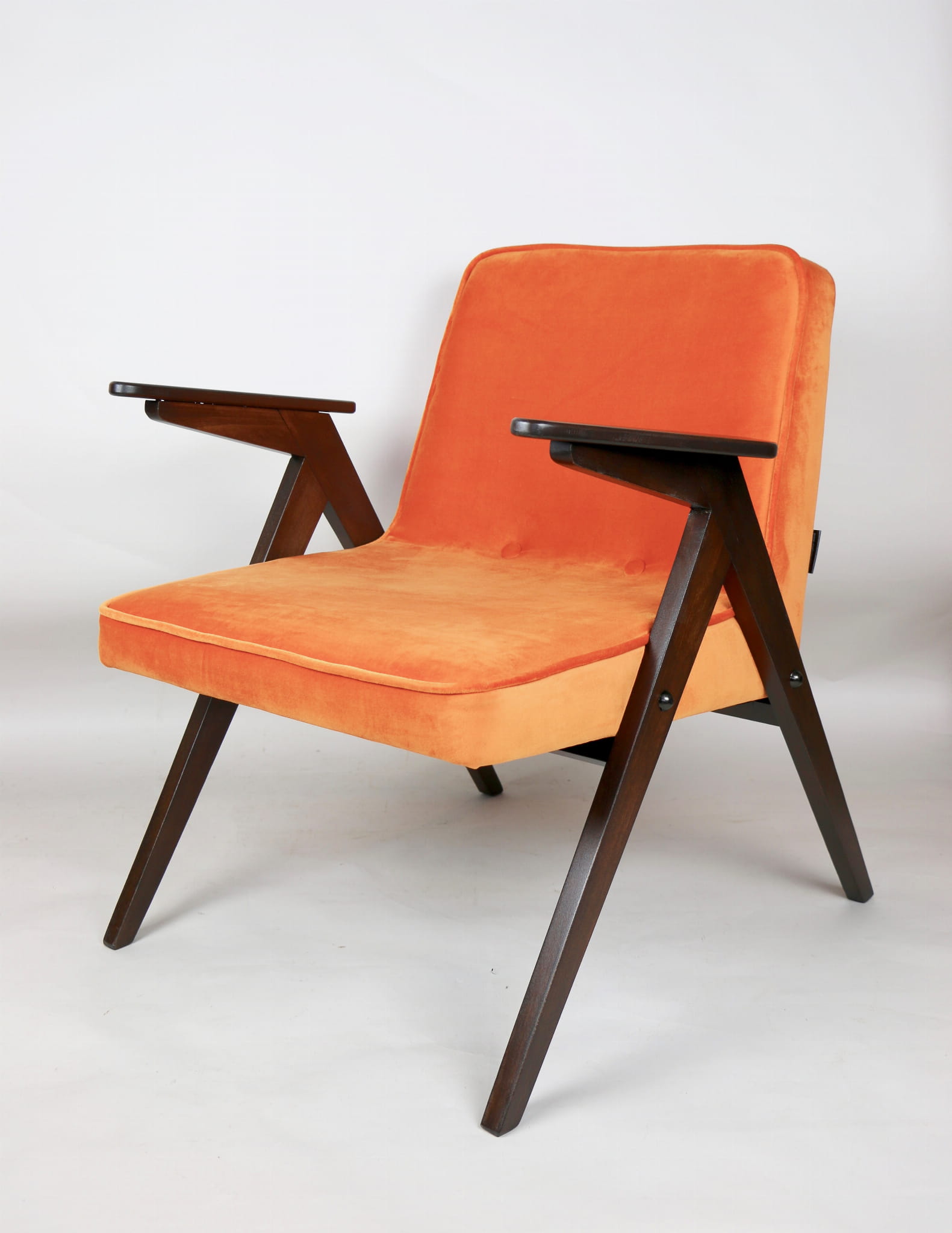 Fotel Bunny projektu Józefa Chierowskiego, który został całkowicie odrestaurowany. Nowe obicie pokryte aksamitnym materiałem tapicerskim w pomarańczowym kolorze z serii Quartz. Stelaż drewniany z podłokietnikami w kolorze ciemniejszego drewna.
